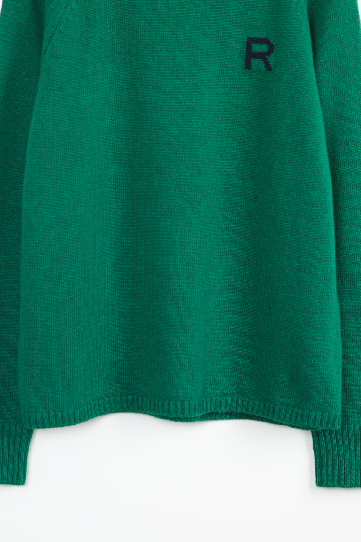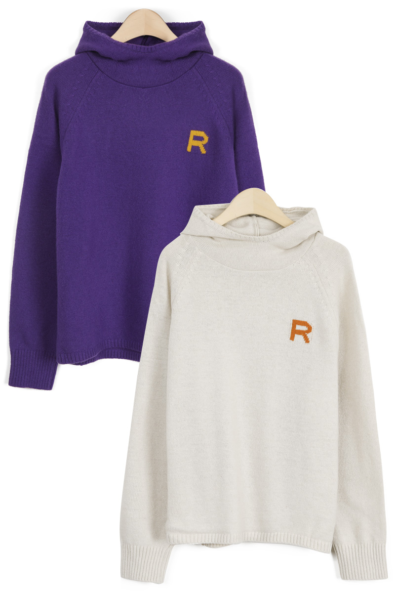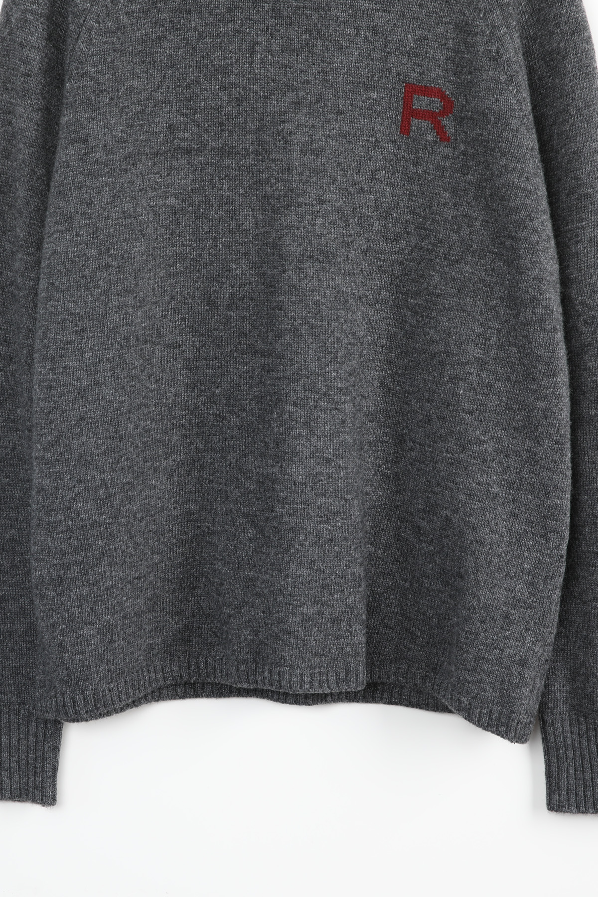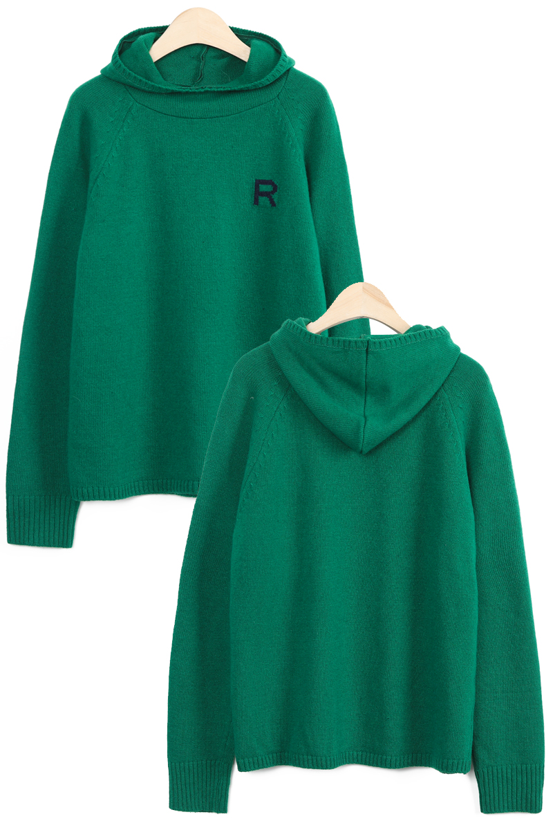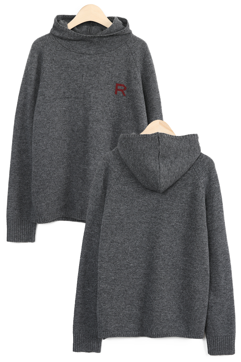 왼쪽 높은 가슴 위치에는가로 세로 4 x 4 cm 가량 되는R 레터링 인타샤 직조로 추가 포인트 주었어요몸판 색상 기준 그린에는 다크 네이비 R 레터링그레이에는 버건디 레드 R 레터링이라각각 배색감 또한 확실히 즐길 수 있었어요