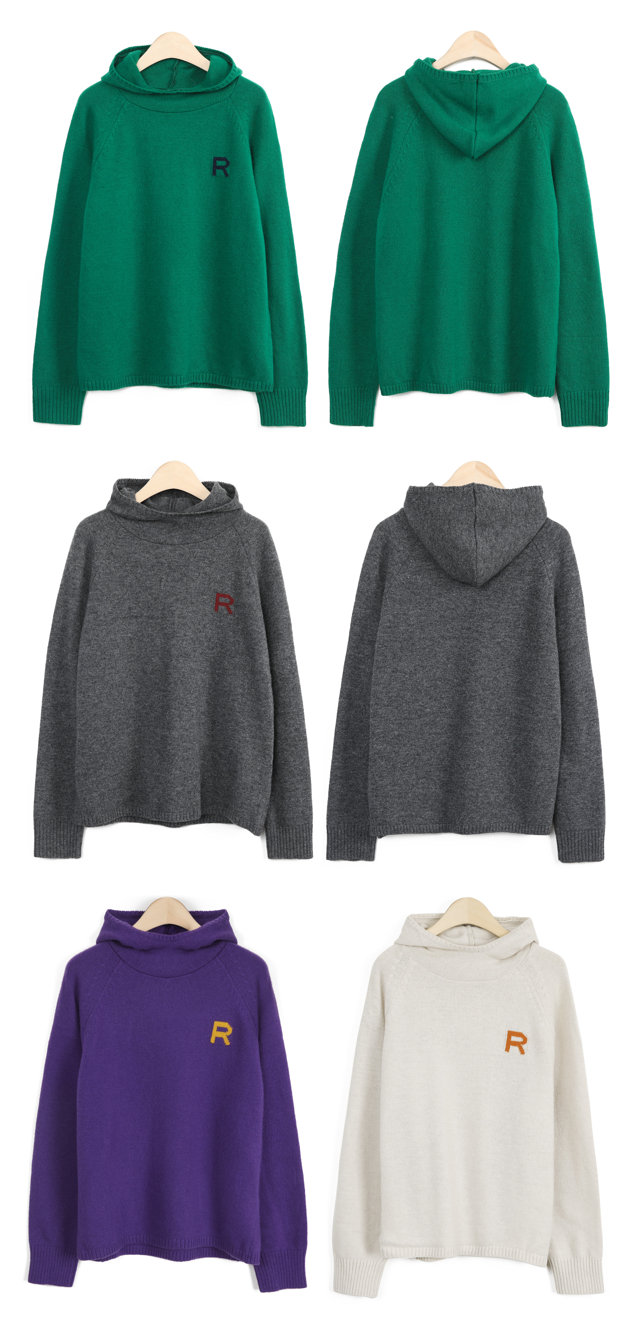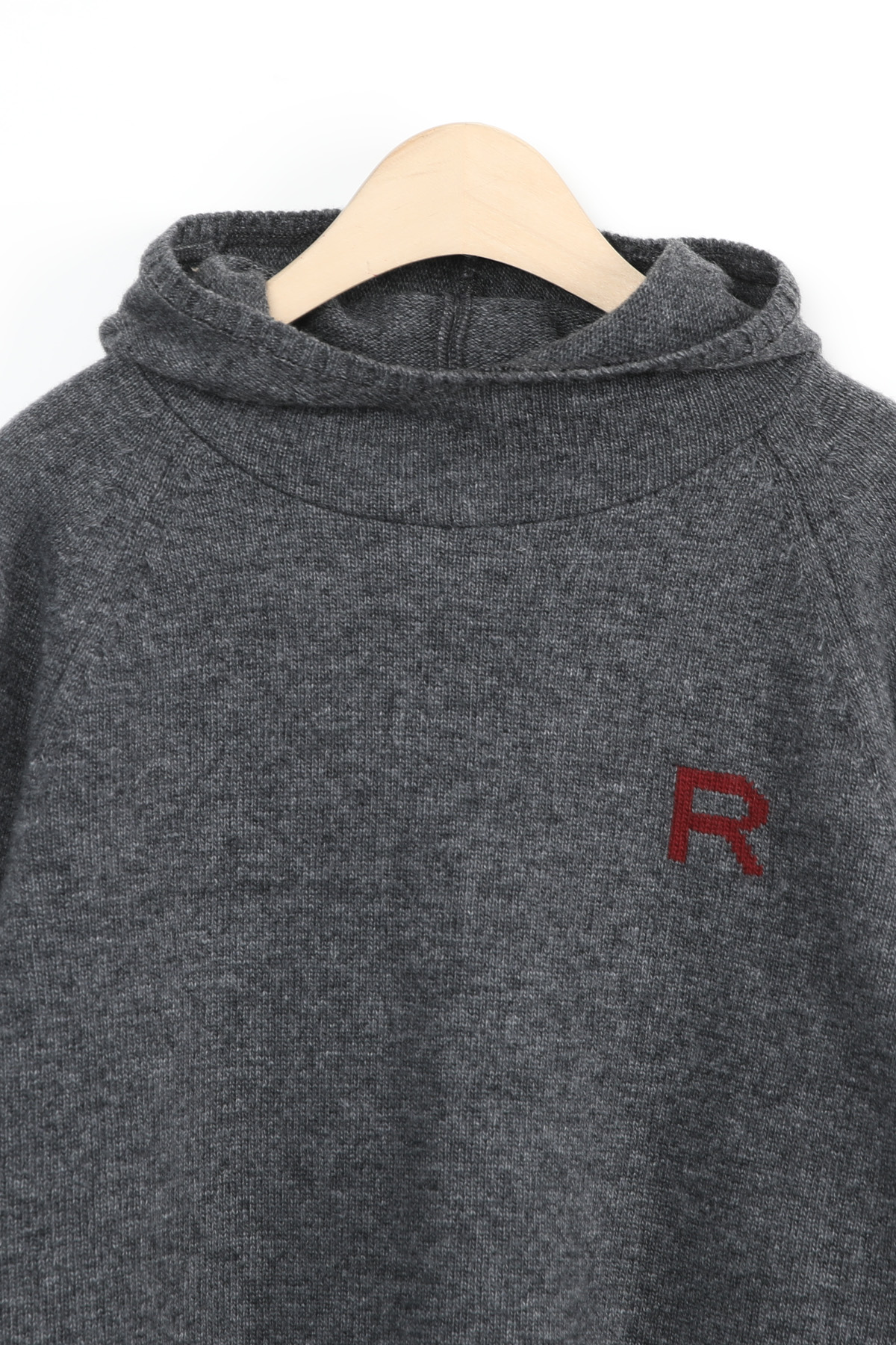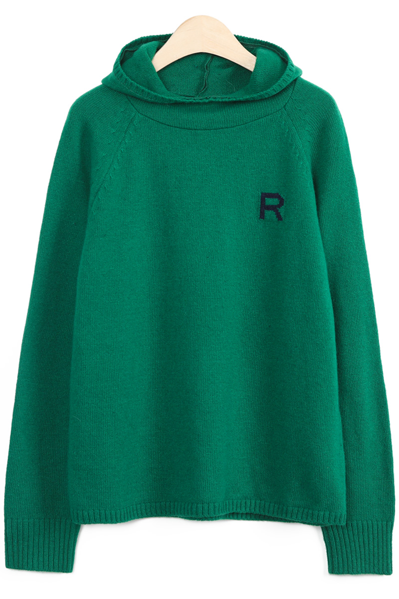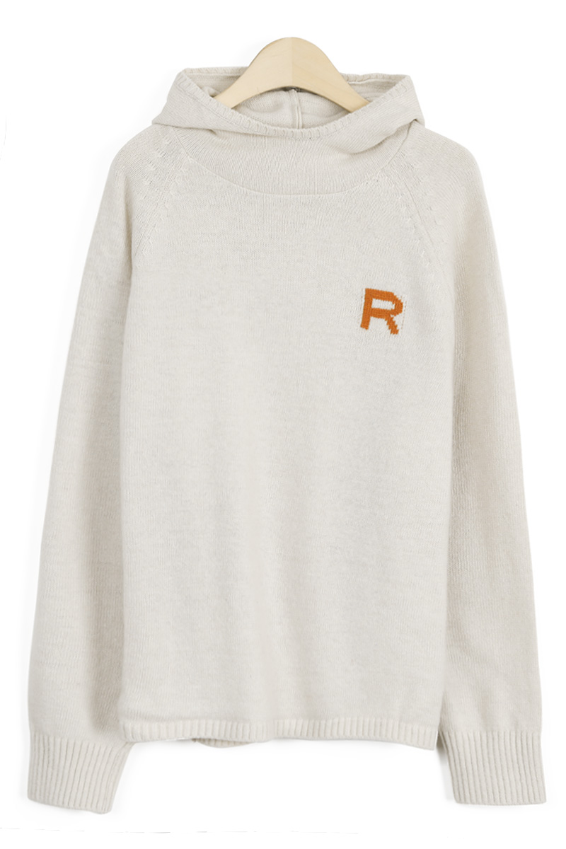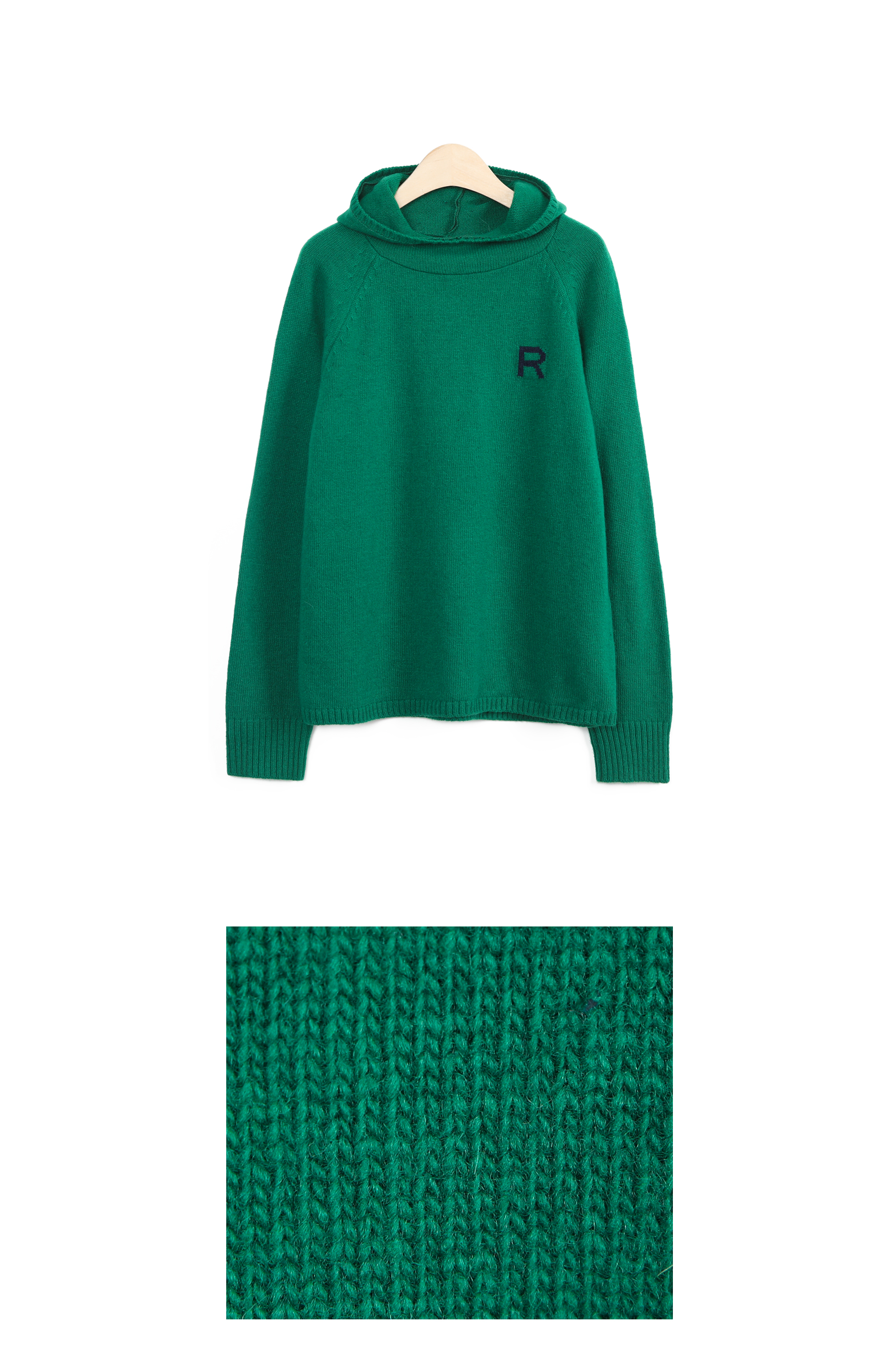 왼쪽 높은 가슴 위치에는가로 세로 4 x 4 cm 가량 되는R 레터링 인타샤 직조로 추가 포인트 주었어요몸판 색상 기준 그린에는 다크 네이비 R 레터링그레이에는 버건디 레드 R 레터링이라각각 배색감 또한 확실히 즐길 수 있었어요