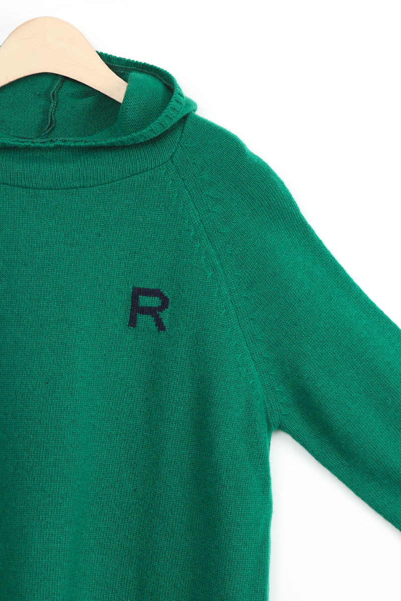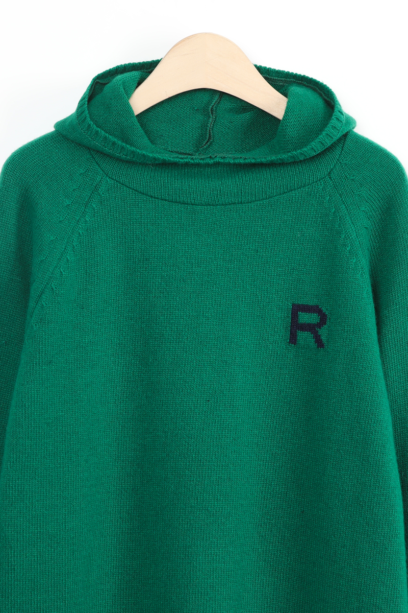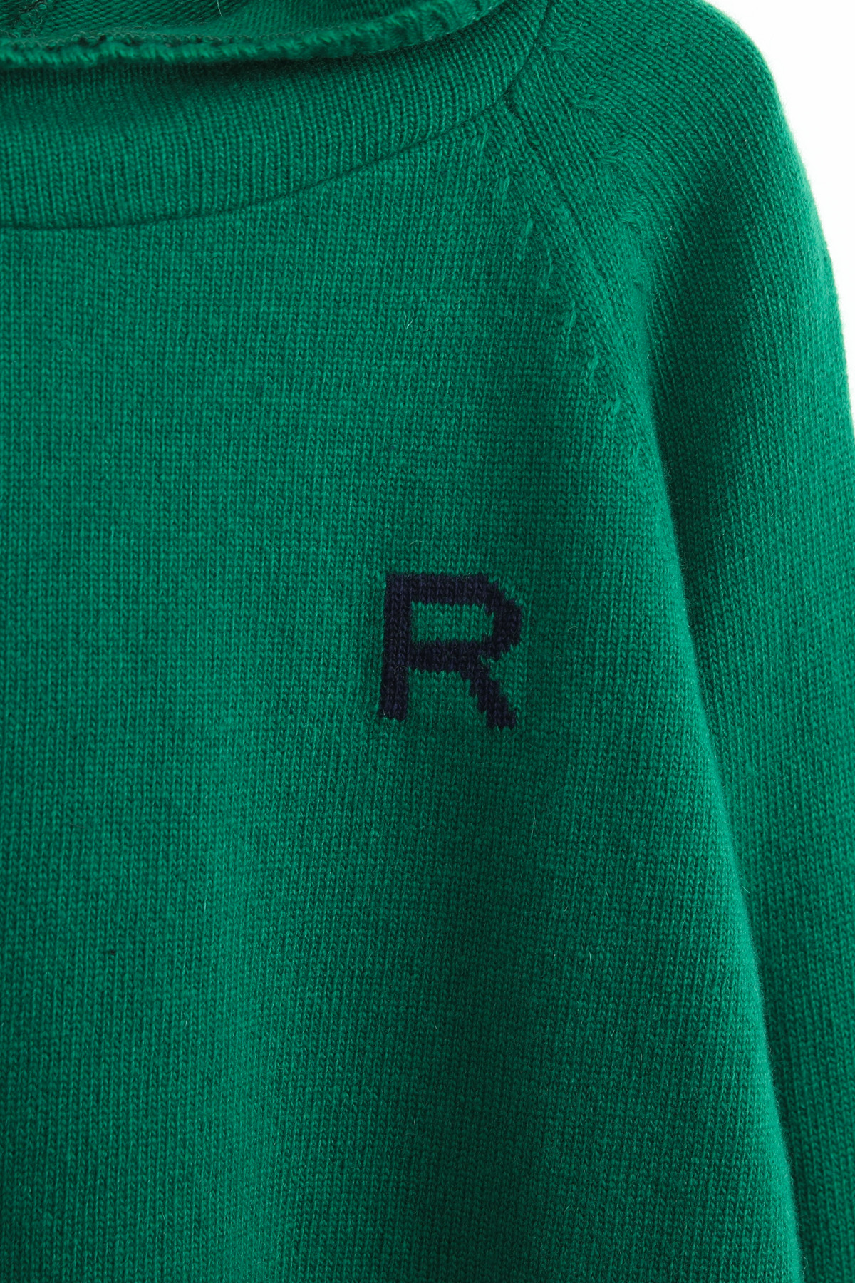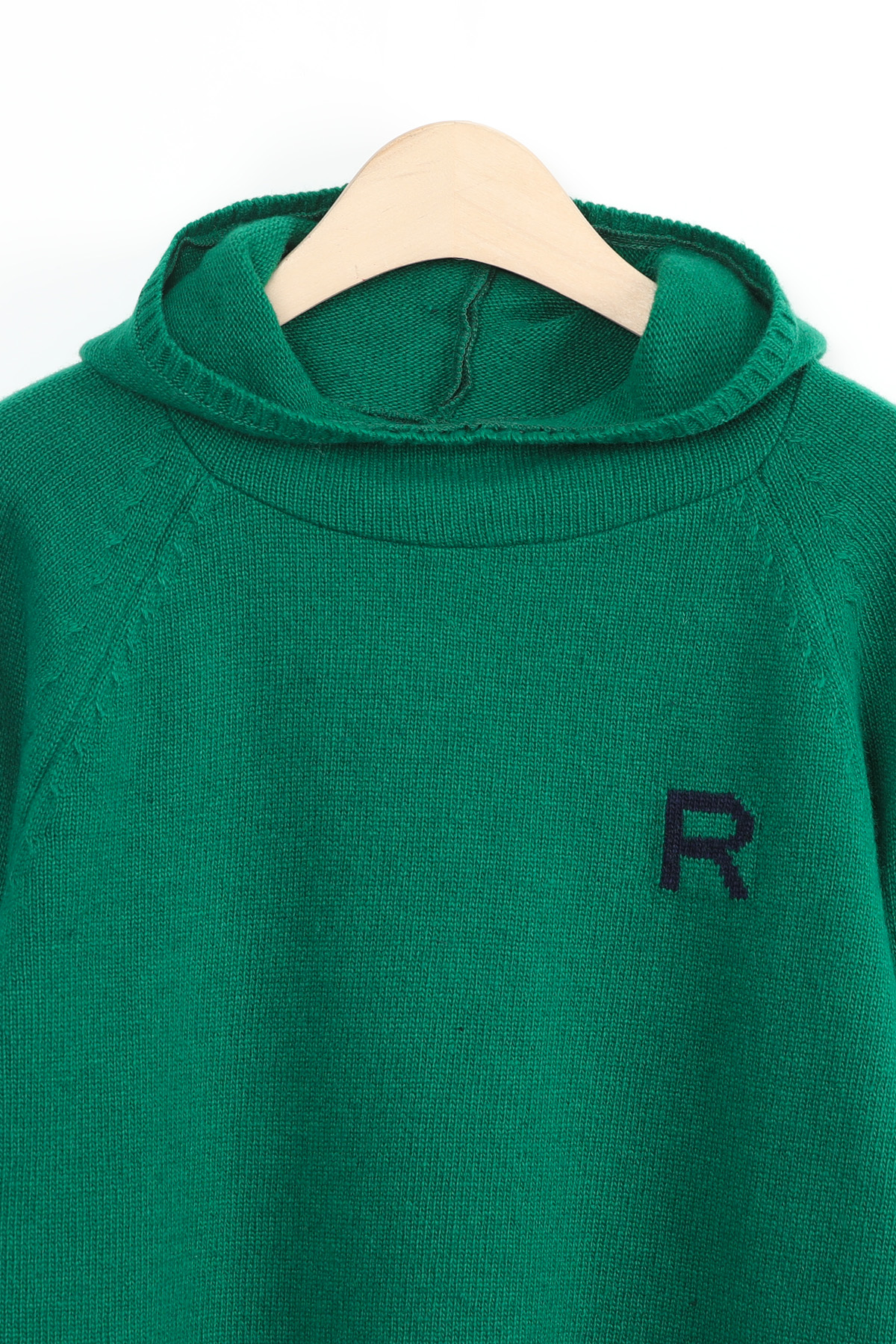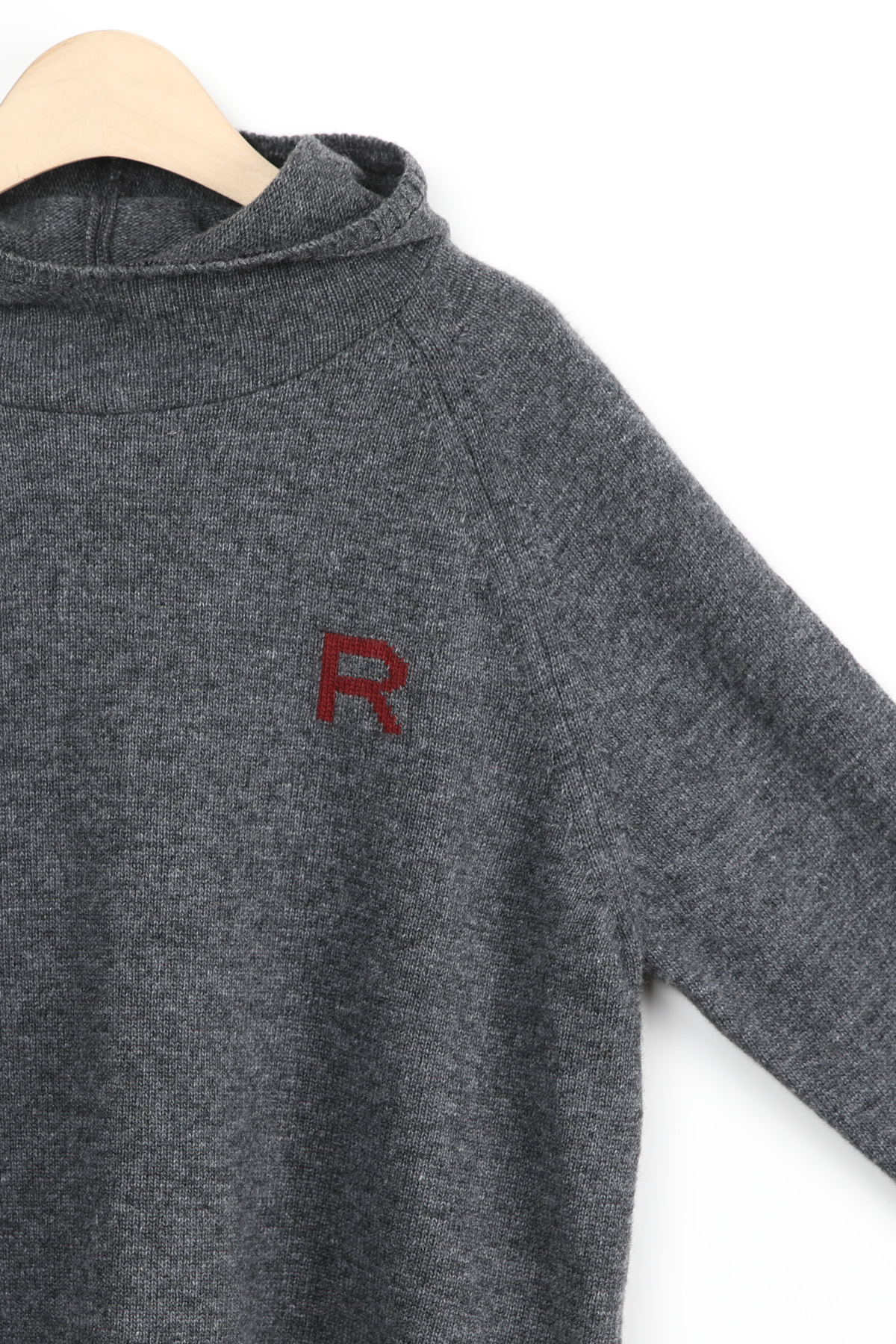 왼쪽 높은 가슴 위치에는가로 세로 4 x 4 cm 가량 되는R 레터링 인타샤 직조로 추가 포인트 주었어요몸판 색상 기준 그린에는 다크 네이비 R 레터링그레이에는 버건디 레드 R 레터링이라각각 배색감 또한 확실히 즐길 수 있었어요