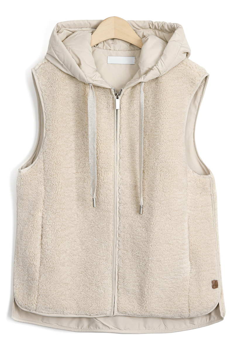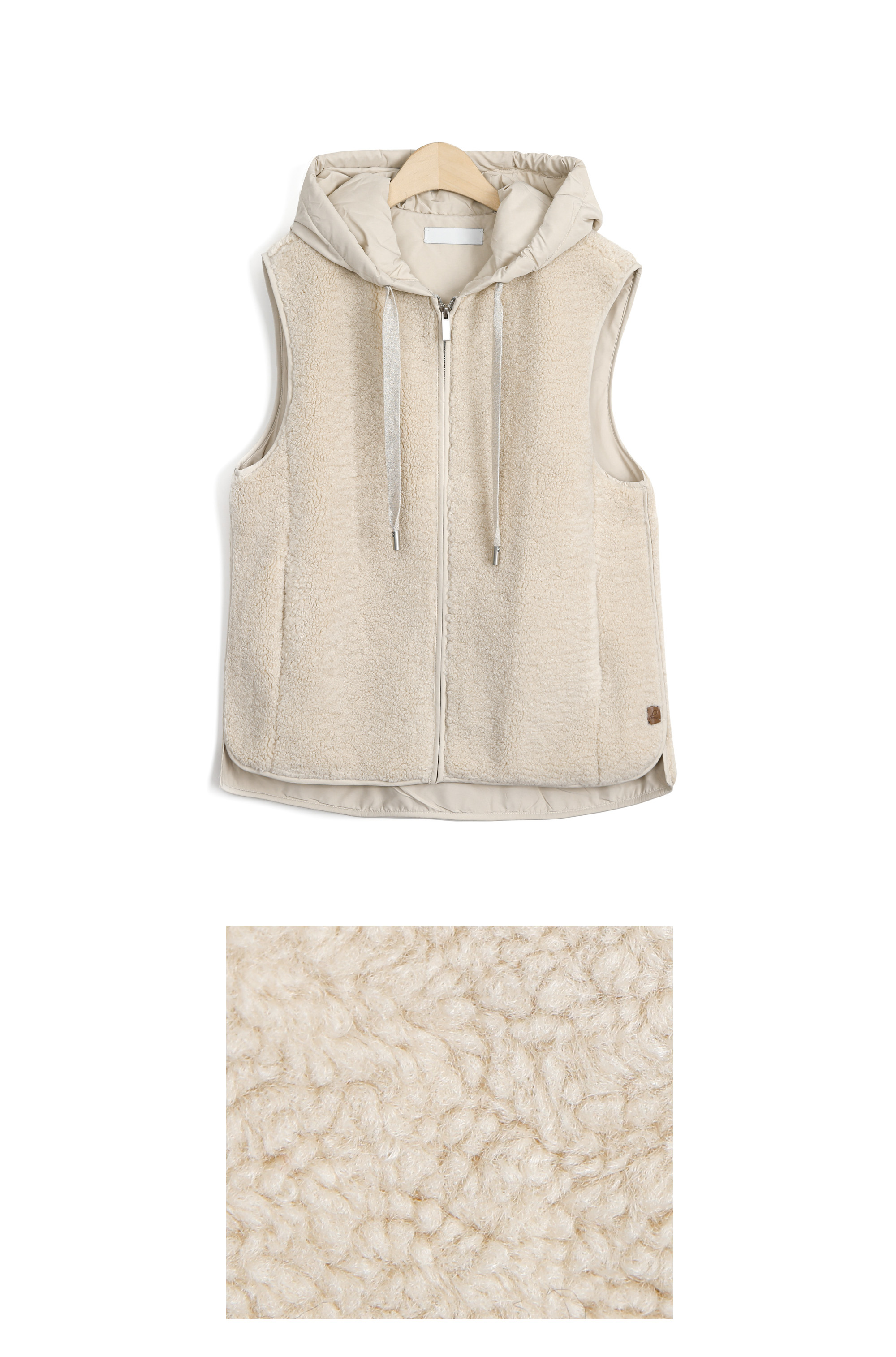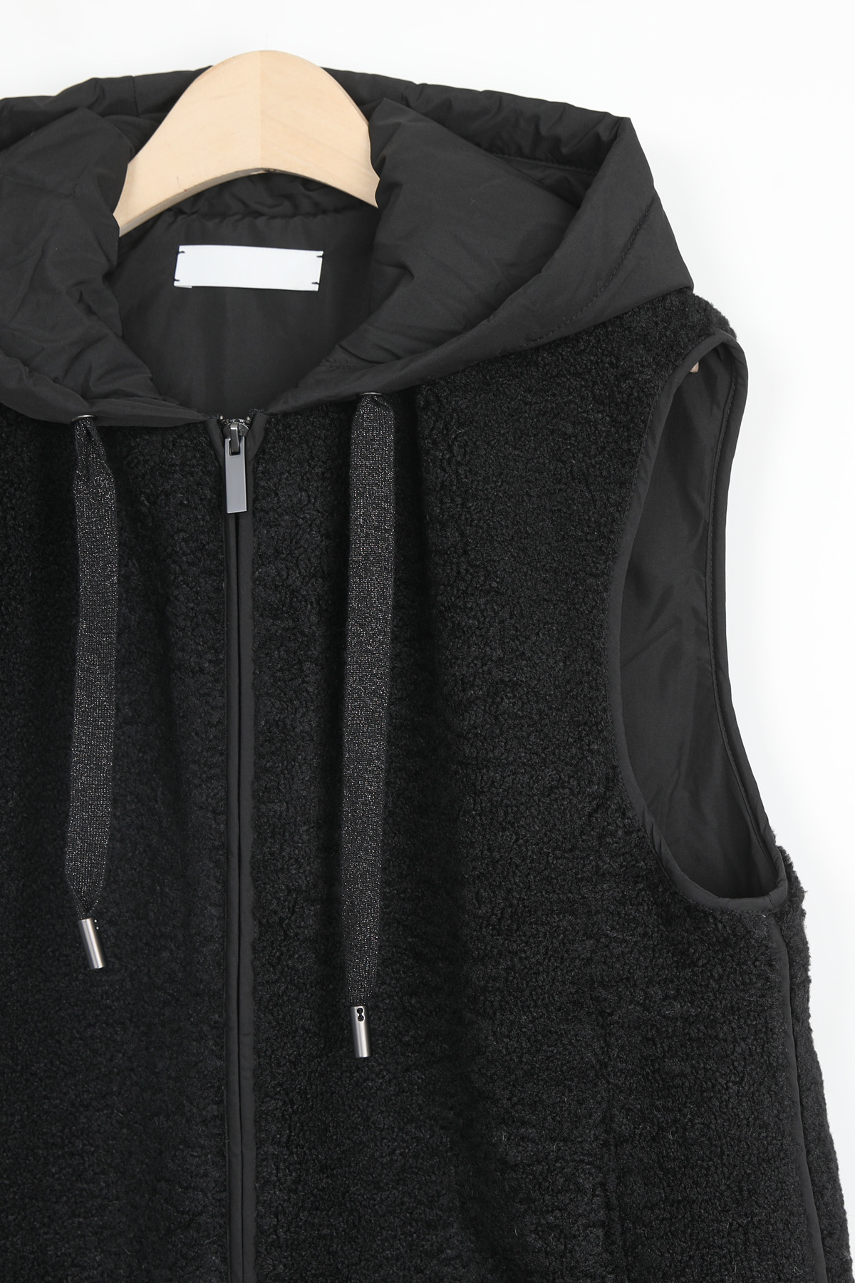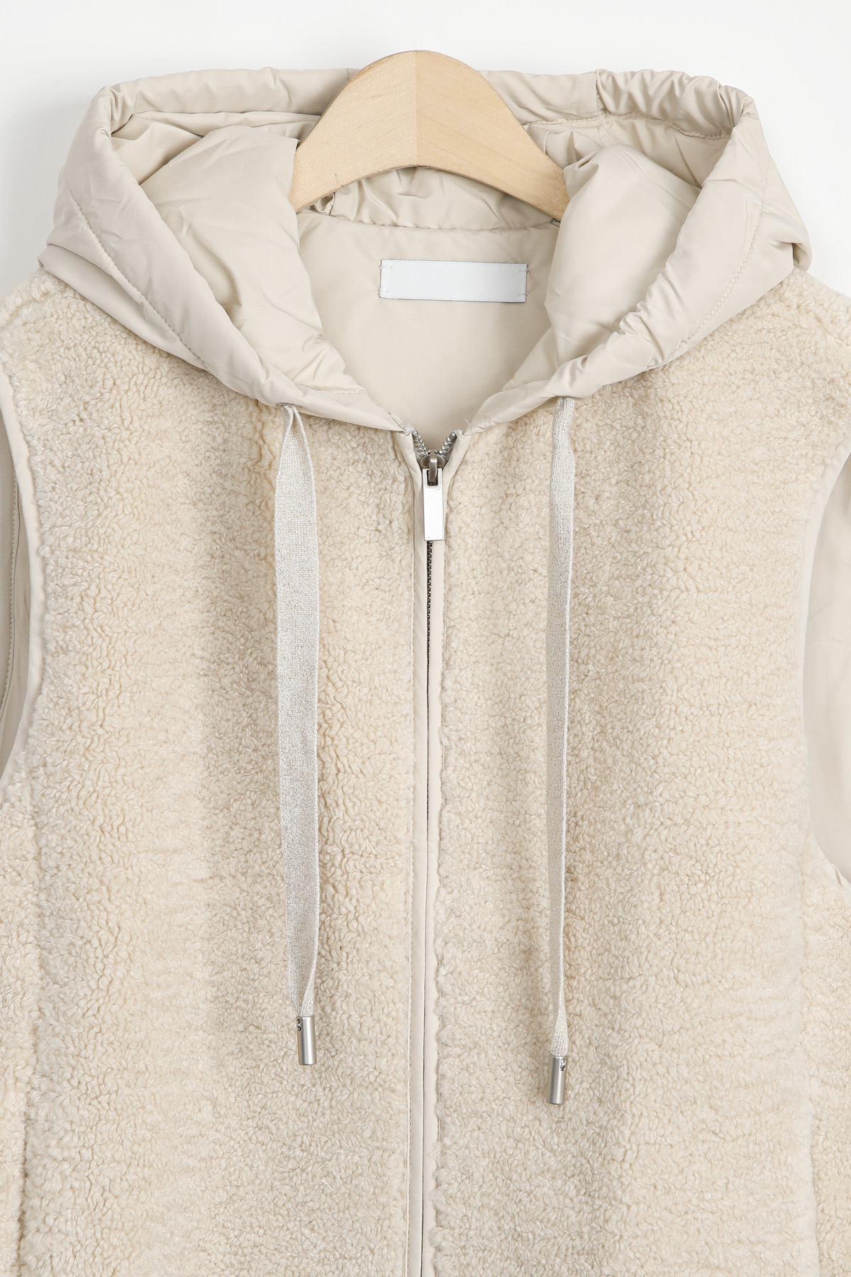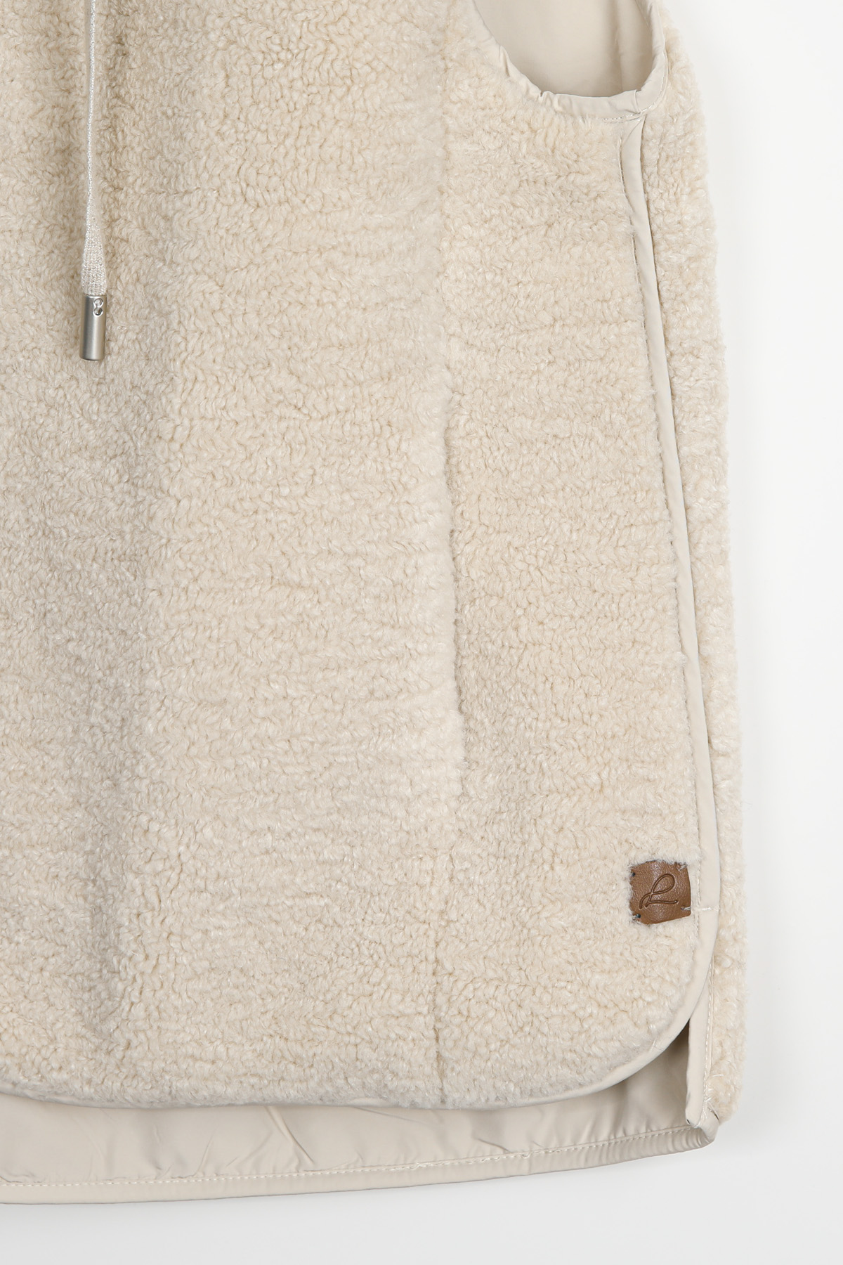 뽀글뽀글 양털 질감을 그대로 표현한부드러운 질감의 폴리에스터 100 인조퍼, 겉감 폴리 소재의 후드 안쪽에도폴리에스터 100 충전재를 폭폭하게 채워따뜻하고 포근한 레이어드 베스트를 완성했어요