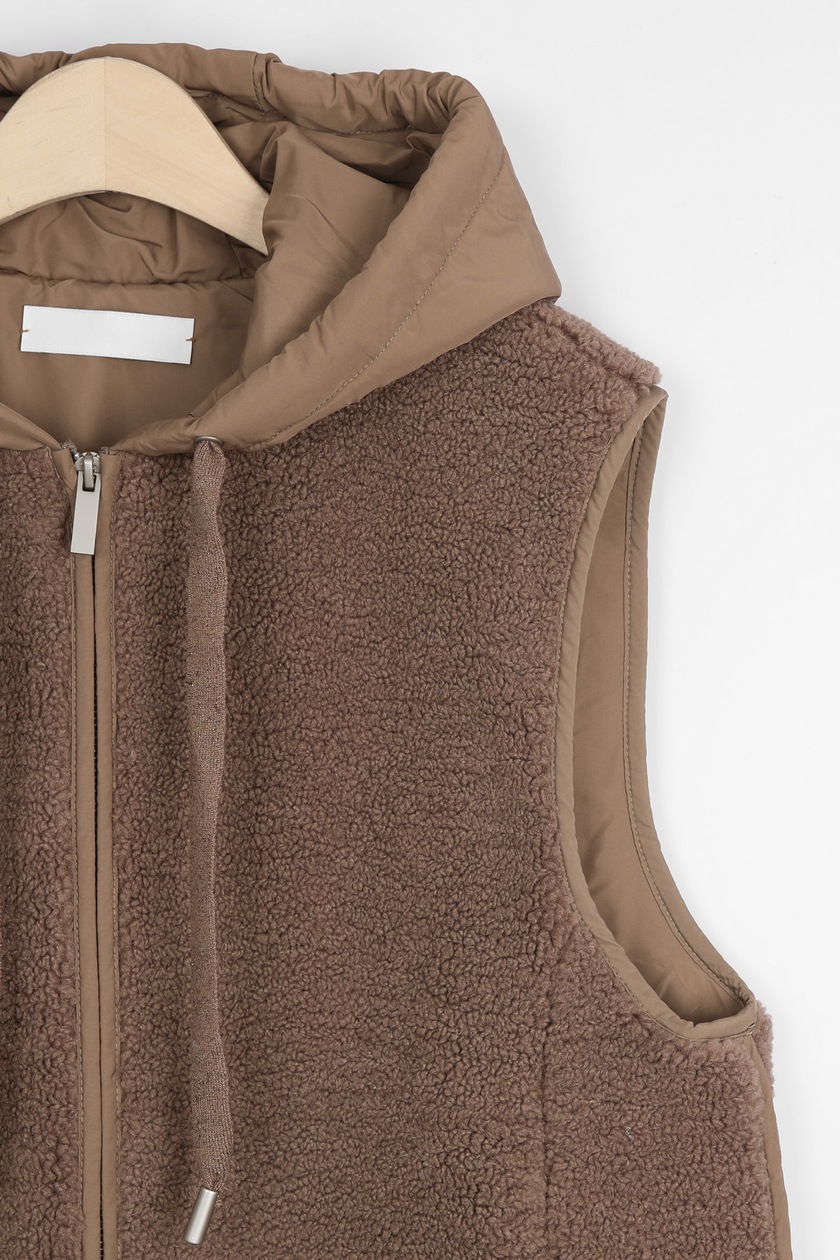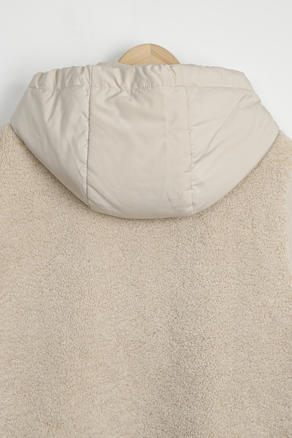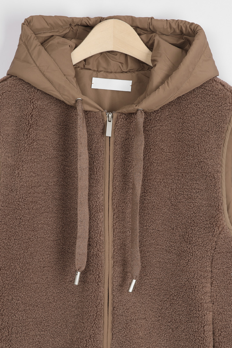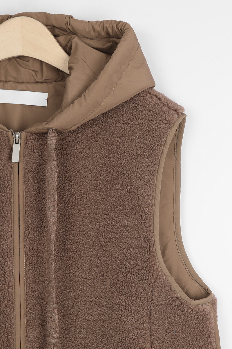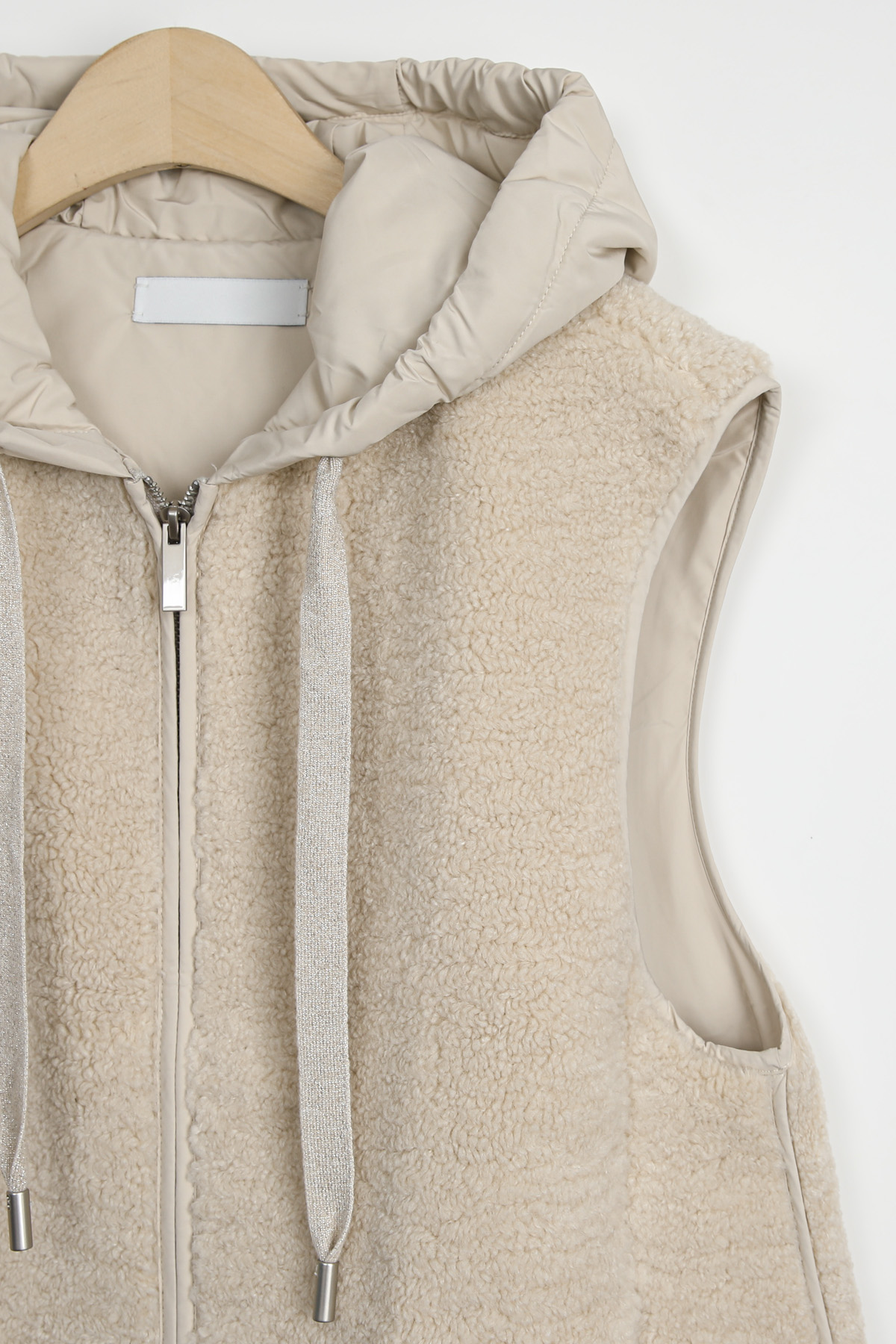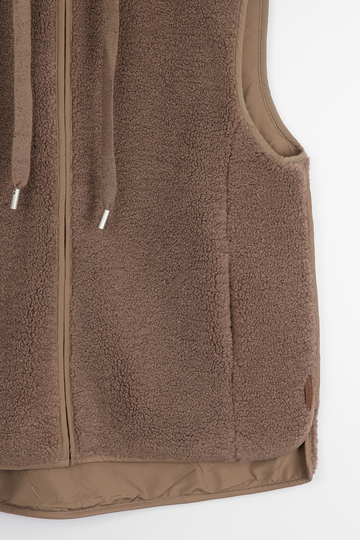 뽀글뽀글 양털 질감을 그대로 표현한부드러운 질감의 폴리에스터 100 인조퍼, 겉감 폴리 소재의 후드 안쪽에도폴리에스터 100 충전재를 폭폭하게 채워따뜻하고 포근한 레이어드 베스트를 완성했어요