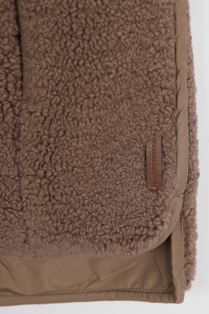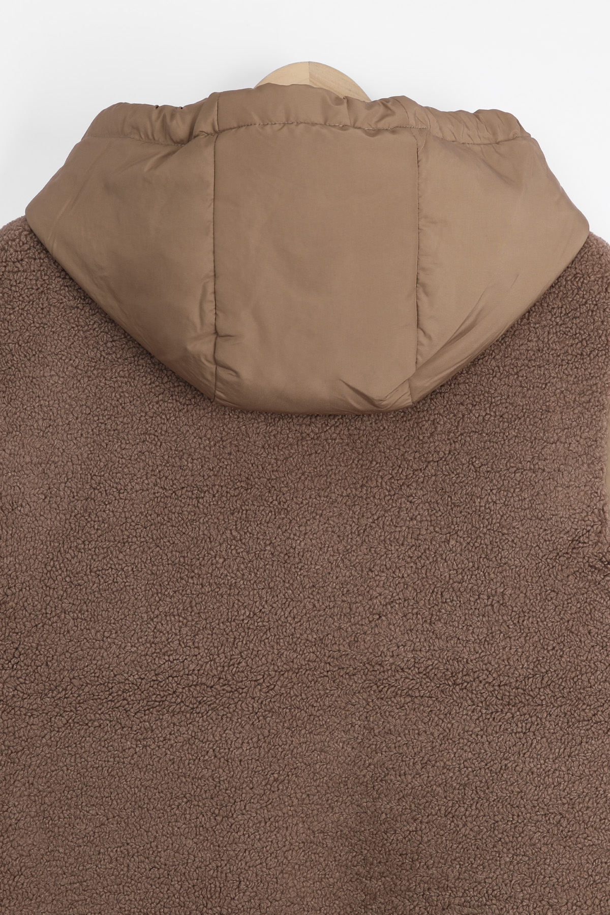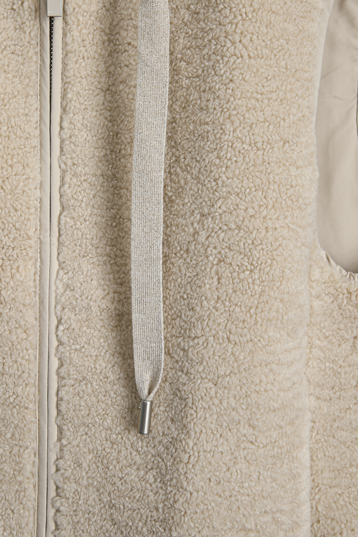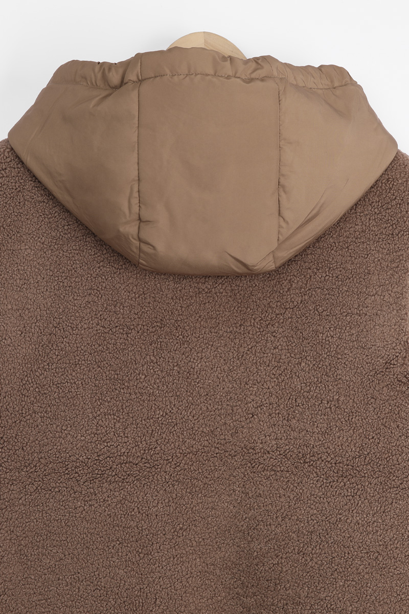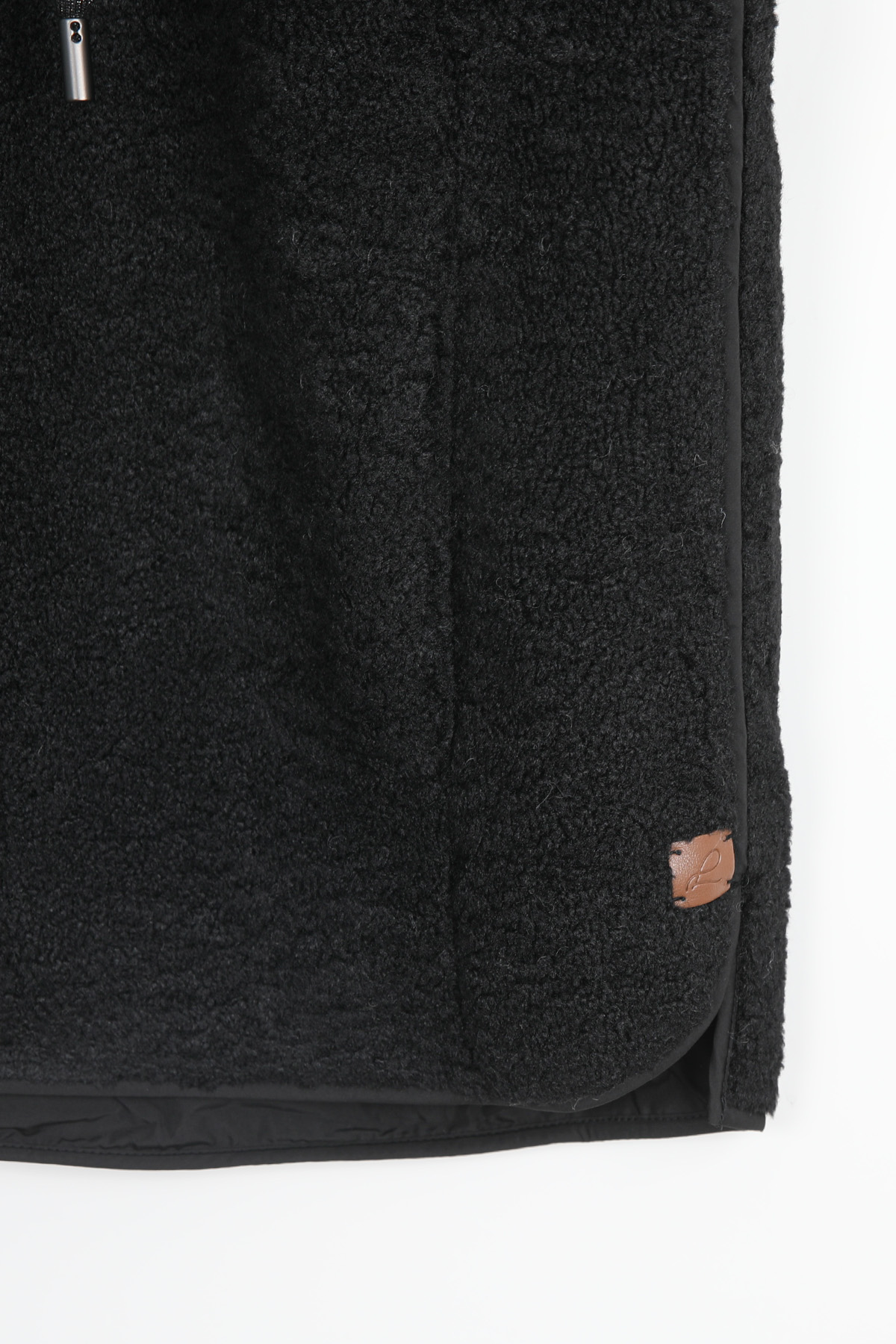 뽀글뽀글 양털 질감을 그대로 표현한부드러운 질감의 폴리에스터 100 인조퍼, 겉감 폴리 소재의 후드 안쪽에도폴리에스터 100 충전재를 폭폭하게 채워따뜻하고 포근한 레이어드 베스트를 완성했어요