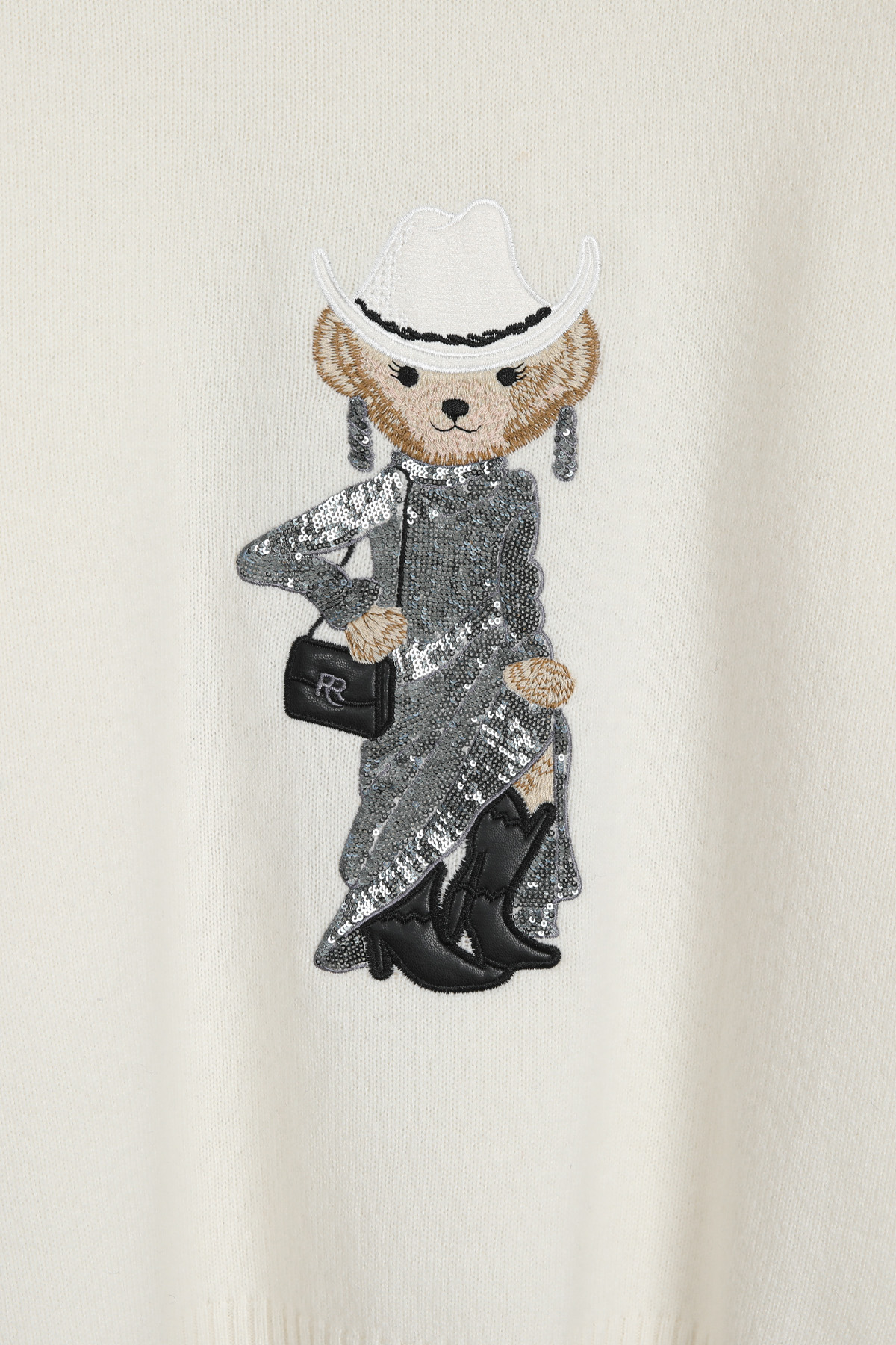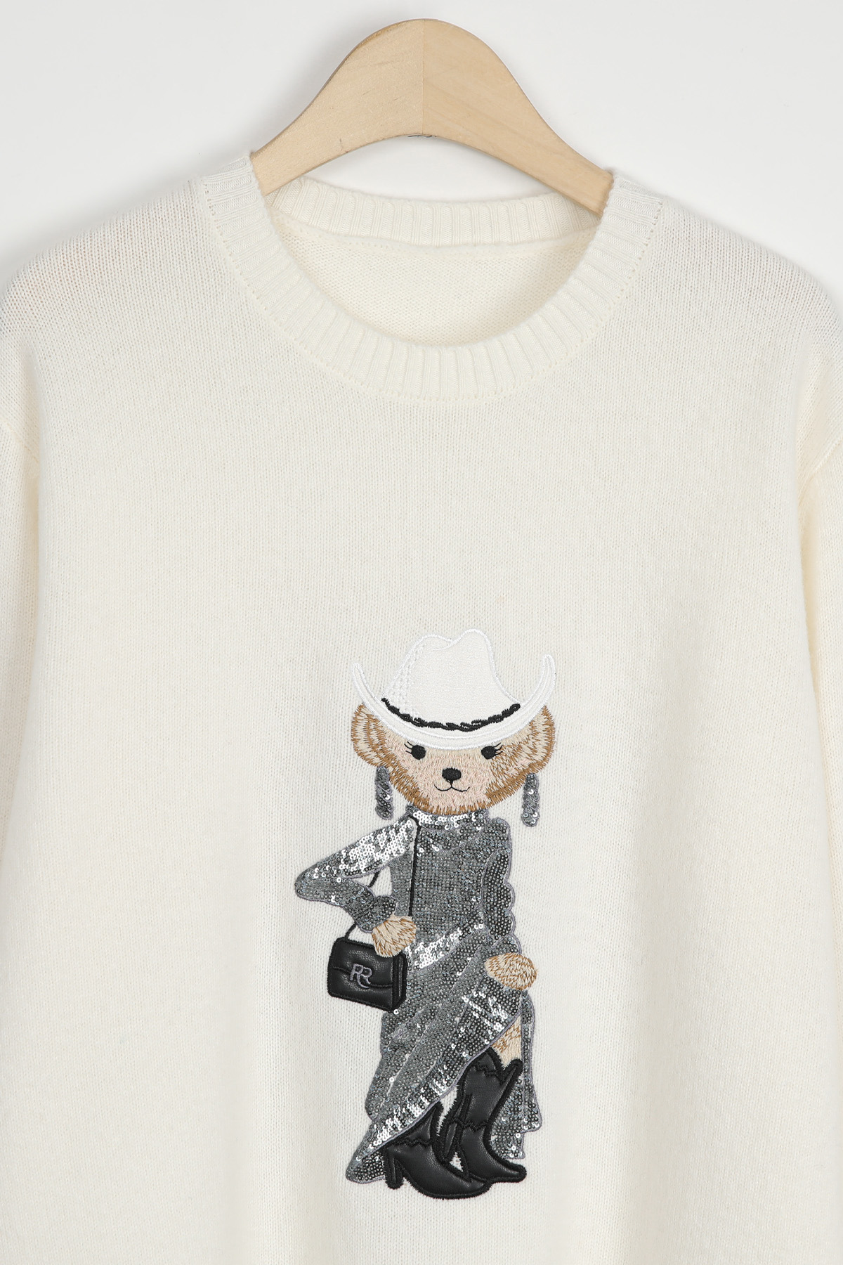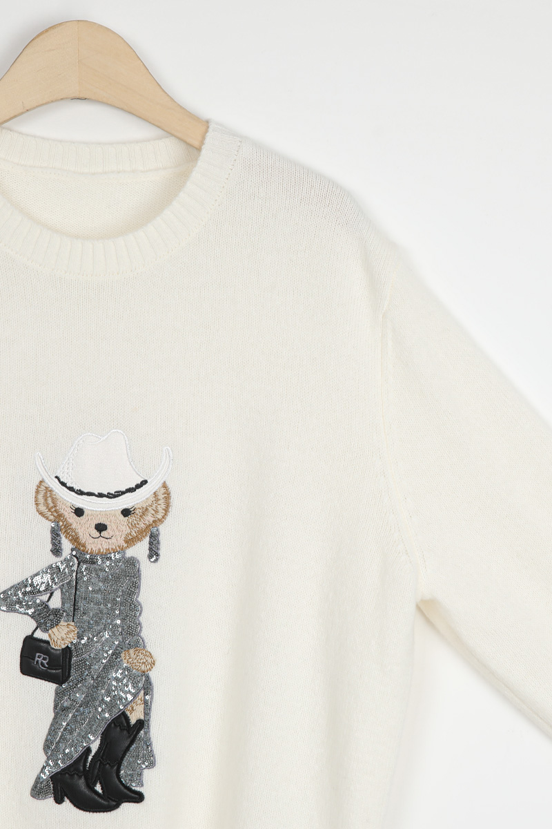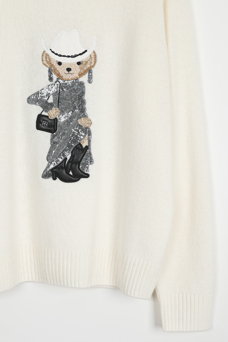 블링블링한 스팽글로 장식한 화려한 드레스와웨스턴 스타일의 페도라와 부츠로스타일링을 완성한 웨스턴 베어 원포인트의풀오버 니트 소개해드려요