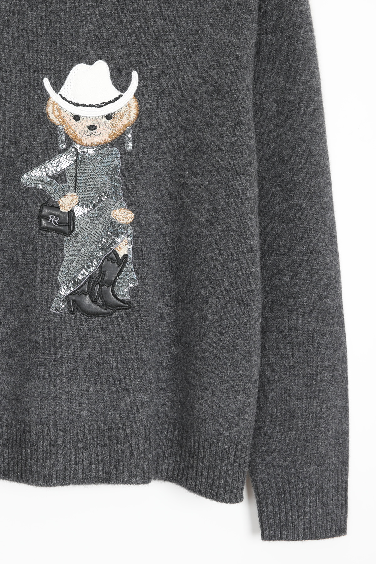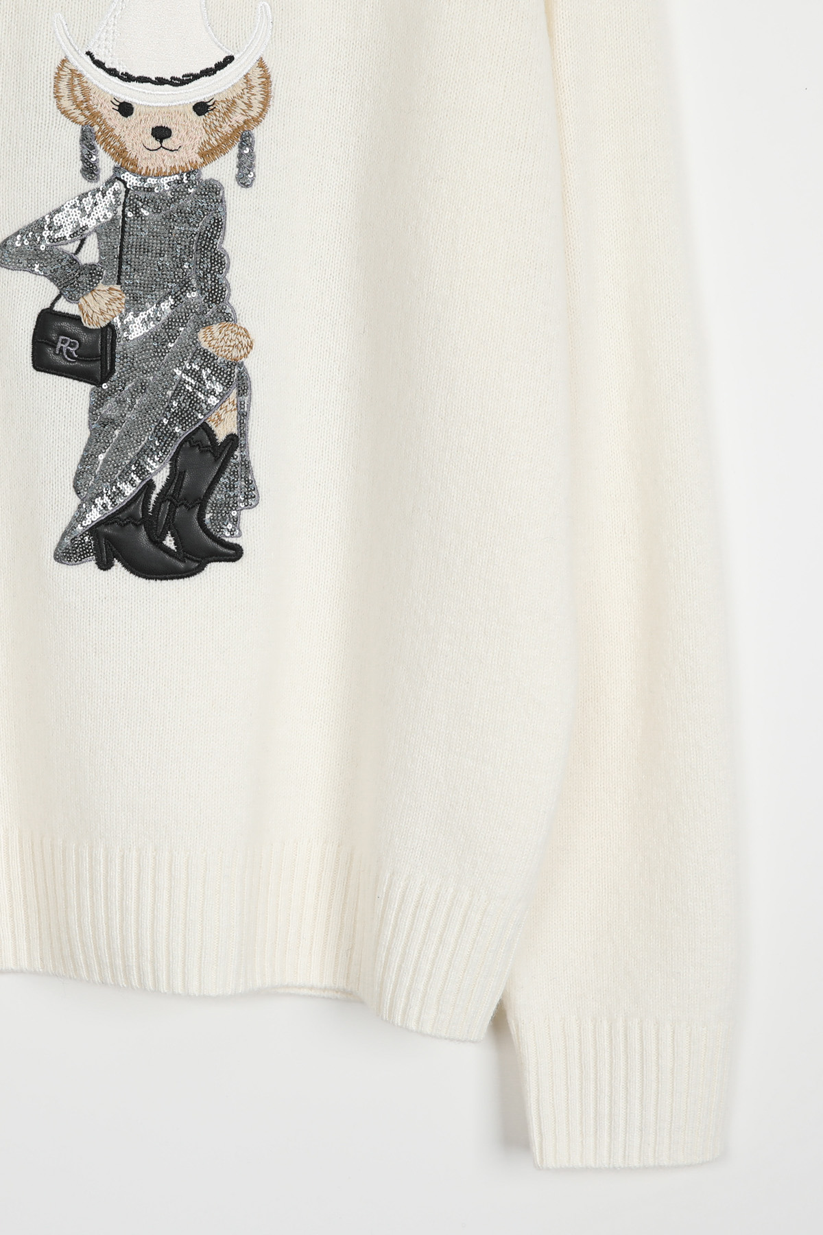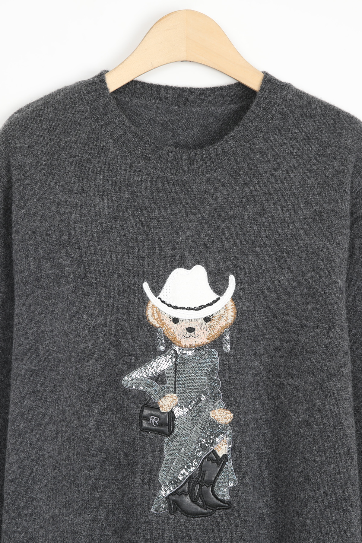 블링블링한 스팽글로 장식한 화려한 드레스와웨스턴 스타일의 페도라와 부츠로스타일링을 완성한 웨스턴 베어 원포인트의풀오버 니트 소개해드려요