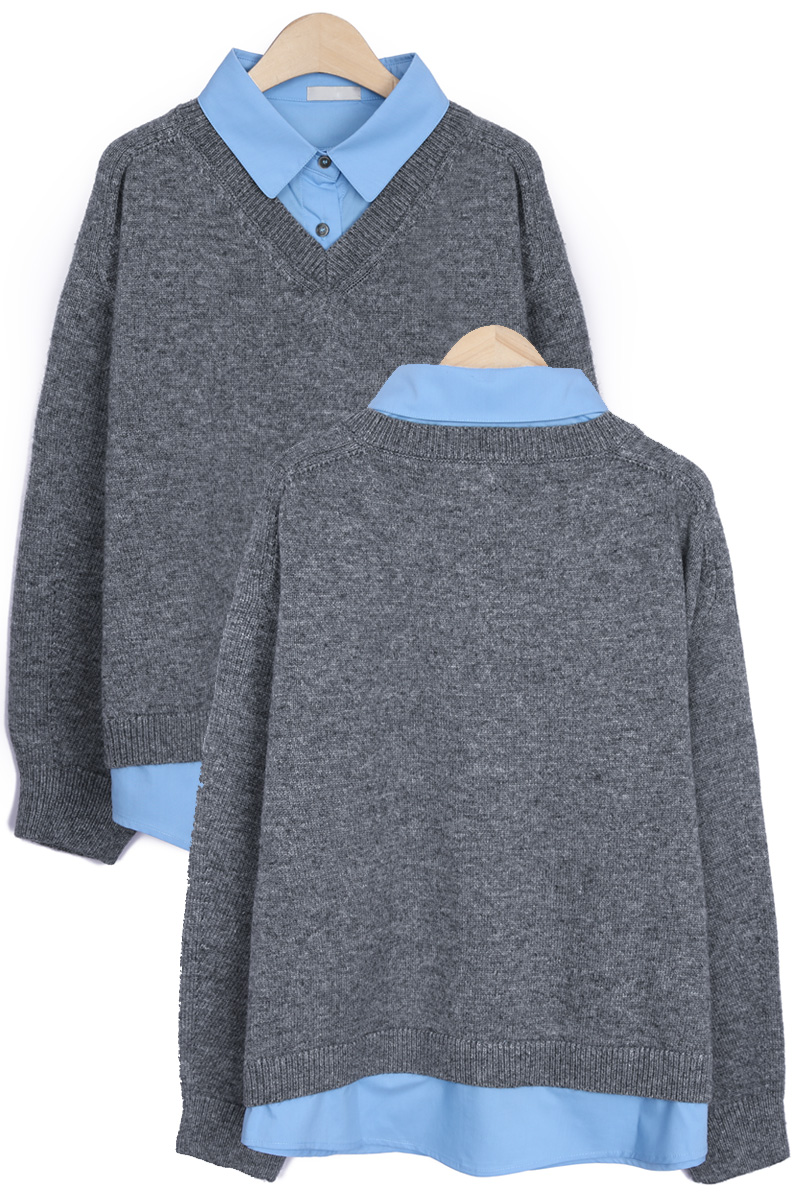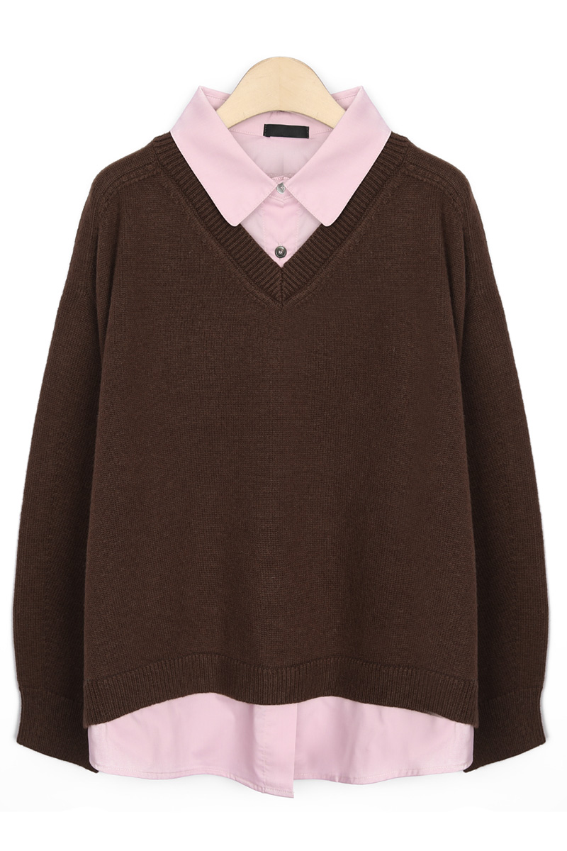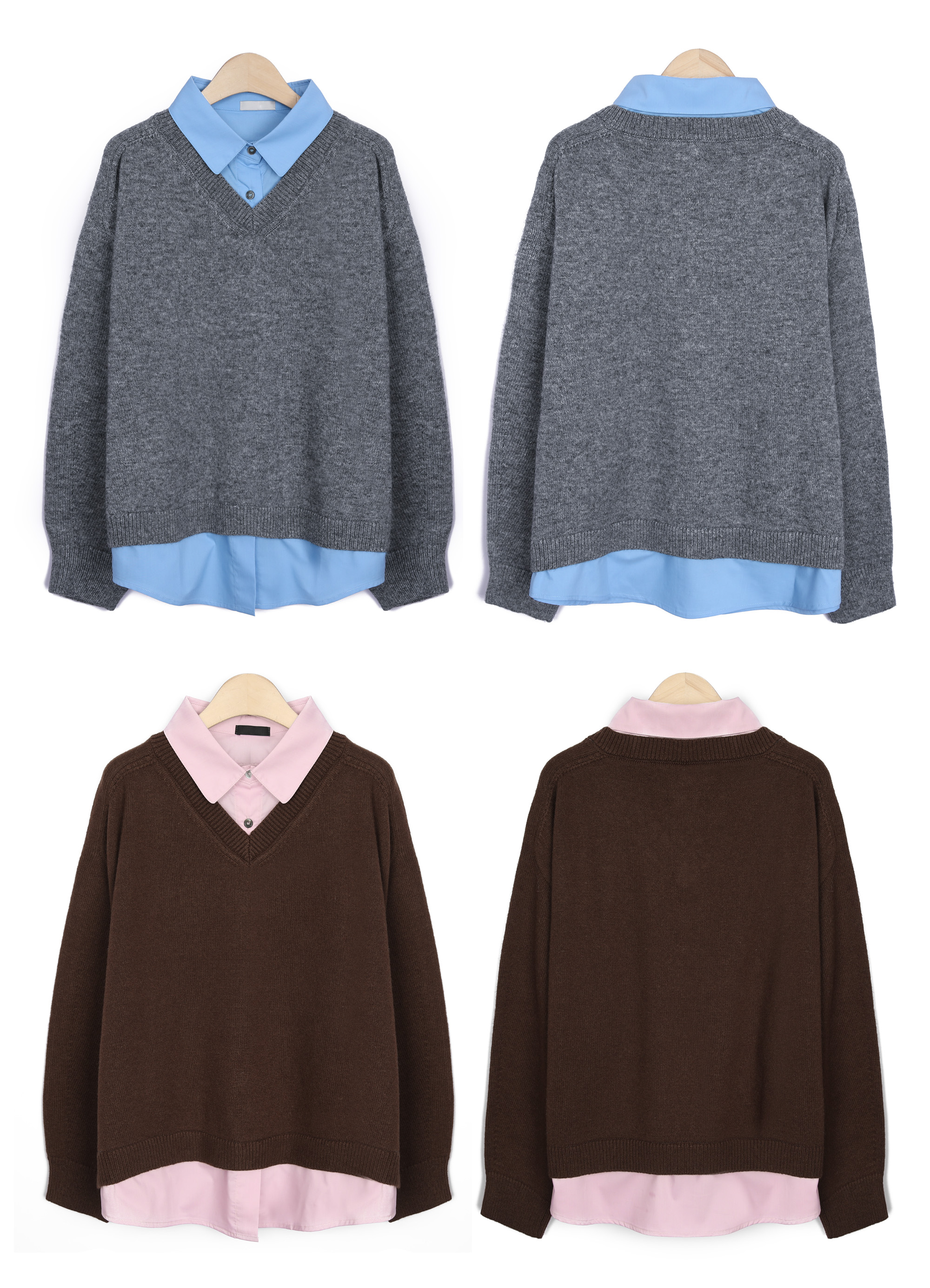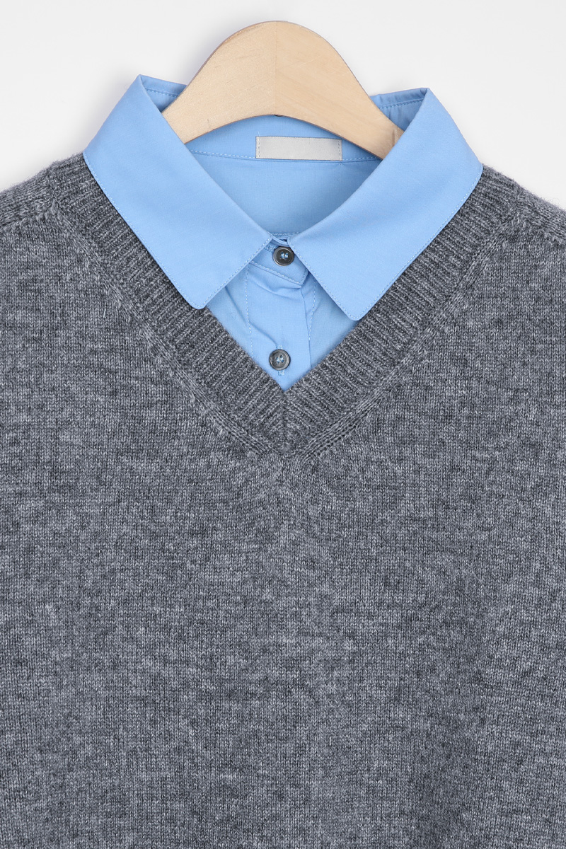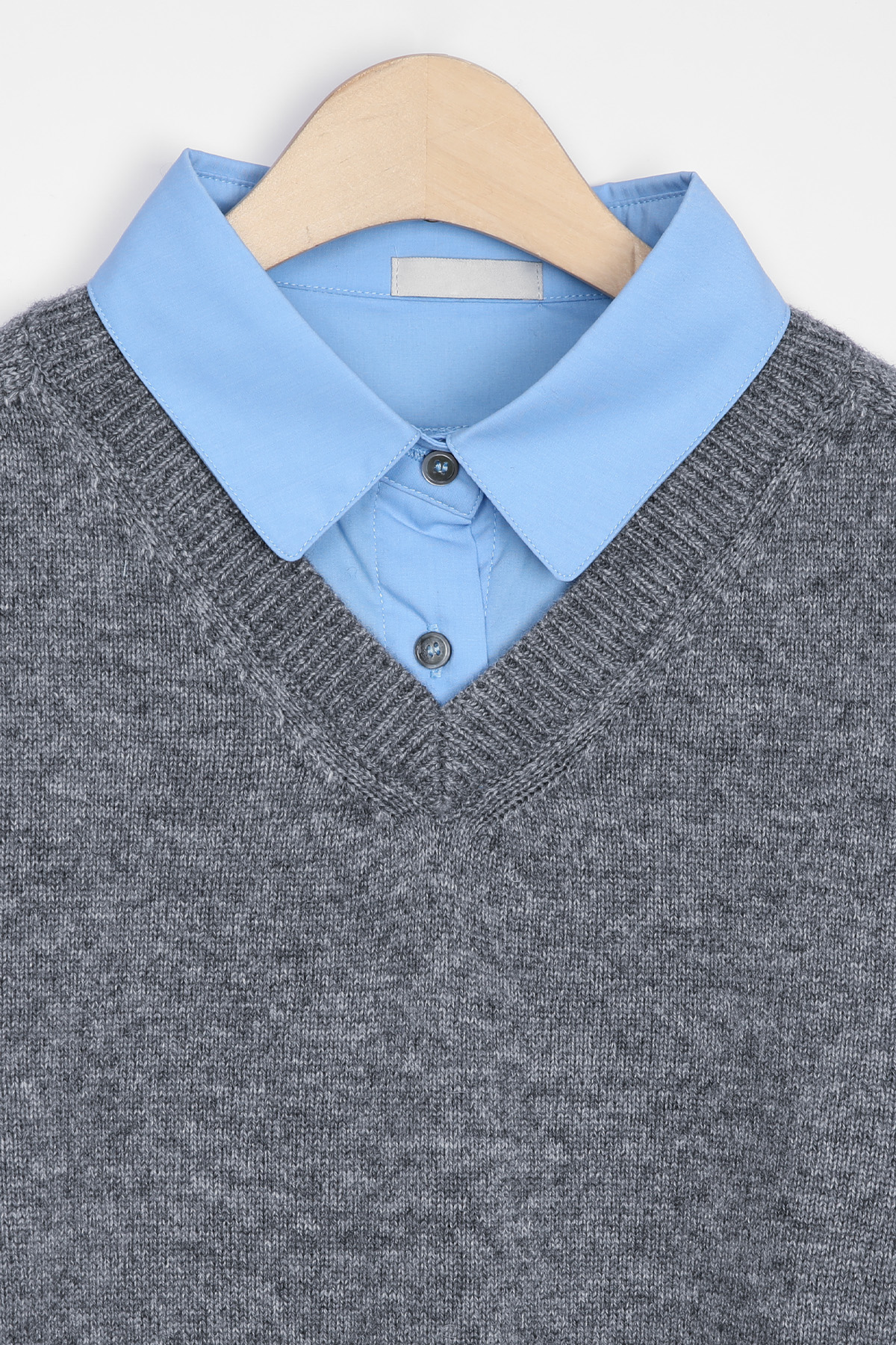 셔츠 위에 니트를 레이어드한 것처럼 보이지만,
