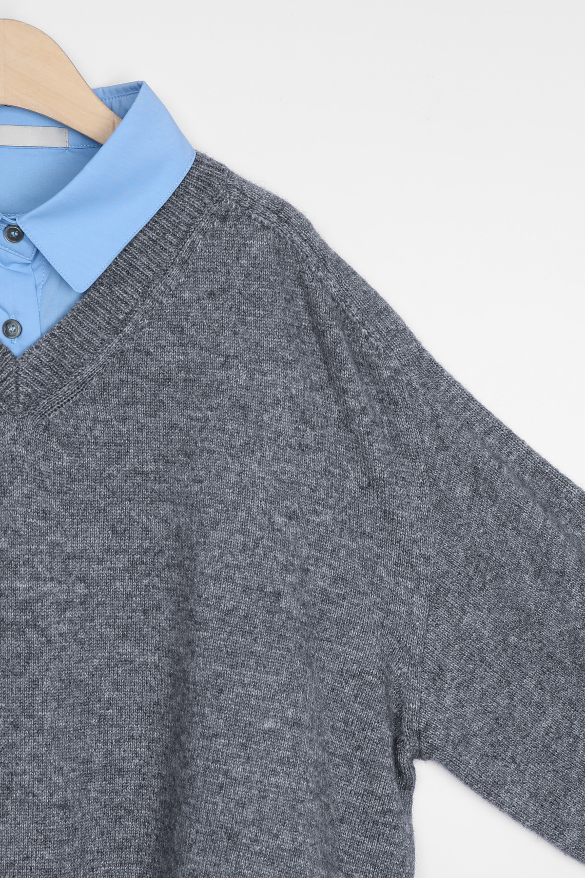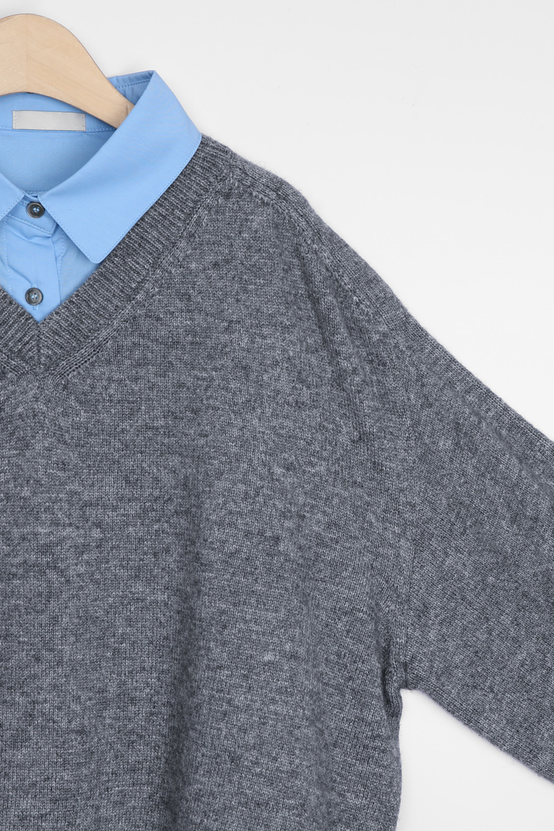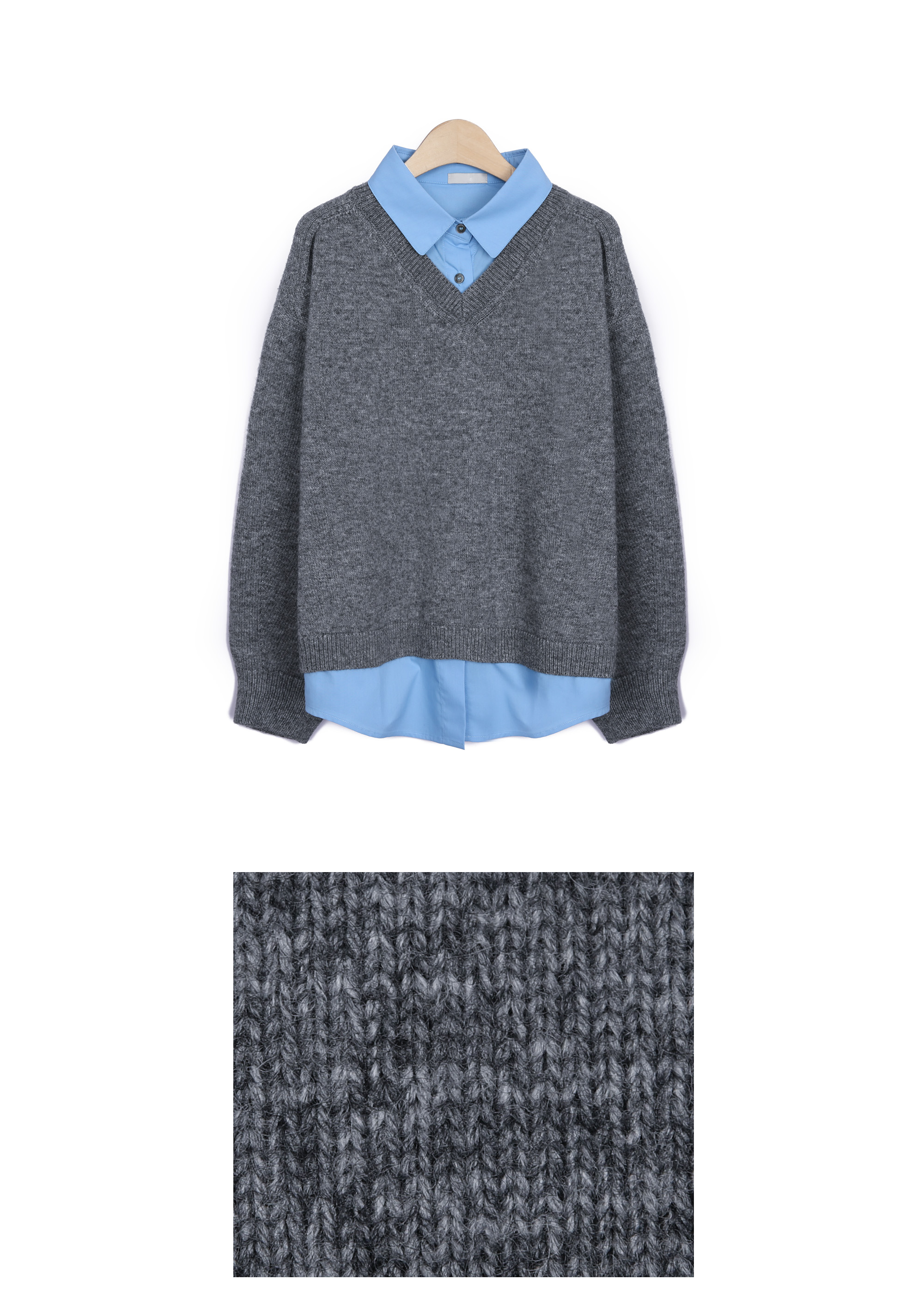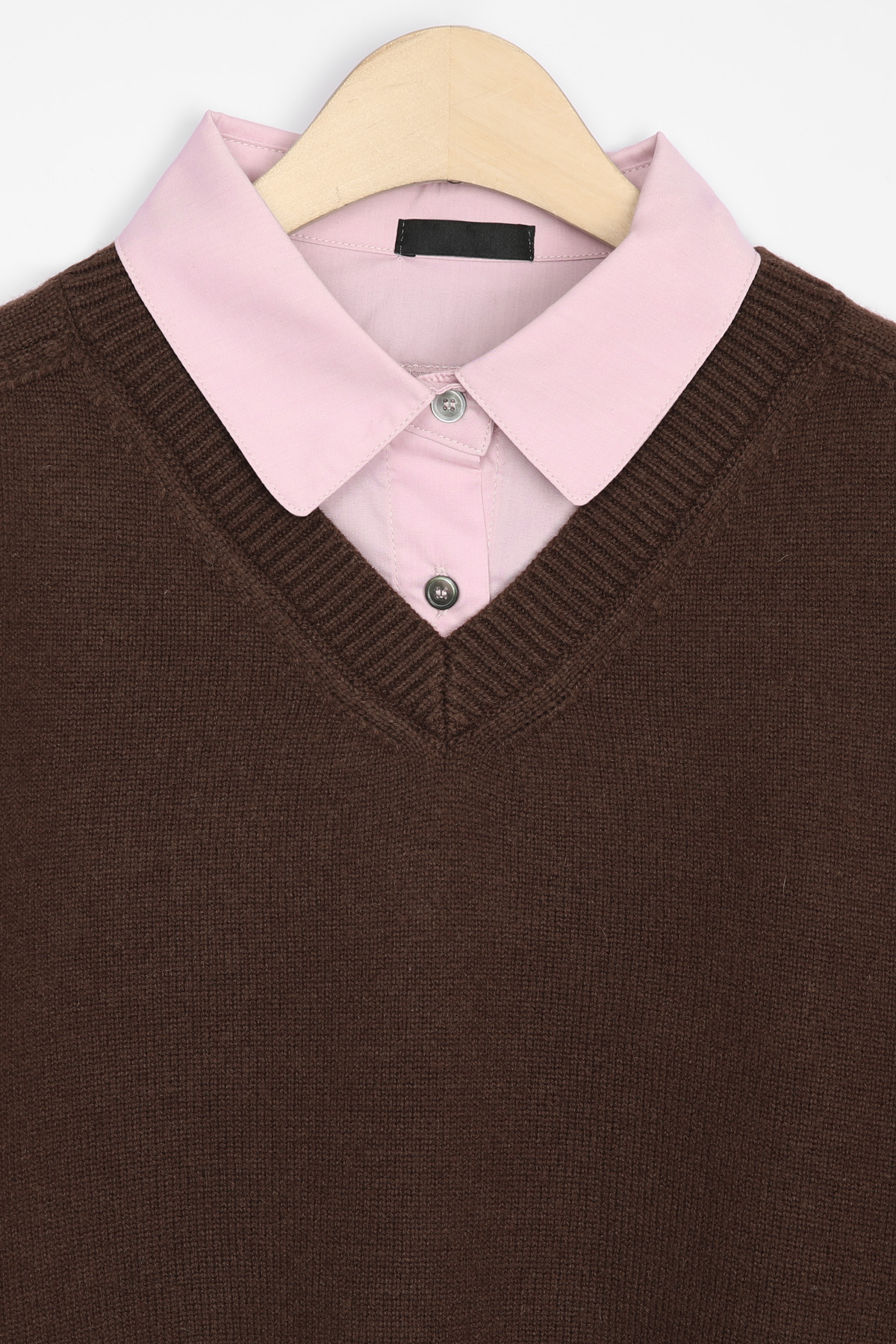 셔츠 위에 니트를 레이어드한 것처럼 보이지만,