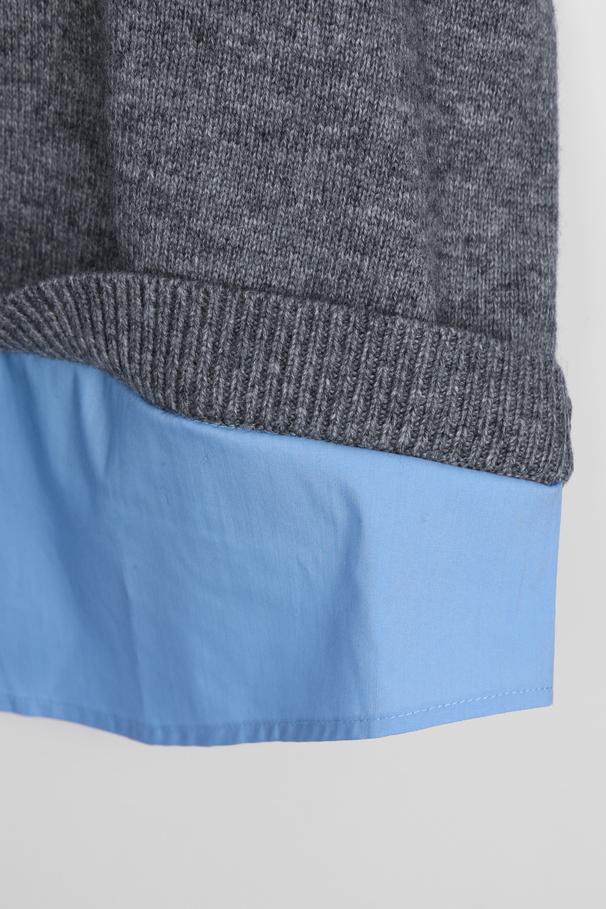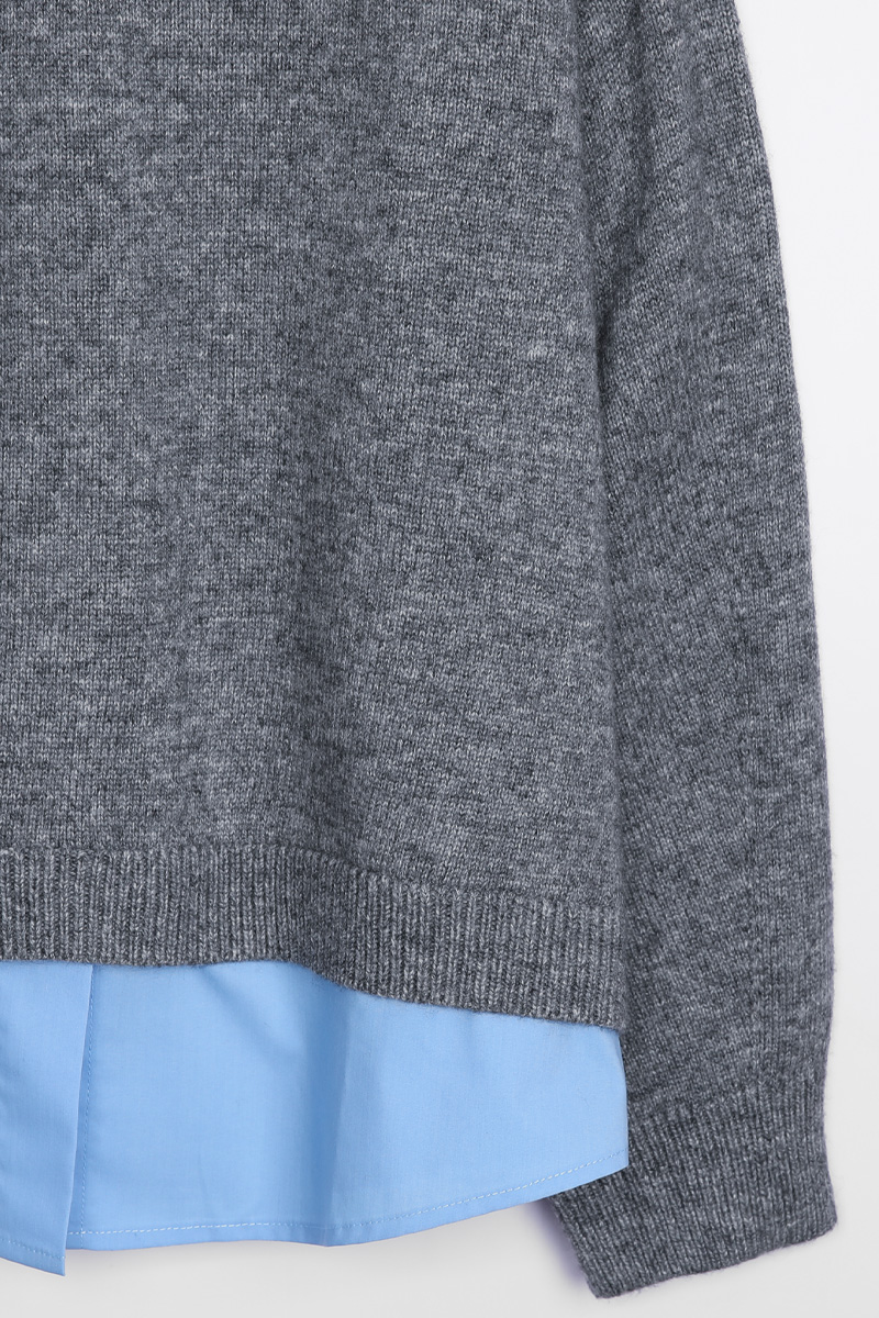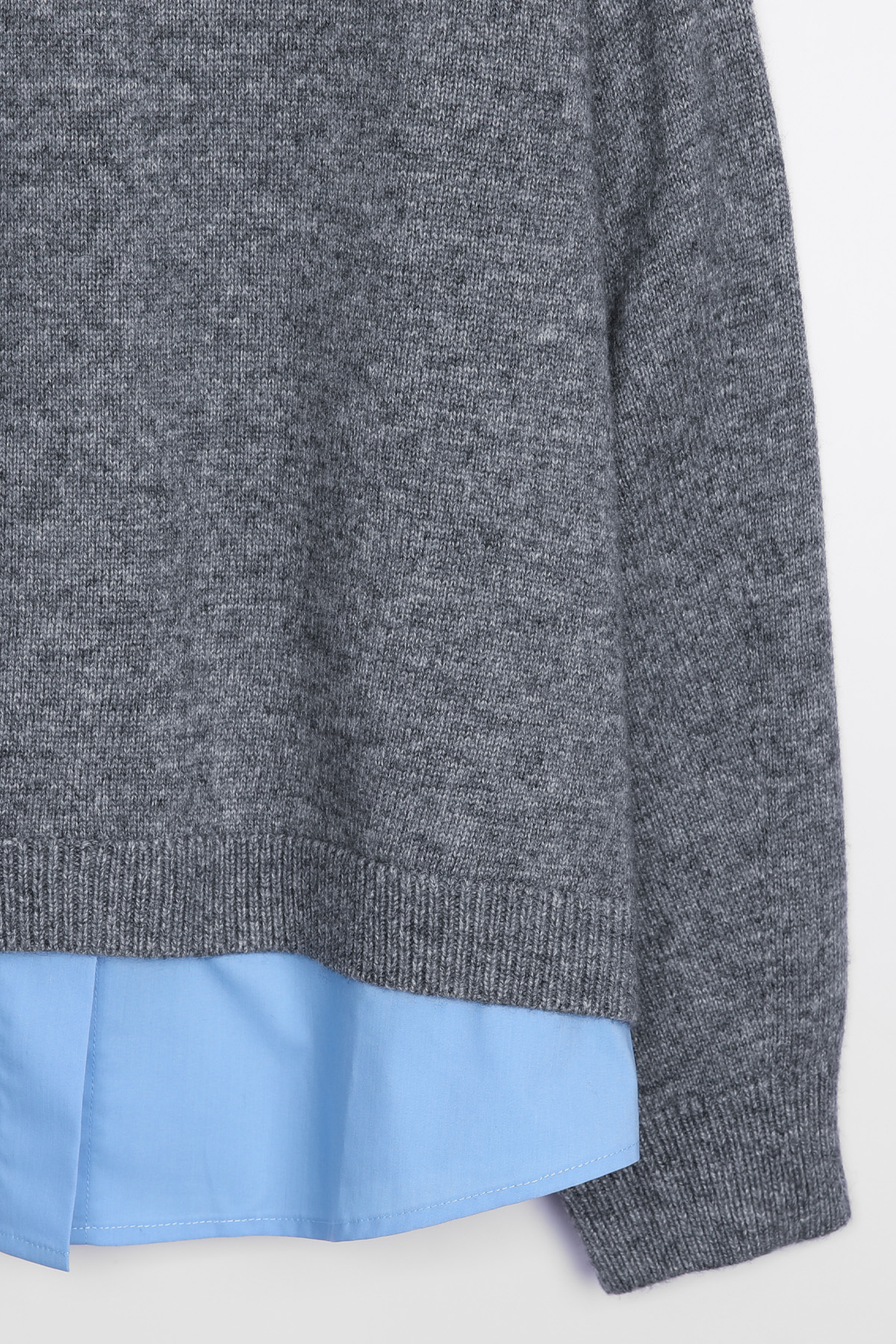 니트 밑단 아래로는 둥근 헴라인 셔츠가