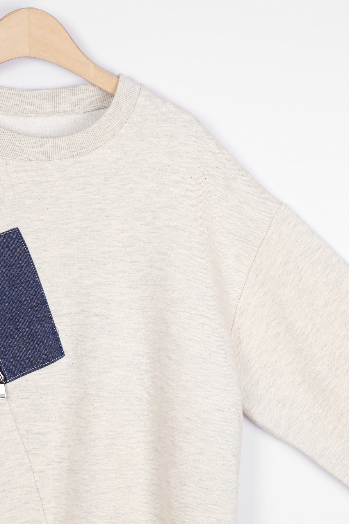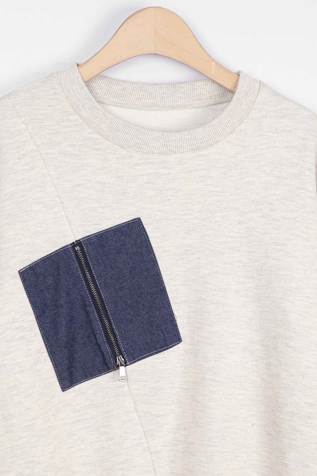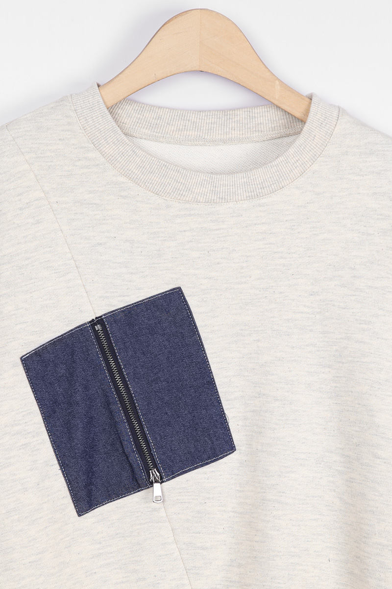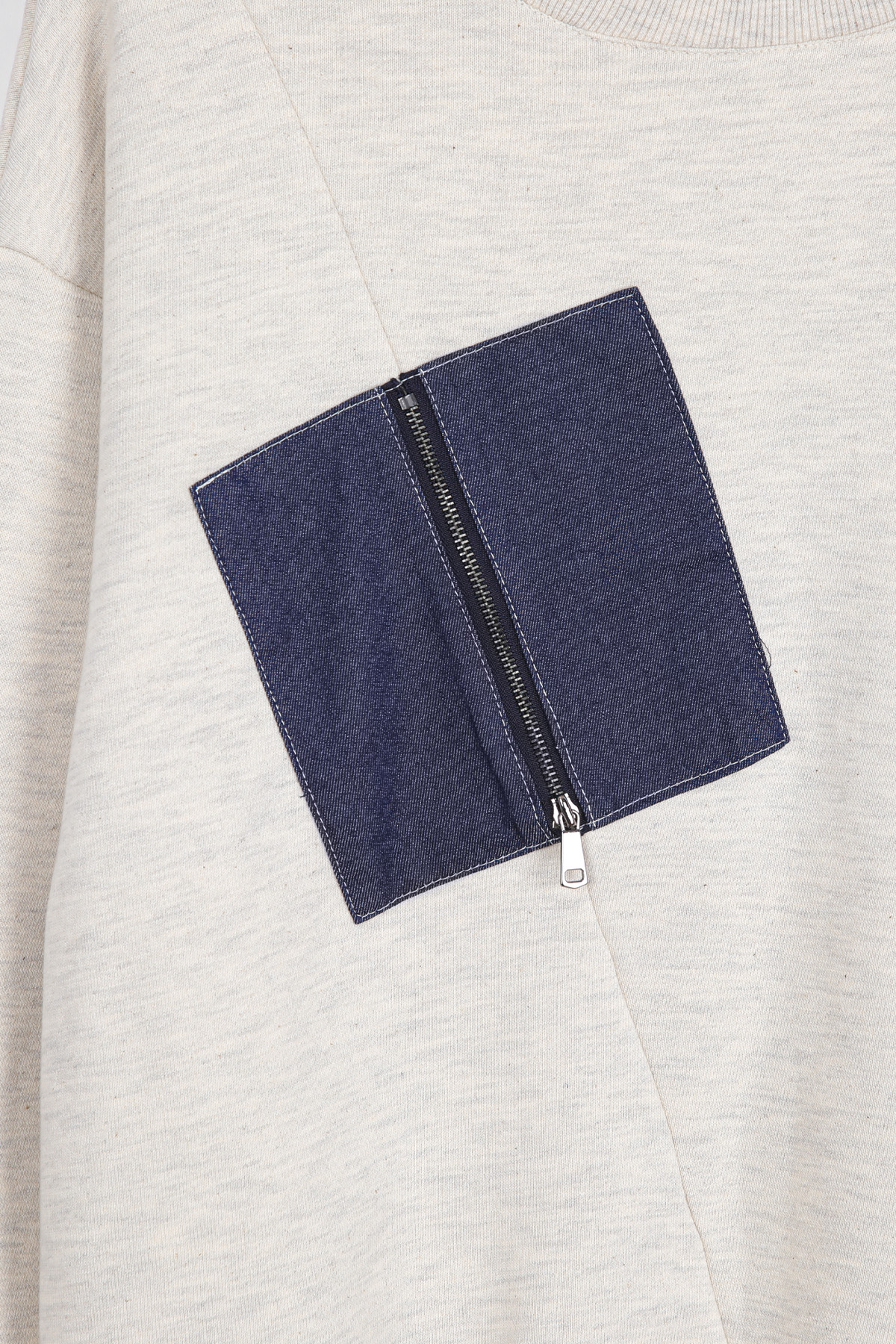 절개선과 데님 블럭 패치의 정중앙 지퍼 라인이