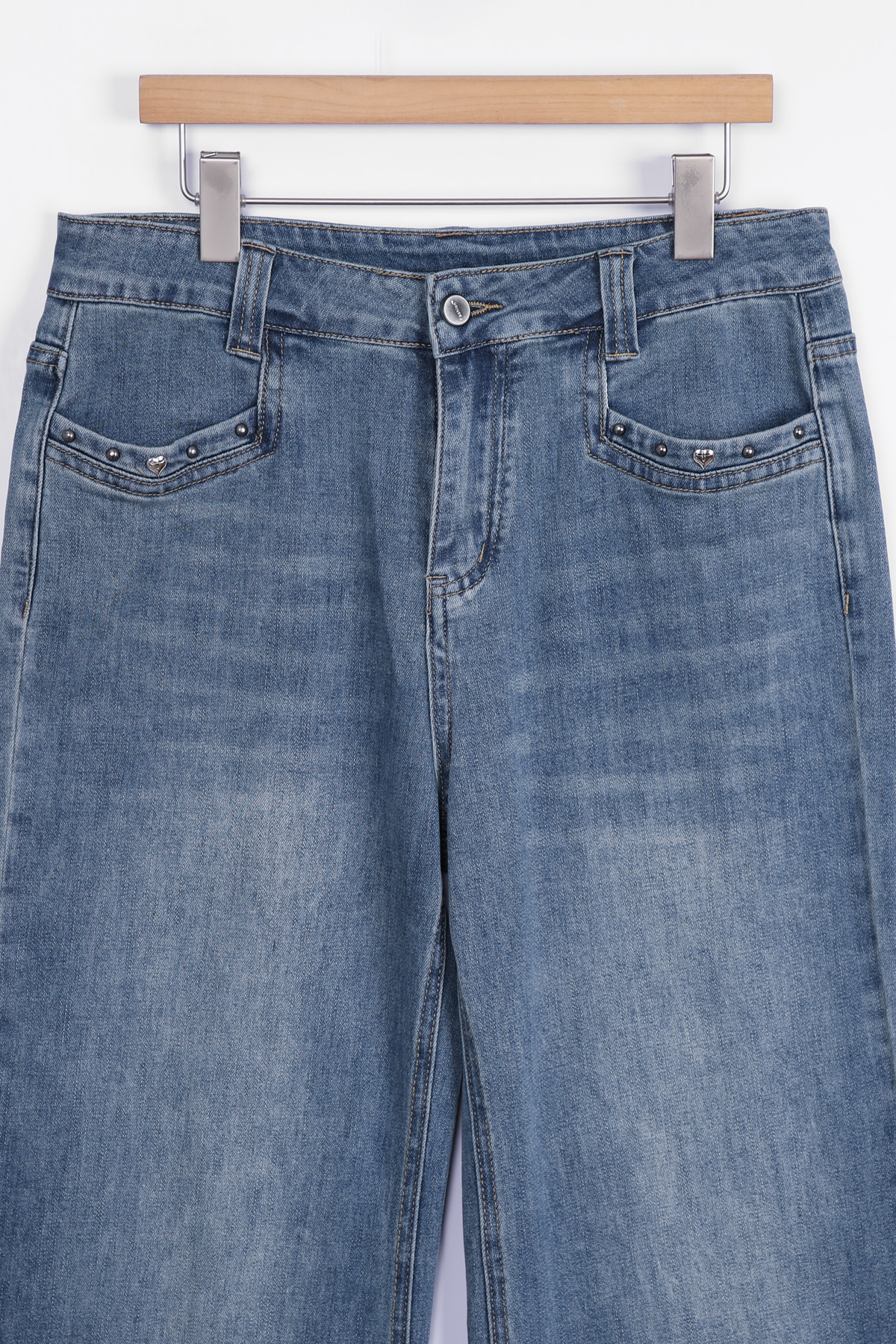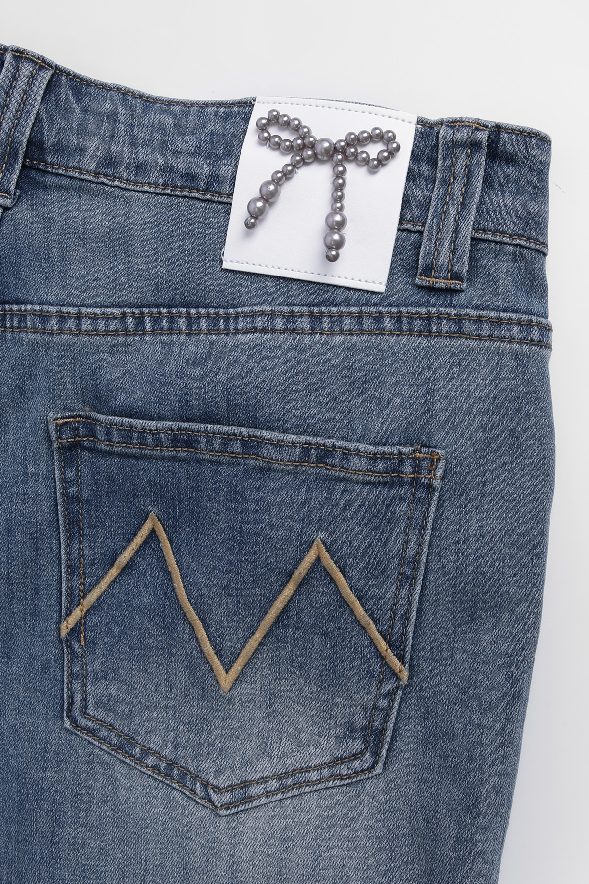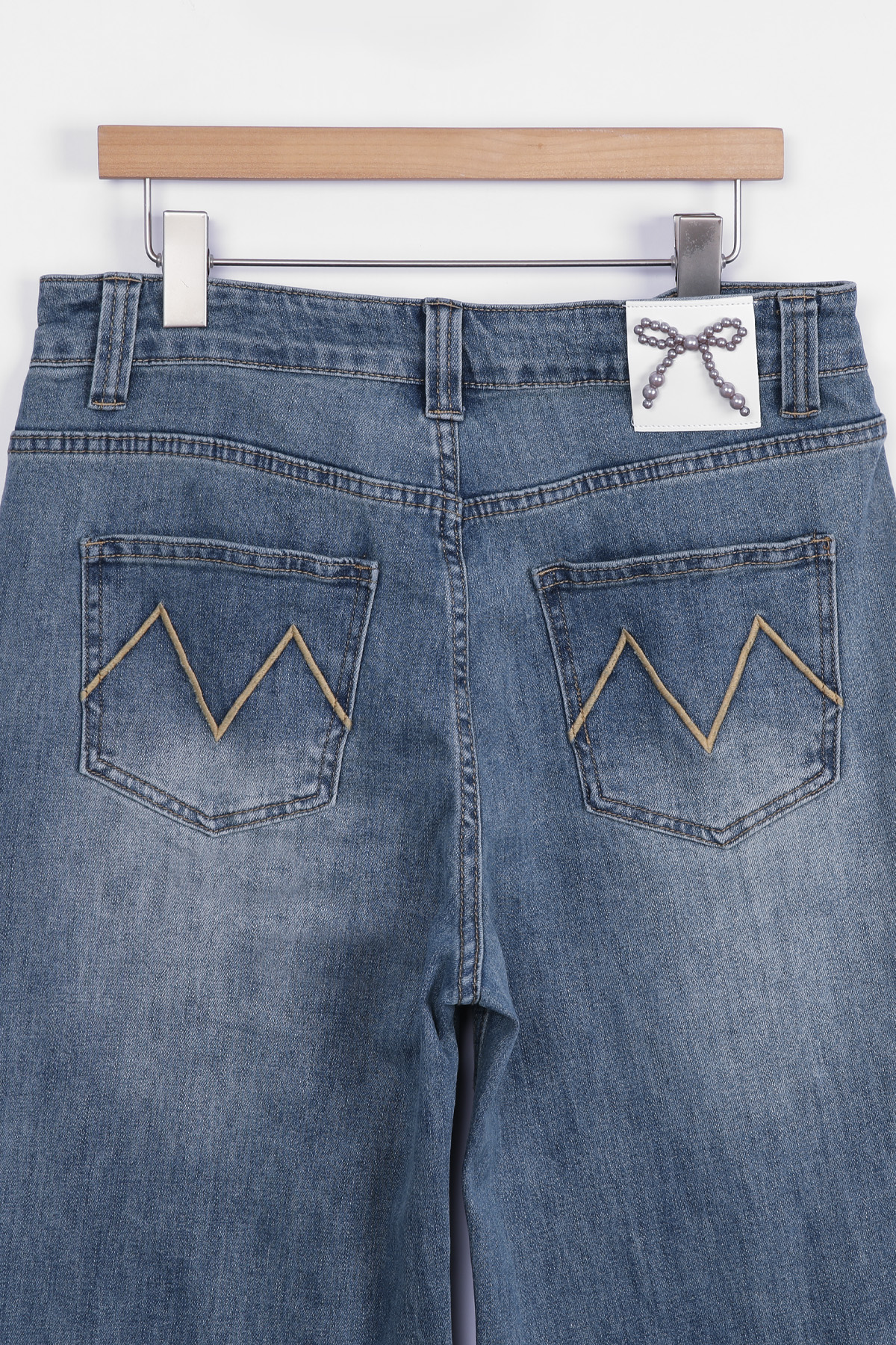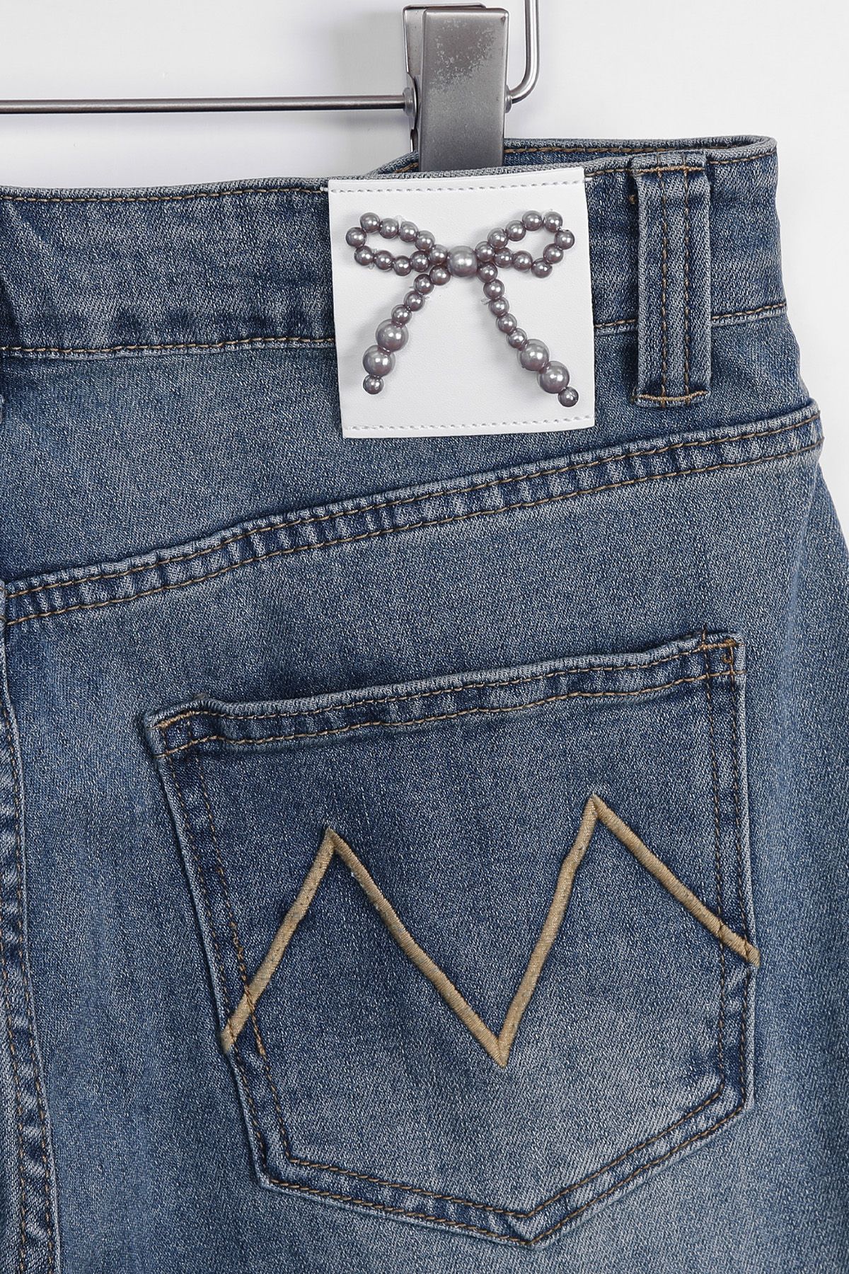 다리를 길고 슬림하게 완성하는 데님 데님과 같은 기본 아이템일수록 전체 스타일이 완전히 달라 보인다는 것 아시지요? 언뜻 사진으로는 기본 청바지처럼 보이지만 부츠컷 실루엣이 매력적인 디자인이에요. 허리부터 힙까지는 안정적으로 라인을 잡아주고 단순한 티셔츠와 매치해도 완성되는 요술같은 비법이랍니다 :) 입체감을 살리는 워싱 디테일 데님 전체에는 자연스러운 워싱 디테일이 더해져 있어요. 앞면 Y존 라인에는 위스커 워싱이 표현되어 빈티지한 분위기를 만들어줘요. 또한 Y존 이하부터 무릎 라인까지 이어지는 연청 워싱은 뒤쪽 힙 아래, 허벅지 라인에도 은은한 연청 워싱이 더해져 데님 컬러를 완성했답니다! 은은하게 빛나는 포켓 장식 앞면 포켓 입구에는 작은 스터드와 하트 장식 디테일이 가볍게 더해져 있어요. 과하게 튀지 않는 실버블랙 톤 메탈이라 포인트가 살아나는 디자인이에요. 데님 특유의 캐주얼한 분위기에 생각해 주시면 되어요 :) 탄탄함과 유연함을 함께 담은 원단 원단은 코튼 베이스에 스판이 혼방된 스트레치 데님으로 제작되었어요. 탄탄한 데님 질감을 유지하면서도 움직일 때 훨씬 편안하게 느껴져요. 간절기에 입기 좋은 두께감이라 안정적인 밀도를 지니고 있어요. 허릿단 안쪽에 별도의 밴딩은 없지만 반 사이즈 정도까지 유연하게 커버되는 착용감을 보여주고 있으니 애매하게 볼록,나온 뱃살 염려하지 마세요 :) 뒷모습을 더욱 돋보이게 하는 포인트 이 데님의 가장 매력적인 부분은 진주 리본 장식과 M 레터링으로 나눌 수 있는 포인트 백 디자인. 허릿단 뒤쪽에는 섬세하게 자리하고 있어요. 데님 위에 더해진 작은 주얼리 같은 포인트라 힙 라인을 살려주는 디테일 백 포켓에는 카키 베이지 컬러의 M 레터링 자수가 들어가 있어요. 포켓 위치가 비교적 위쪽에 배치되어 있어