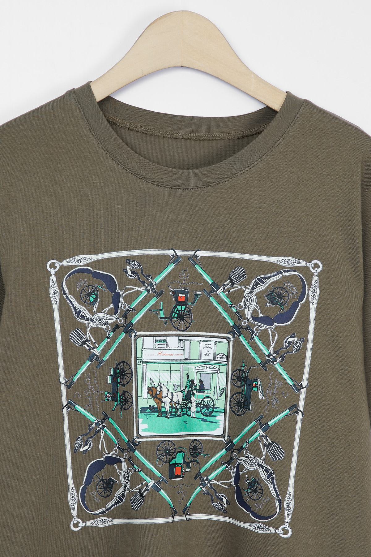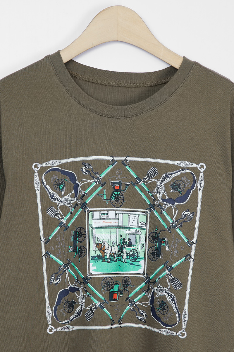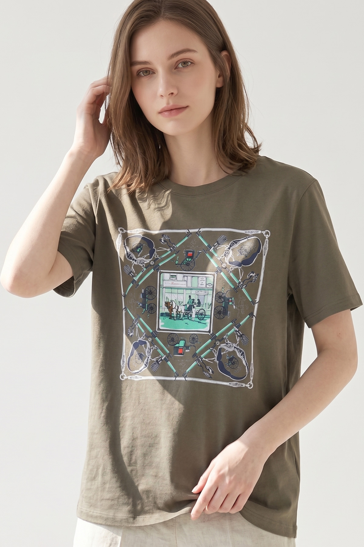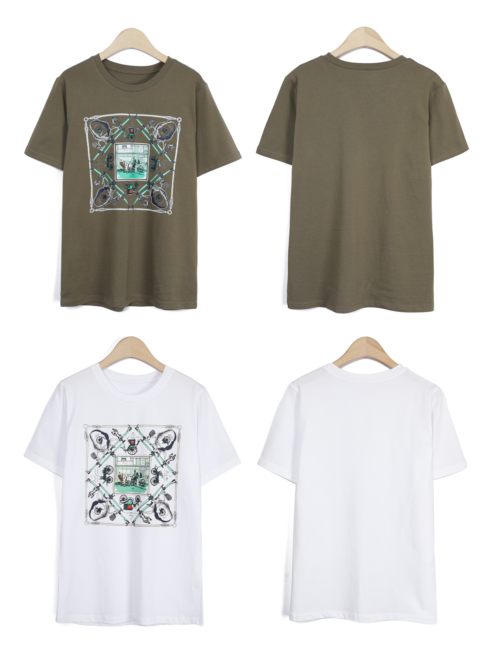 애써 꾸미지 않아도 느껴지는 감각, 티셔츠 한 벌의 그래픽이 전체 분위기를 바꾸어 드려요 :) 지금부터 여름 시즌은 물론, 가을철 아우터 속 이너로도 엉김 없이 활용하기 좋은 면 100% 티셔츠를 소개해 드려요. 고풍스러운 레트로 스타일의 전사 나염 디테일이 있어, 별다른 액세서리 없이도 충분히 감각적인 스타일링을 도와준답니다. 지금부터 적어도 5개월 이상 일상에서 가장 든든한 파트너가 되어줄 아이템이에요. 산뜻하고 가벼운 코튼 100 소재로 제작했어요. 자체적인 신축성이 있는 편이라 입고 벗을 때 뻣뻣함 없이 유연하게 몸을 감싸준답니다. 두툼하지 않고 선선한 질감을 갖추어, 지금 같은 봄부터 여름 내내, 그리고 초가을까지 단품으로 즐기기 딱 좋은 두께감이에요. 피부와 비슷하거나 살짝 낮은 온도를 유지해 주는 소재라 맨살에 닿는 느낌이 무척 쾌적하실 거예요. :) 차분한 카키와 깨끗한 화이트, 두 가지 컬러로 제작했어요. 카키는 비침이 전혀 없어 단독 착용이 무척 편안하고요. 화이트는 여름 기본 티 정도의 약한 비침이 있지만, 전면의 사각 나염 디테일이 시선을 분산해 주어 특히 가슴선 비침 부분 전혀 신경 쓰이지 않았어요. 두 컬러 모두 굳이 이너 슬리브리스를 챙겨 입지 않아도 되는 정도라, 한여름에도 한결 가볍게 착용하실 수 있답니다. :) 전면의 배색 나염은 원단 위에 열압착해 준 전사 나염 방식으로 제작되었어요. 이 덕분에 그래픽의 선명함과 레트로한 무드가 더욱 잘 살아난답니다! 오래도록 프린팅 손상 없이 입으시려면 케어라벨에 기재된 대로의 세탁을 권장드리며 부득이 직접 세탁하실 경우 뒤집어서 가볍게 단독 손세탁하시는 것을 권장해 드려요. 세심한 관리가 지속된다면 퀄리티가 오랫동안 무너지지 않고 항상 새 옷처럼 입으실 수 있어요 :) 양 옆목으로 살짝 여유를 둔 라운드넥 디자인이에요. 목에 타이트하게 올라붙지 않아 답답함이 없고, 오히려 목선이 가늘어 보이면서 여성스러운 분위기를 자아내는 기분이었어요. 코튼 100이지만 직조 특성상 자체 텐션 있어 입고 벗을 때 목선 안쪽으로 화장품 묻어날 염려 또한 없어요! ✔ 키 165 / 정 66 기준 스탠다드 레귤러 핏 어깨 & 소매: 어깨선이 기본형보다 약 여유 팔뚝 군살을 충분히 가려주는 넉넉한 3부 소매 기장 바스트 & 허리: 여성스러운 가슴선을 살리면서 허리선은 여유 있게 떨어지는 일자 핏 기장: 힙선과 중힙 사이를 가뿐하게 덮어주는 안정적인 길이감 짧뚱하지 않고 날씬해 보이되 레귤러핏으로 잘 빠진 디자인이라 55부터 66반까지 두루 예쁘게 소화 가능하셔요. 특히 소매 기장이 적당히 여유로워 팔뚝 가림이 필요하신 회원님들께 적극 추천해 드려요 :) 거울 앞에서 티셔츠 한 벌을 고를 때, 결국 손이 자주 가는 건 내 몸의 단점을 파악해 가려주고 동시에 편안하게 만들어주는 옷이죠. 흡습성과 통기성 좋은 코튼 100의 쾌적함, 그리고 데님 하나만으로도 코디를 완성해 주는 키치한 프린팅. 이 두 가지 조화가 주말과 평일 내내 기분 좋은 여백이 되어줄 거예요. 가볍게 툭 입어도 흐트러짐 없이 깔끔하게 떨어지는 이 핏, 하루를 시작할 때 자연스럽게 손이 가는 한 장이 되어줄 거예요!