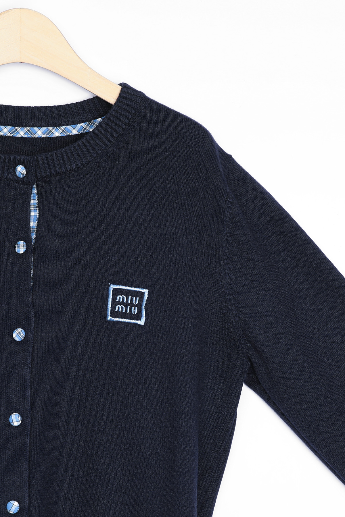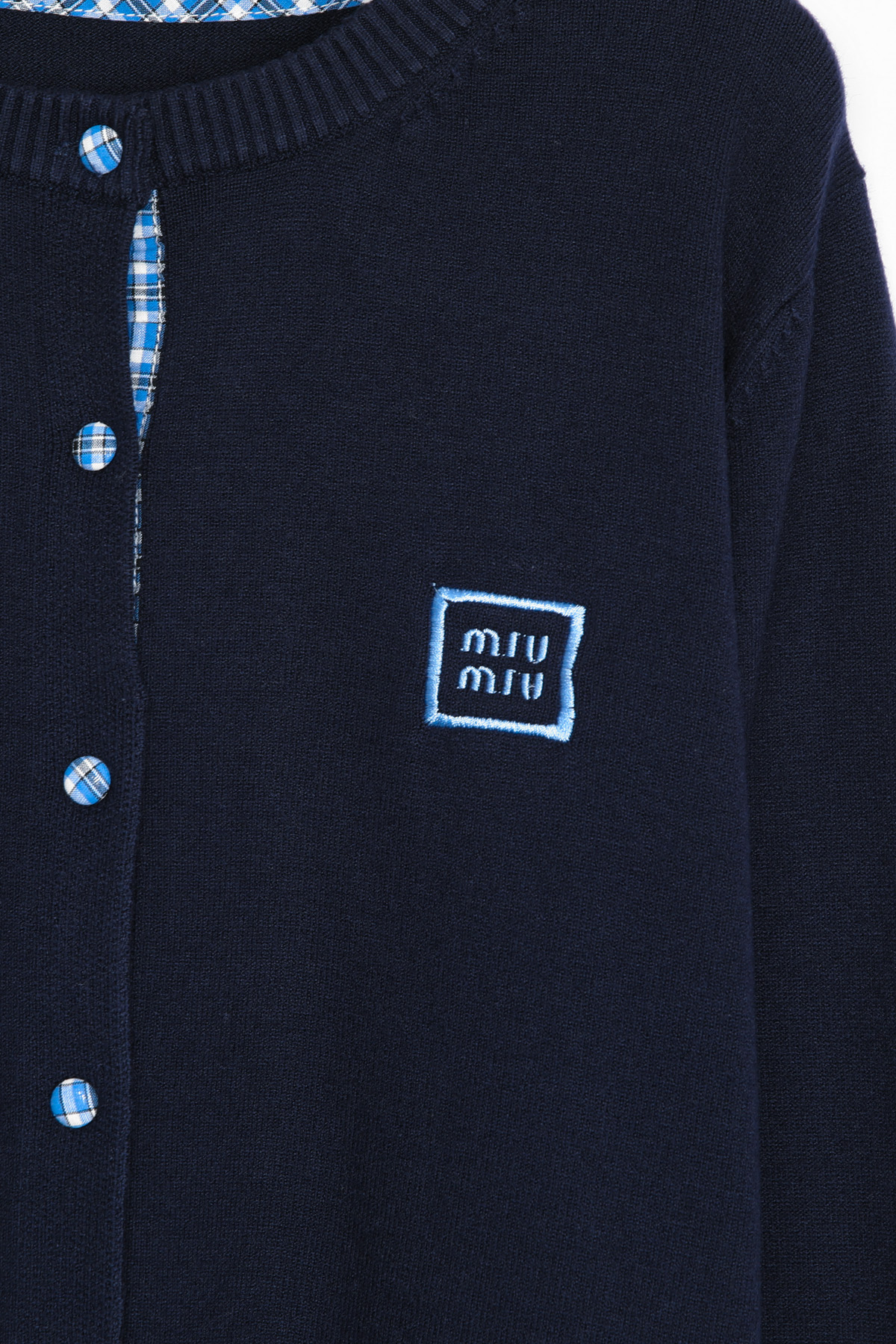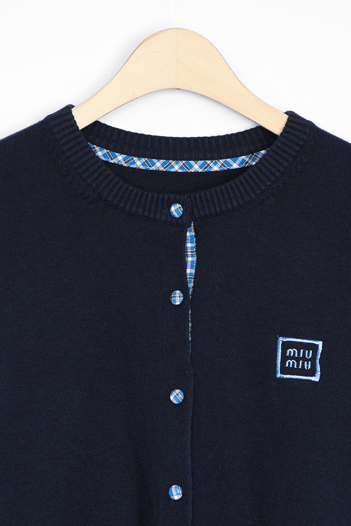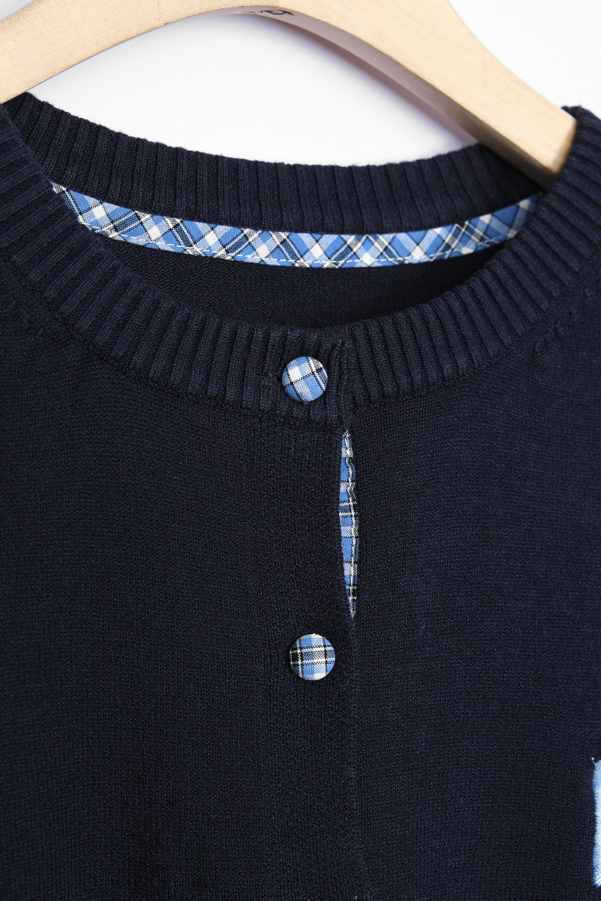 총 7개의 블루 체크 싸개 단추가 배열되어 있으며