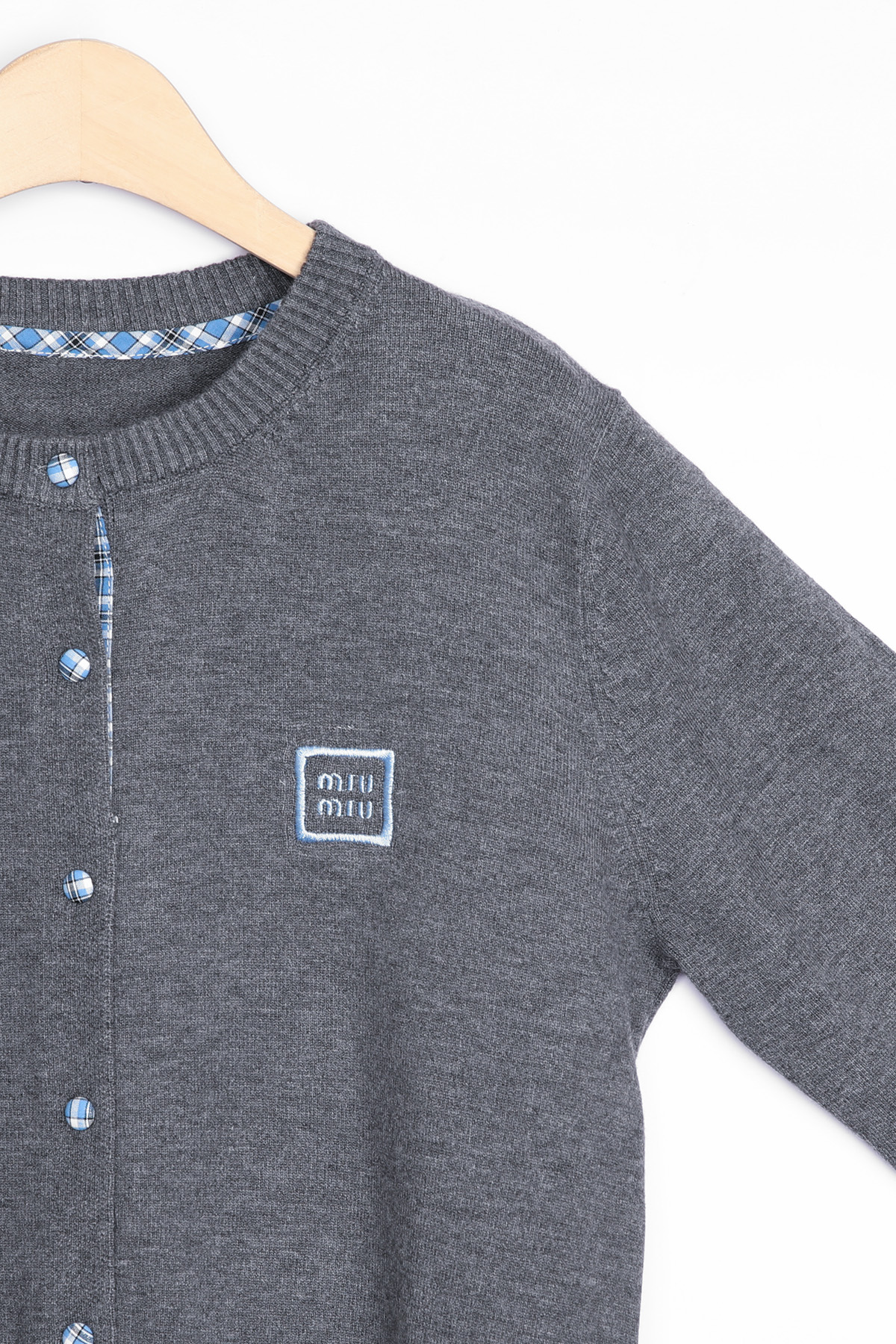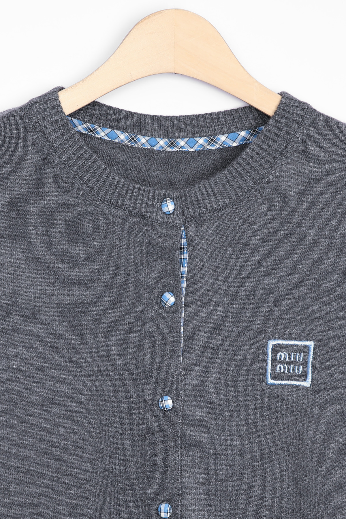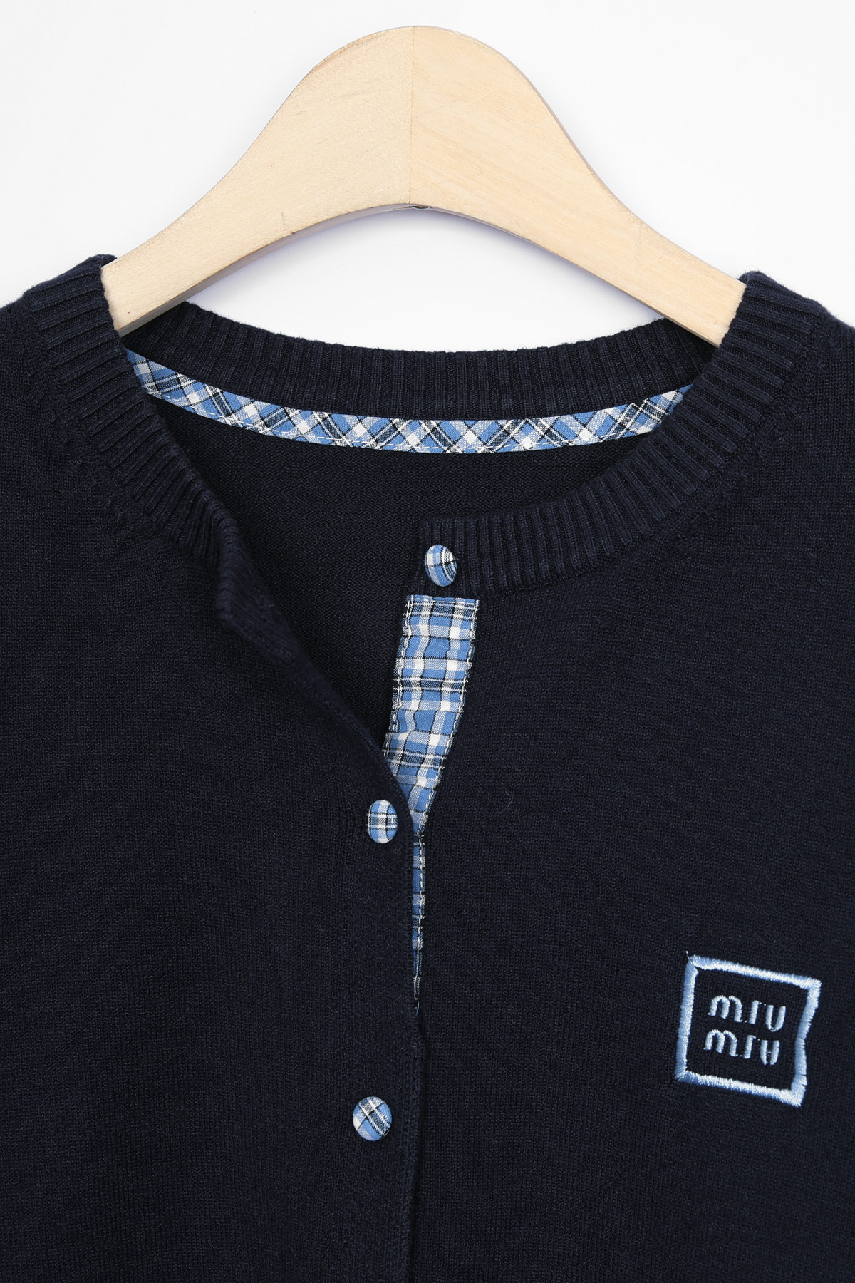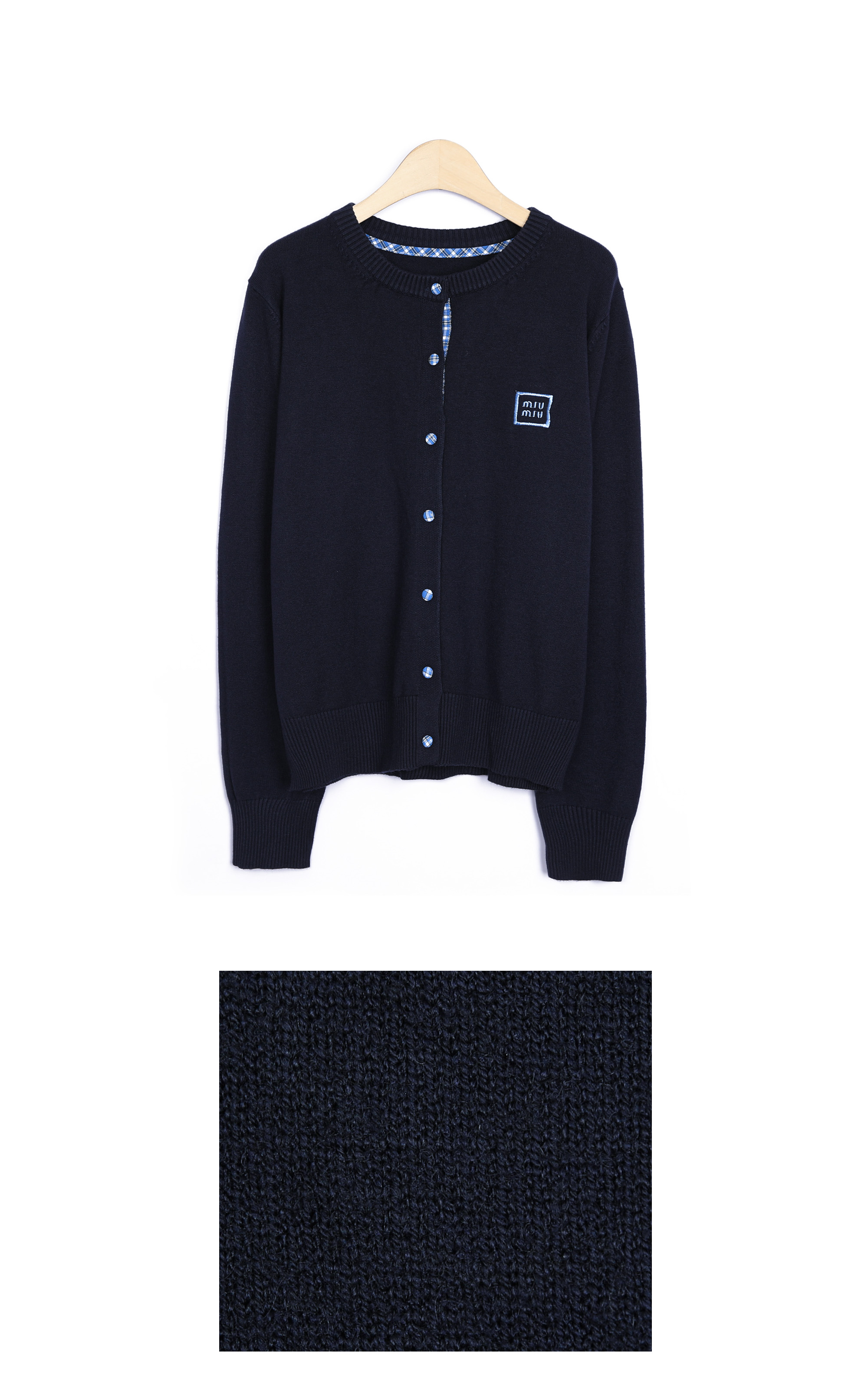 총 7개의 블루 체크 싸개 단추가 배열되어 있으며