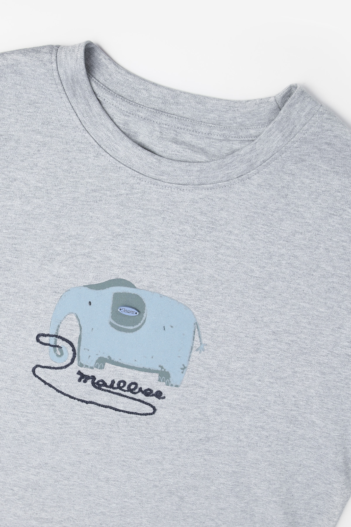 보자마자 편안하게 남는 인상** 과하게 눈에 띄지 않는데, 이 아이가 딱 그런 타입이랍니다! 잔잔한 멜란지 그레이 위에 튀지 않는데도 이건 단순한 프린팅이 아니라 단순한 그레이가 아닌 이유** 연그레이와 중그레이가 섞인 한 톤으로 떨어지는 그레이보다 덜 밋밋하게 느껴지는 이유예요. 여기에 블루 톤 그래픽과 전체 컬러가 흐트러지지 않고 무난한데 심심하지 않은, 편안함에 ‘여유’를 더한 소재** 면 94 + 스판 6 혼방으로 면 특유의 부드러운 터치는 그대로 두고 ✔ 피부에 닿는 느낌은 자연스럽고 얇게 흐르는 여름용이 아니라 봄, 간절기, 초여름 전까지 손이 자주 가는 텍스처예요. 과하지 않게 중심을 잡아주는 포인트** 그래픽은 중가슴 위치에 배치되어 시선은 자연스럽게 위로 끌어주고 있어요. 엘리펀트 모티브 위에 더해진 프린팅 하나로 끝나는 느낌이 아니라 이 패턴은 전체적으로 귀엽다는 느낌보다는 엘리펀트 그래픽, 너무 영하지 않을까? 하는 걱정은 잠시 접어주셔도 좋아요 :) 편안하게 흐르지만 가벼워 보이지 않는 핏** 어깨선은 기본형, 쇄골선은 가볍게 덮어주는 단정한 넥라인과 어깨에 안착하는 기본형 실루엣은 정돈된 인상을 선사해요. 2.5부까지 오는 슬리브 라인까지는 적당한 여유를 둔 날씬 슬리브 핏으로써