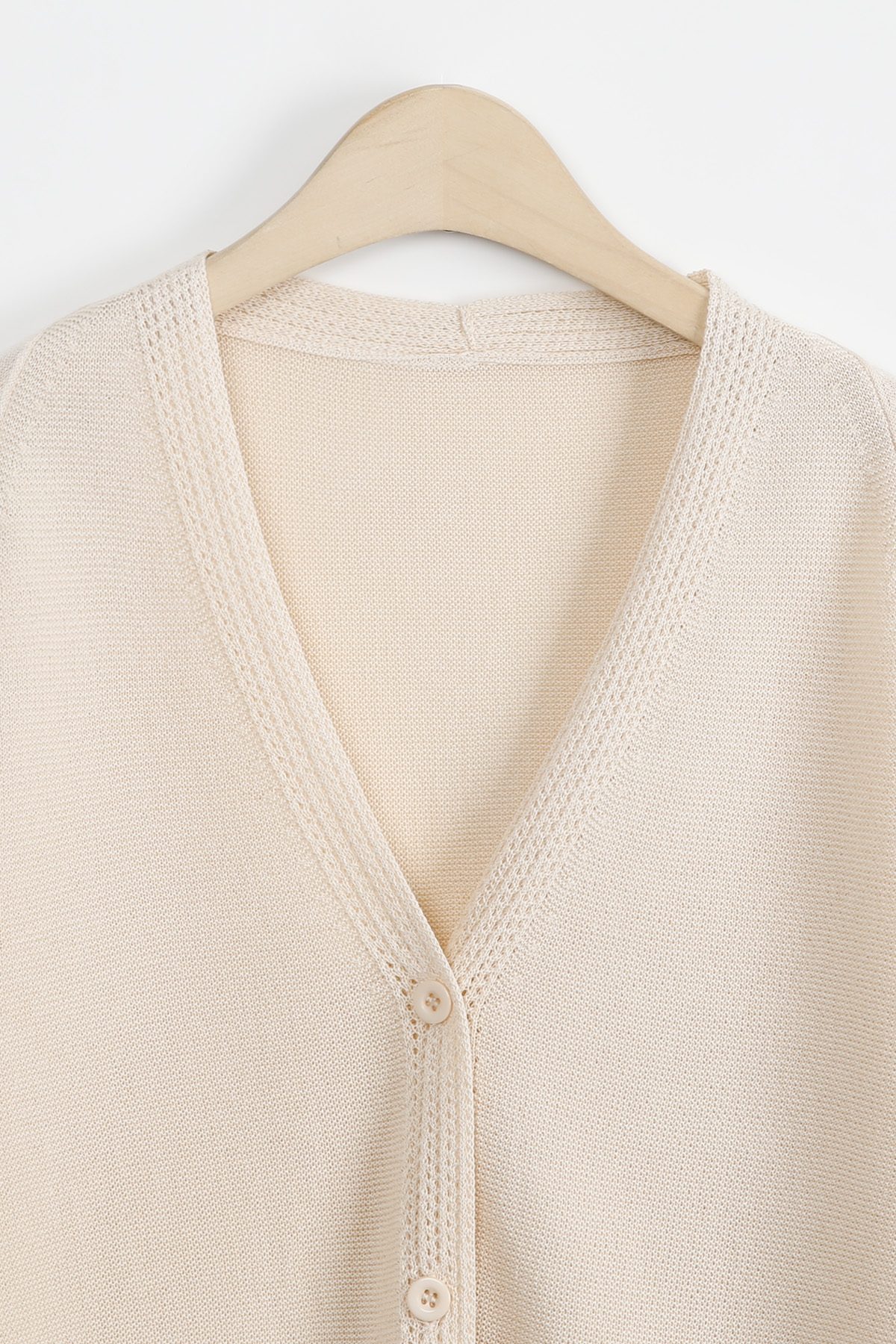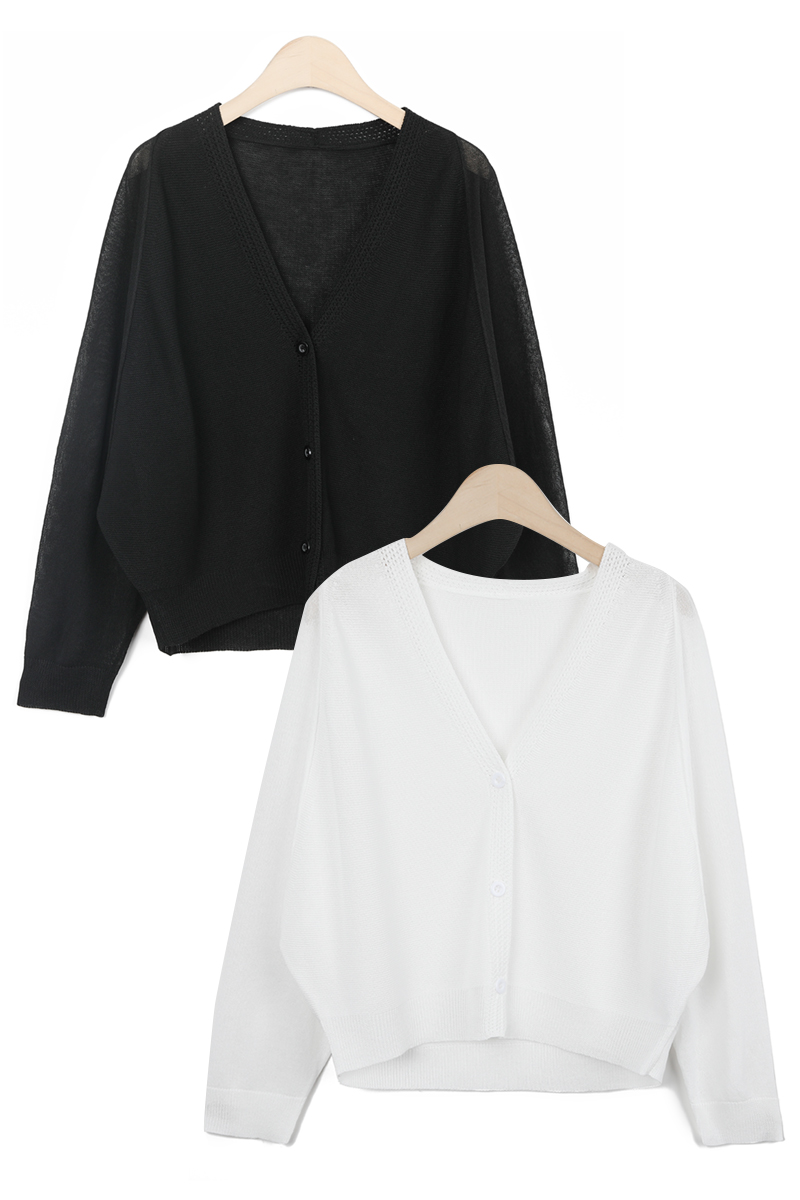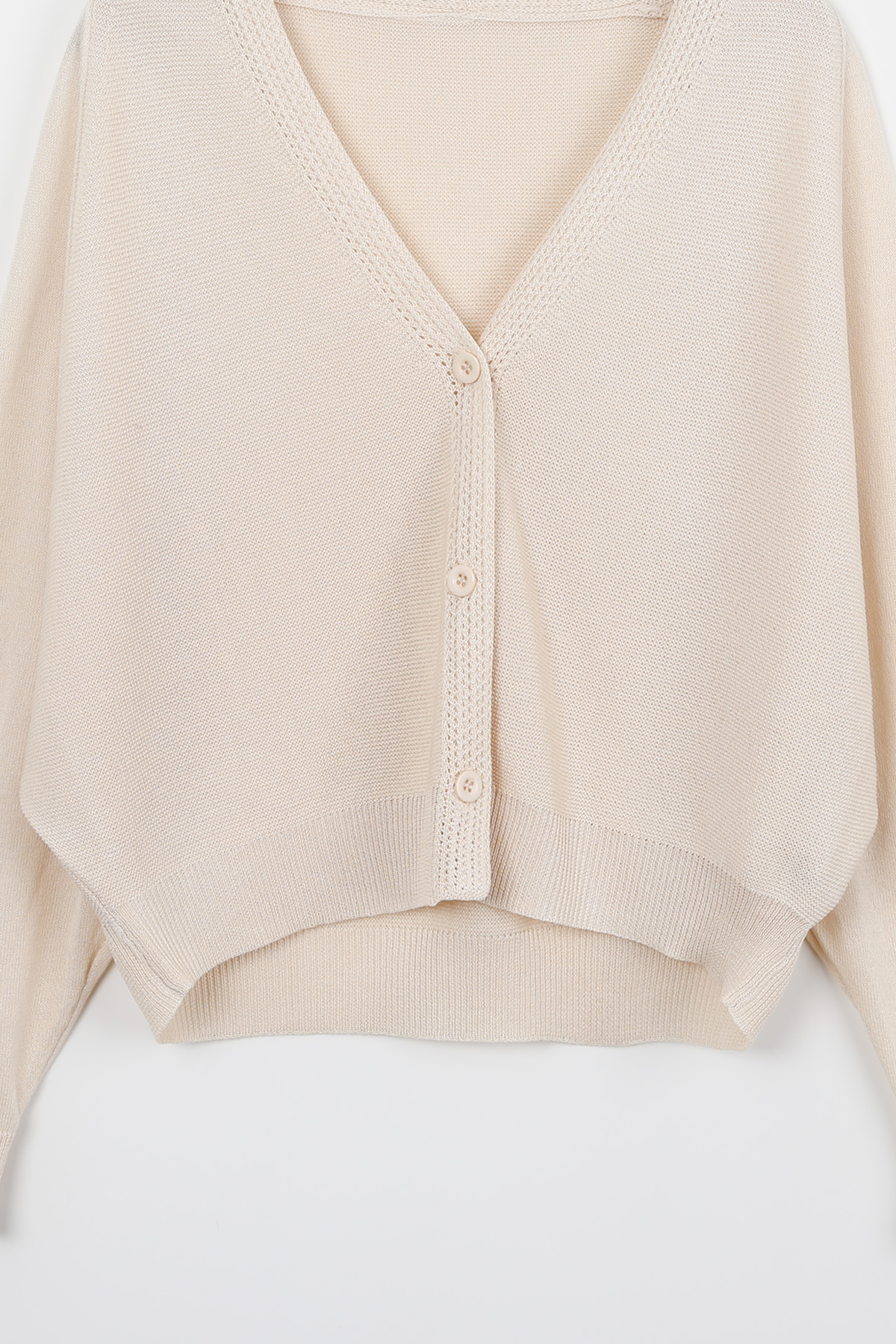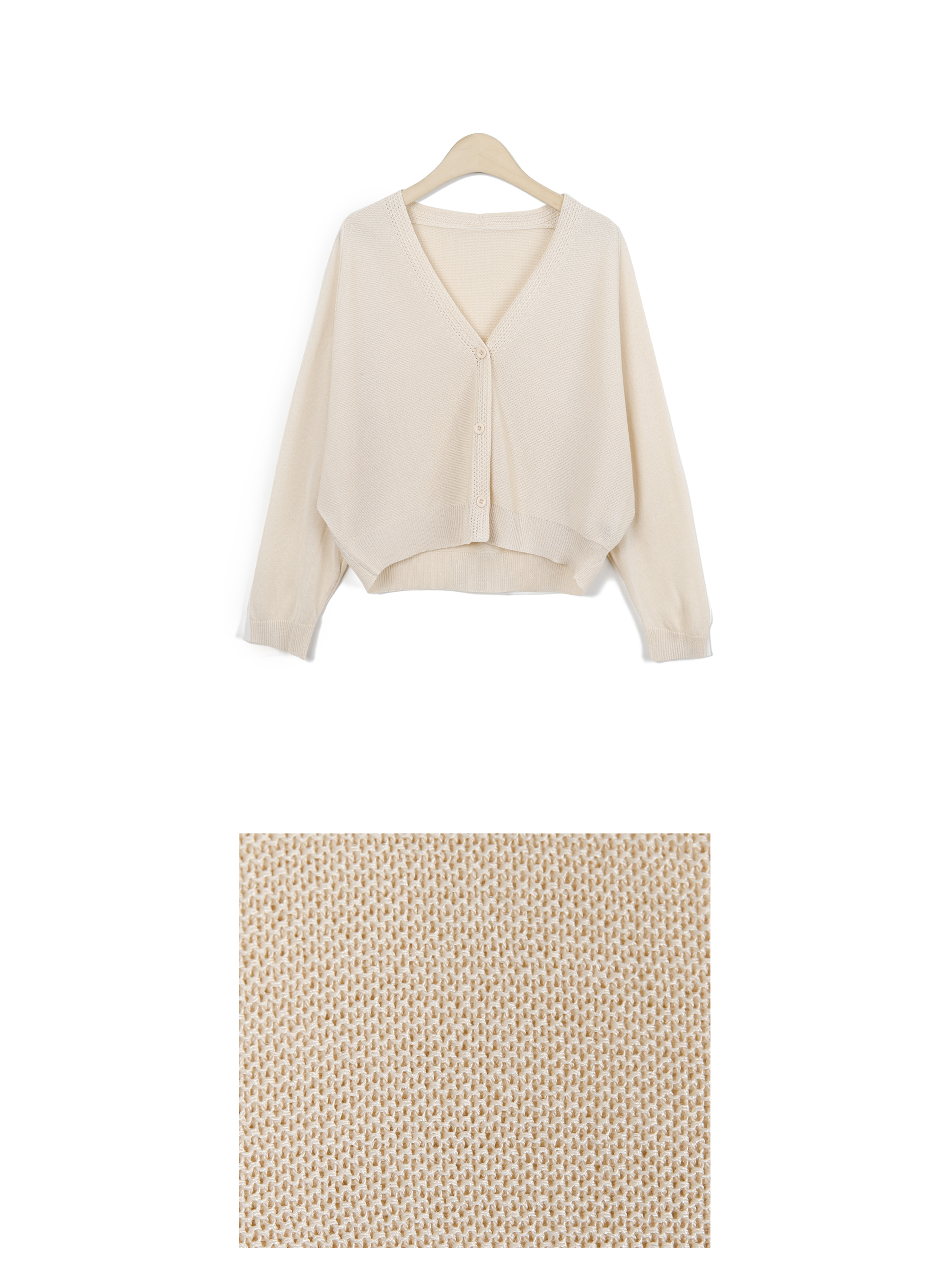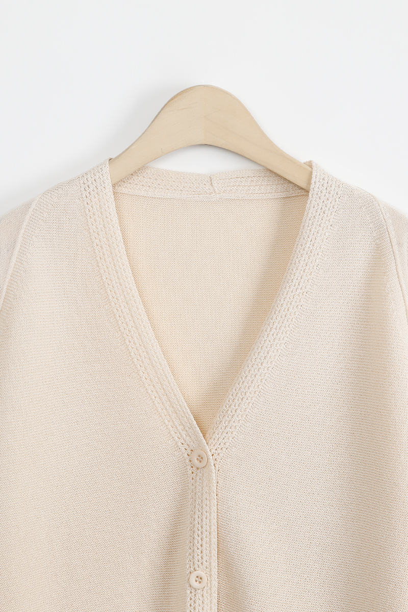 v라인 디자인이며 정면 3개의 단추로 버튼업 가능해요앞섶 밑단부터 목선 뒷면까지는 몸판 짜임과 조금 다른 직조인데펀칭 레이스 직조감이 느껴지는 패턴이라기본형에 여성미를 가볍게 머금은 듯한 느낌이었어요