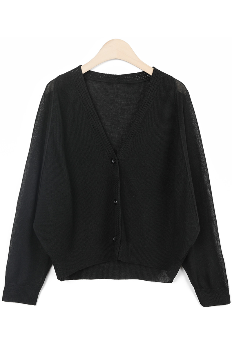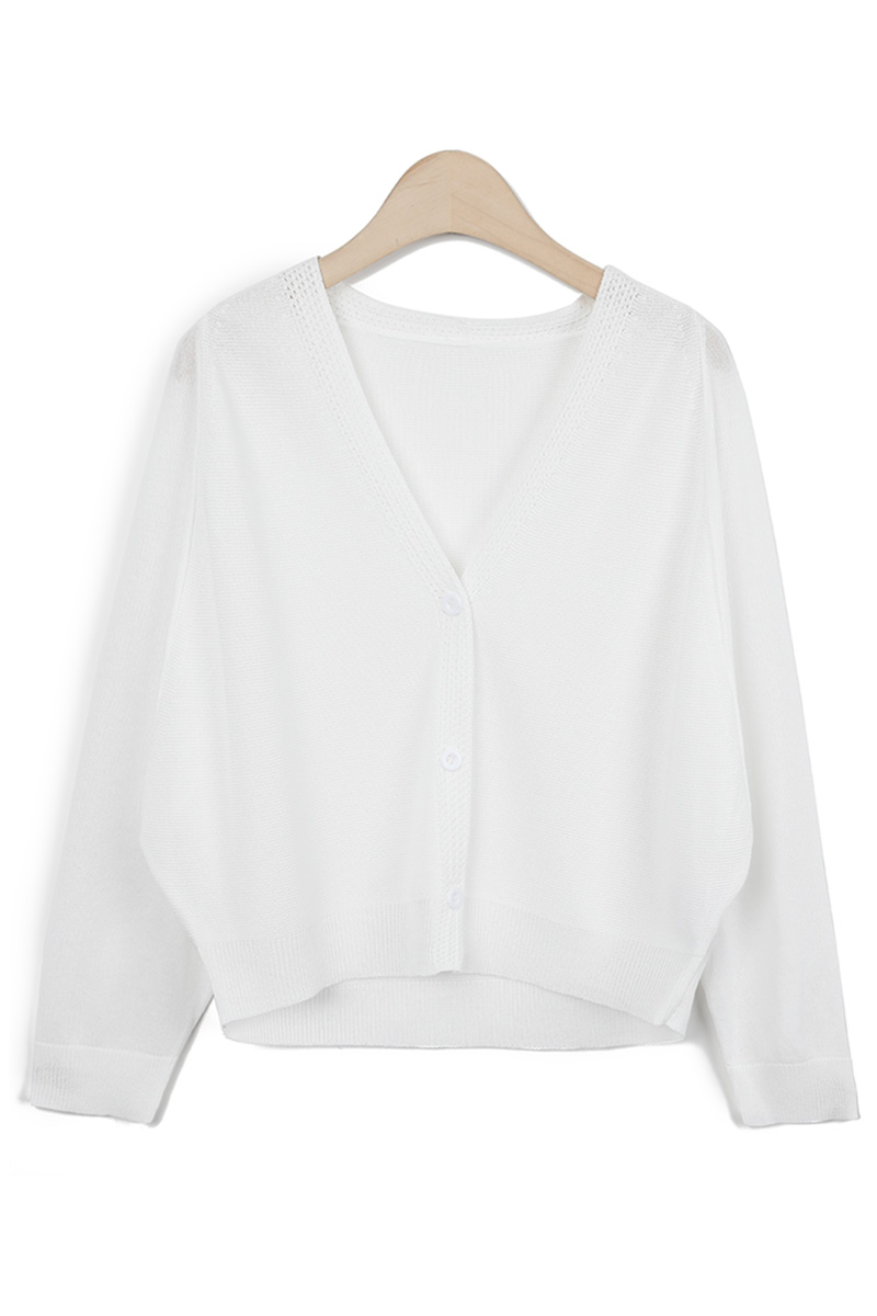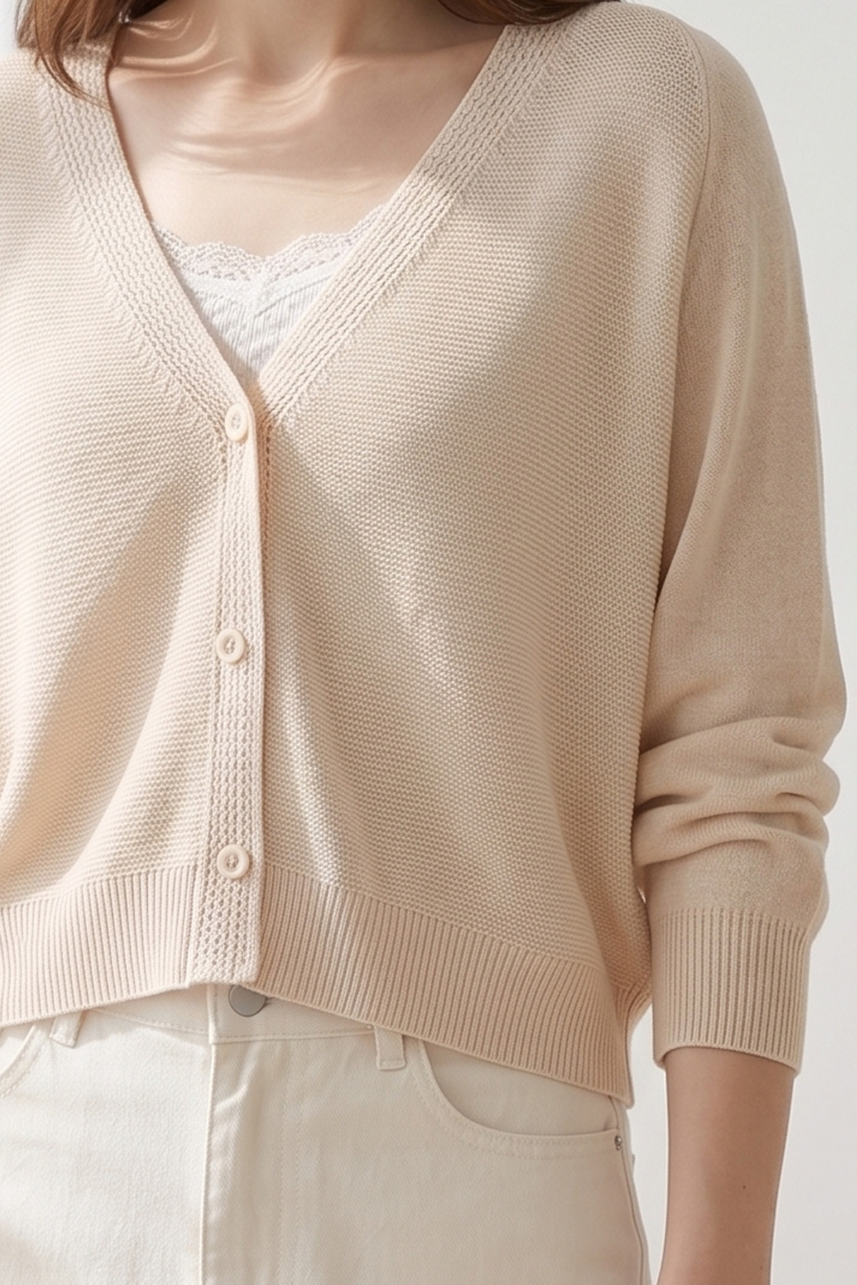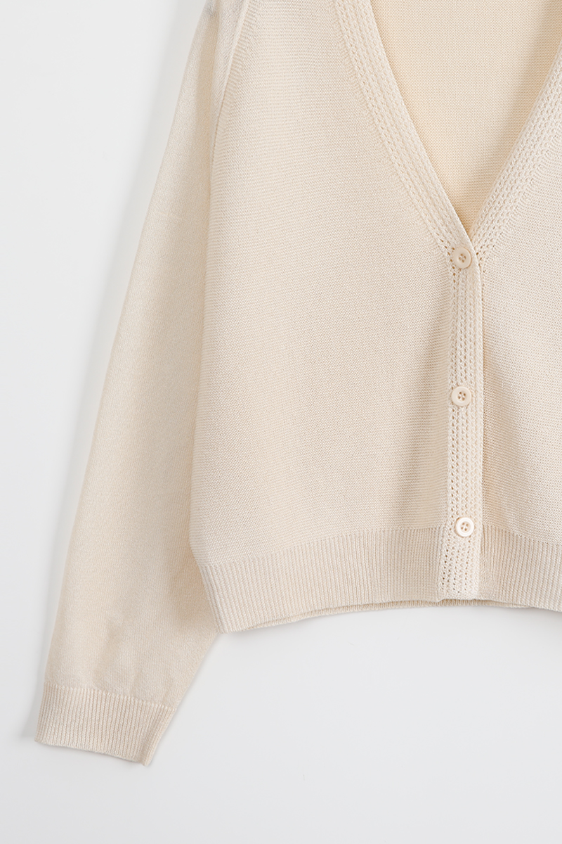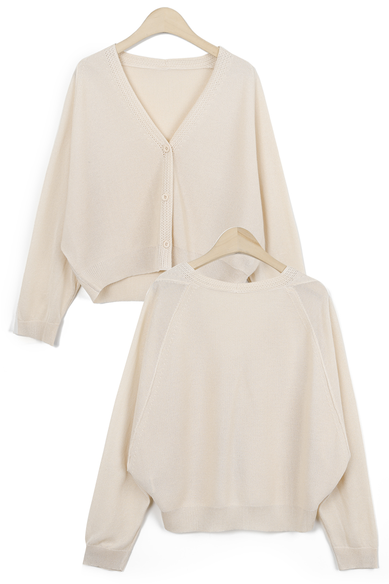 v라인 디자인이며 정면 3개의 단추로 버튼업 가능해요앞섶 밑단부터 목선 뒷면까지는 몸판 짜임과 조금 다른 직조인데펀칭 레이스 직조감이 느껴지는 패턴이라기본형에 여성미를 가볍게 머금은 듯한 느낌이었어요