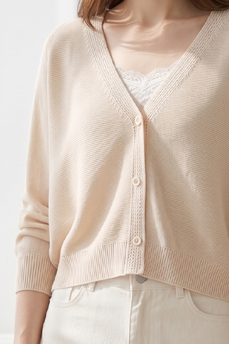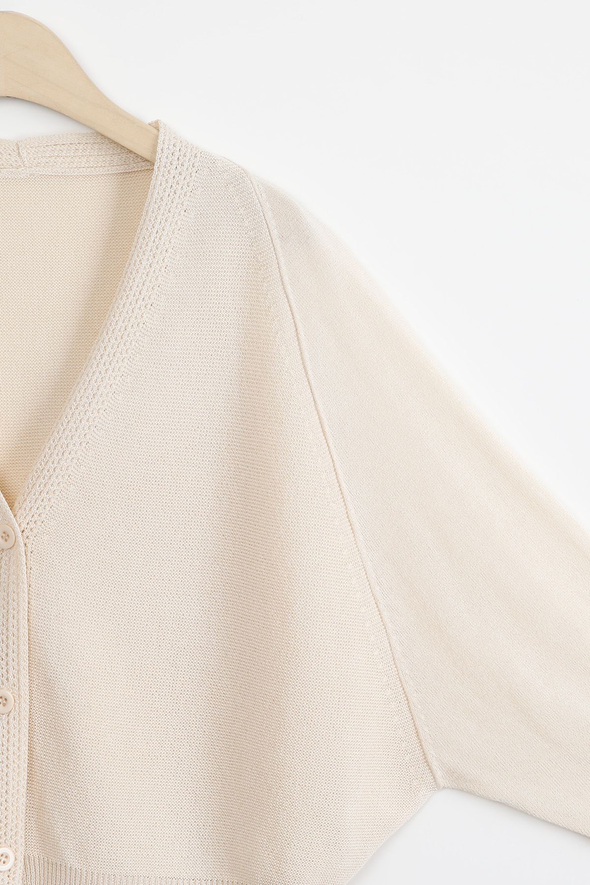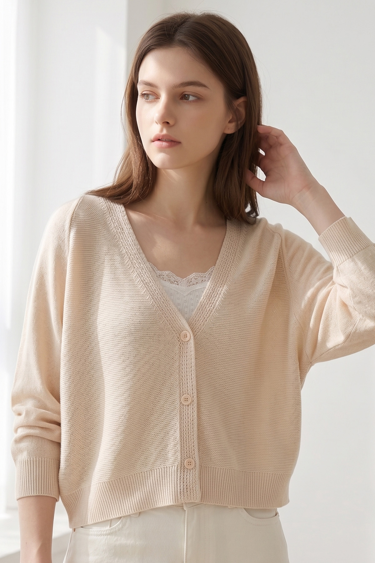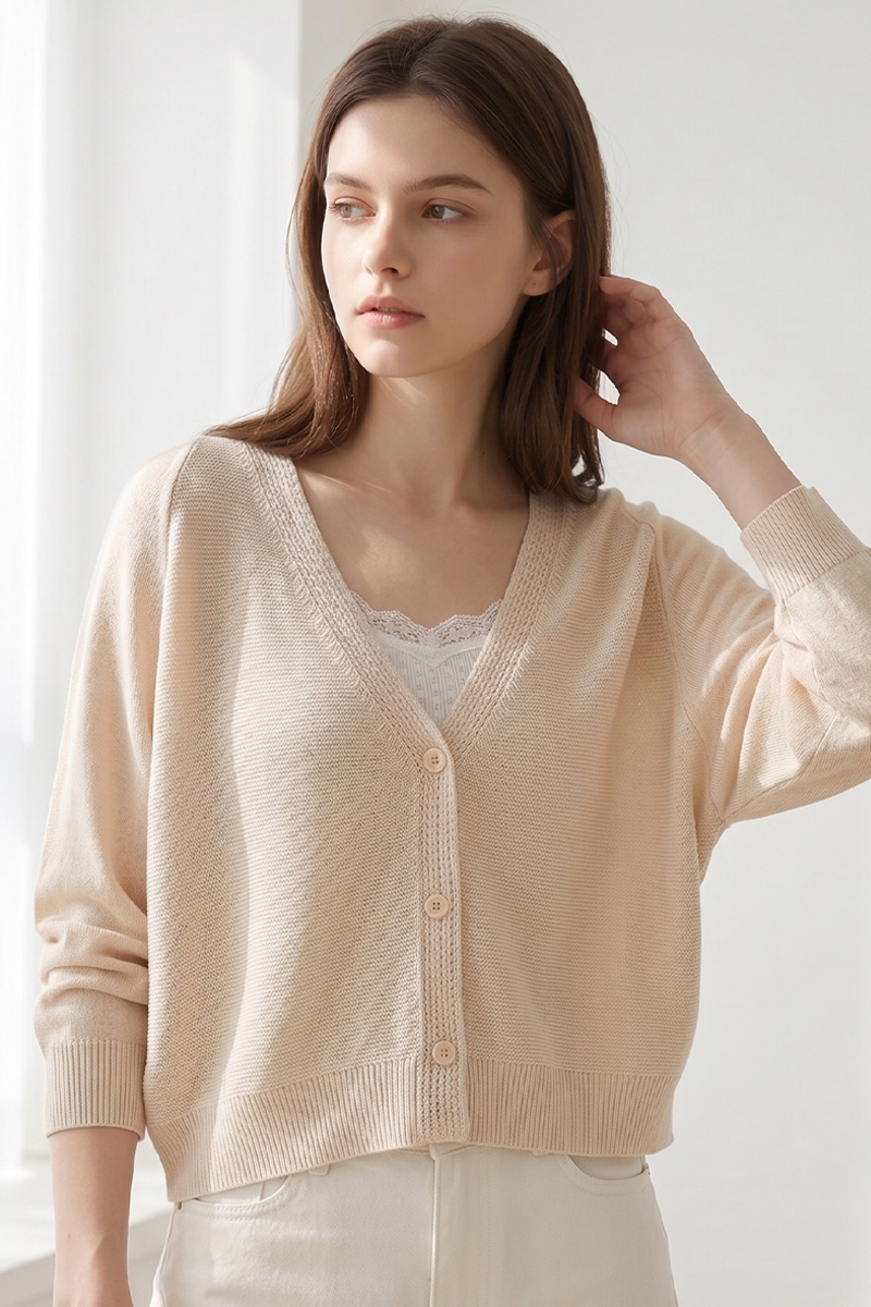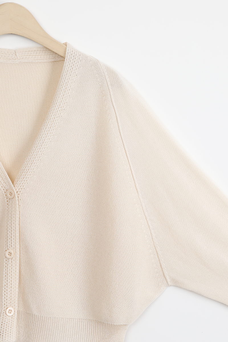 v라인 디자인이며 정면 3개의 단추로 버튼업 가능해요앞섶 밑단부터 목선 뒷면까지는 몸판 짜임과 조금 다른 직조인데펀칭 레이스 직조감이 느껴지는 패턴이라기본형에 여성미를 가볍게 머금은 듯한 느낌이었어요
