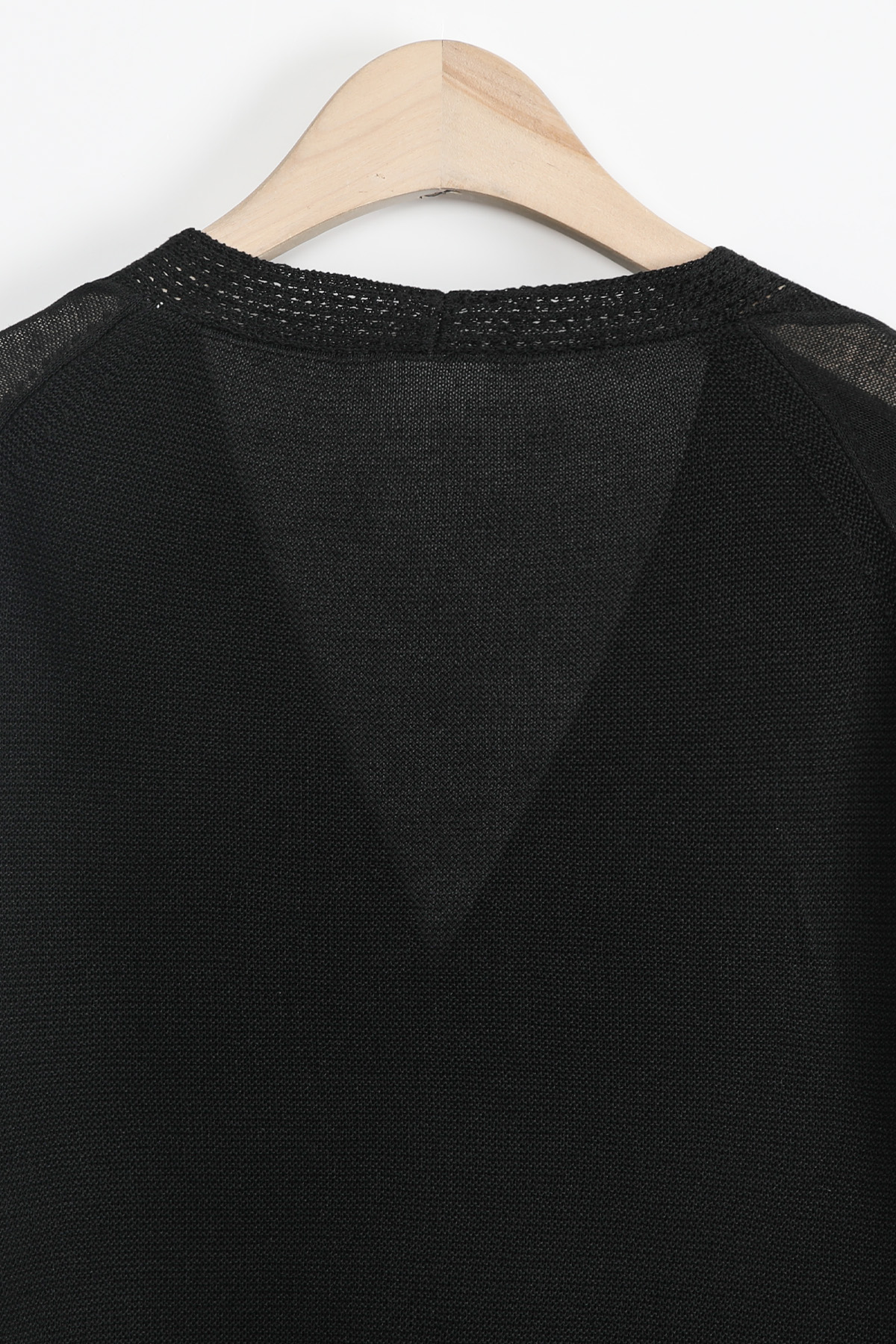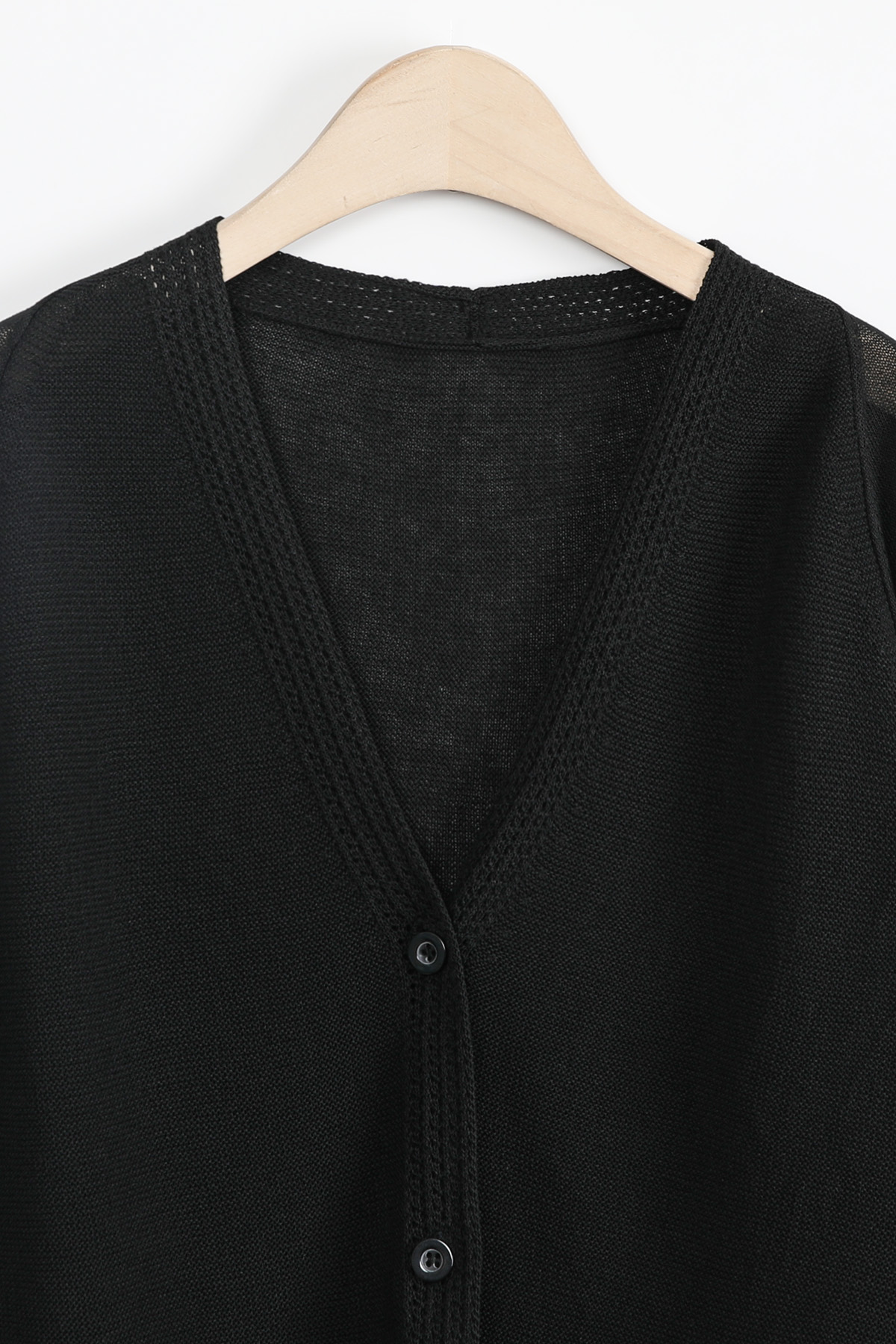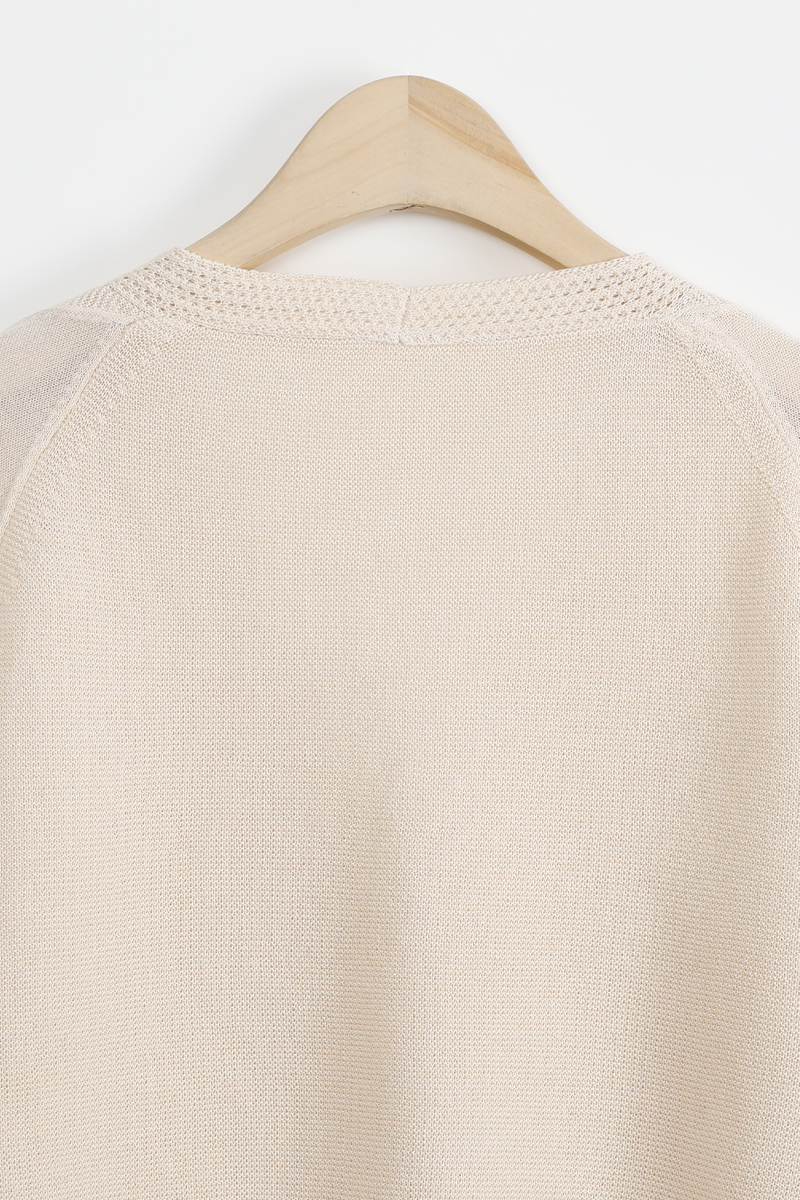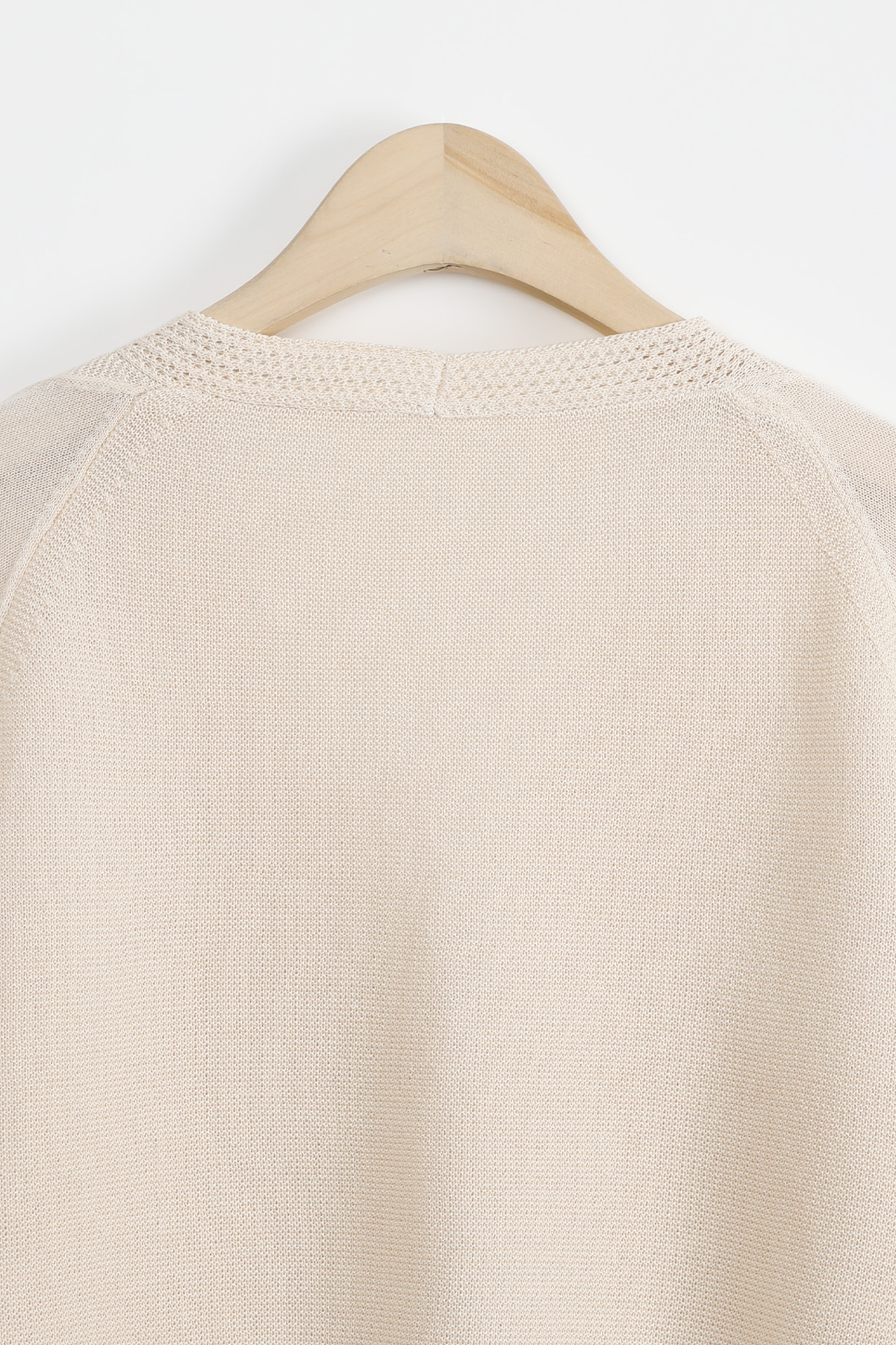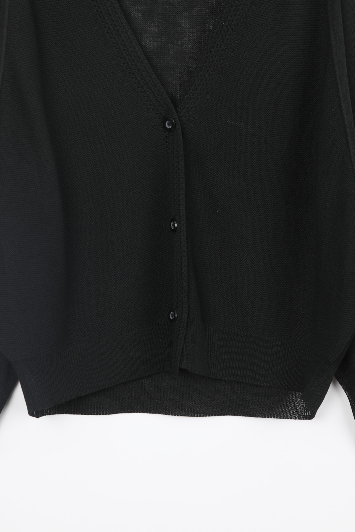 v라인 디자인이며 정면 3개의 단추로 버튼업 가능해요앞섶 밑단부터 목선 뒷면까지는 몸판 짜임과 조금 다른 직조인데펀칭 레이스 직조감이 느껴지는 패턴이라기본형에 여성미를 가볍게 머금은 듯한 느낌이었어요