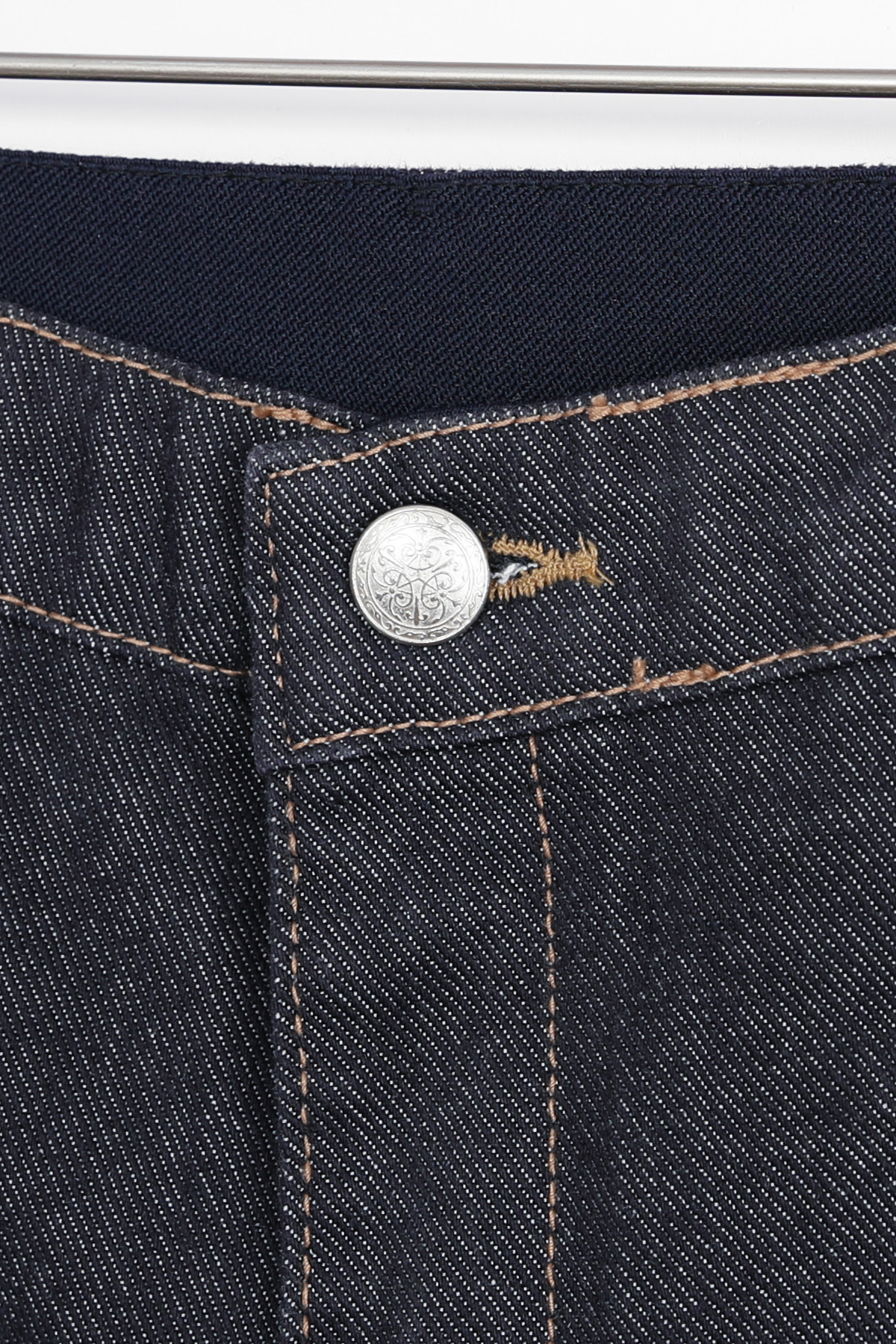 허릿단 정중앙 버튼-홀 마감 형태에