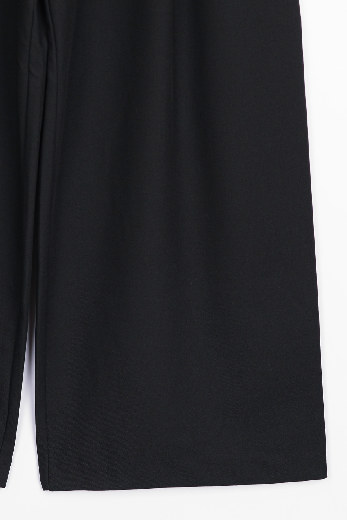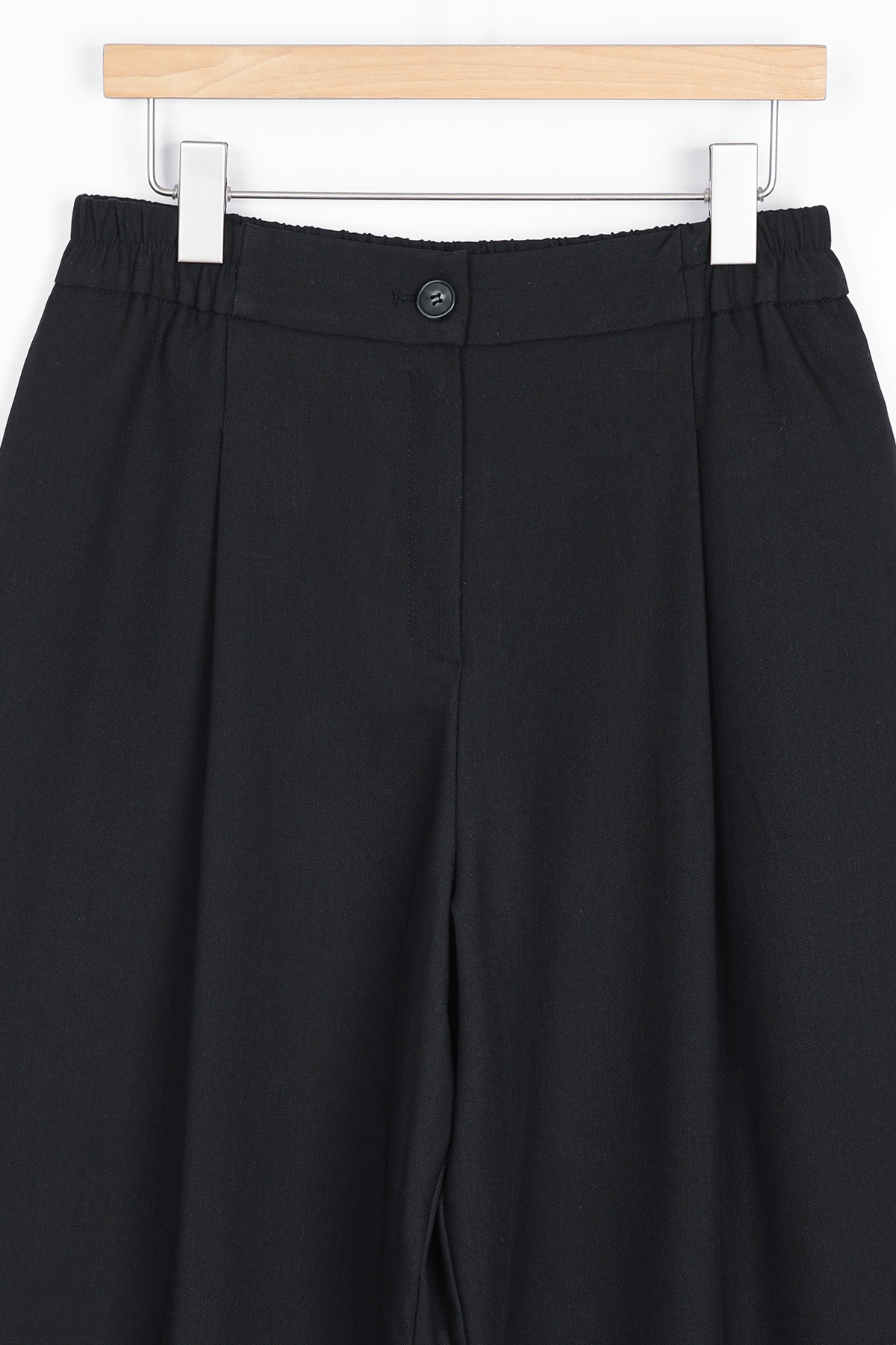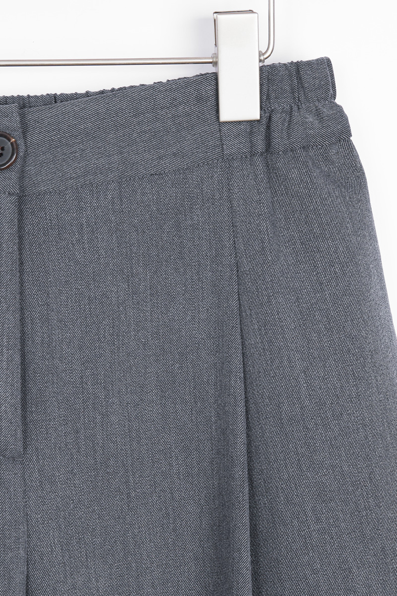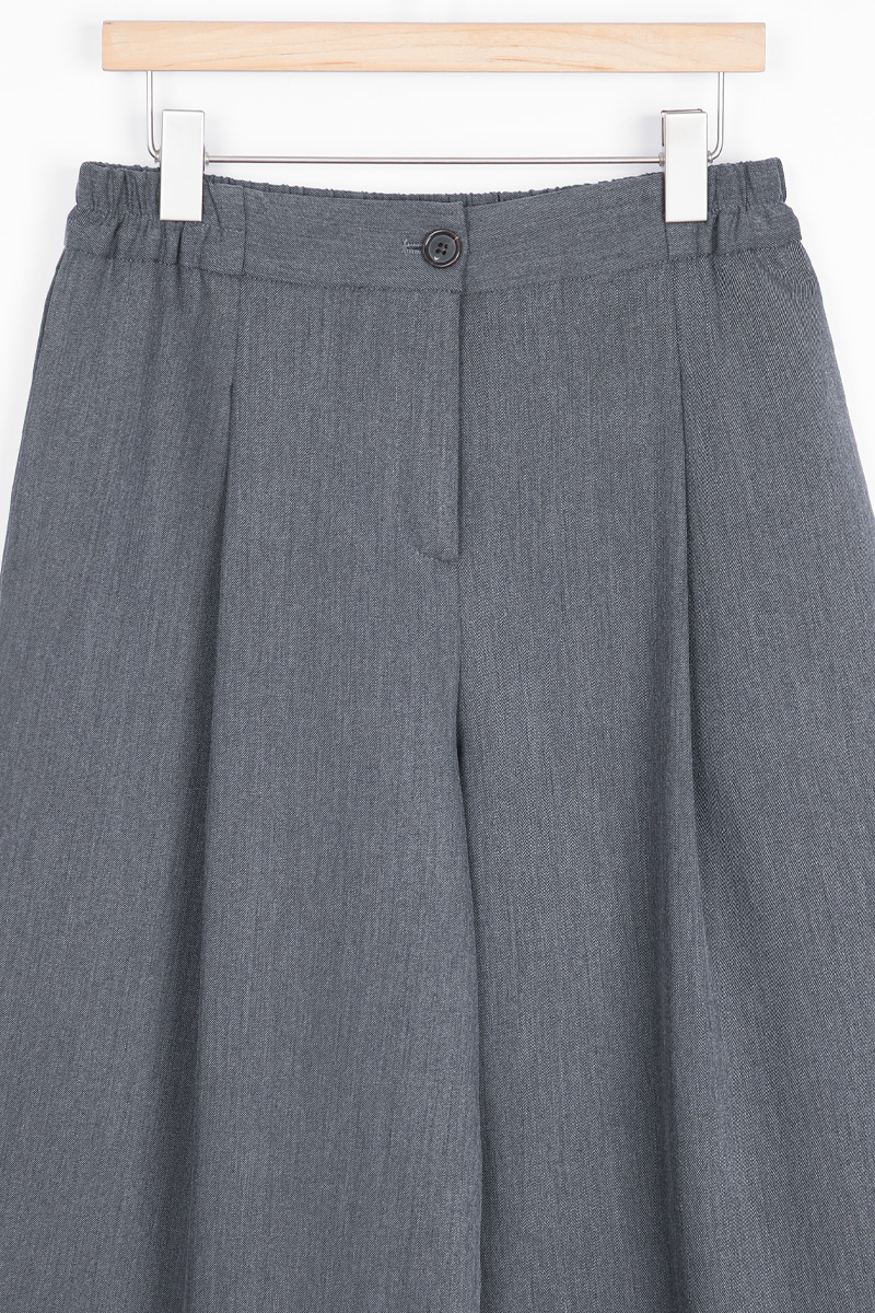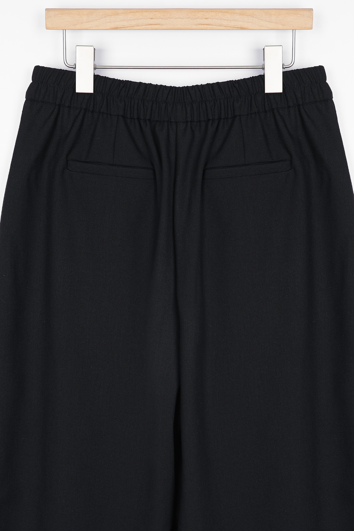 여유에서 완성되는 우아한 실루엣 골반선 앞쪽에 잡힌 핀턱 디테일이 이 팬츠의 시작점이자 포인트예요. 앞 허벅지에 자연스러운 여윳단을 만들어 하체 라인을 부드럽게 정돈해준답니다! 과하게 넓지 않으면서도 충분히 여유 있는 와이드 실루엣으로, 다리가 길어 보이는 균형을 완성하며, 은은하게 흐르는 와이드 라인이라 더욱 세련된 인상을 안겨주어요 :) 가볍지만 탄탄한 밀도감 겉감은 폴리에스터·폴리우레탄·모 혼방에 스판을 더해 제작했어요. 입기 좋은 두께감과 질감이랍니다. 구김이 쉽게 가지 않으면서, 텐션이 좋아 활동 시 편안함이 돋보이고요 고급스러운 분위기를 완성해 드려요. 높은 허벅지까지 덮는 안감은 레이온 혼방으로 제작해 착용 시 부드럽고 안정적인 착용감을 제공할 거예요! 안정감 있는 허리 설계 허릿단 앞면에는 플라스틱 버튼 1개와 약 12cm 콘솔 지퍼로 깔끔하게 마감했어요. 더욱 정돈된 인상을 준답니다. 허릿단 양 사이드부터 뒷면까지는 원단 사이에 밴드를 삽입해 봉제 마감했으며 허리의 2/3 이상이 밴딩 디자인인만큼 반 사이즈 정도의 자연스러운 여유를 만들어주기에 체형에 맞춰 안정적으로 안착하는 허리 라인 기분 좋게 만나보실 수 있을 거예요 :) 앞 라인을 정돈하는 설계 골반선 좌우에 각각 한 줄씩 잡힌 핀턱이 앞 허벅지 여유를 자연스럽게 형성해요. 실루엣이 여유롭지만 훨씬 매끈하게 정리된답니다. 핀턱은 단순 장식이 아니라 체형 보정 역할을 해주는 구조라는걸 잊지 마세요! 세련되게 흐르는 라인 165cm, 골반 넓은 66 기준 M 사이즈 착용