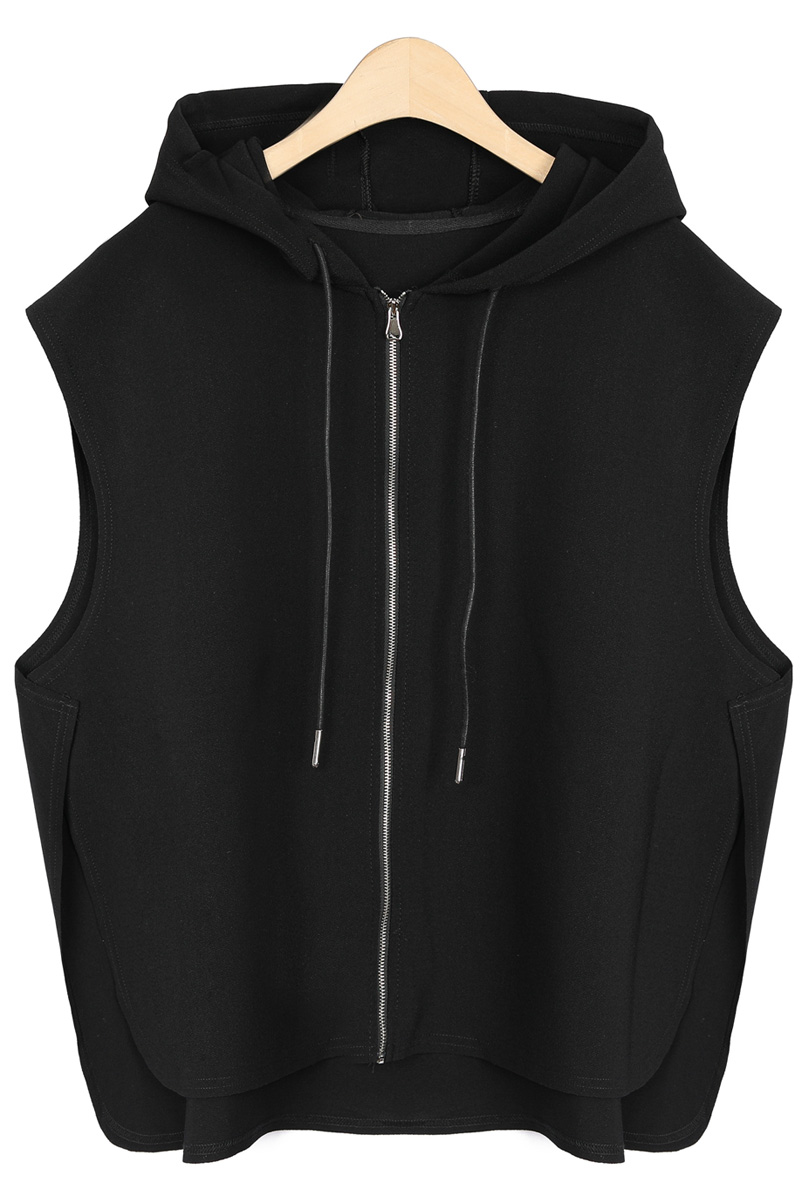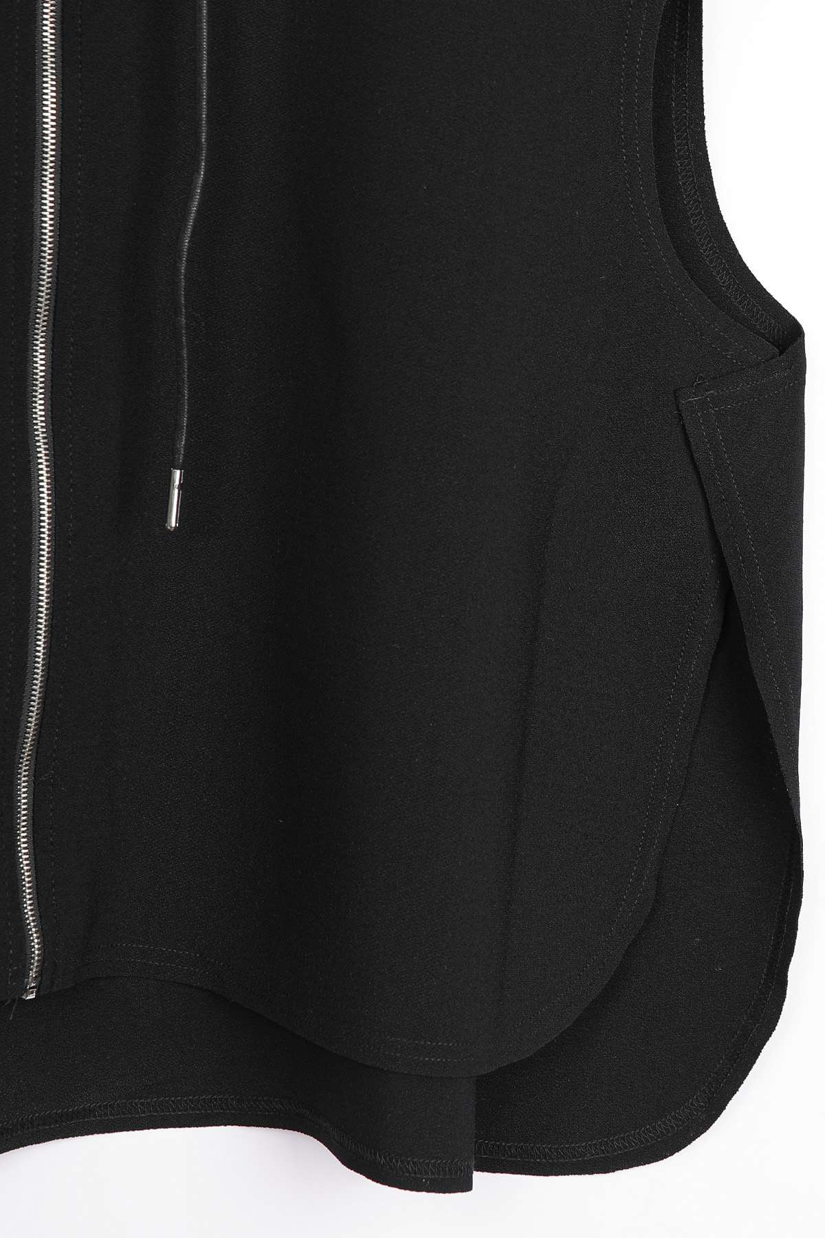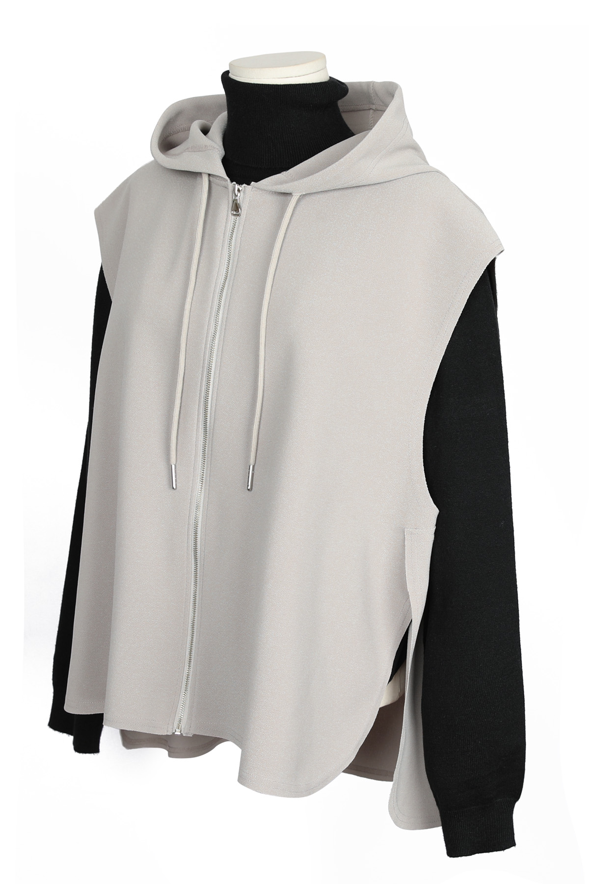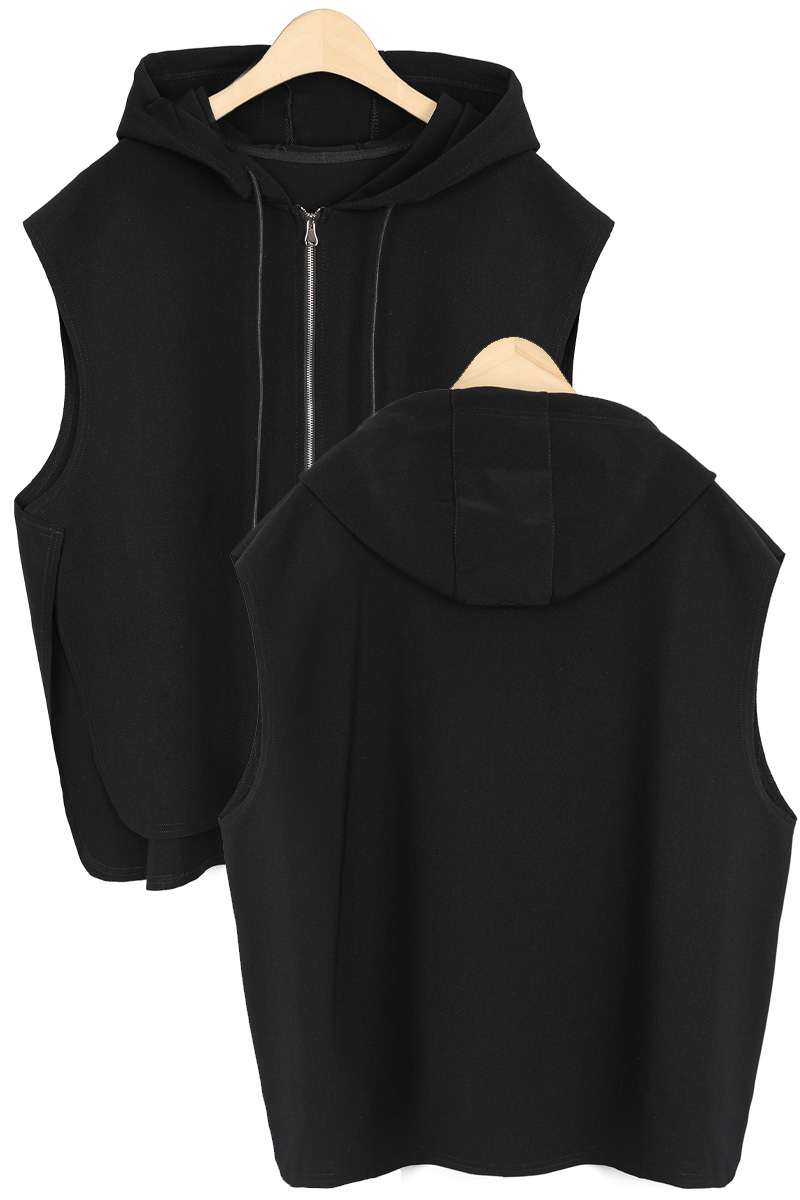 둥근 사이드 슬릿이 이 조끼의 핵심 구조.