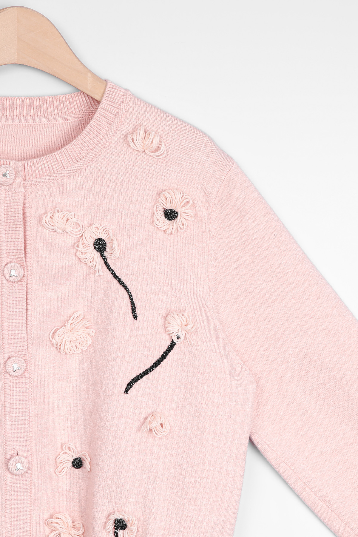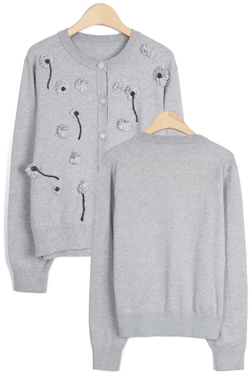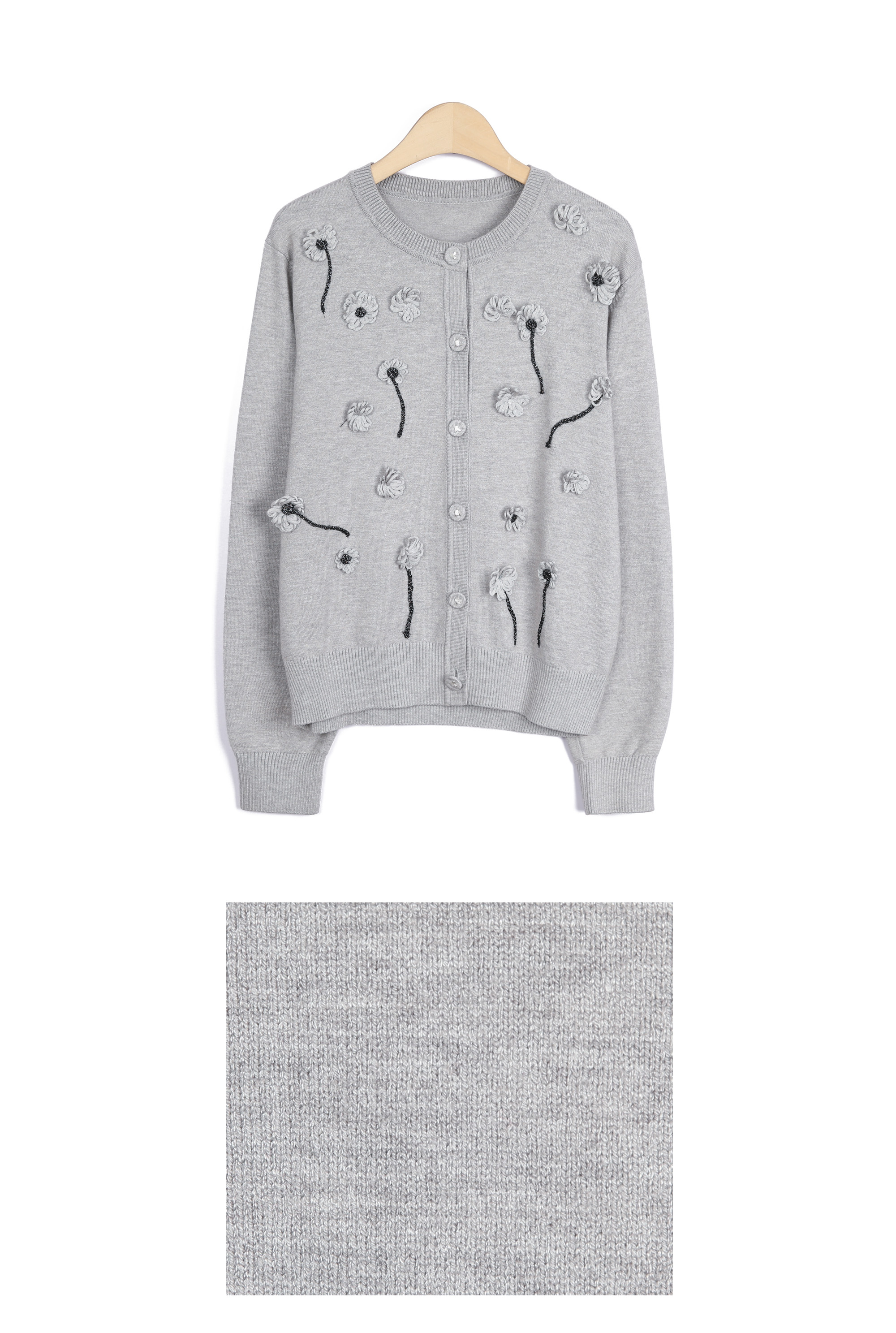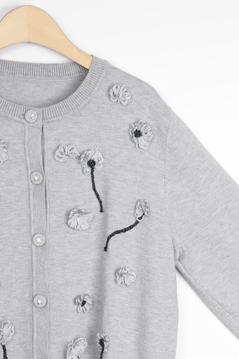 몸판 전면에 섬세하게 피어난 실꽃 모티브예요.