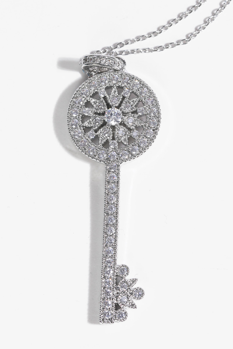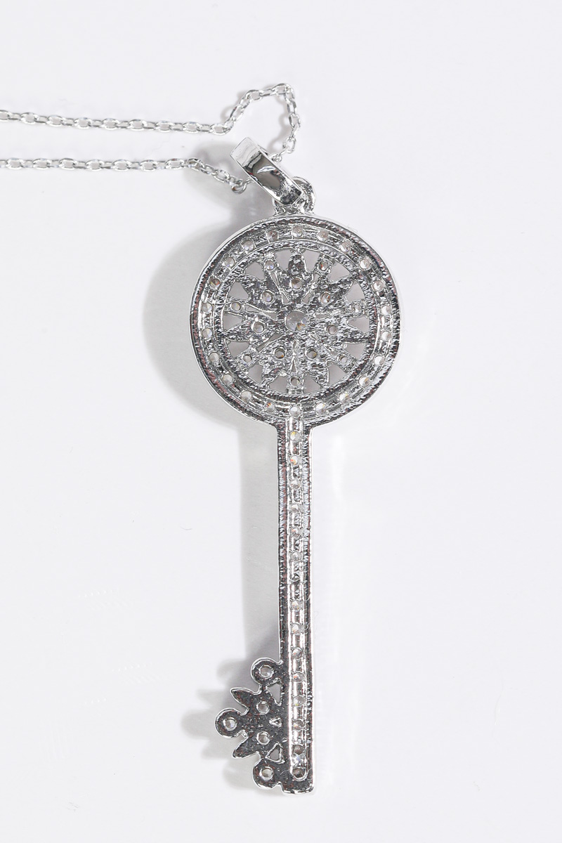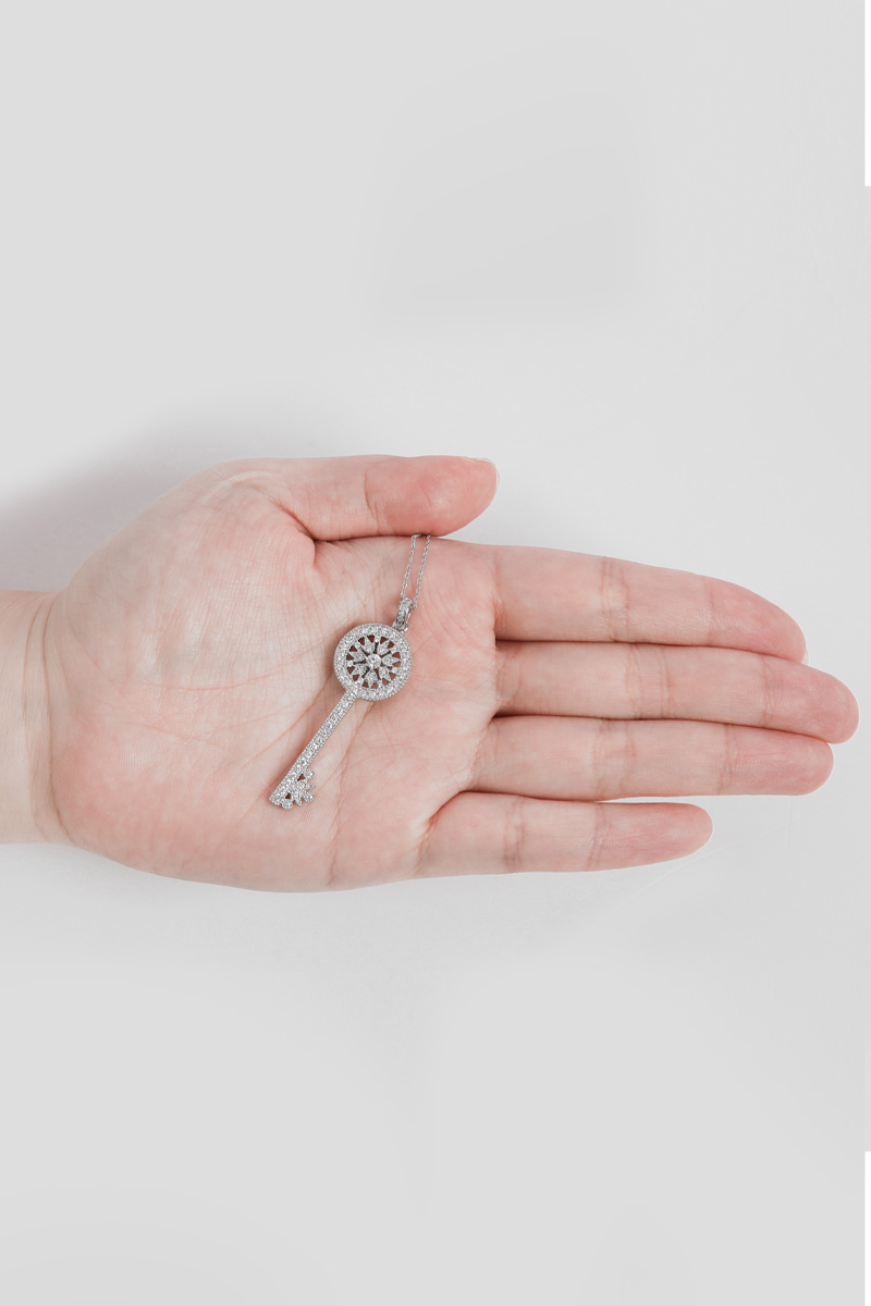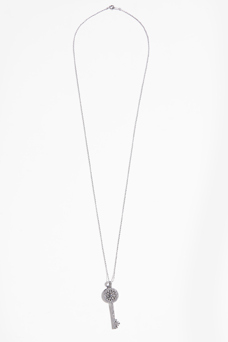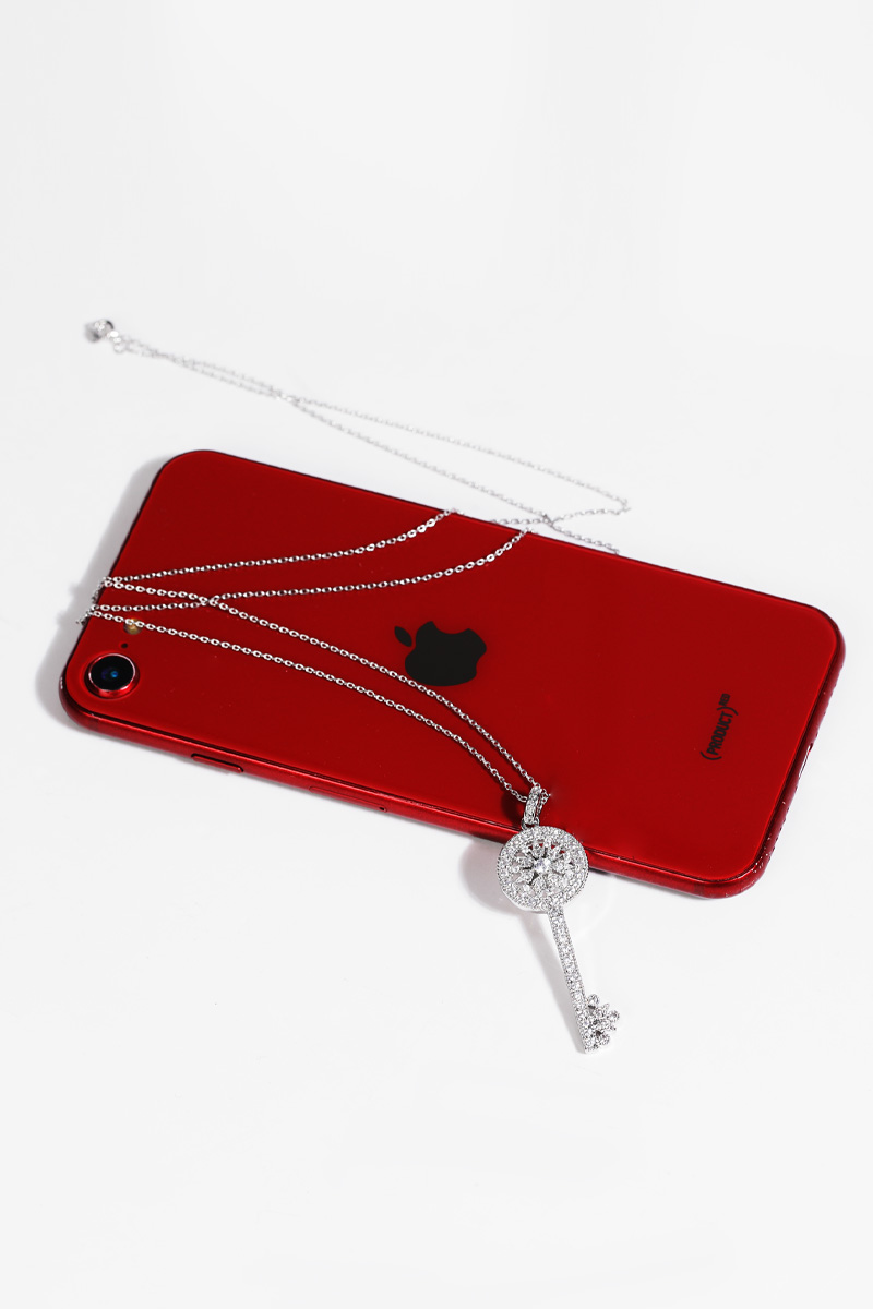 Opera Length, Effortless Presence 체인을 따로 여닫지 않아도 머리 위로 자연스럽게 착용 가능한 오페라 기장 고방 체인 네크리스. 가슴골 중간까지 여유 있게 떨어지며 상체 라인을 한층 길고 우아하게 정리해줘요. 그러나 격식은 잃지 않는 선택이랍니다! Inspired Classic, Reinterpreted Elegance 시그니처 KEY 컬렉션에서 영감을 받은 원형 키 모티프를 재해석했어요. 단정하면서도 기품 있는 인상을 남긴답니다. 상징을 품은 오브제로서의 존재감을 분명히 느끼실 수 있을 거예요 :) Pavé Brilliance, Noble Detail 헤드의 가장자리 라인은 물론, 태양을 연상시키는 내부 원형 패턴과 중앙 포인트까지 지르콘 큐빅을 촘촘히 세팅했어요. 홈 들어가는 다리 마감 안쪽까지 세심하게 파베 세팅을 더해 어느 각도에서 보아도 빈틈 없이 반짝이는 디자인. 깊이 있게 반사되어, 귀족적인 분위기를 은은하게 완성해줄 거예요! lattering Vertical Line 세로로 떨어지는 키 실루엣은 목선을 더욱 길고 가늘어 보이게 정돈해줘요. 별다른 스타일링 없이도 중심을 잡아주는 포인트가 되어줄 거랍니다. 중요한 약속 자리에서도 과하지 않게 존재감을 드러내는 아이템. Convertible Styling 펜던트 연결 고리의 폭을 넉넉하게 제작해 체인과 간편하게 분리가 가능해요. 개인 소장하고 계신 화이트골드톤 체인과 연결해 길이를 조절해주실 수 있답니다. 분위기를 새로이 연출할 수 있는 변화무쌍한 매력을 지니고 있어요 :) Refined Scale & Proportion 키 길이는 성인 여성 손가락 두 마디 정도의 크기로, 부담 없이 고급스러운 존재감을 전해줘요. 실제 사이즈를 직관적으로 가늠하실 수 있답니다. 포멀 룩에는 확실한 중심이 되어주는 균형감 있는 스케일이에요.