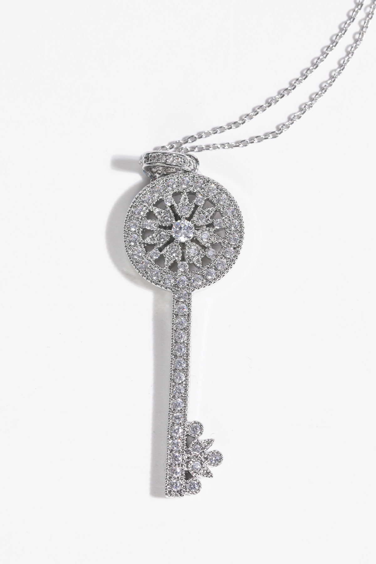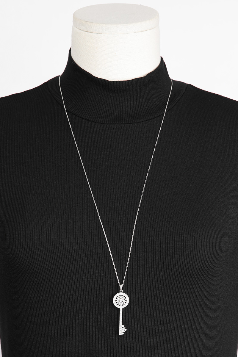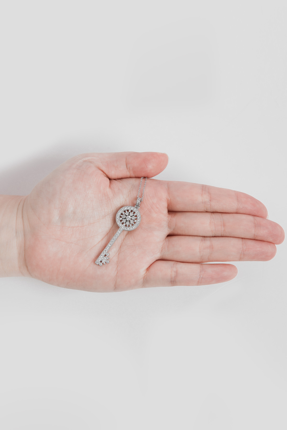 Opera Length, Effortless Presence 체인을 따로 여닫지 않아도 머리 위로 자연스럽게 착용 가능한 오페라 기장 고방 체인 네크리스. 가슴골 중간까지 여유 있게 떨어지며 상체 라인을 한층 길고 우아하게 정리해줘요. 그러나 격식은 잃지 않는 선택이랍니다! Inspired Classic, Reinterpreted Elegance 시그니처 KEY 컬렉션에서 영감을 받은 원형 키 모티프를 재해석했어요. 단정하면서도 기품 있는 인상을 남긴답니다. 상징을 품은 오브제로서의 존재감을 분명히 느끼실 수 있을 거예요 :) Pavé Brilliance, Noble Detail 헤드의 가장자리 라인은 물론, 태양을 연상시키는 내부 원형 패턴과 중앙 포인트까지 지르콘 큐빅을 촘촘히 세팅했어요. 홈 들어가는 다리 마감 안쪽까지 세심하게 파베 세팅을 더해 어느 각도에서 보아도 빈틈 없이 반짝이는 디자인. 깊이 있게 반사되어, 귀족적인 분위기를 은은하게 완성해줄 거예요! lattering Vertical Line 세로로 떨어지는 키 실루엣은 목선을 더욱 길고 가늘어 보이게 정돈해줘요. 별다른 스타일링 없이도 중심을 잡아주는 포인트가 되어줄 거랍니다. 중요한 약속 자리에서도 과하지 않게 존재감을 드러내는 아이템. Convertible Styling 펜던트 연결 고리의 폭을 넉넉하게 제작해 체인과 간편하게 분리가 가능해요. 개인 소장하고 계신 화이트골드톤 체인과 연결해 길이를 조절해주실 수 있답니다. 분위기를 새로이 연출할 수 있는 변화무쌍한 매력을 지니고 있어요 :) Refined Scale & Proportion 키 길이는 성인 여성 손가락 두 마디 정도의 크기로, 부담 없이 고급스러운 존재감을 전해줘요. 실제 사이즈를 직관적으로 가늠하실 수 있답니다. 포멀 룩에는 확실한 중심이 되어주는 균형감 있는 스케일이에요.