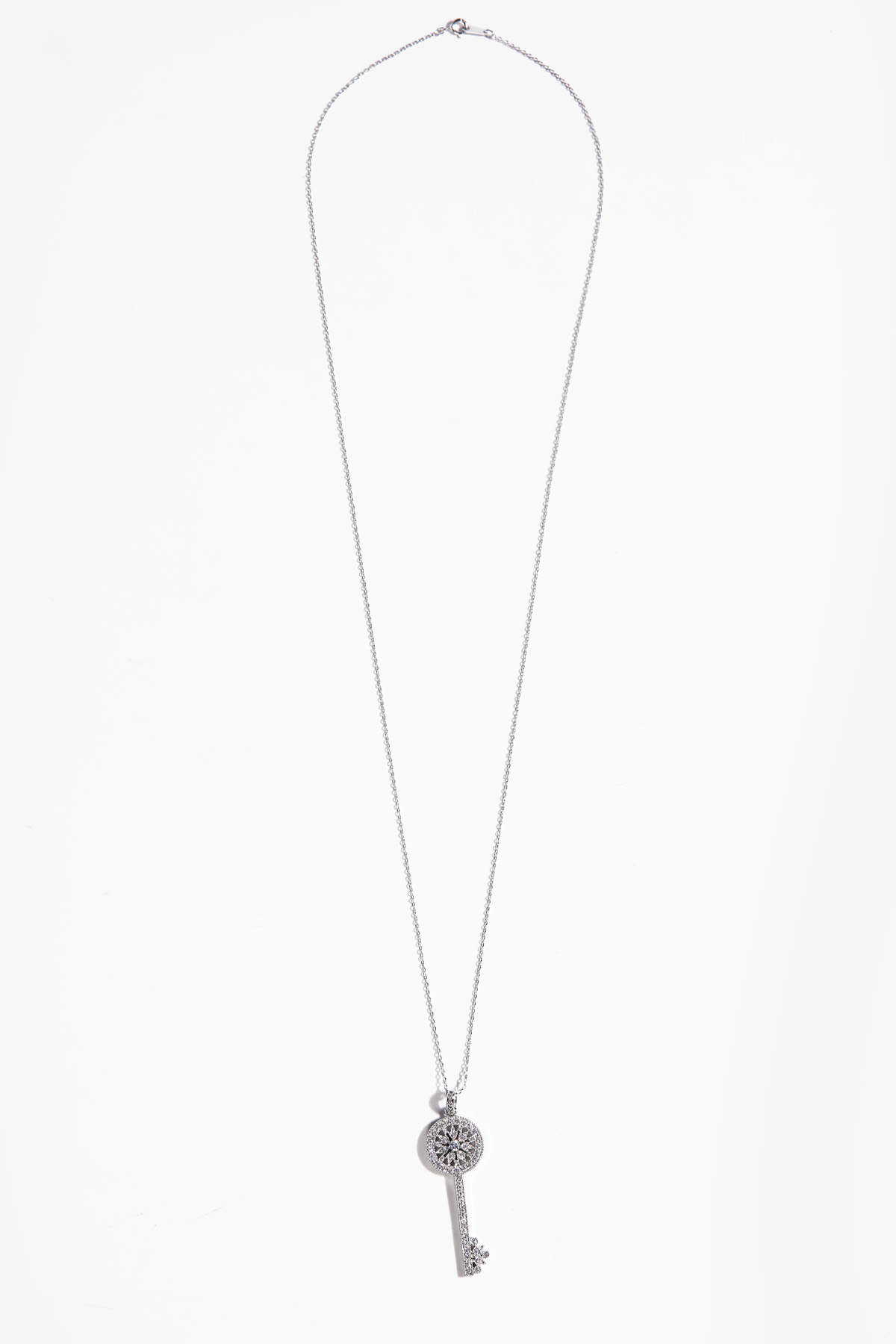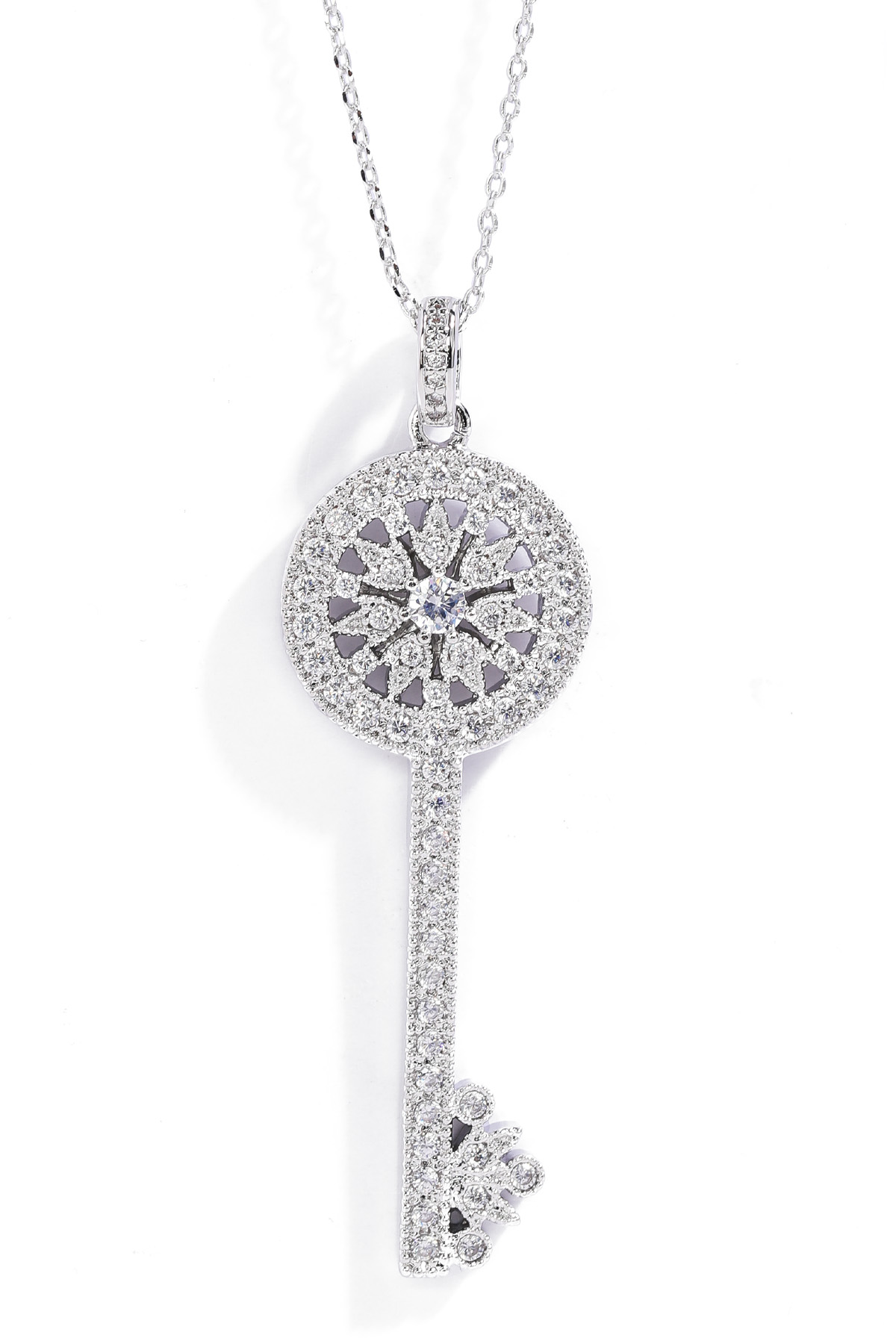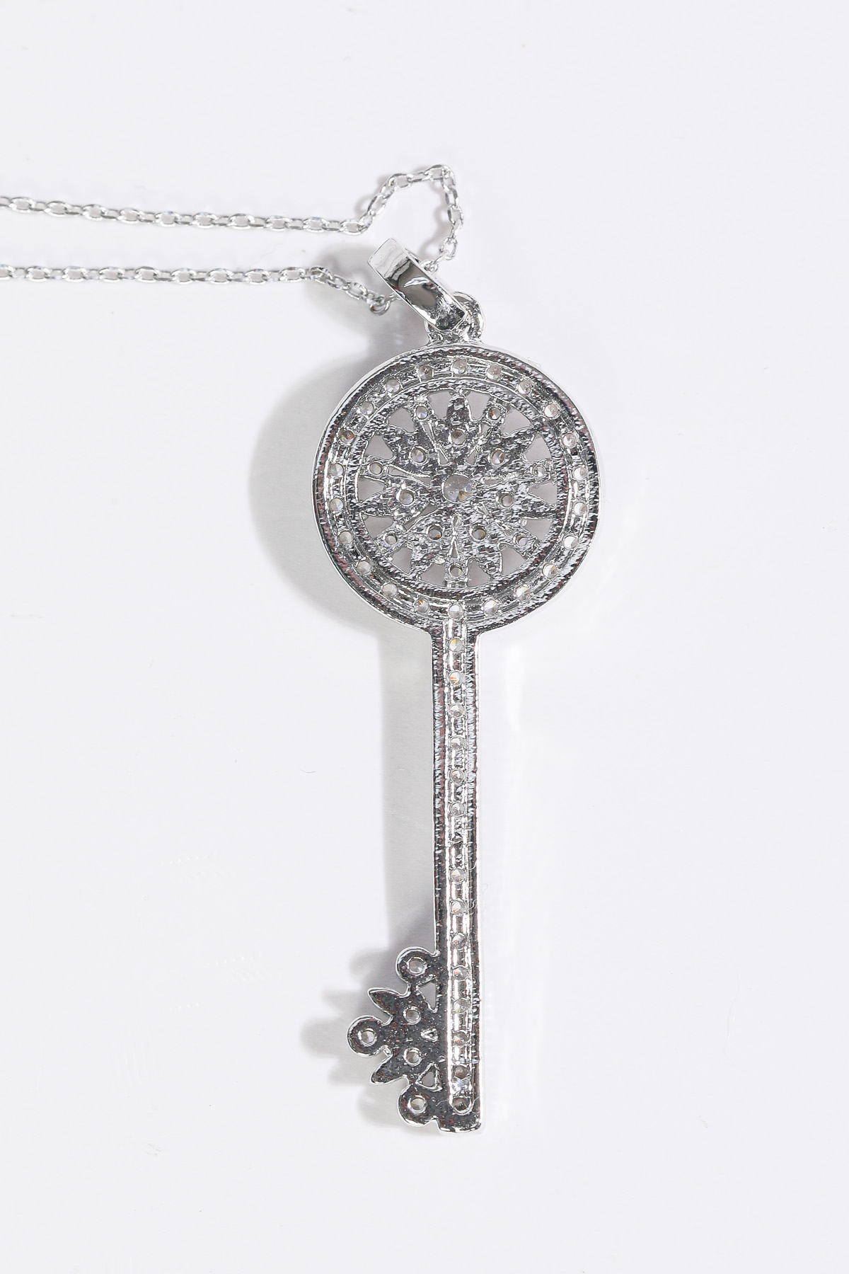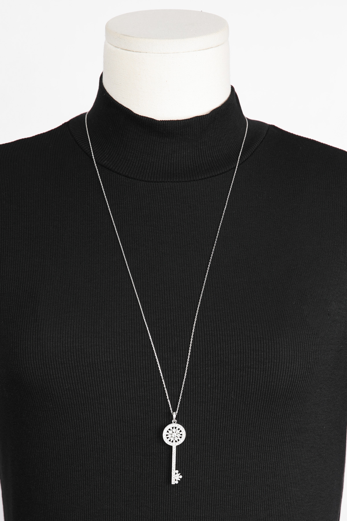 Opera Length, Effortless Presence 체인을 따로 여닫지 않아도 머리 위로 자연스럽게 착용 가능한 오페라 기장 고방 체인 네크리스. 가슴골 중간까지 여유 있게 떨어지며 상체 라인을 한층 길고 우아하게 정리해줘요. 그러나 격식은 잃지 않는 선택이랍니다! Inspired Classic, Reinterpreted Elegance 시그니처 KEY 컬렉션에서 영감을 받은 원형 키 모티프를 재해석했어요. 단정하면서도 기품 있는 인상을 남긴답니다. 상징을 품은 오브제로서의 존재감을 분명히 느끼실 수 있을 거예요 :) Pavé Brilliance, Noble Detail 헤드의 가장자리 라인은 물론, 태양을 연상시키는 내부 원형 패턴과 중앙 포인트까지 지르콘 큐빅을 촘촘히 세팅했어요. 홈 들어가는 다리 마감 안쪽까지 세심하게 파베 세팅을 더해 어느 각도에서 보아도 빈틈 없이 반짝이는 디자인. 깊이 있게 반사되어, 귀족적인 분위기를 은은하게 완성해줄 거예요! lattering Vertical Line 세로로 떨어지는 키 실루엣은 목선을 더욱 길고 가늘어 보이게 정돈해줘요. 별다른 스타일링 없이도 중심을 잡아주는 포인트가 되어줄 거랍니다. 중요한 약속 자리에서도 과하지 않게 존재감을 드러내는 아이템. Convertible Styling 펜던트 연결 고리의 폭을 넉넉하게 제작해 체인과 간편하게 분리가 가능해요. 개인 소장하고 계신 화이트골드톤 체인과 연결해 길이를 조절해주실 수 있답니다. 분위기를 새로이 연출할 수 있는 변화무쌍한 매력을 지니고 있어요 :) Refined Scale & Proportion 키 길이는 성인 여성 손가락 두 마디 정도의 크기로, 부담 없이 고급스러운 존재감을 전해줘요. 실제 사이즈를 직관적으로 가늠하실 수 있답니다. 포멀 룩에는 확실한 중심이 되어주는 균형감 있는 스케일이에요.