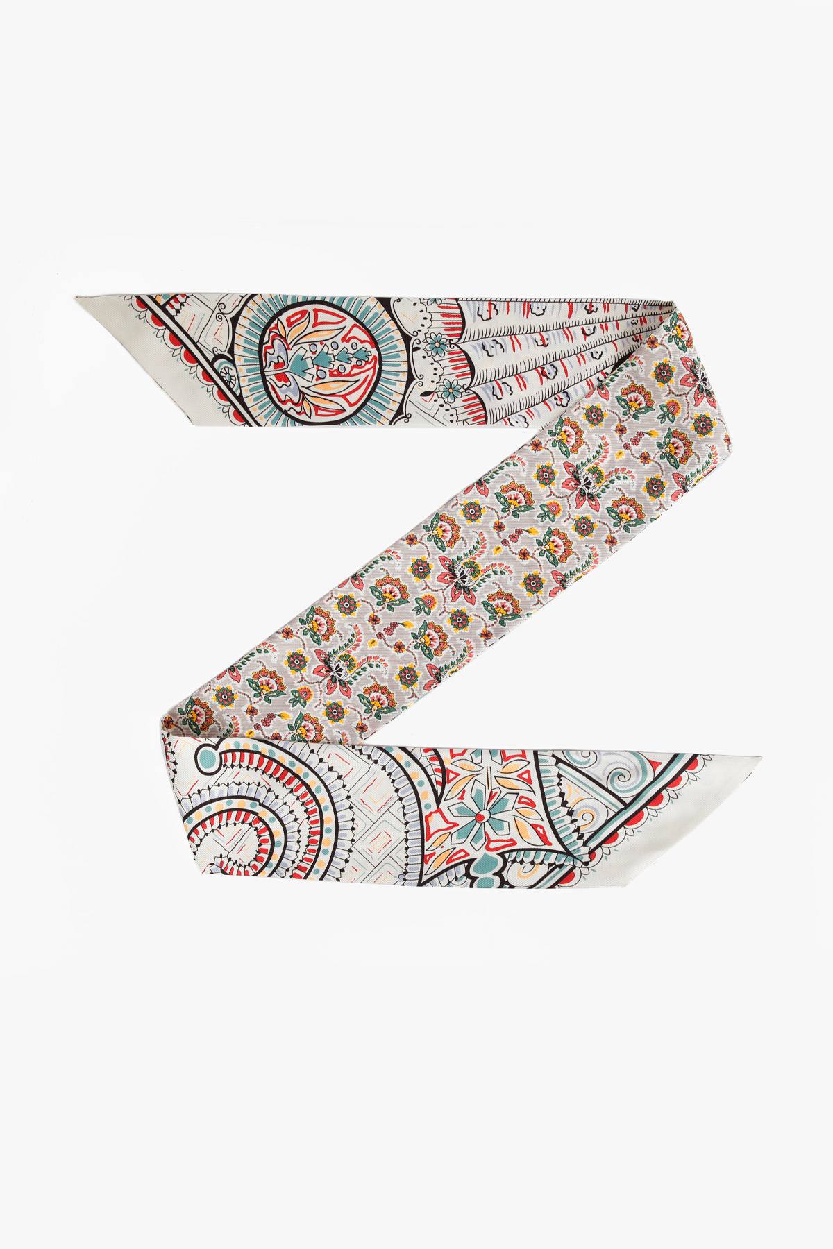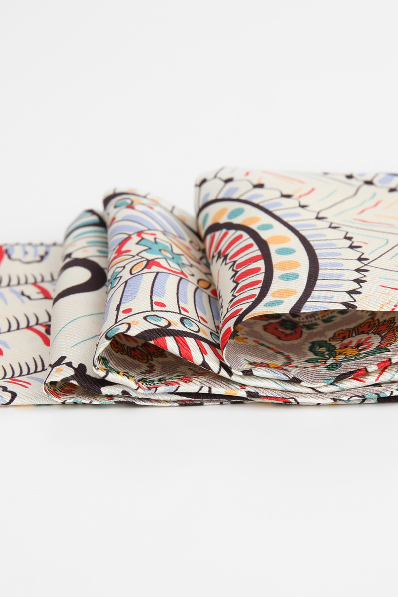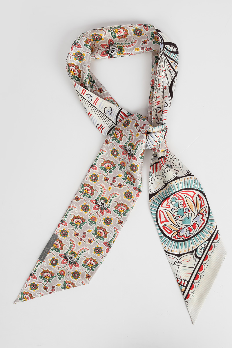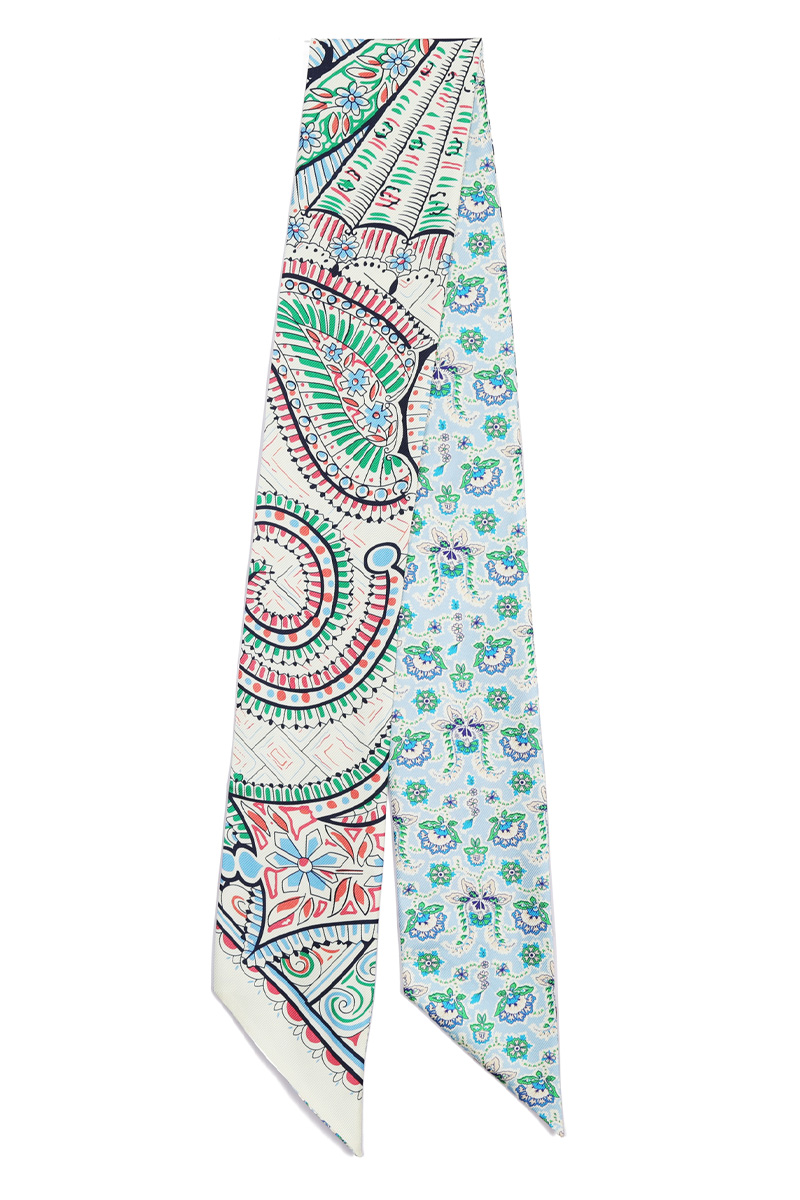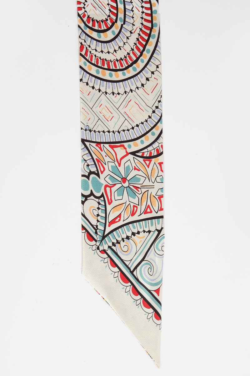전체 룩의 완성도를 자연스럽게 높여주어요. 꾸미지 않은 듯 하지만 기본 기장이라고 해서 스타일도 기본일까 걱정하지 마세요. 헤리티지 페이즐리 패턴의 마법은 가볍게 더해주기만 해도 금방 변신시켜 드릴 테니까요 :) 아이보리 베이스 위에 레드, 블루, 민트 컬러가 어우러진 페이즐리와 플라워 패턴이라 밝은 톤의 상의와 특히 잘 어울리는 색감. 가볍게 리본 매듭으로 묶어주면 얼굴 주변이 한층 화사해 보이고, 평소 들던 가방도 한층 세련된 분위기로 연출할 수 있어요. 과하게 화려한 패턴이 아니라 차분한 아이보리 바탕에 컬러 포인트만 은은하게 들어간 디자인이라 전체 스타일을 깔끔하게 정리해드려요!단정한 룩에 품격을 더하는 한 장의 스카프