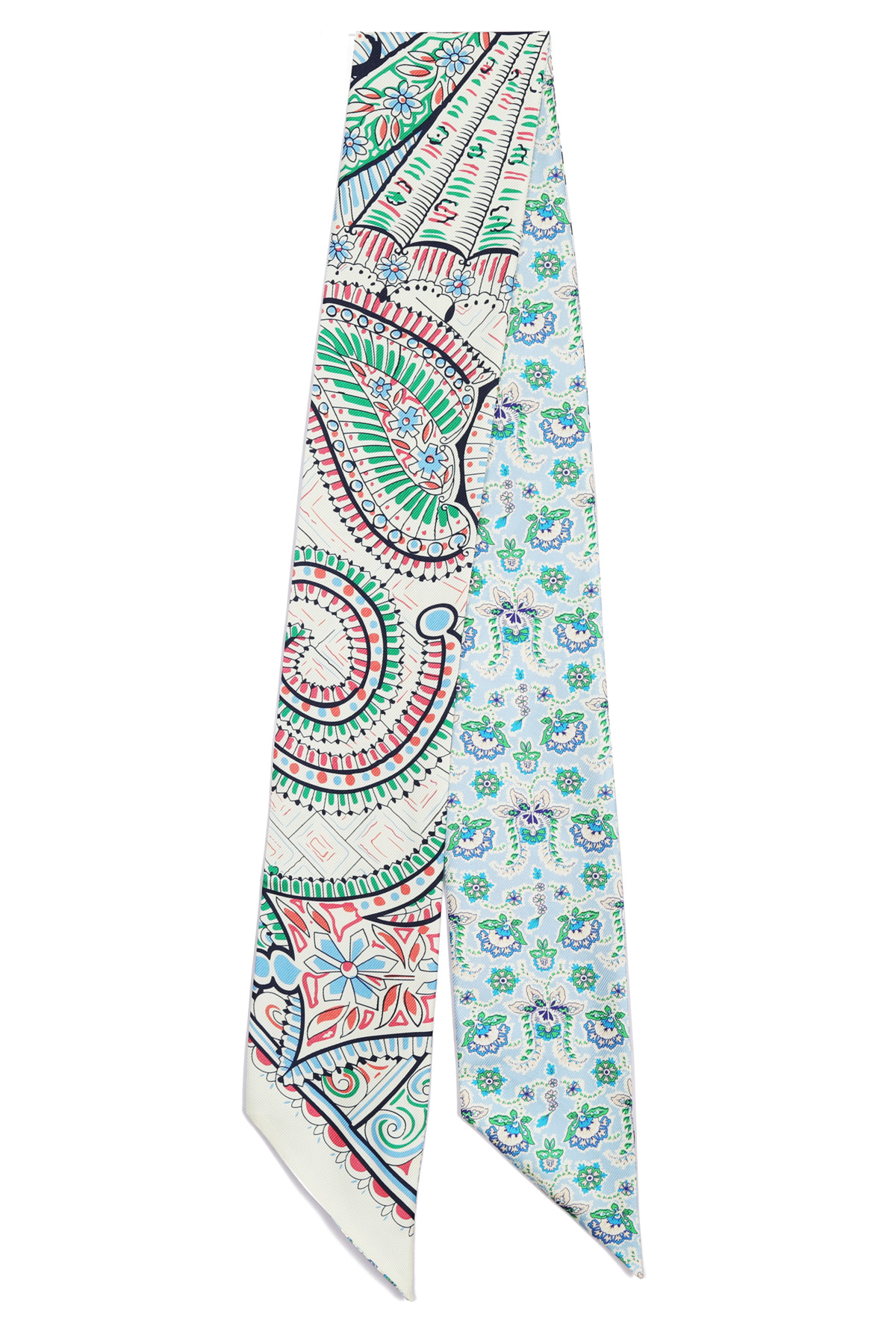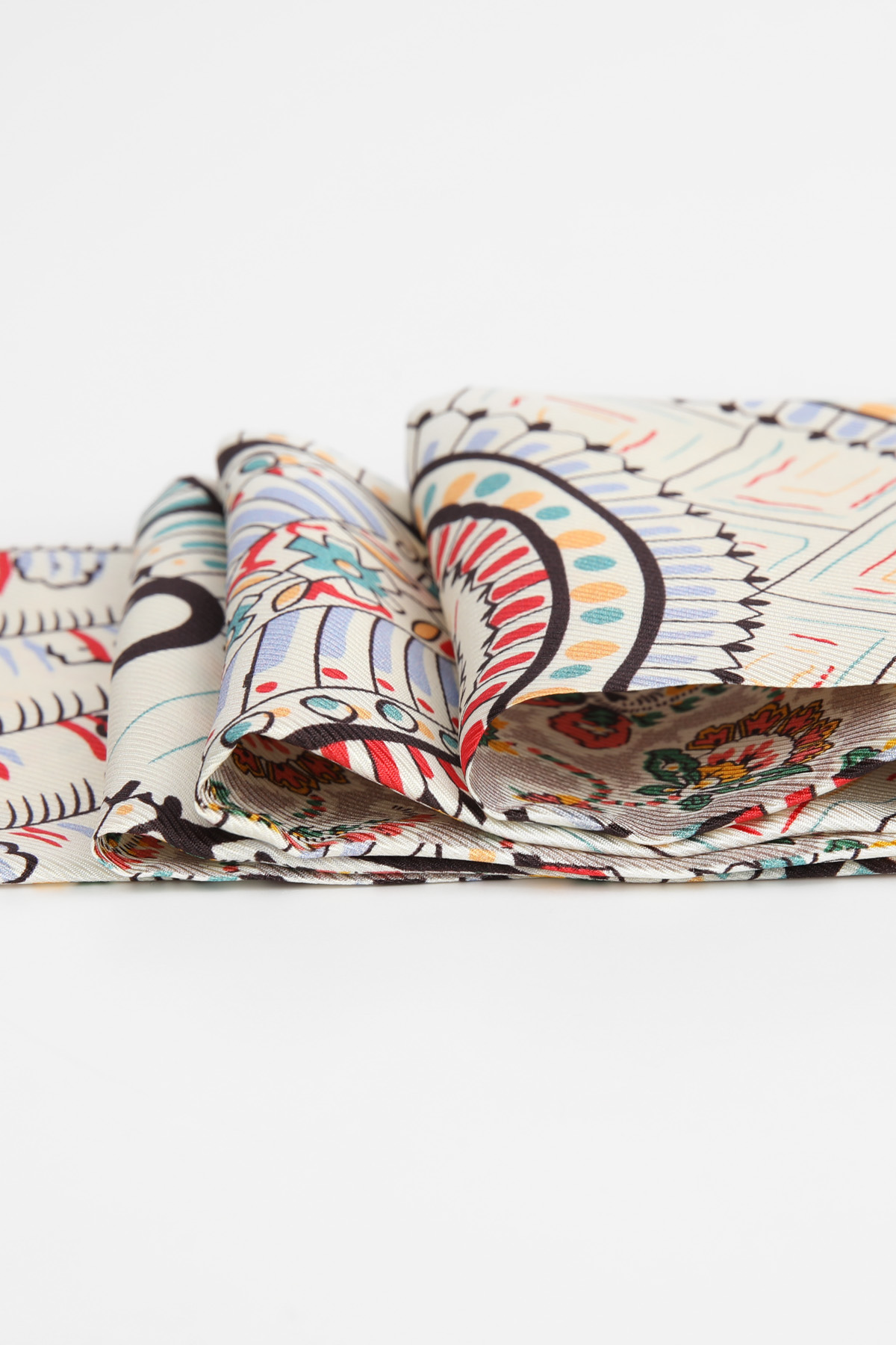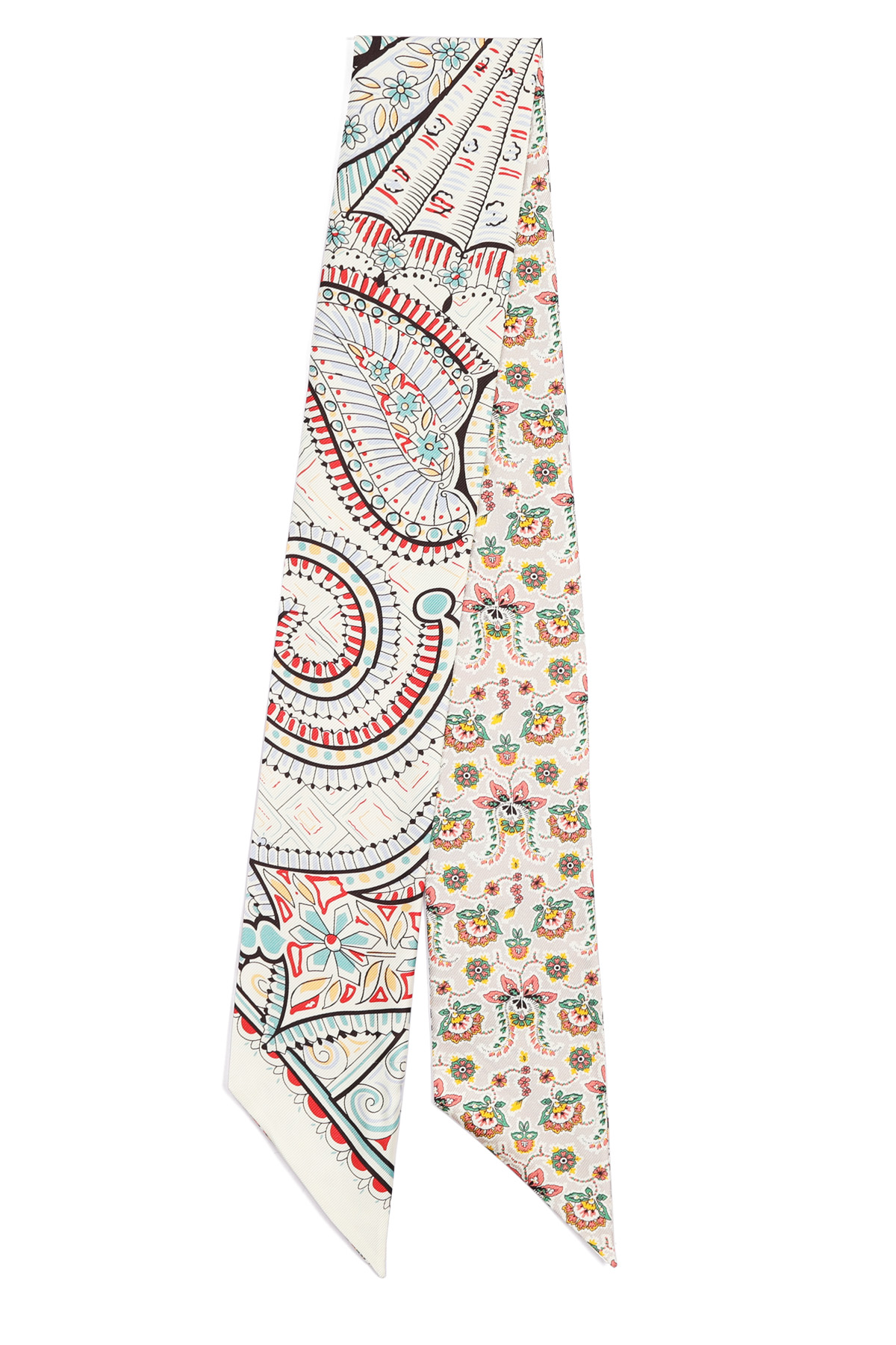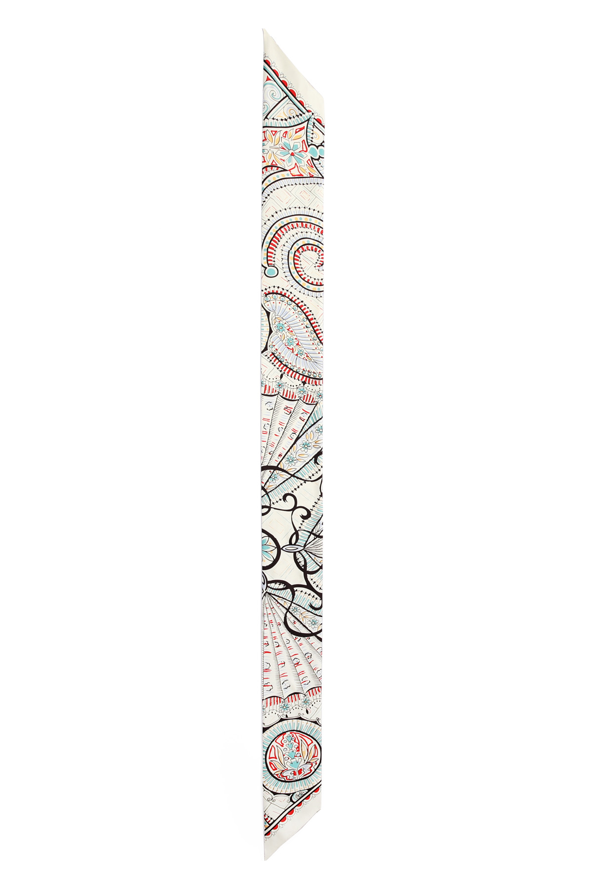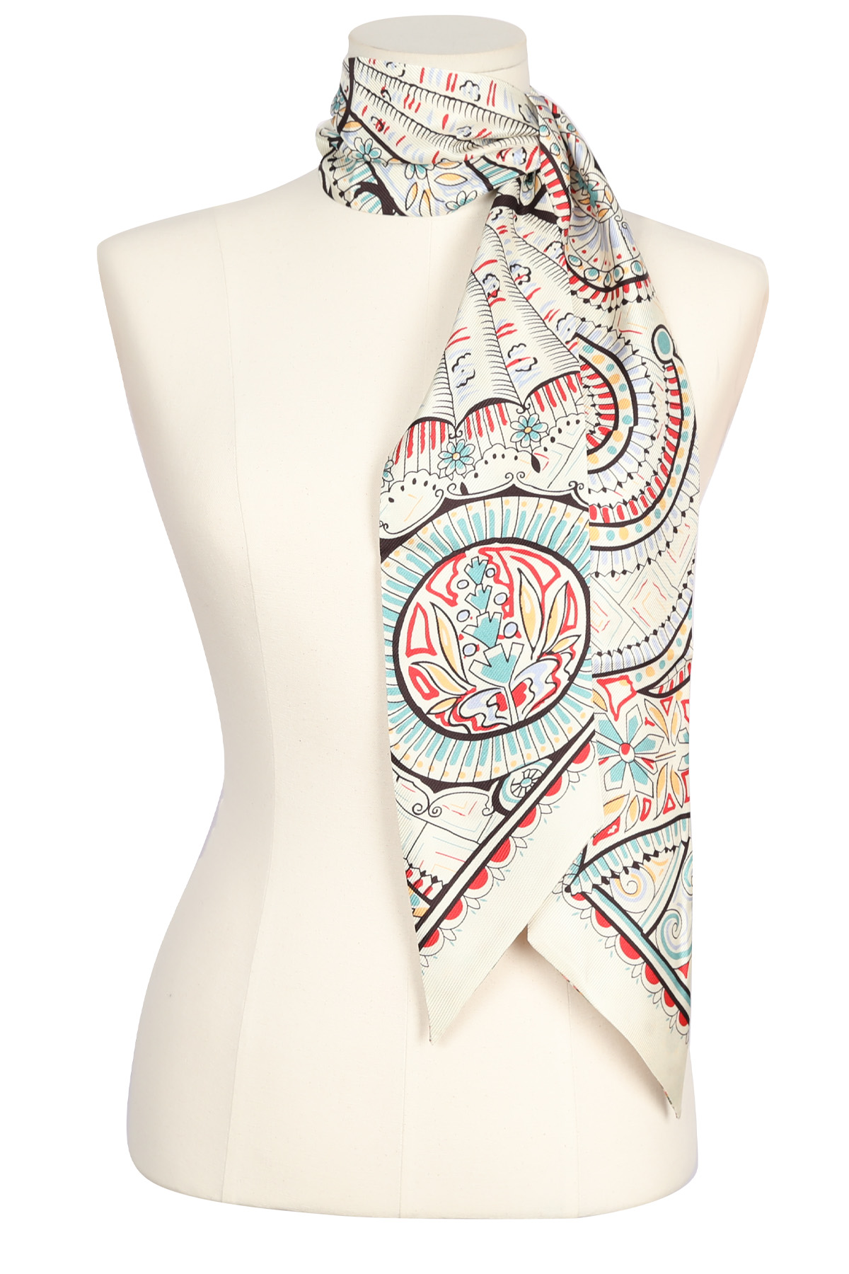 전체 룩의 완성도를 자연스럽게 높여주어요. 꾸미지 않은 듯 하지만 기본 기장이라고 해서 스타일도 기본일까 걱정하지 마세요. 헤리티지 페이즐리 패턴의 마법은 가볍게 더해주기만 해도 금방 변신시켜 드릴 테니까요 :) 아이보리 베이스 위에 레드, 블루, 민트 컬러가 어우러진 페이즐리와 플라워 패턴이라 밝은 톤의 상의와 특히 잘 어울리는 색감. 가볍게 리본 매듭으로 묶어주면 얼굴 주변이 한층 화사해 보이고, 평소 들던 가방도 한층 세련된 분위기로 연출할 수 있어요. 과하게 화려한 패턴이 아니라 차분한 아이보리 바탕에 컬러 포인트만 은은하게 들어간 디자인이라 전체 스타일을 깔끔하게 정리해드려요!단정한 룩에 품격을 더하는 한 장의 스카프
