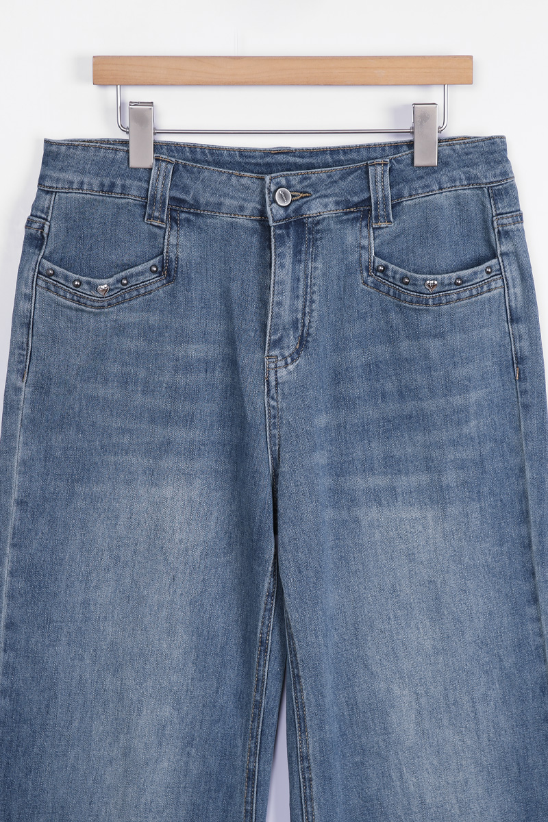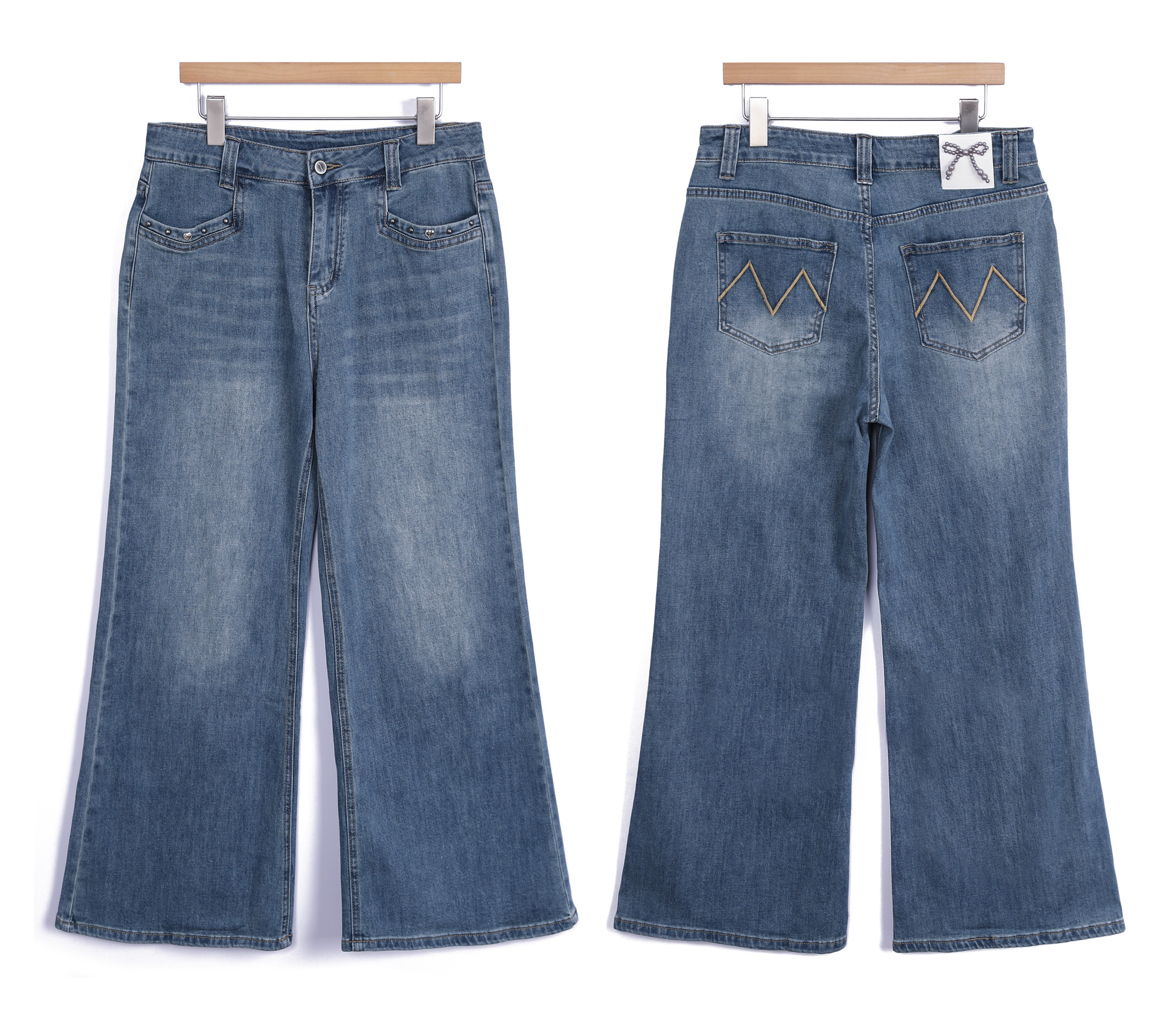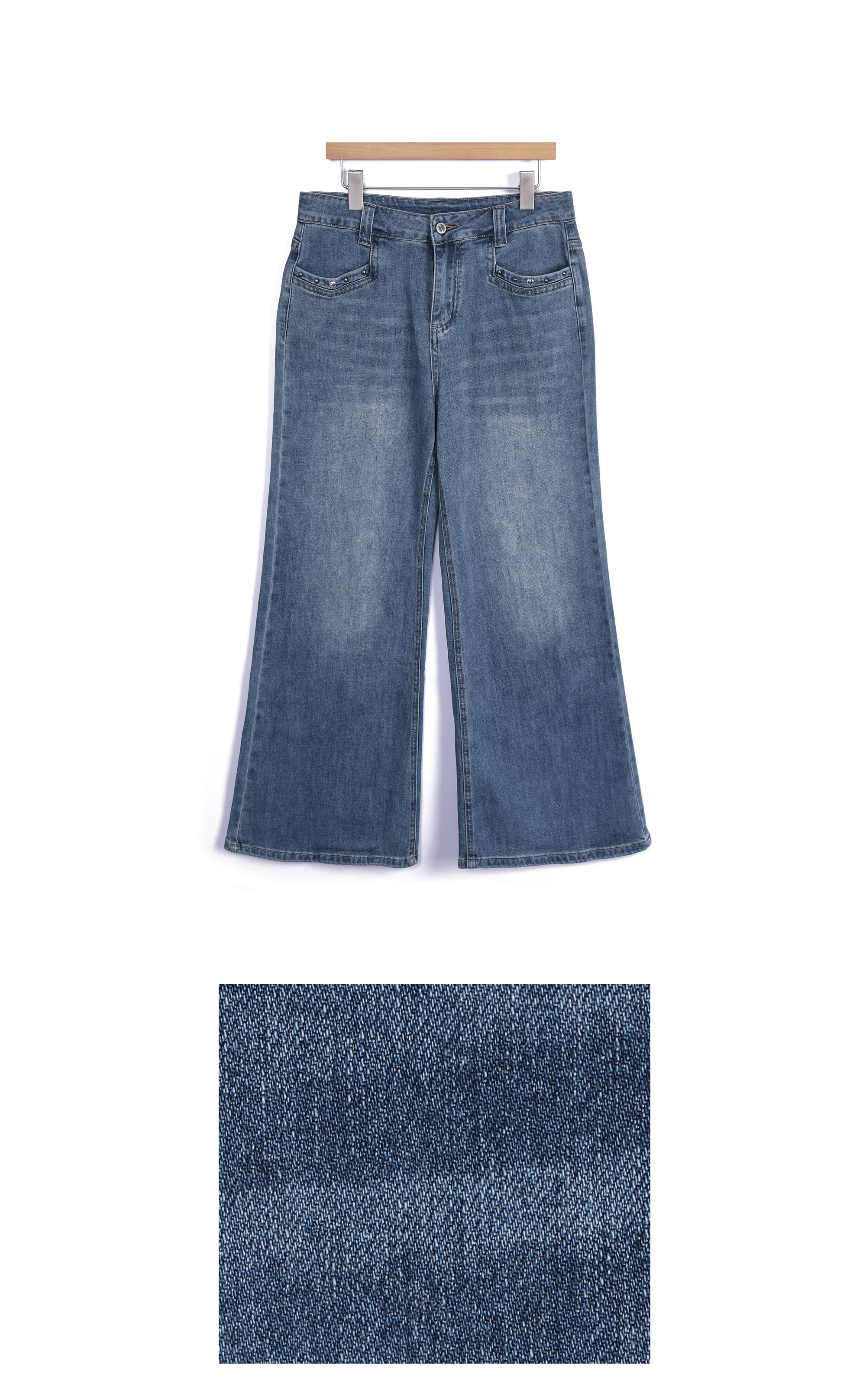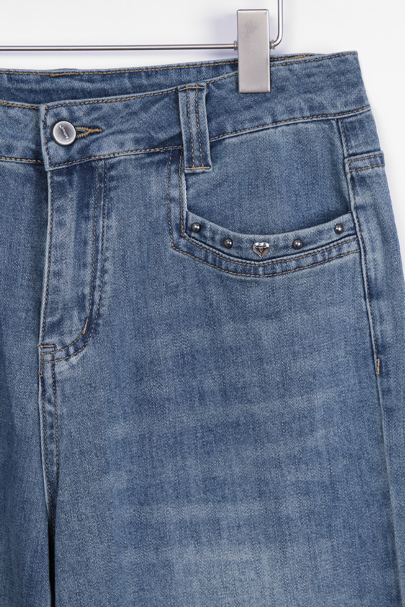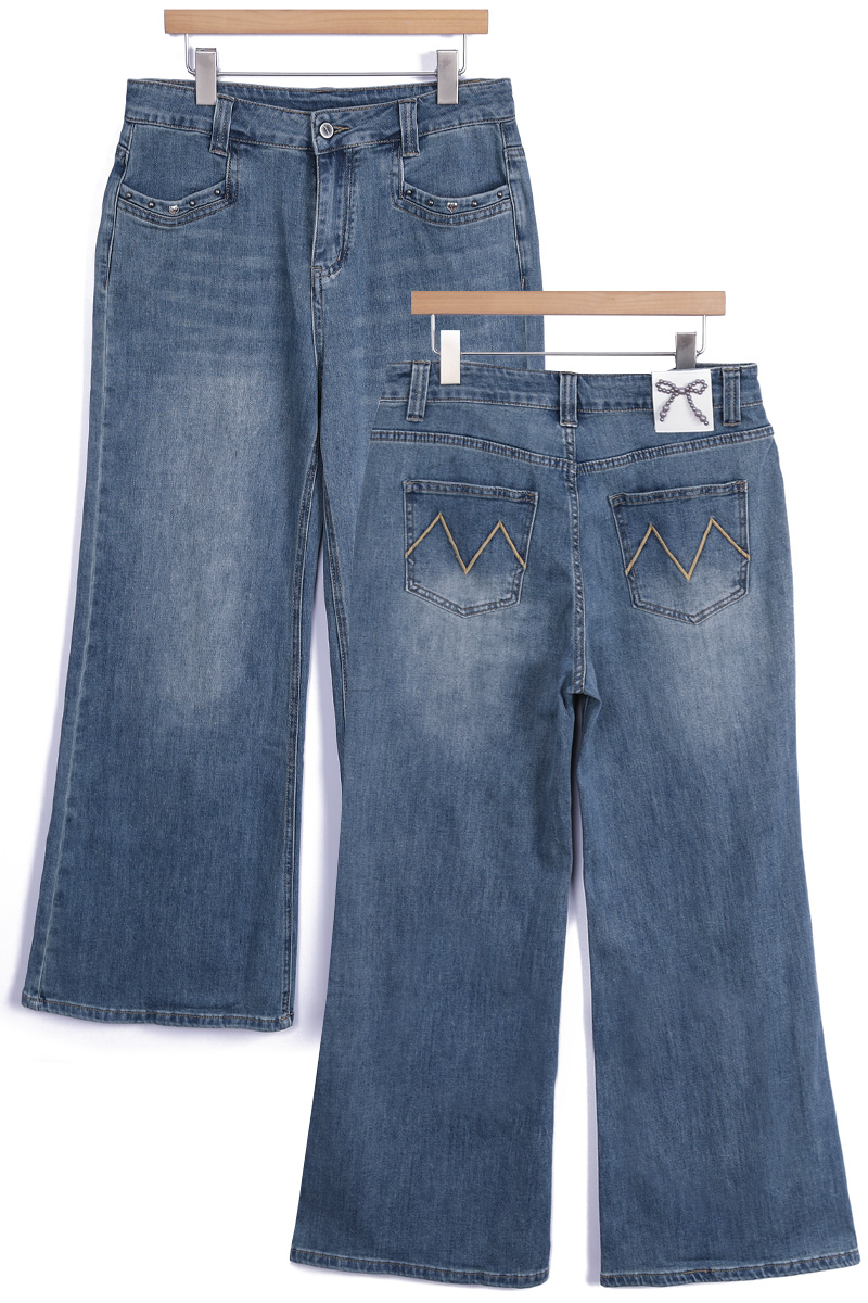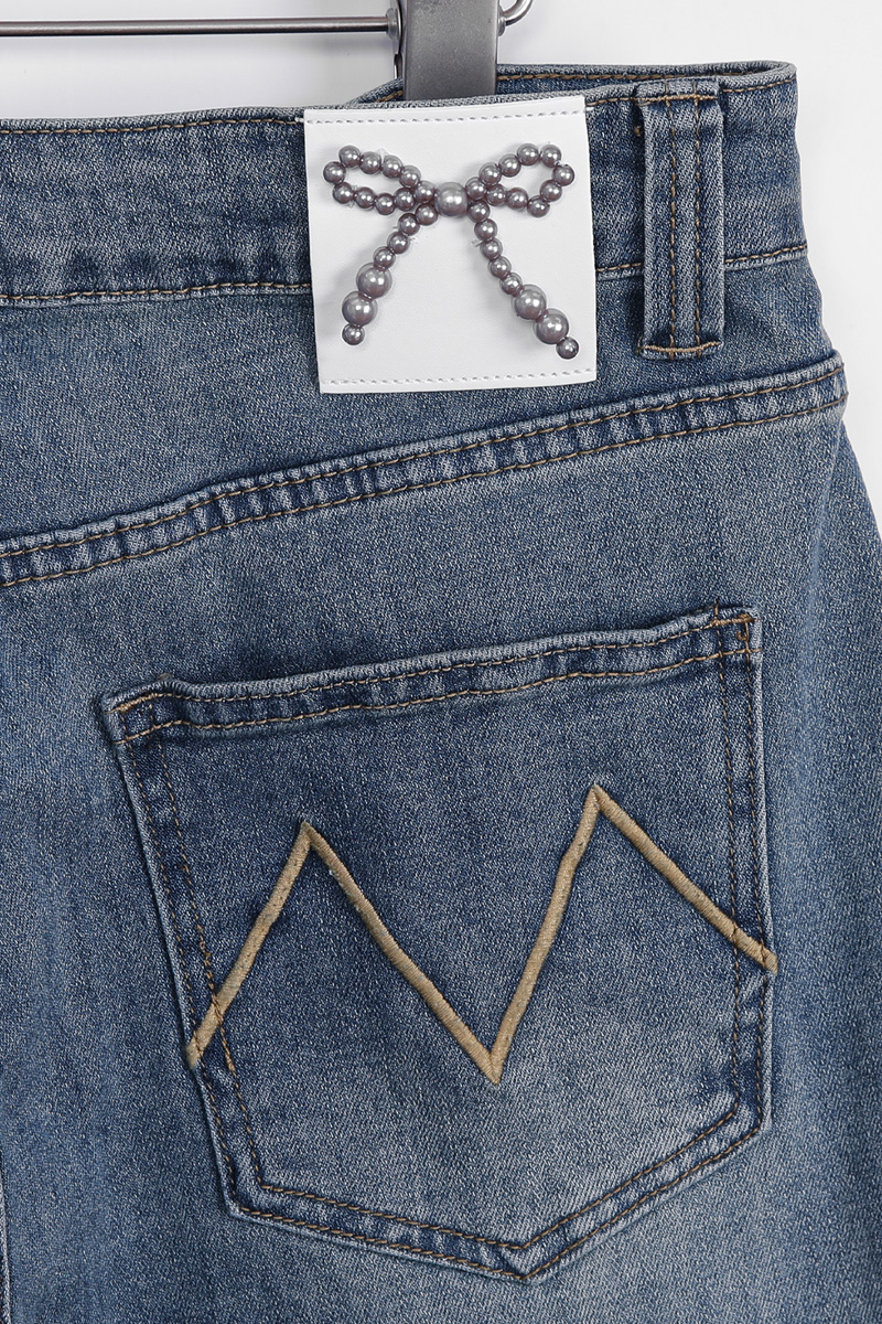 다리를 길고 슬림하게 완성하는 데님 데님과 같은 기본 아이템일수록 전체 스타일이 완전히 달라 보인다는 것 아시지요? 언뜻 사진으로는 기본 청바지처럼 보이지만 부츠컷 실루엣이 매력적인 디자인이에요. 허리부터 힙까지는 안정적으로 라인을 잡아주고 단순한 티셔츠와 매치해도 완성되는 요술같은 비법이랍니다 :) 입체감을 살리는 워싱 디테일 데님 전체에는 자연스러운 워싱 디테일이 더해져 있어요. 앞면 Y존 라인에는 위스커 워싱이 표현되어 빈티지한 분위기를 만들어줘요. 또한 Y존 이하부터 무릎 라인까지 이어지는 연청 워싱은 뒤쪽 힙 아래, 허벅지 라인에도 은은한 연청 워싱이 더해져 데님 컬러를 완성했답니다! 은은하게 빛나는 포켓 장식 앞면 포켓 입구에는 작은 스터드와 하트 장식 디테일이 가볍게 더해져 있어요. 과하게 튀지 않는 실버블랙 톤 메탈이라 포인트가 살아나는 디자인이에요. 데님 특유의 캐주얼한 분위기에 생각해 주시면 되어요 :) 탄탄함과 유연함을 함께 담은 원단 원단은 코튼 베이스에 스판이 혼방된 스트레치 데님으로 제작되었어요. 탄탄한 데님 질감을 유지하면서도 움직일 때 훨씬 편안하게 느껴져요. 간절기에 입기 좋은 두께감이라 안정적인 밀도를 지니고 있어요. 허릿단 안쪽에 별도의 밴딩은 없지만 반 사이즈 정도까지 유연하게 커버되는 착용감을 보여주고 있으니 애매하게 볼록,나온 뱃살 염려하지 마세요 :) 뒷모습을 더욱 돋보이게 하는 포인트 이 데님의 가장 매력적인 부분은 진주 리본 장식과 M 레터링으로 나눌 수 있는 포인트 백 디자인. 허릿단 뒤쪽에는 섬세하게 자리하고 있어요. 데님 위에 더해진 작은 주얼리 같은 포인트라 힙 라인을 살려주는 디테일 백 포켓에는 카키 베이지 컬러의 M 레터링 자수가 들어가 있어요. 포켓 위치가 비교적 위쪽에 배치되어 있어
