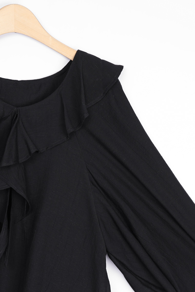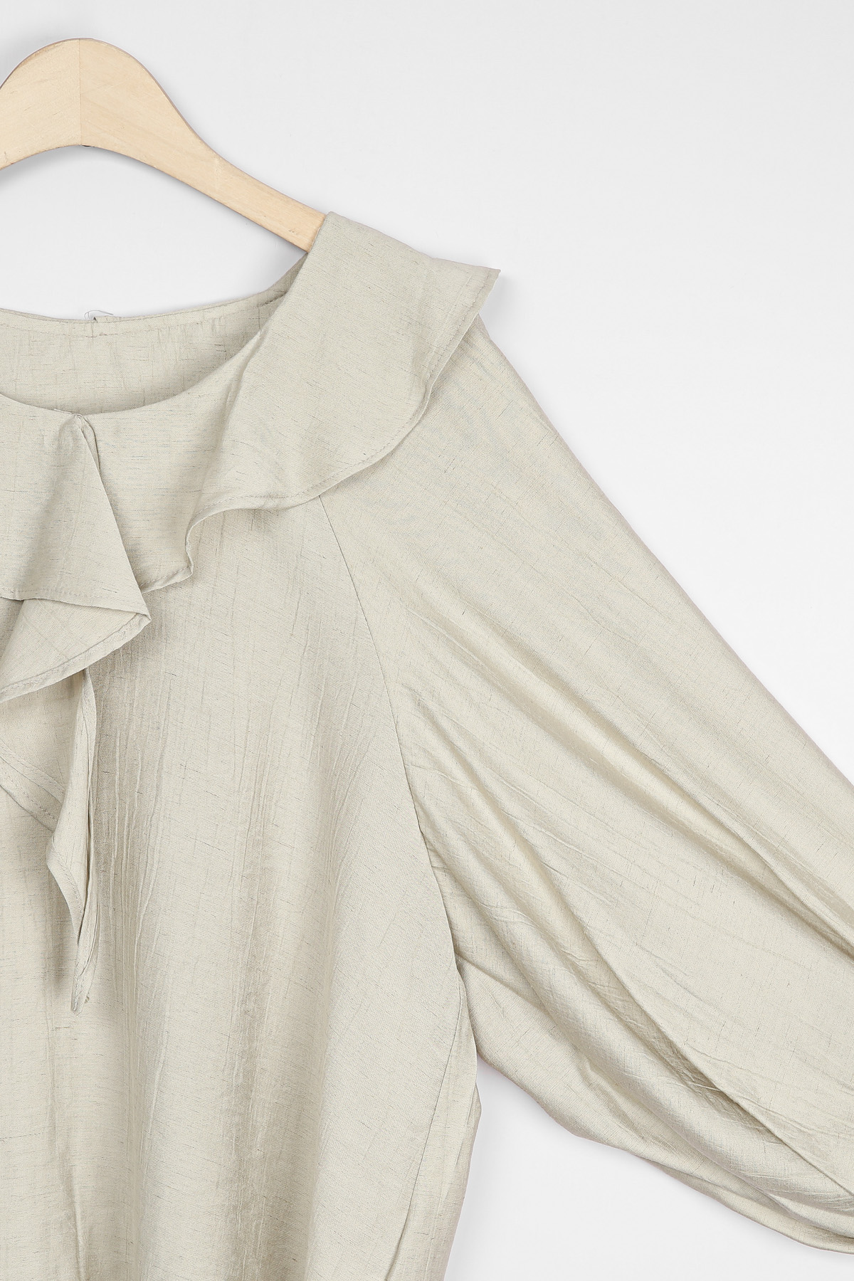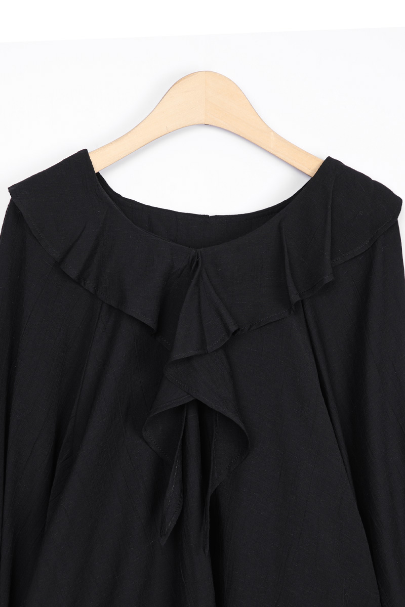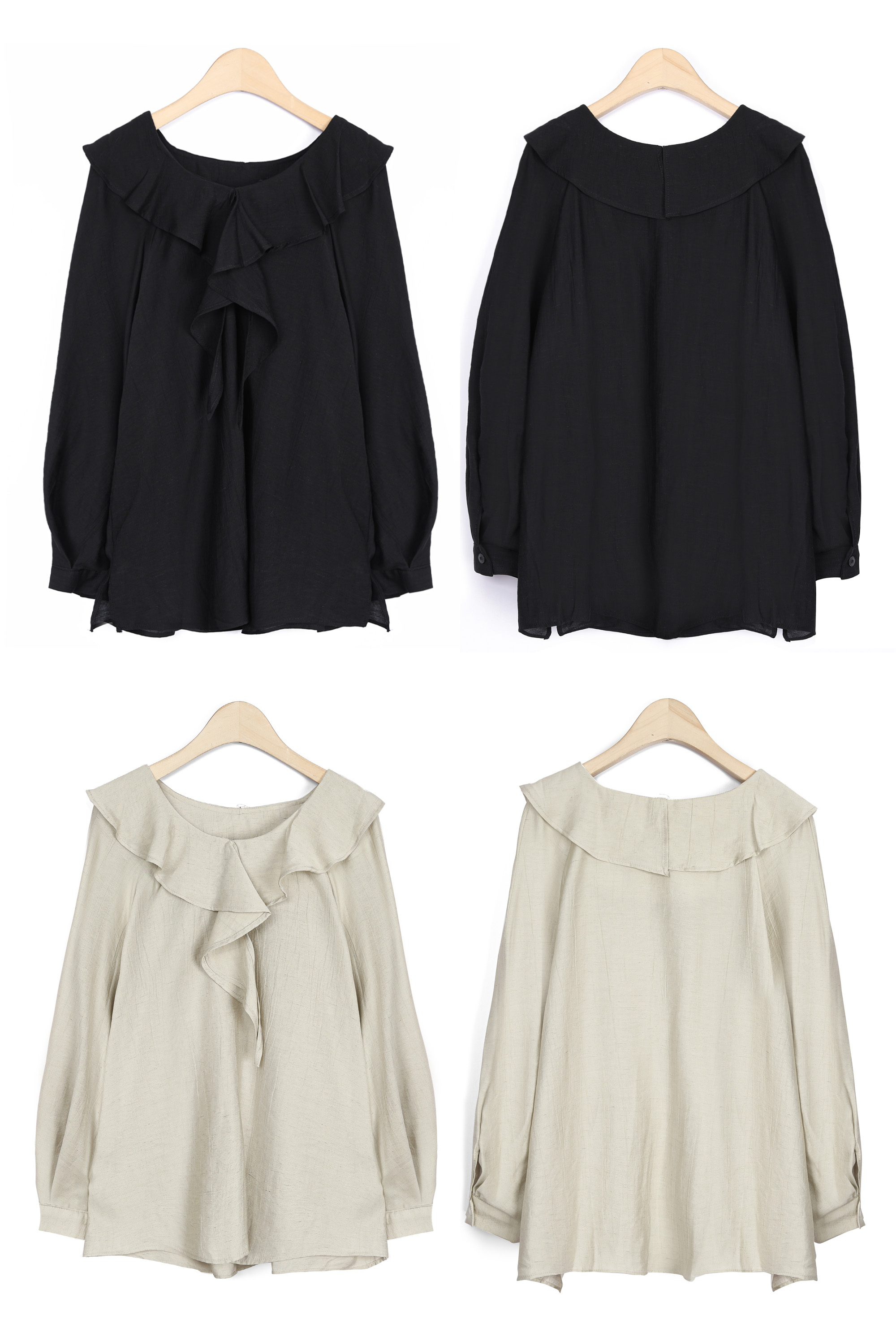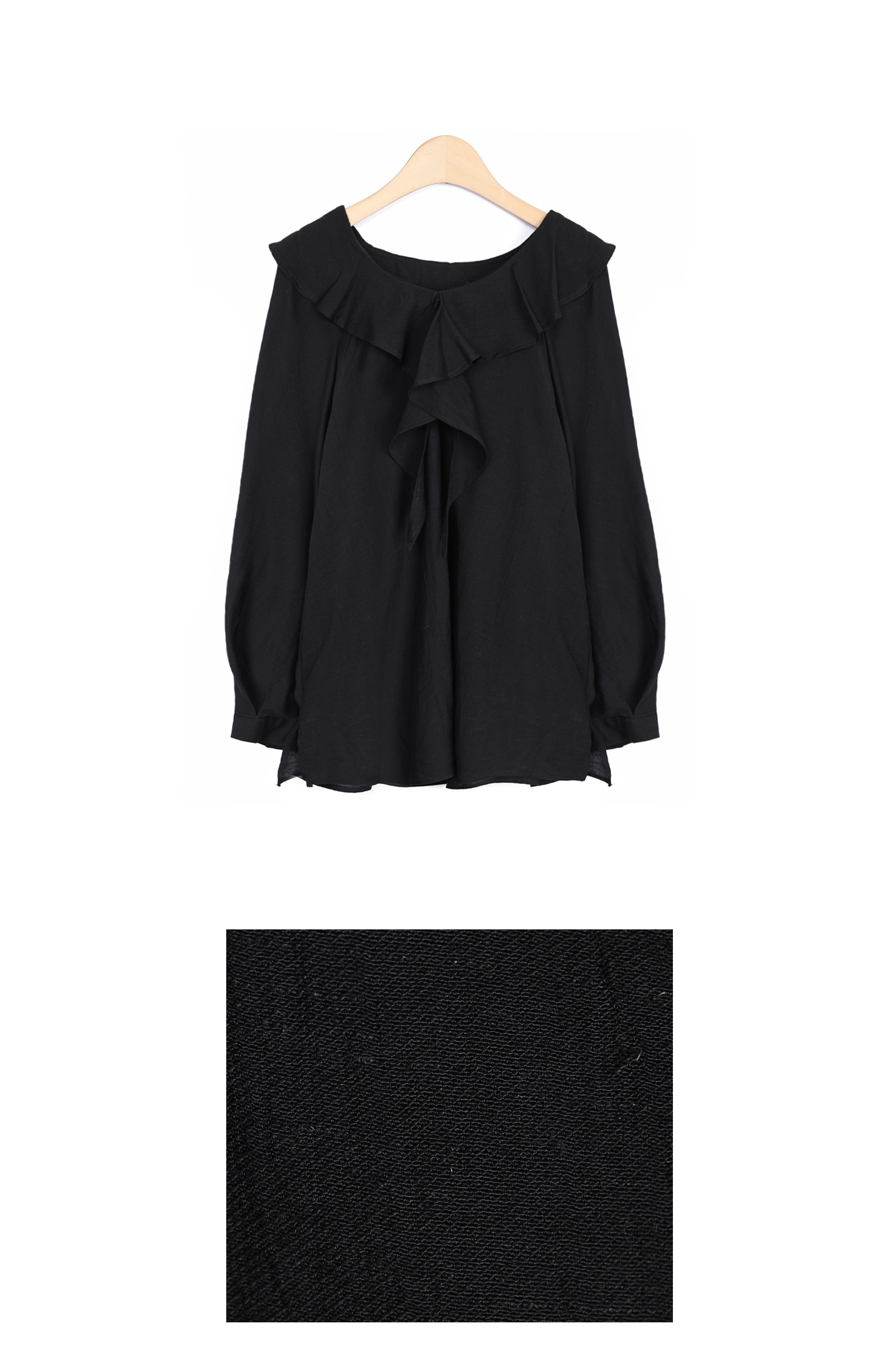 | 디테일 | 9cm 와이드 프릴 러플 카라 | 좌우에서 이어지는 프릴 카라, 프릴은 전면 중앙에서 끈 형태로 만나 트위스트 구조로 입체적인 우아함 연출 |