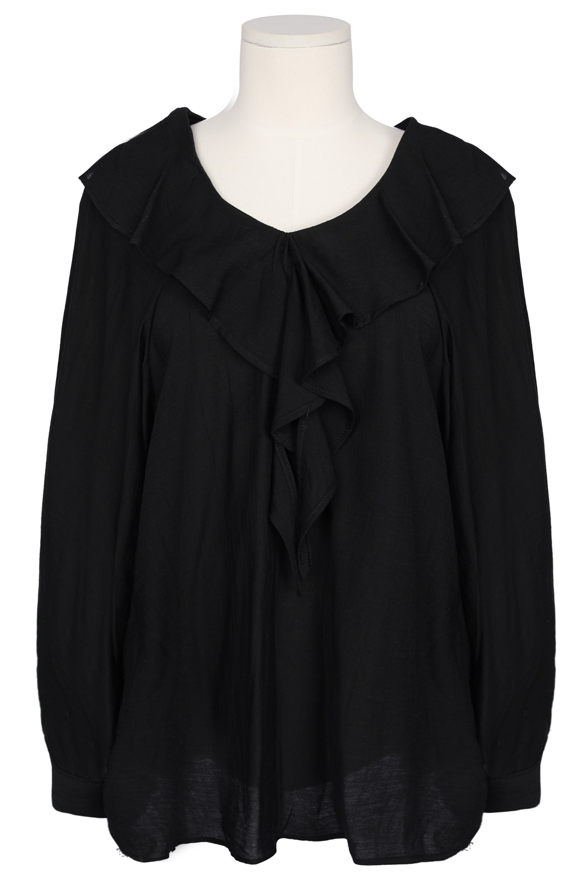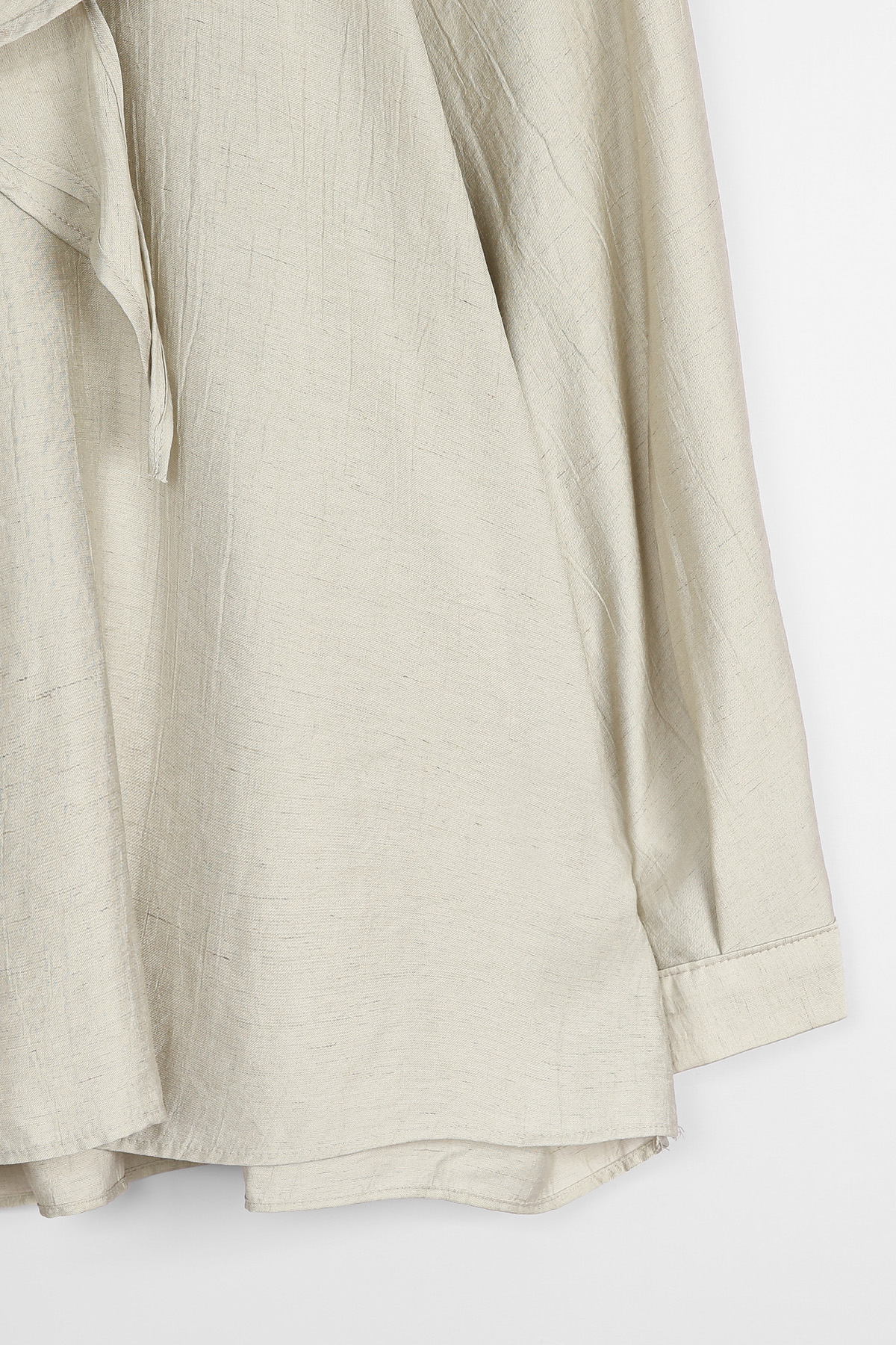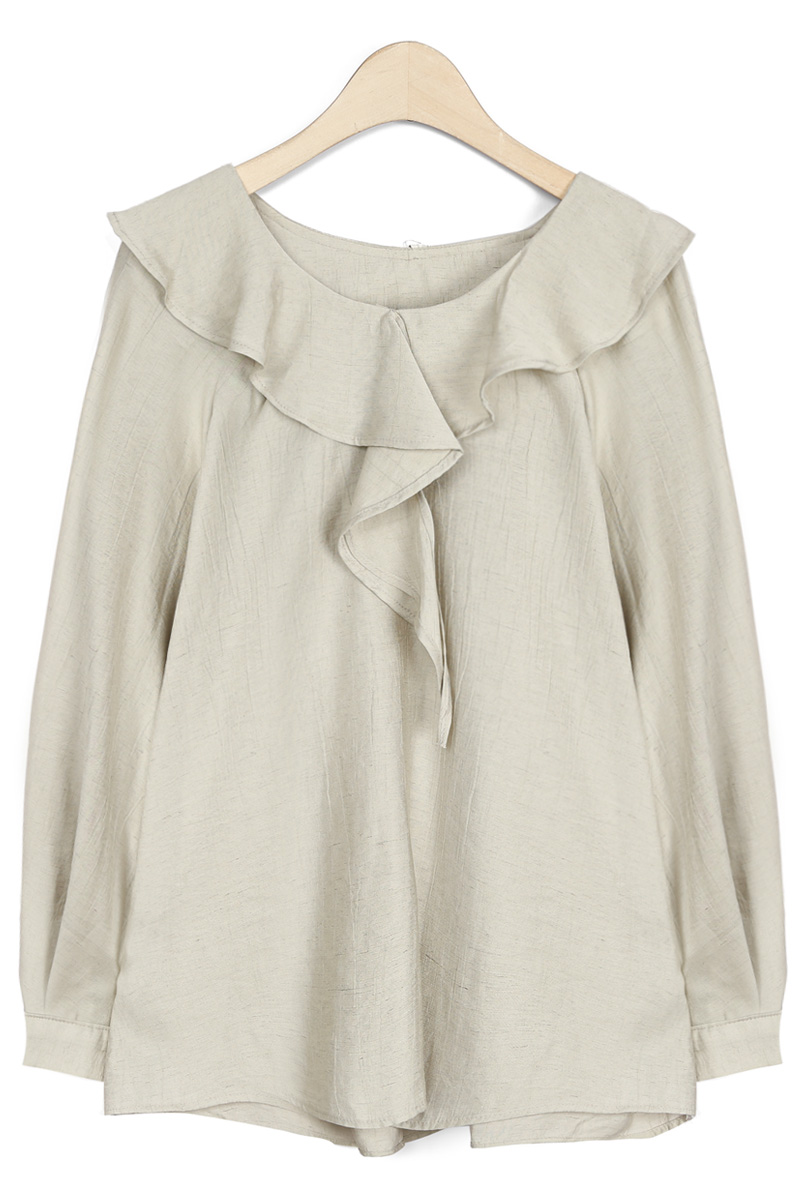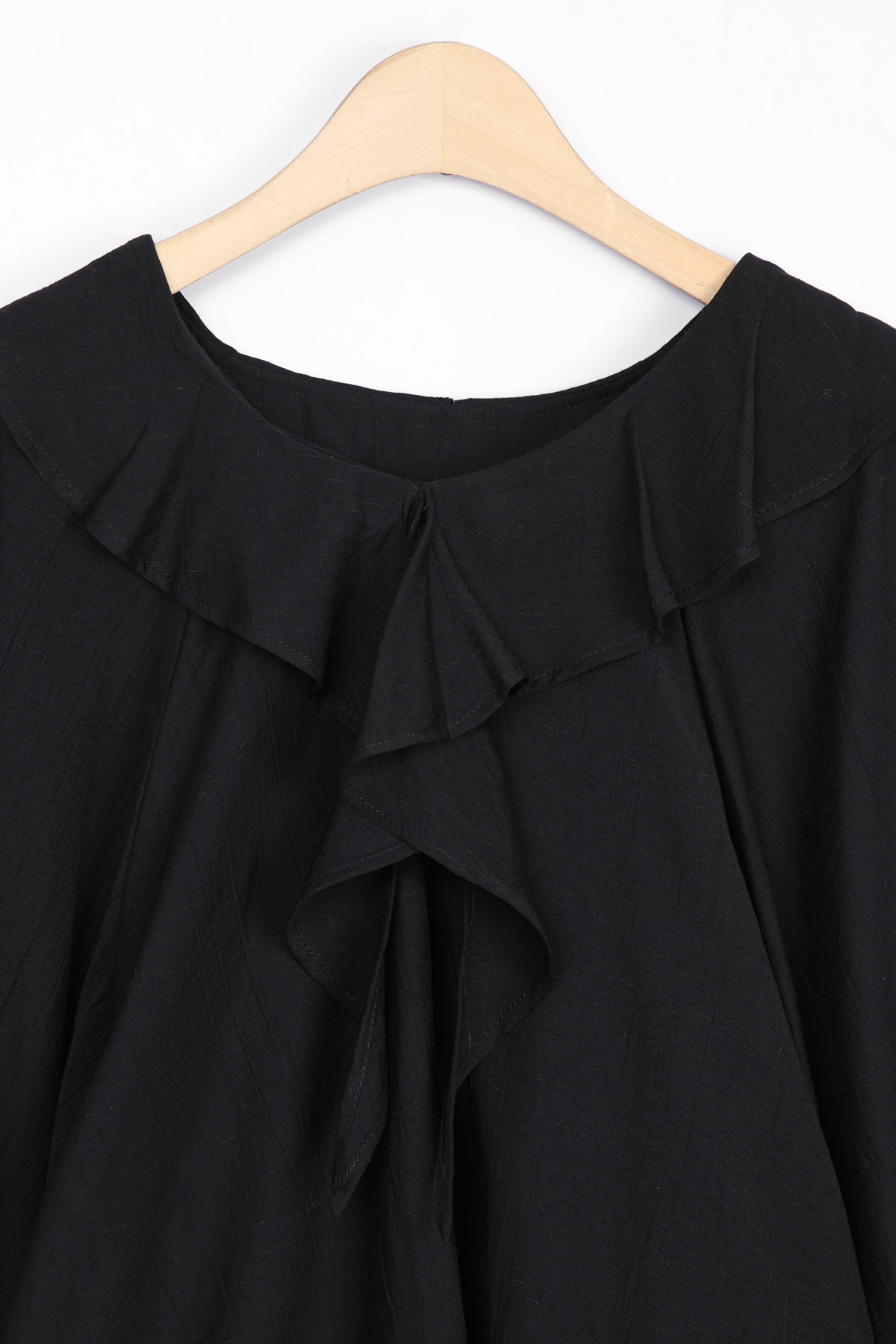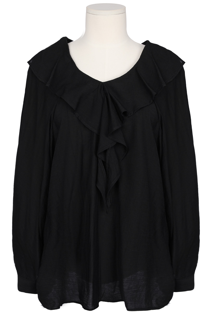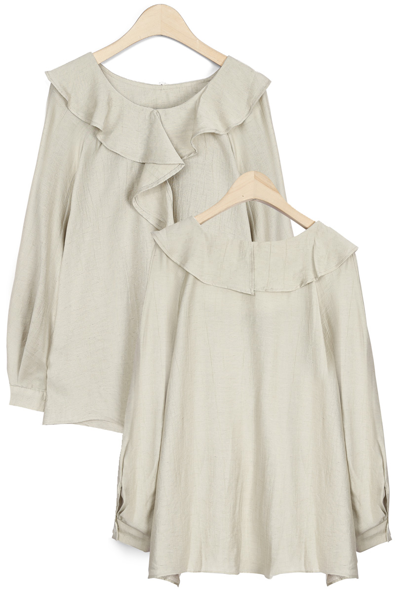 | 디테일 | 9cm 와이드 프릴 러플 카라 | 좌우에서 이어지는 프릴 카라, 프릴은 전면 중앙에서 끈 형태로 만나 트위스트 구조로 입체적인 우아함 연출 |