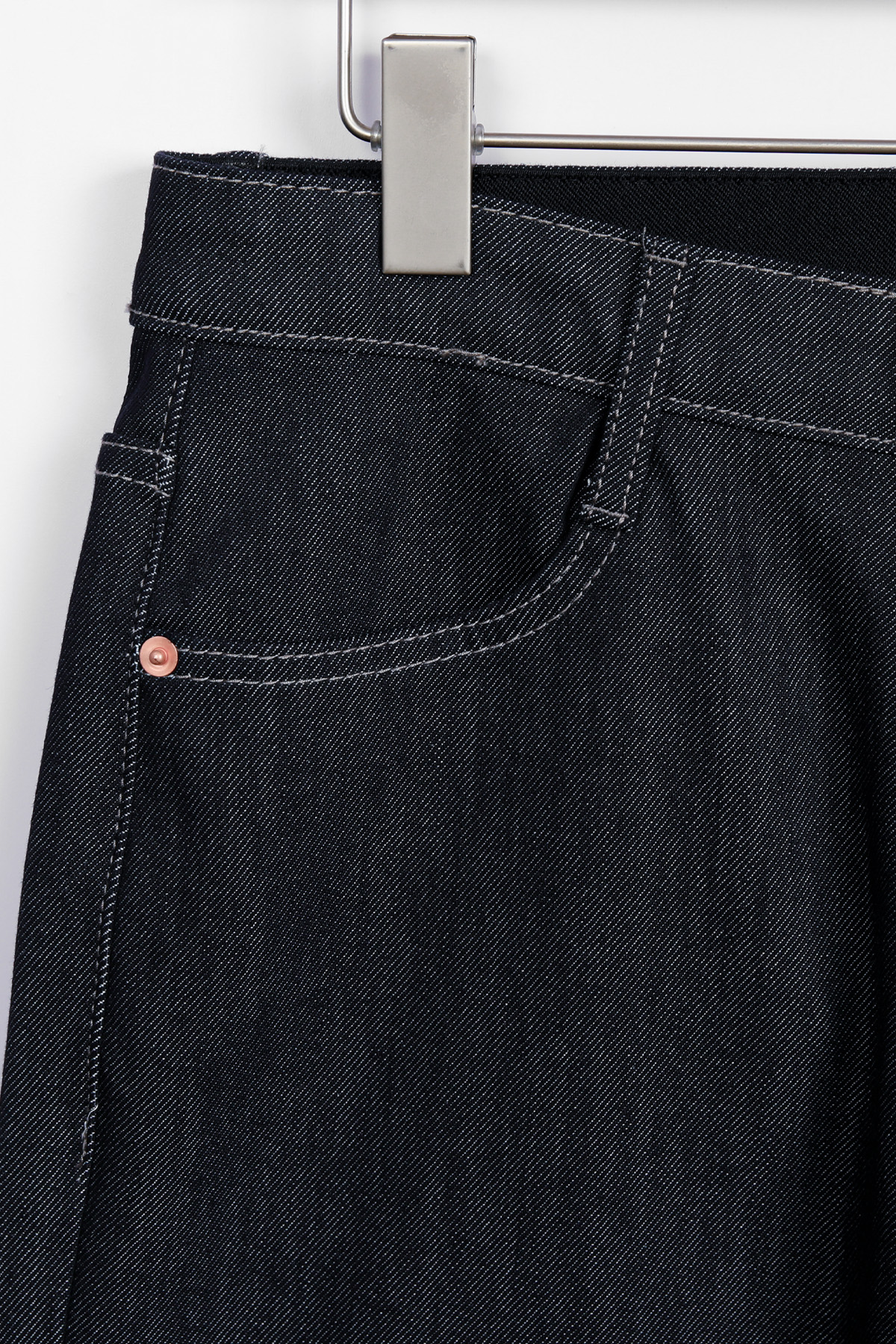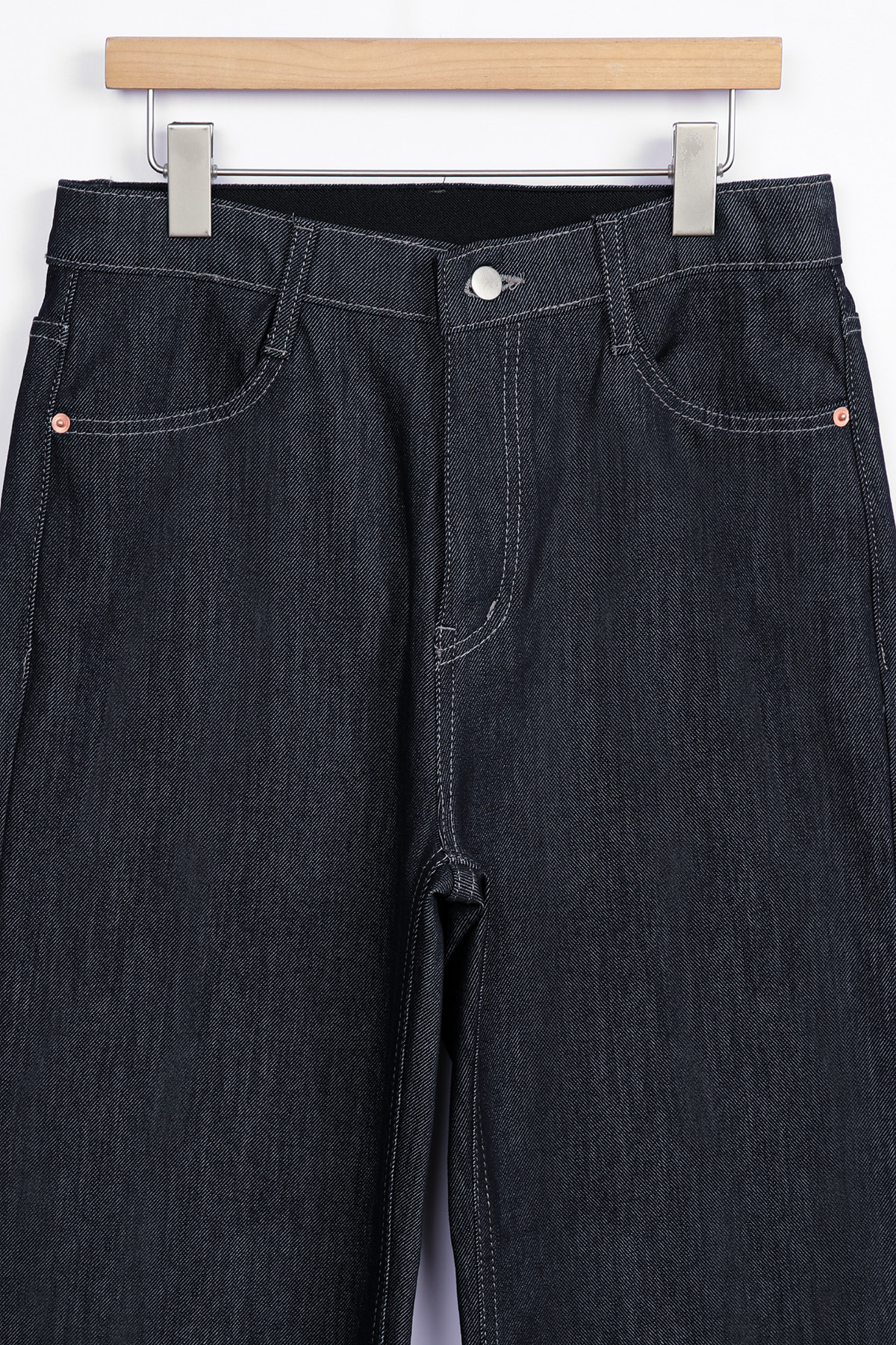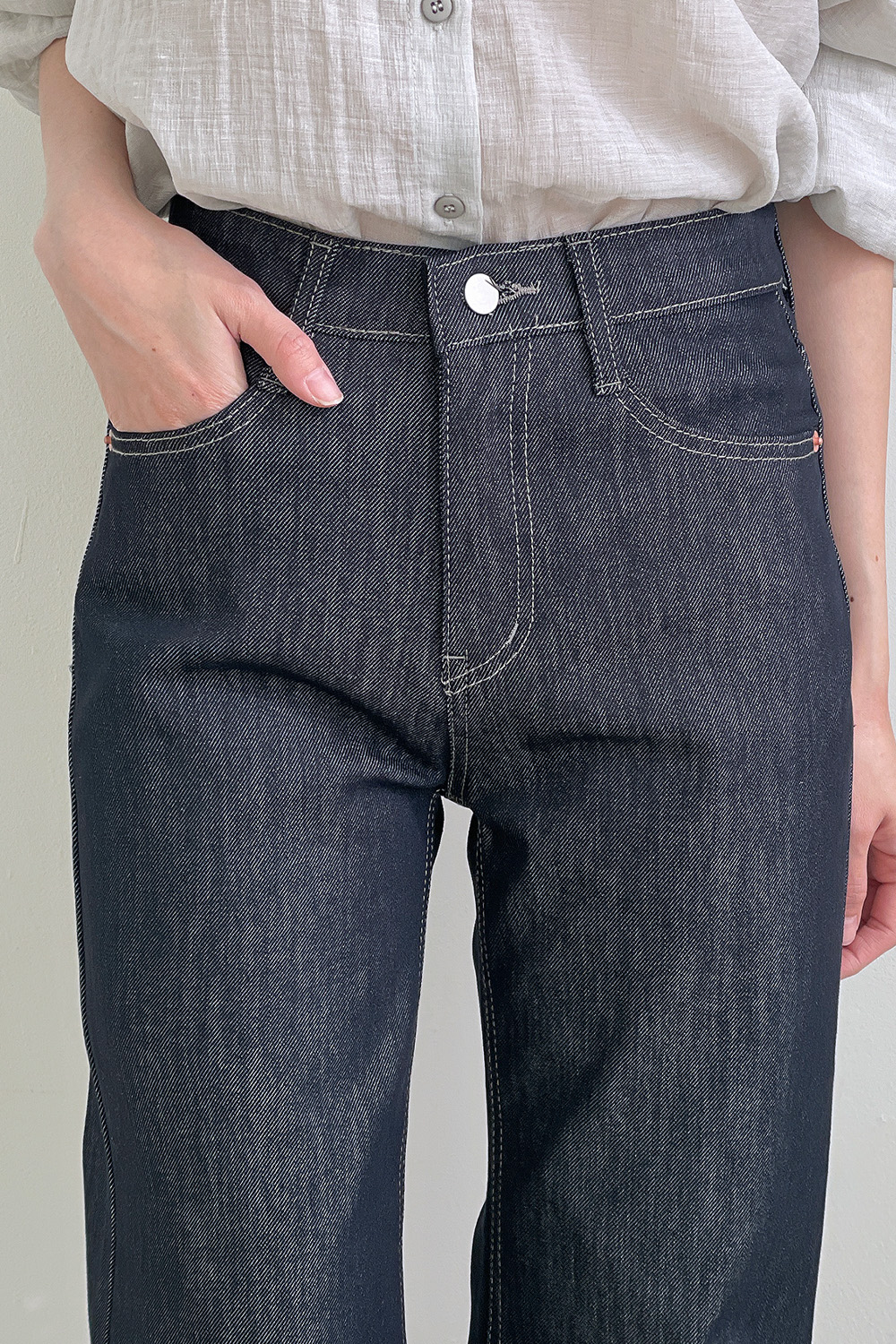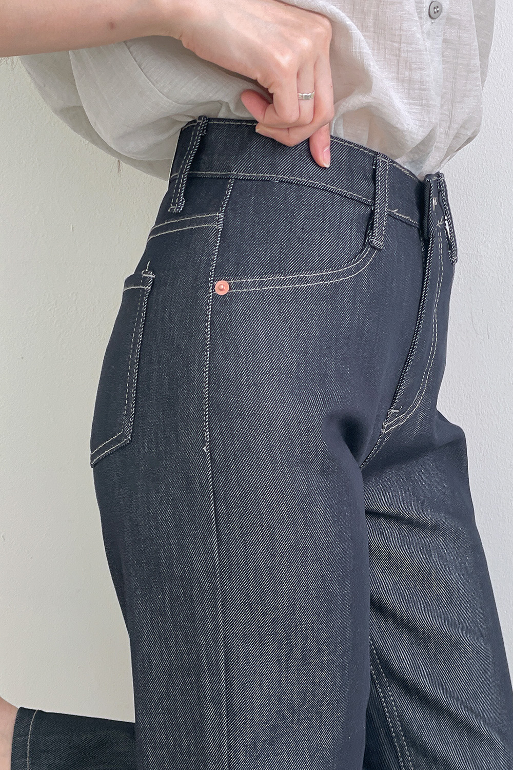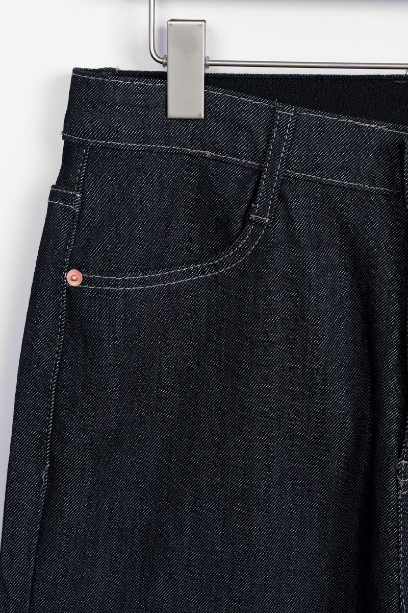 | 소재 | 면 55 + 폴리 40 + 레이온 4 + 스판 1 | 가벼운 무게감과 사방 텐션이 조화로운 프리미엄 데님 텍스처 |