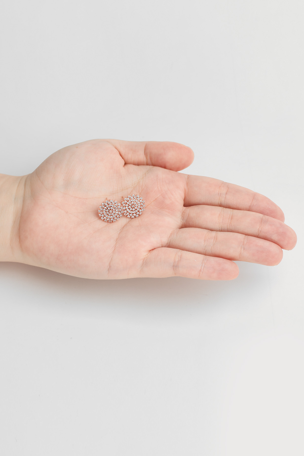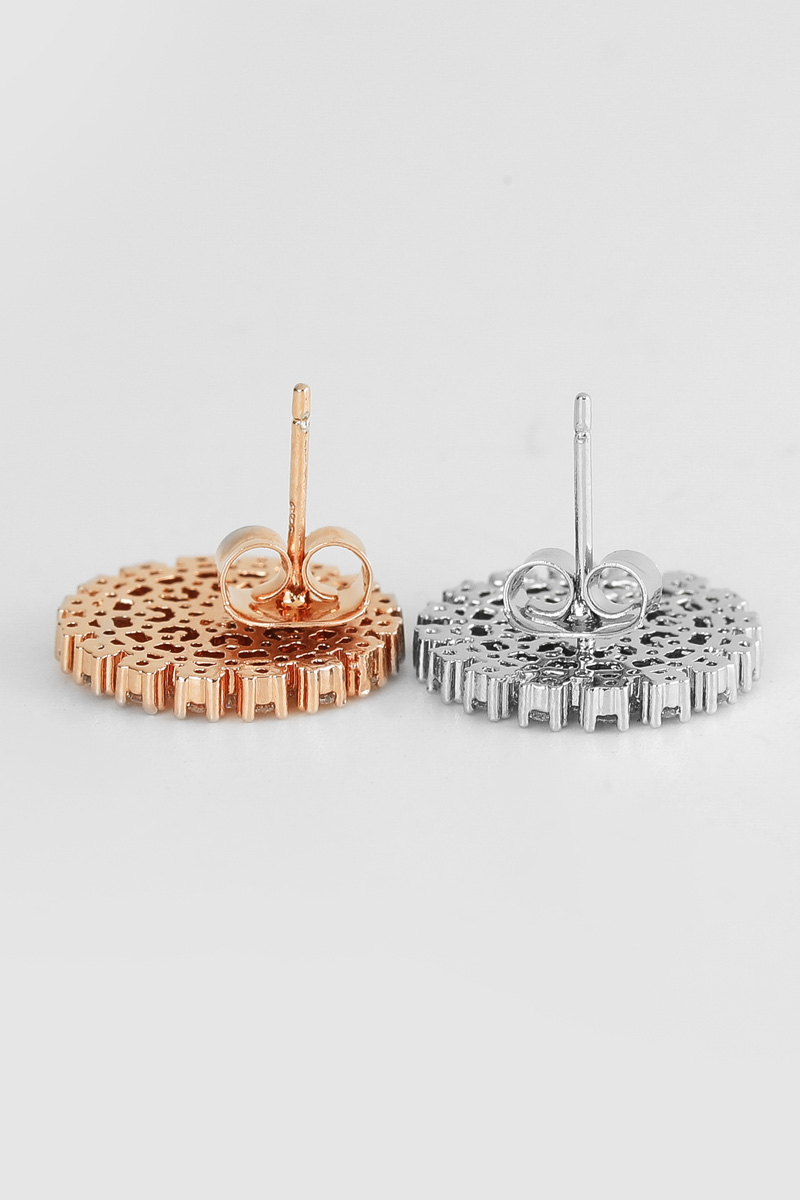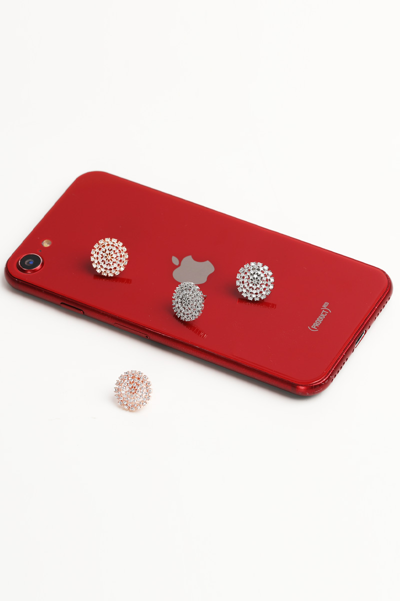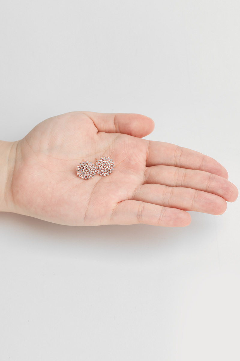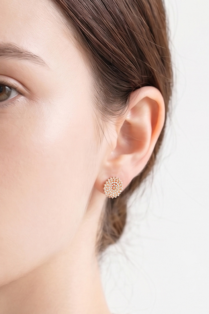 신주 본체에 지르코니아 큐빅을 방사형 파베 세팅한 지름 1cm 플랫 원판 이어링이에요. 침(포스트) 부분은 실버 925 소재로 제작되어 알러지 프리로 착용 가능하며, 화이트골드·로즈골드 두 가지 컬러로 구성되어 있어요. 큐빅은 두 컬러 공통으로 화이트 색상이라 계절 구분 없이 착용 가능하고, 귓볼에 자연스럽게 안착하며 하단이 가볍게 드롭되는 구조랍니다.