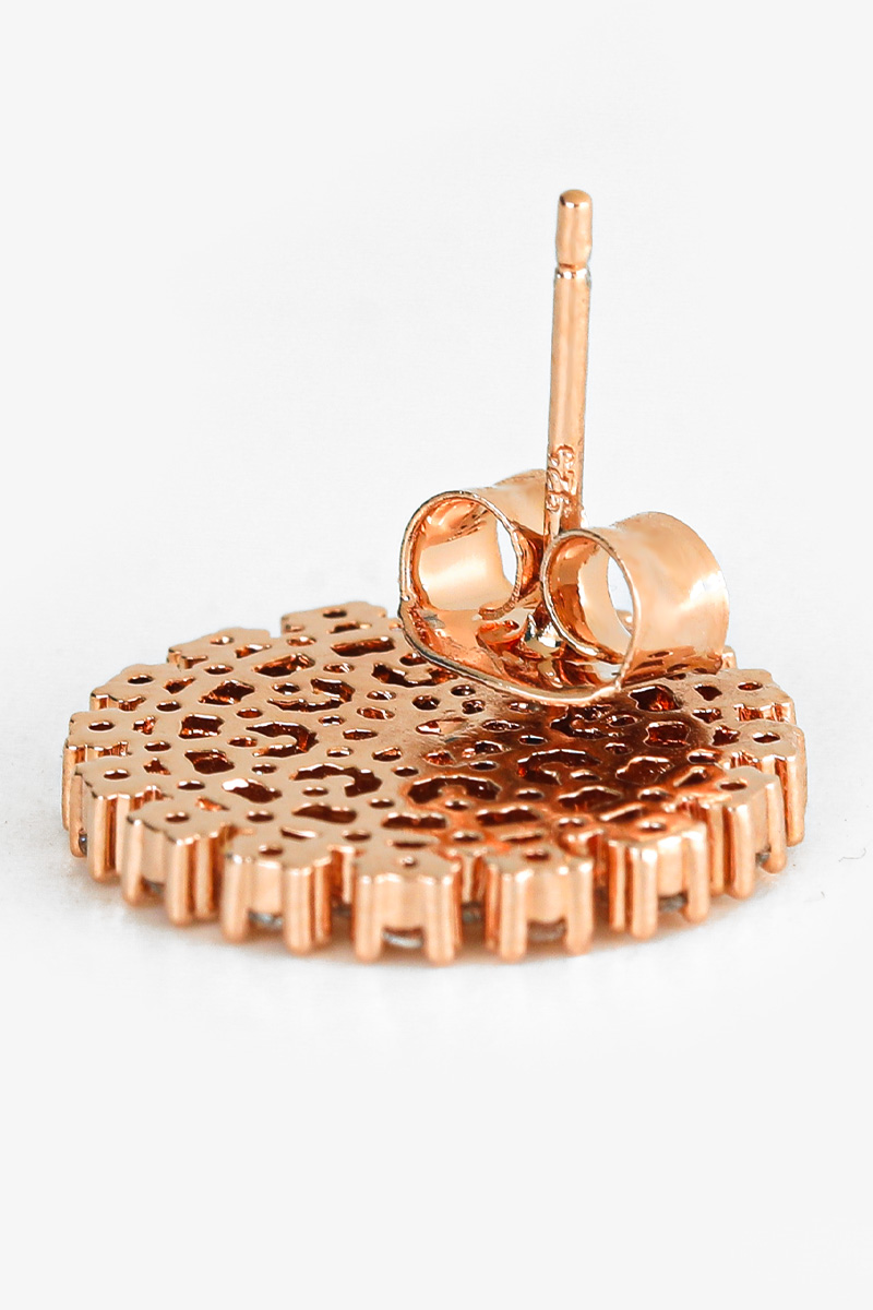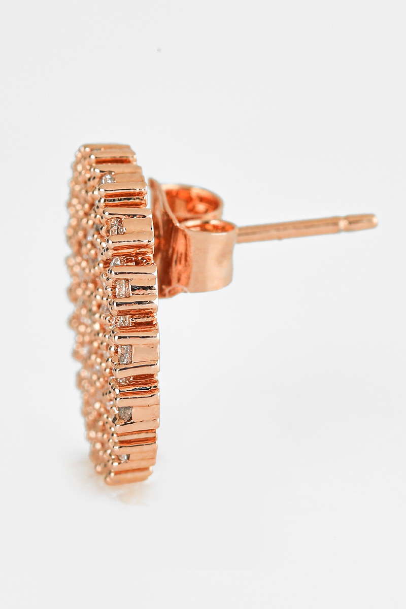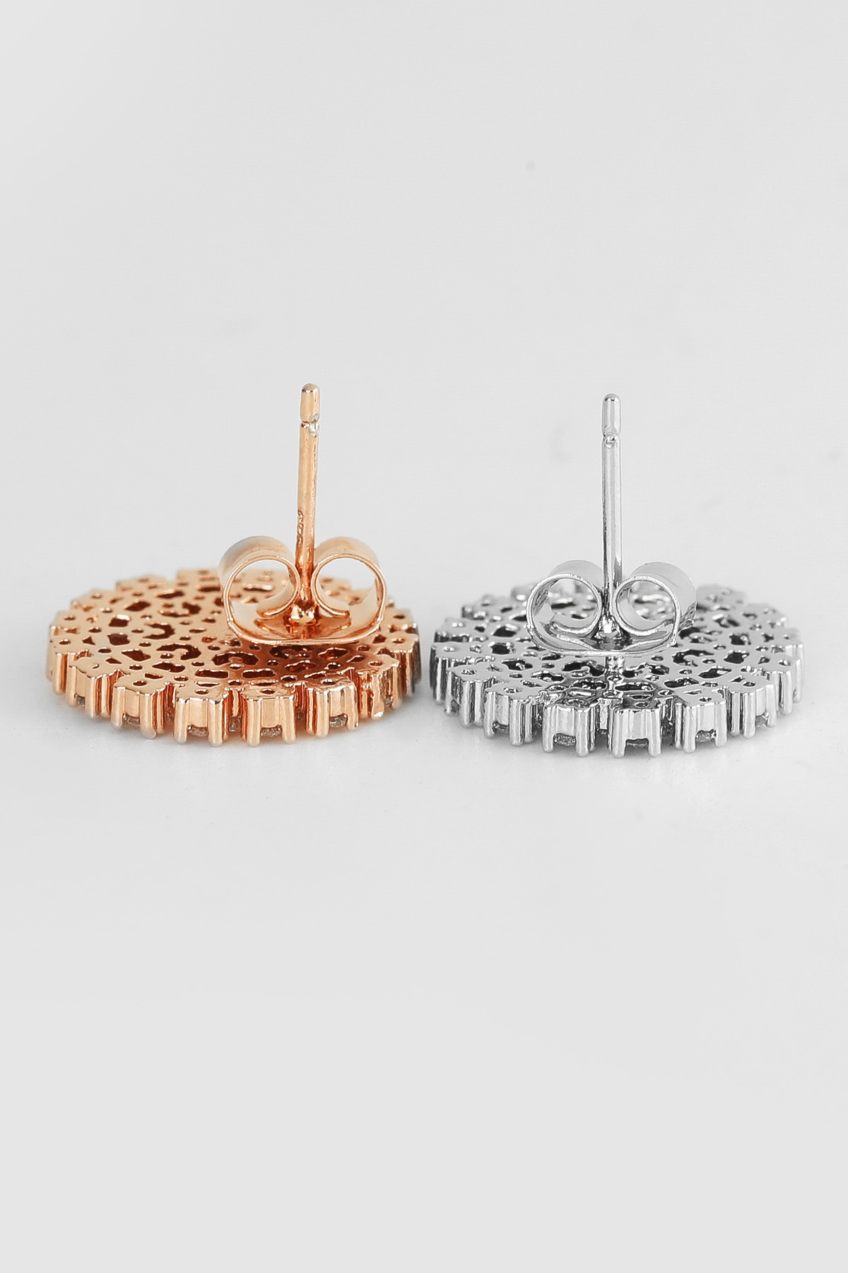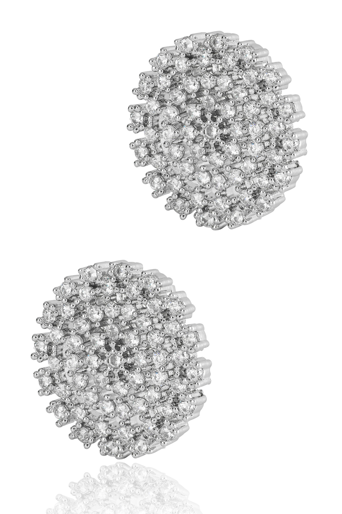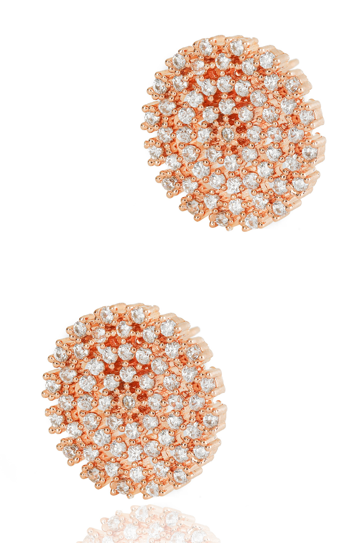 신주 본체에 지르코니아 큐빅을 방사형 파베 세팅한 지름 1cm 플랫 원판 이어링이에요. 침(포스트) 부분은 실버 925 소재로 제작되어 알러지 프리로 착용 가능하며, 화이트골드·로즈골드 두 가지 컬러로 구성되어 있어요. 큐빅은 두 컬러 공통으로 화이트 색상이라 계절 구분 없이 착용 가능하고, 귓볼에 자연스럽게 안착하며 하단이 가볍게 드롭되는 구조랍니다.