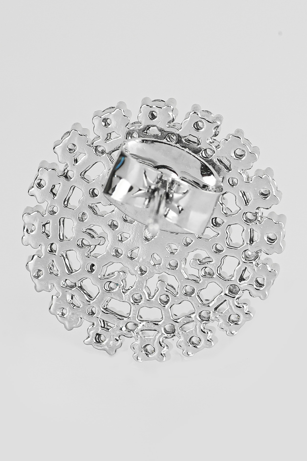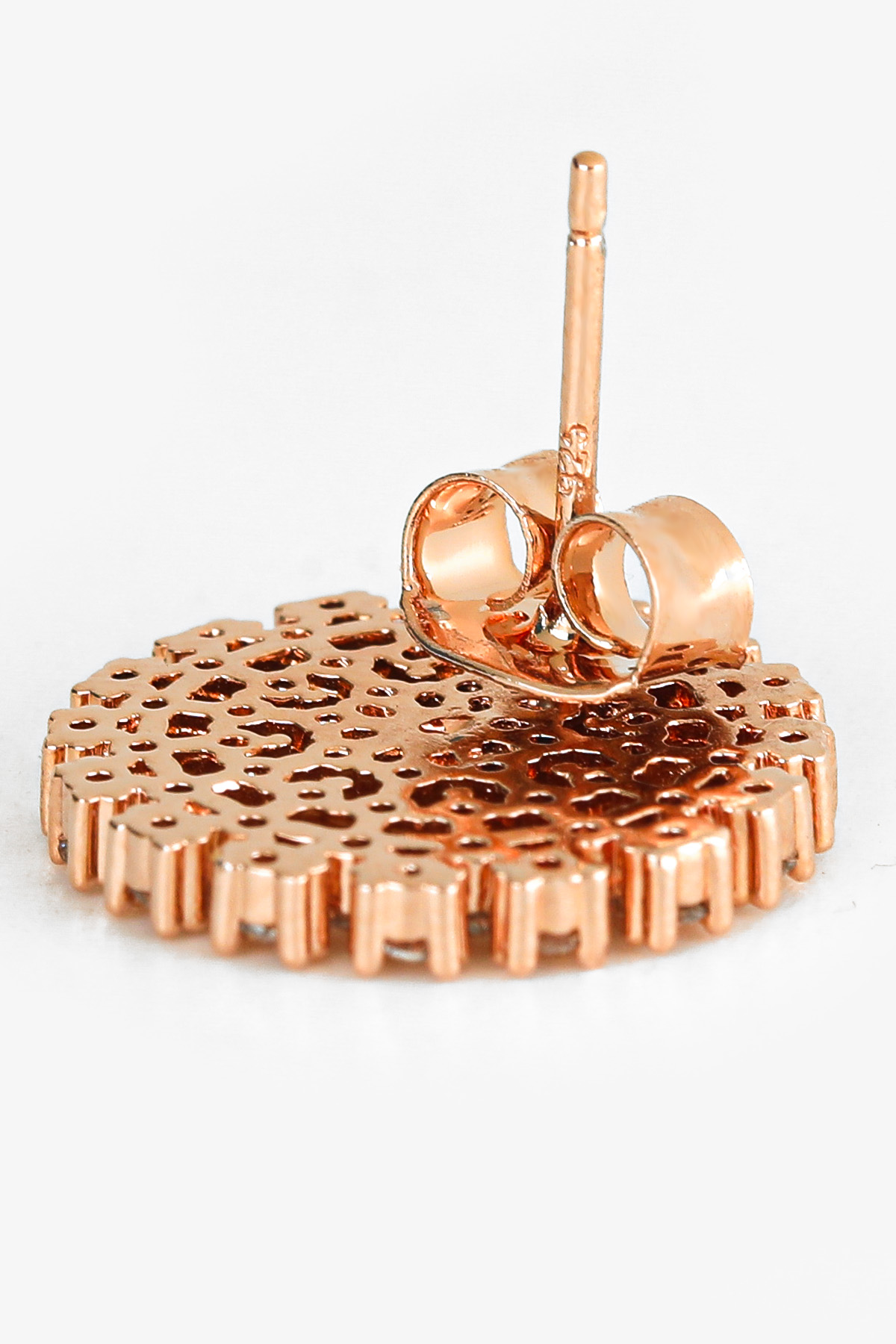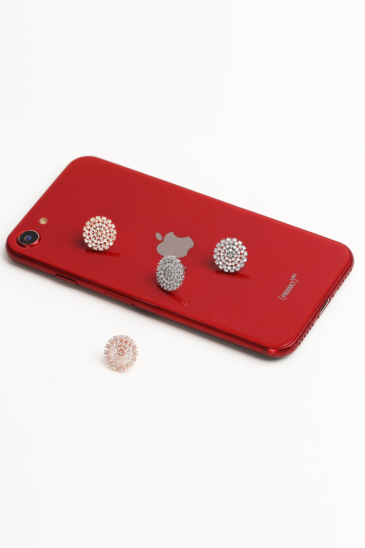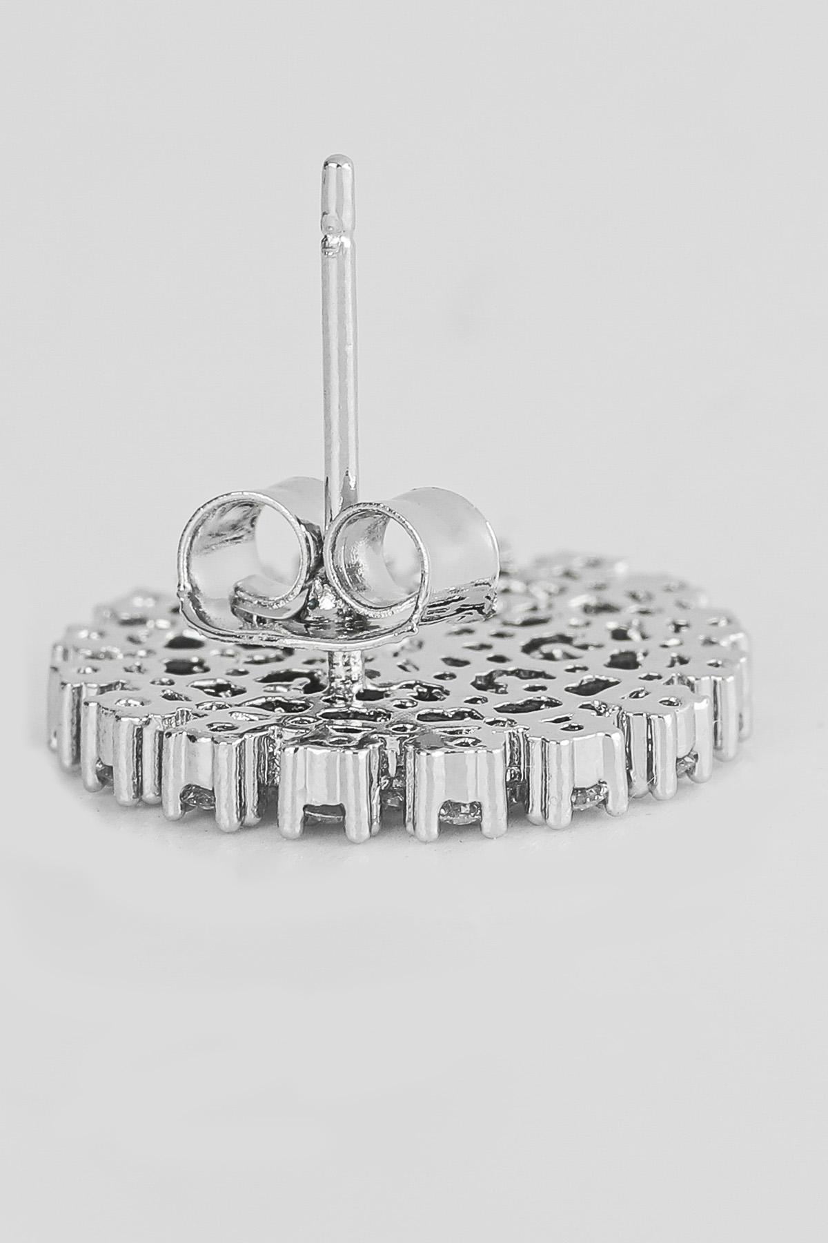 신주 본체에 지르코니아 큐빅을 방사형 파베 세팅한 지름 1cm 플랫 원판 이어링이에요. 침(포스트) 부분은 실버 925 소재로 제작되어 알러지 프리로 착용 가능하며, 화이트골드·로즈골드 두 가지 컬러로 구성되어 있어요. 큐빅은 두 컬러 공통으로 화이트 색상이라 계절 구분 없이 착용 가능하고, 귓볼에 자연스럽게 안착하며 하단이 가볍게 드롭되는 구조랍니다.
