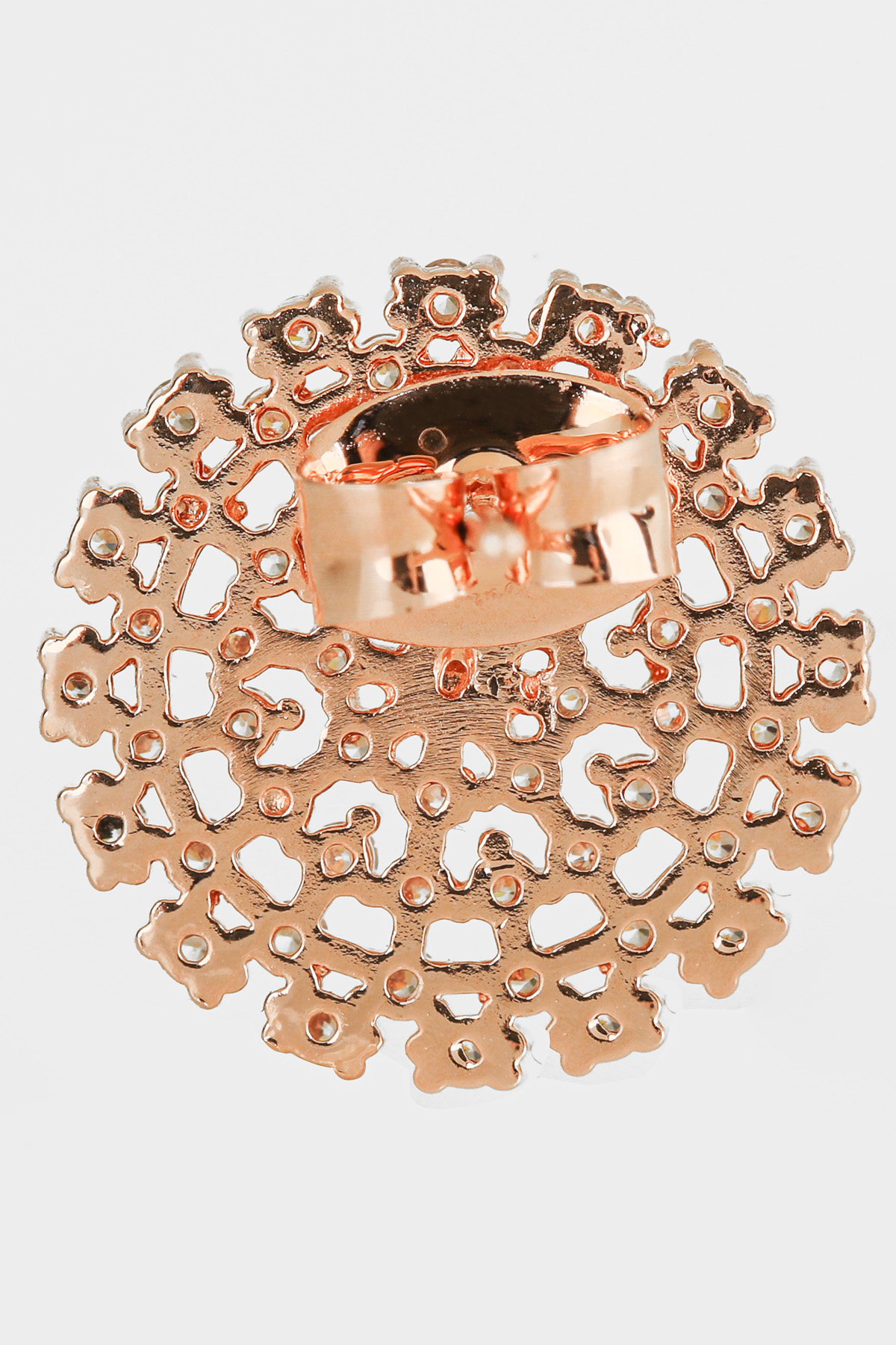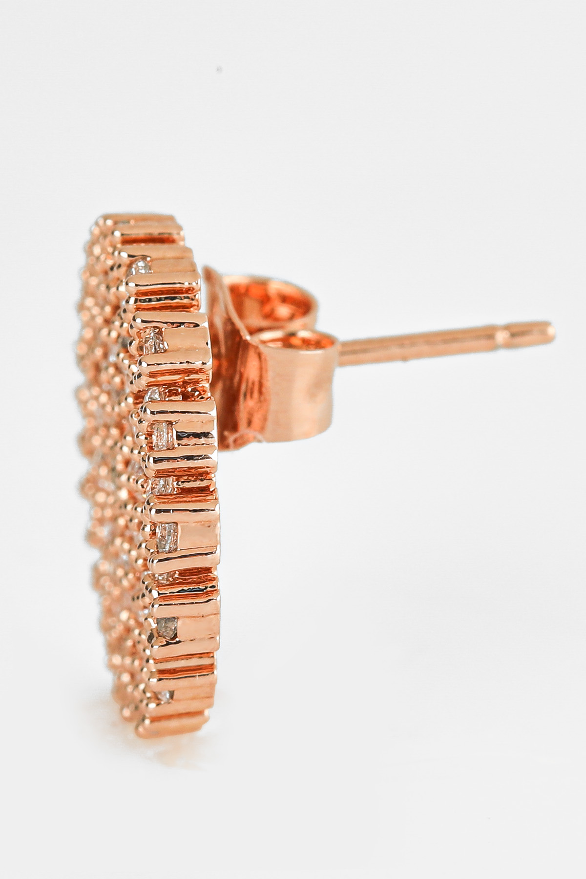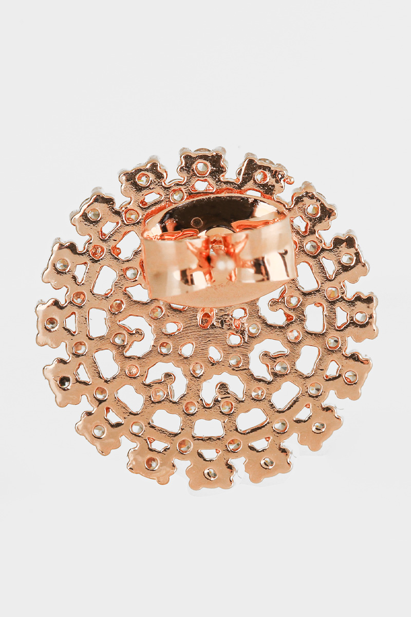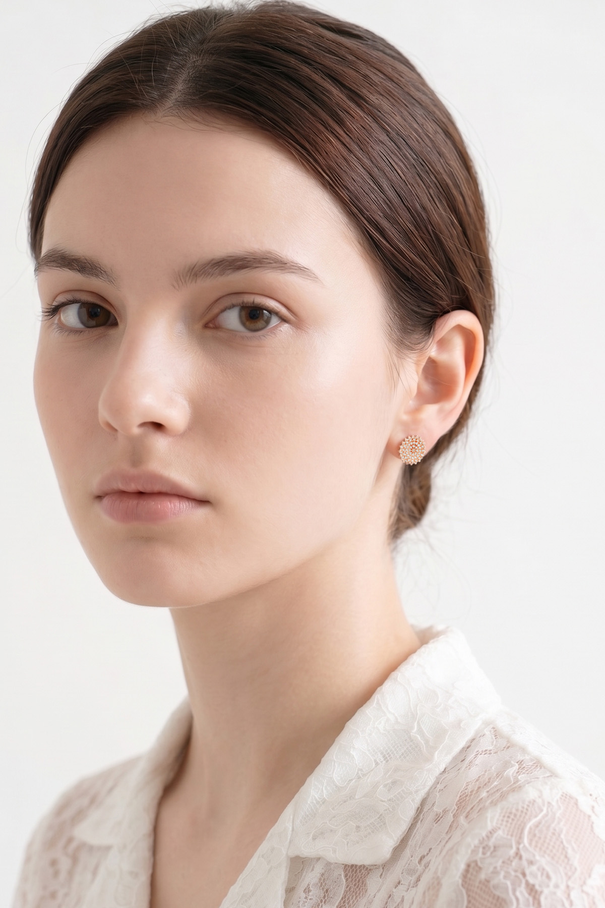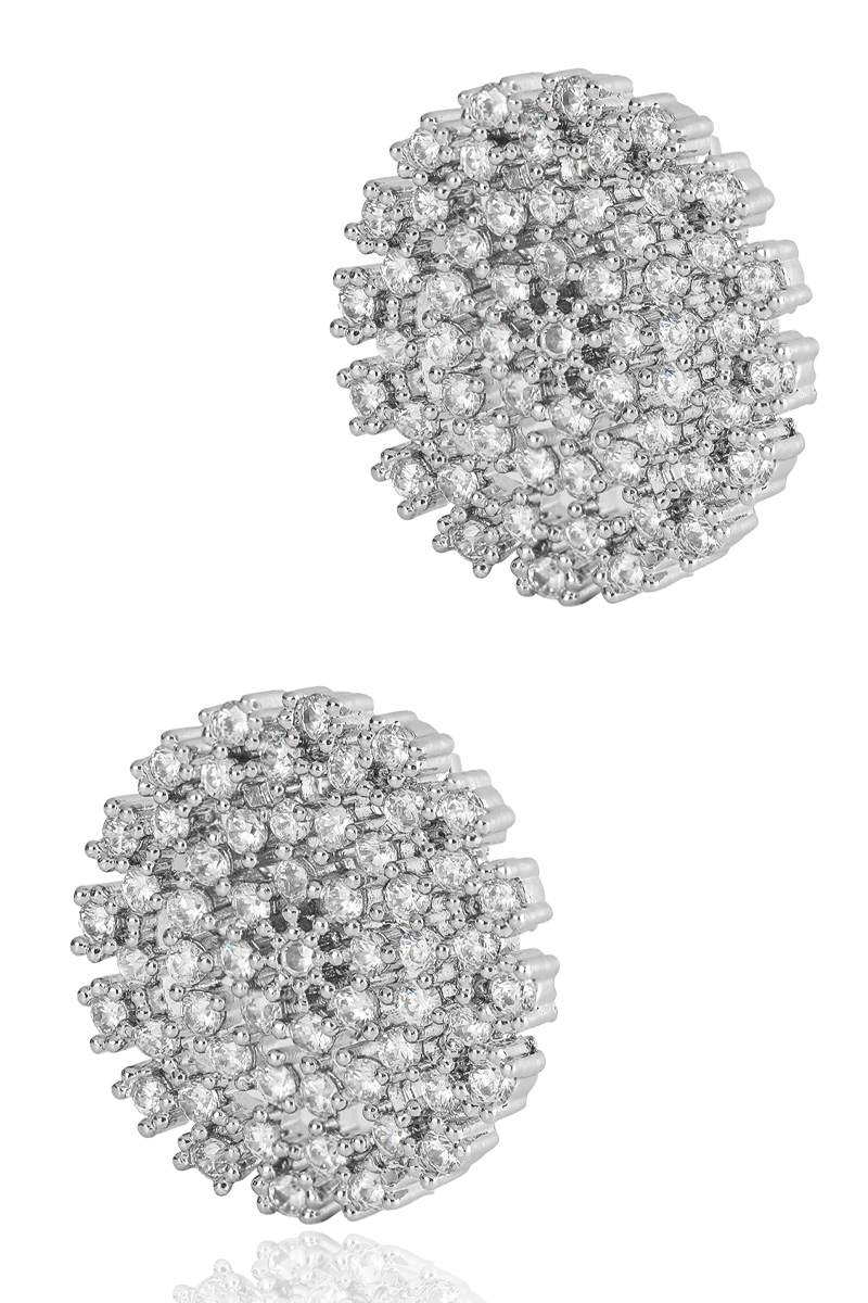 신주 본체에 지르코니아 큐빅을 방사형 파베 세팅한 지름 1cm 플랫 원판 이어링이에요. 침(포스트) 부분은 실버 925 소재로 제작되어 알러지 프리로 착용 가능하며, 화이트골드·로즈골드 두 가지 컬러로 구성되어 있어요. 큐빅은 두 컬러 공통으로 화이트 색상이라 계절 구분 없이 착용 가능하고, 귓볼에 자연스럽게 안착하며 하단이 가볍게 드롭되는 구조랍니다.