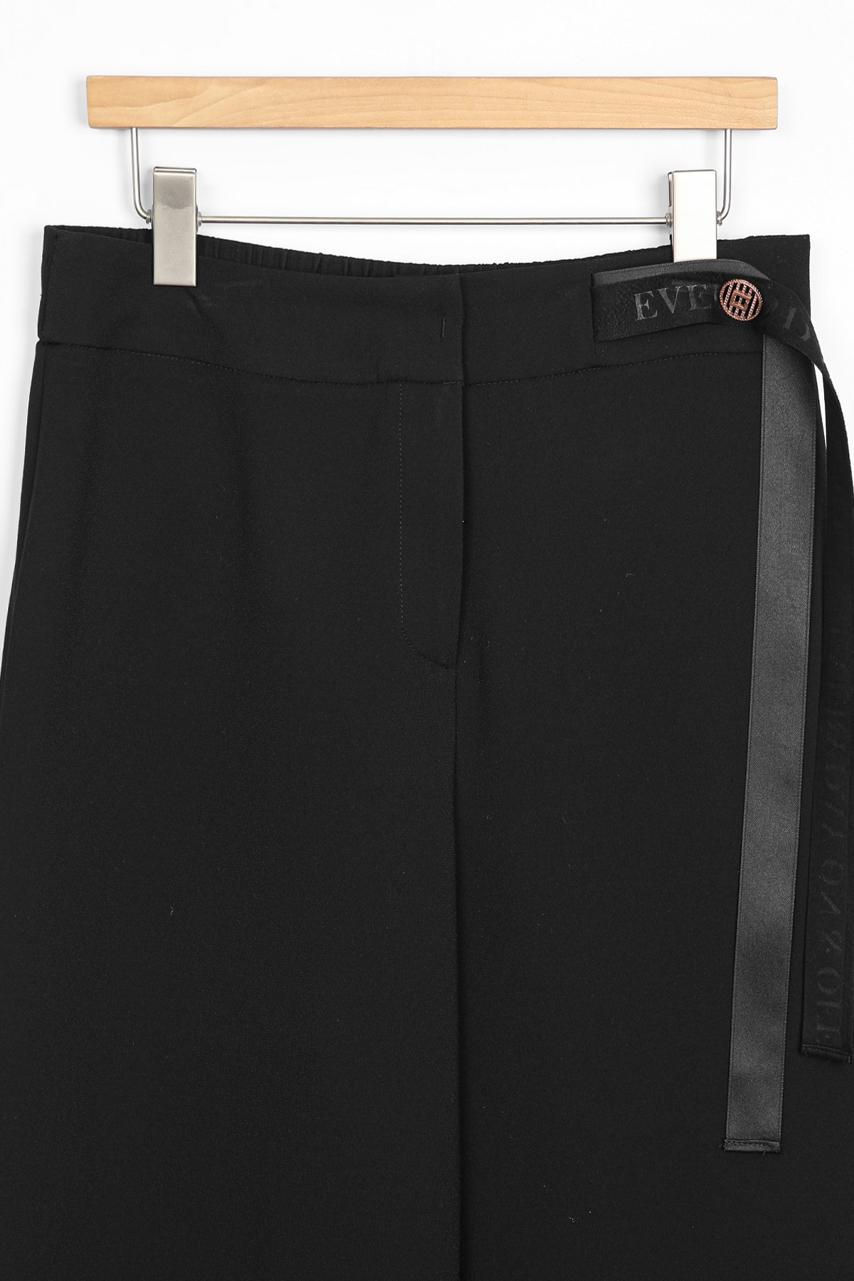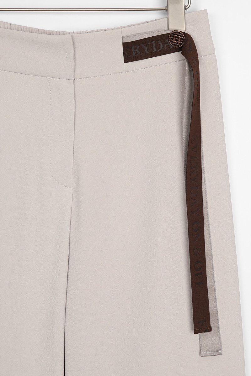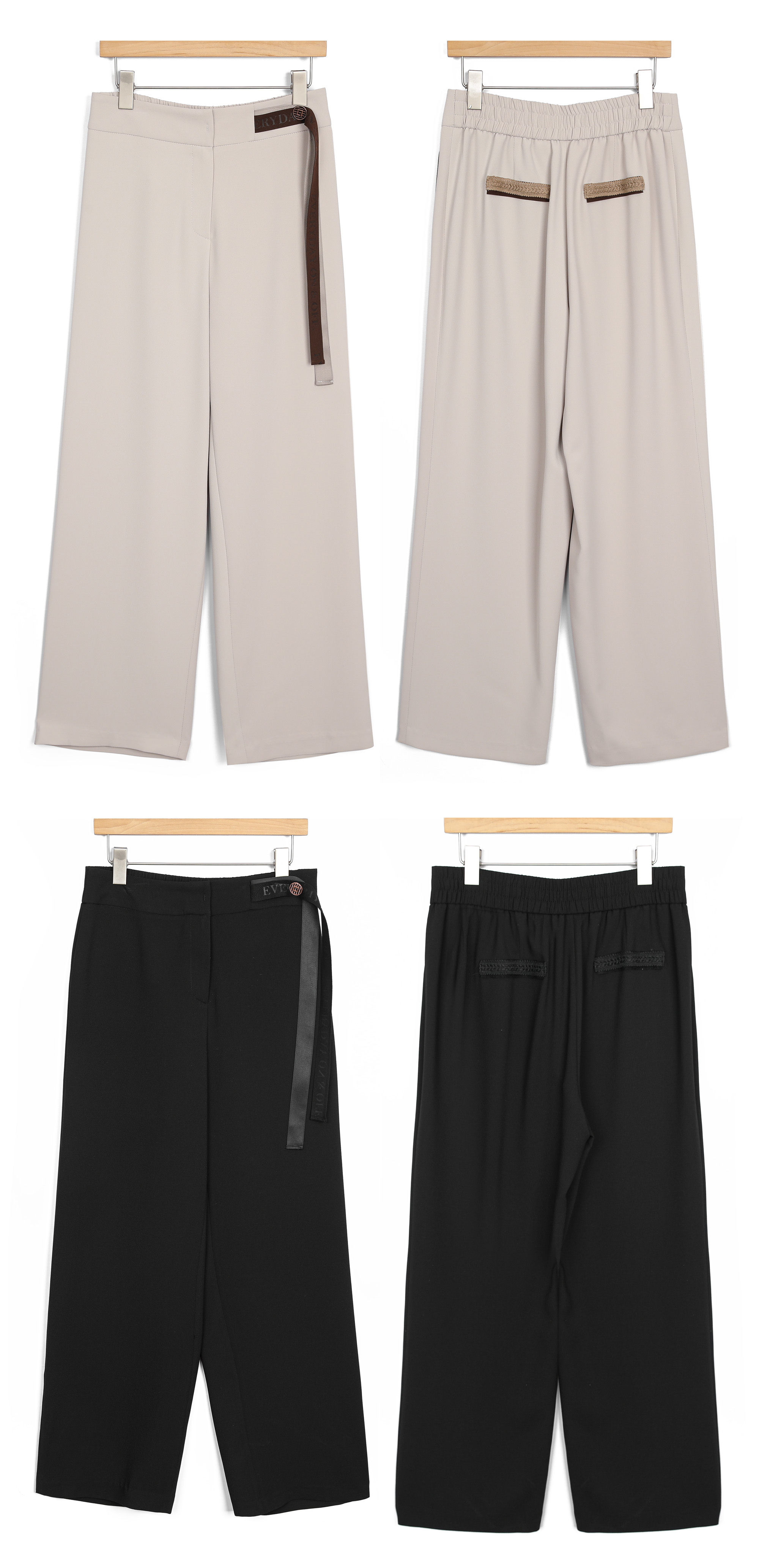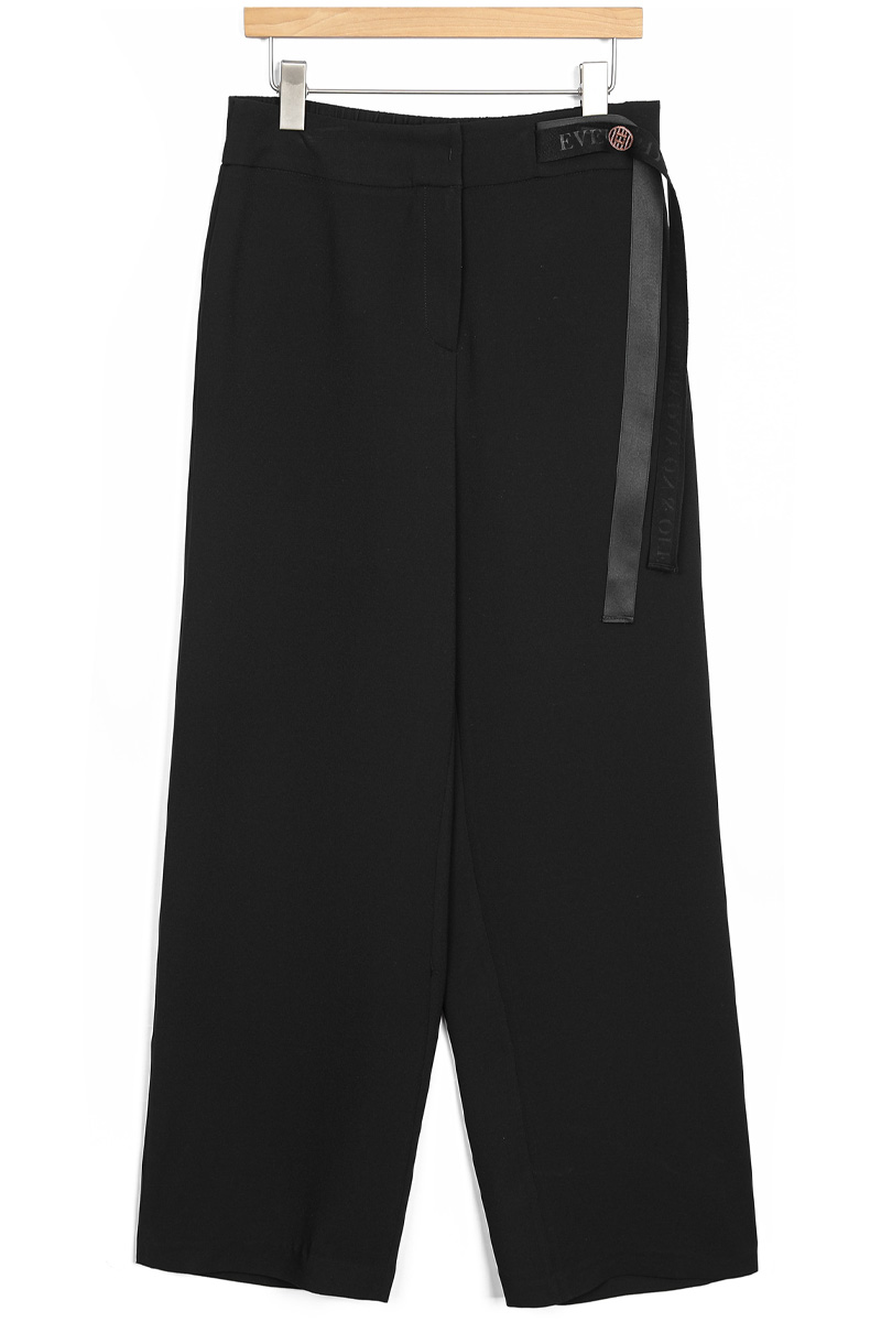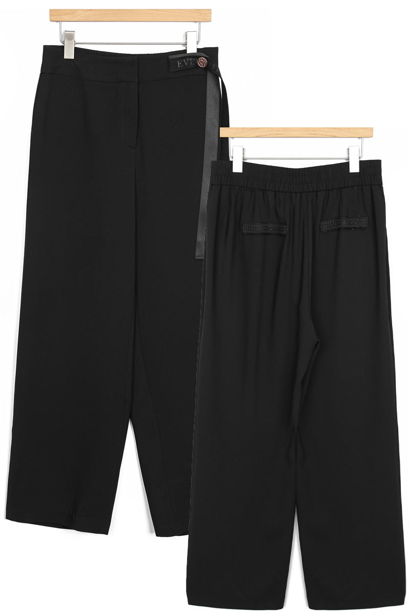 쫀득한 신축성이 돋보이는 최고급 수트 원단허리 디테일 레터링 리본 플랩 (고정형) 고무 전사 나염과 주물 장식으로 완성한 감각적인 허리 포인트 밴딩 시스템 5cm 와이드 고탄성 뒷밴드 두 줄 스티치로 변형을 막고 복부와 힙 라인을 탄탄하게 지지 실루엣 하이웨이스트 와이드 핏 하체 군살을 완벽 보정하며