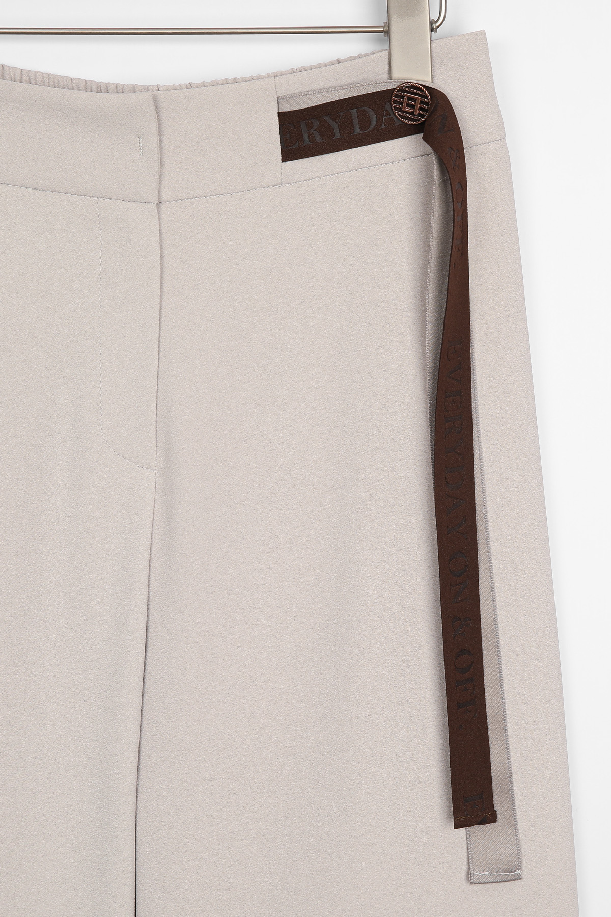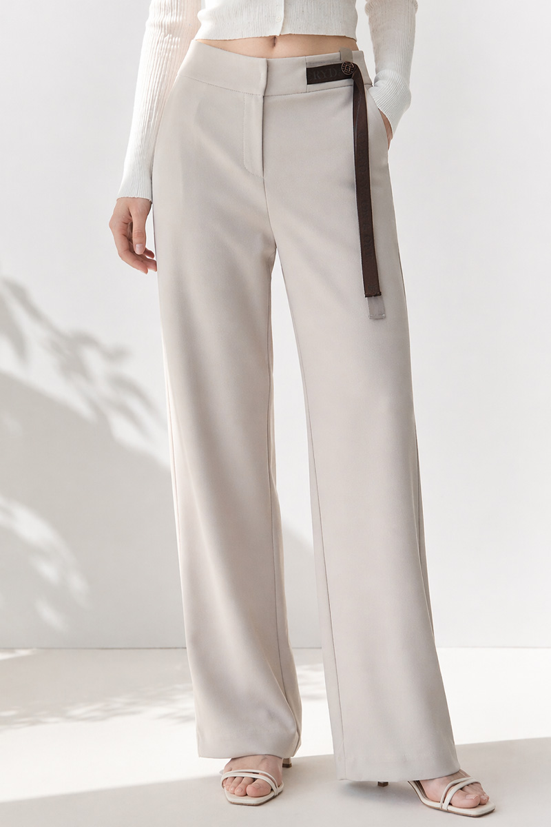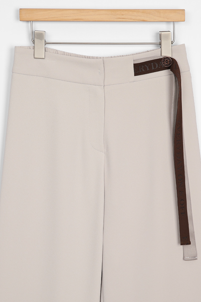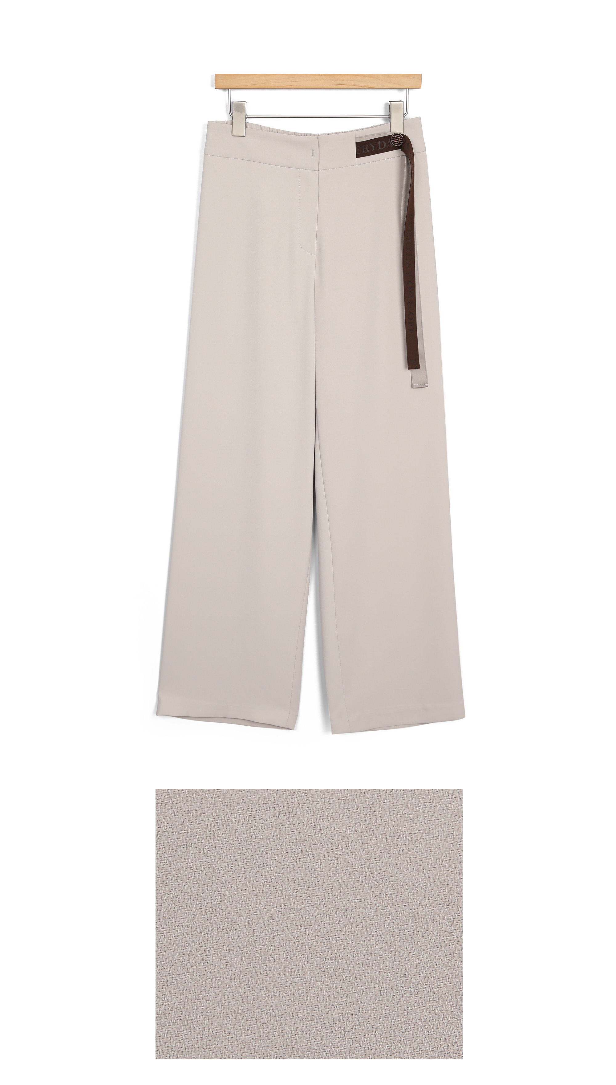 쫀득한 신축성이 돋보이는 최고급 수트 원단허리 디테일 레터링 리본 플랩 (고정형) 고무 전사 나염과 주물 장식으로 완성한 감각적인 허리 포인트 밴딩 시스템 5cm 와이드 고탄성 뒷밴드 두 줄 스티치로 변형을 막고 복부와 힙 라인을 탄탄하게 지지 실루엣 하이웨이스트 와이드 핏 하체 군살을 완벽 보정하며