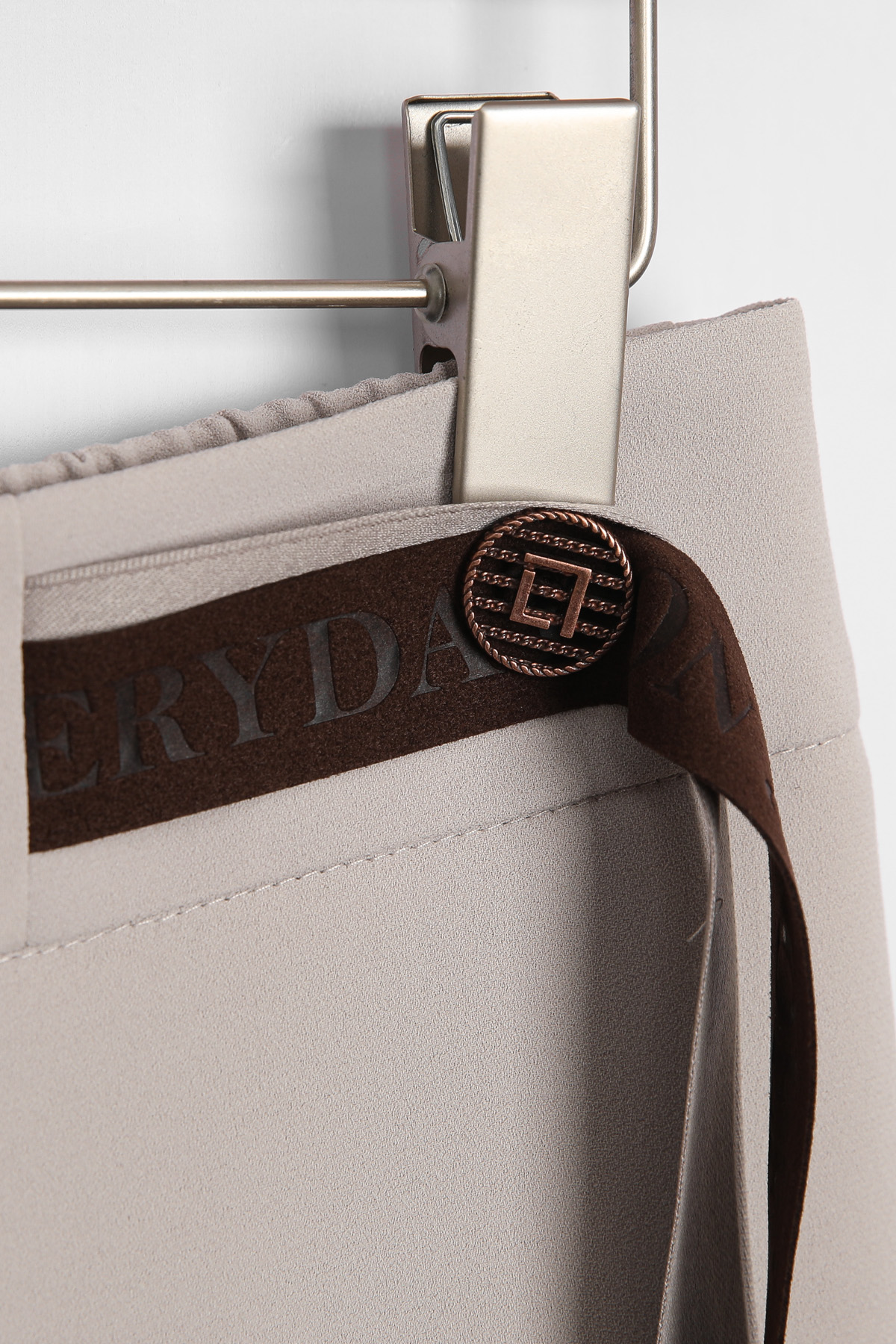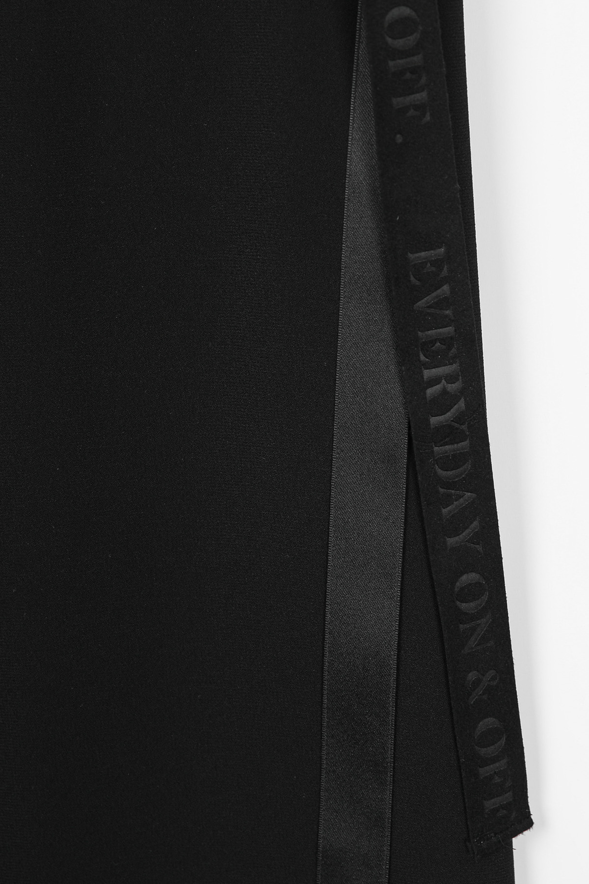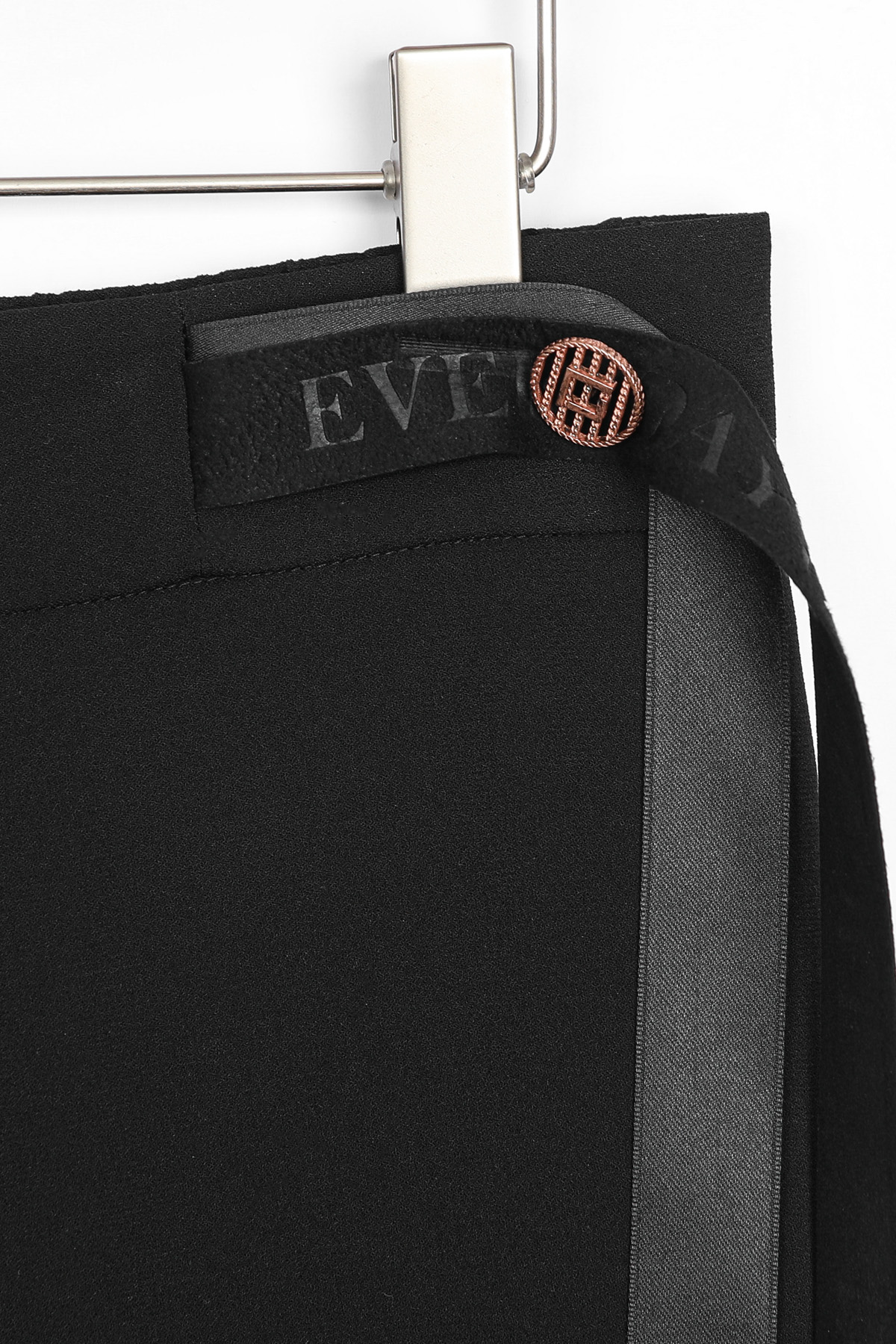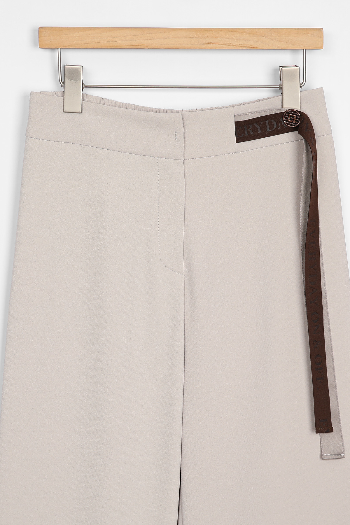 쫀득한 신축성이 돋보이는 최고급 수트 원단허리 디테일 레터링 리본 플랩 (고정형) 고무 전사 나염과 주물 장식으로 완성한 감각적인 허리 포인트 밴딩 시스템 5cm 와이드 고탄성 뒷밴드 두 줄 스티치로 변형을 막고 복부와 힙 라인을 탄탄하게 지지 실루엣 하이웨이스트 와이드 핏 하체 군살을 완벽 보정하며