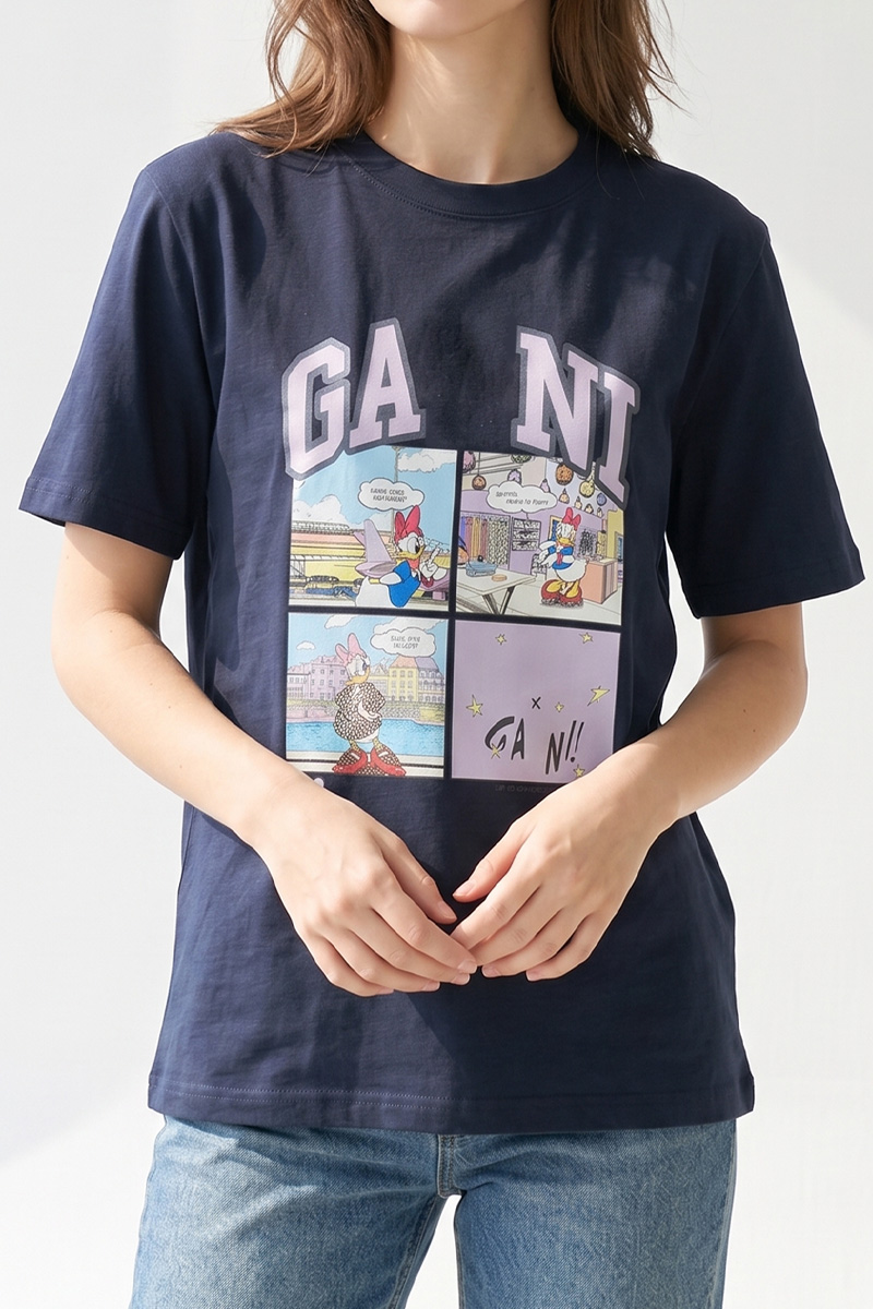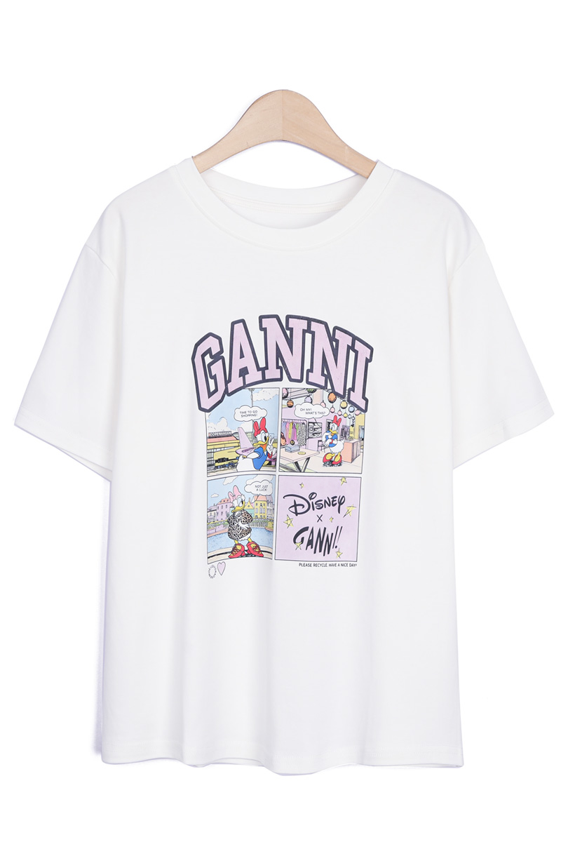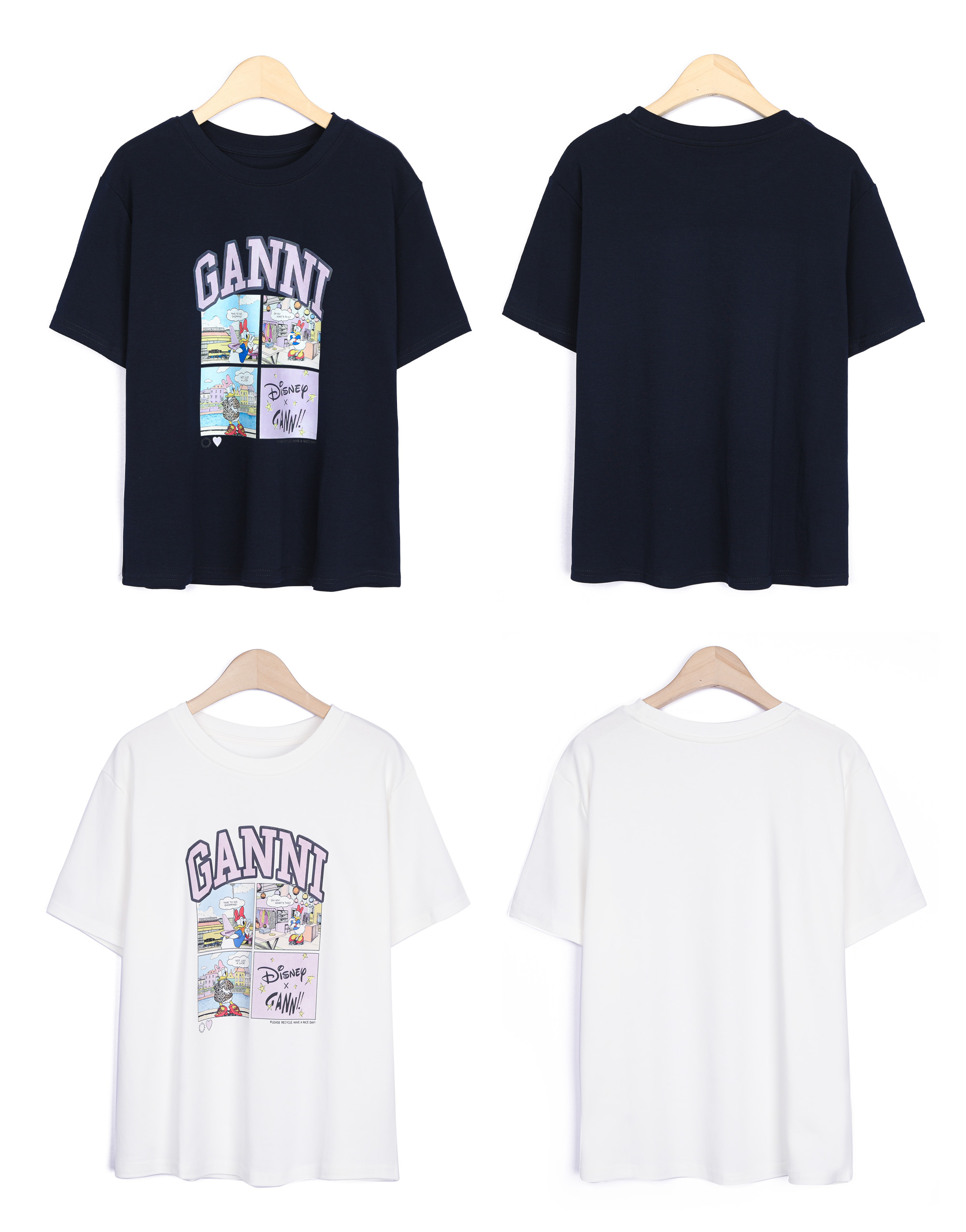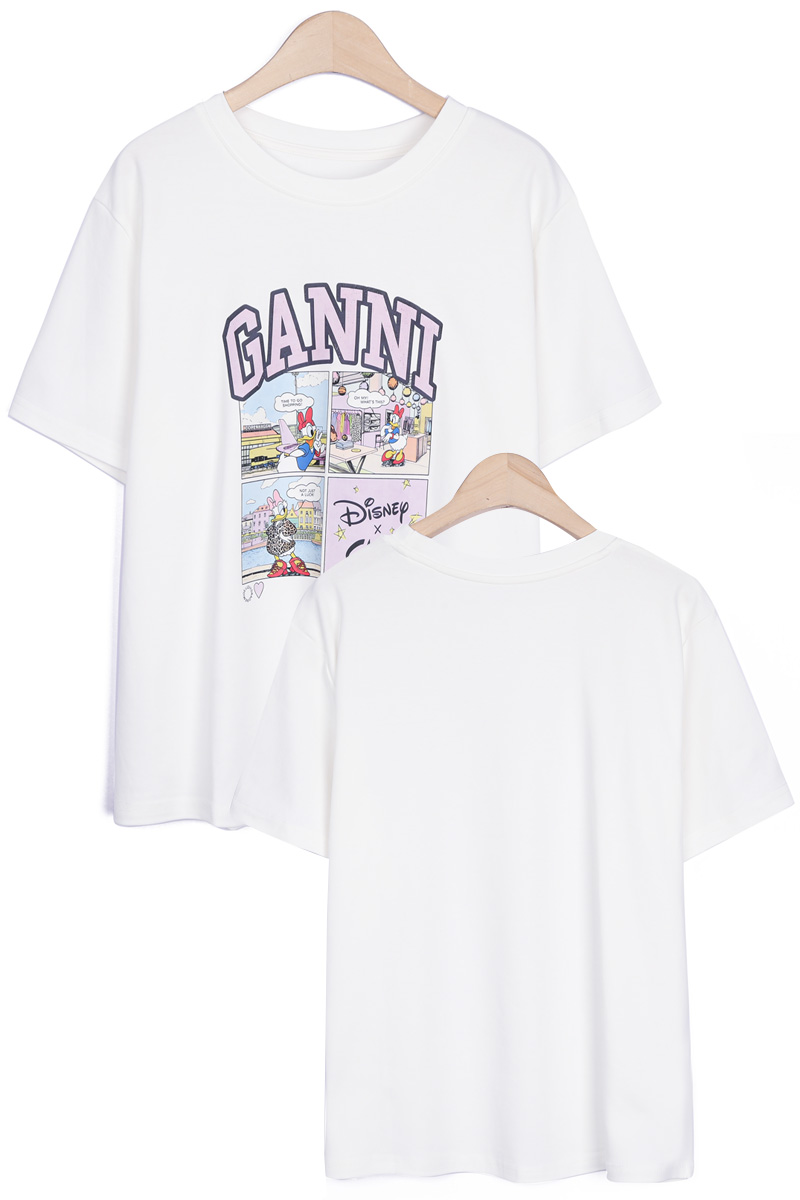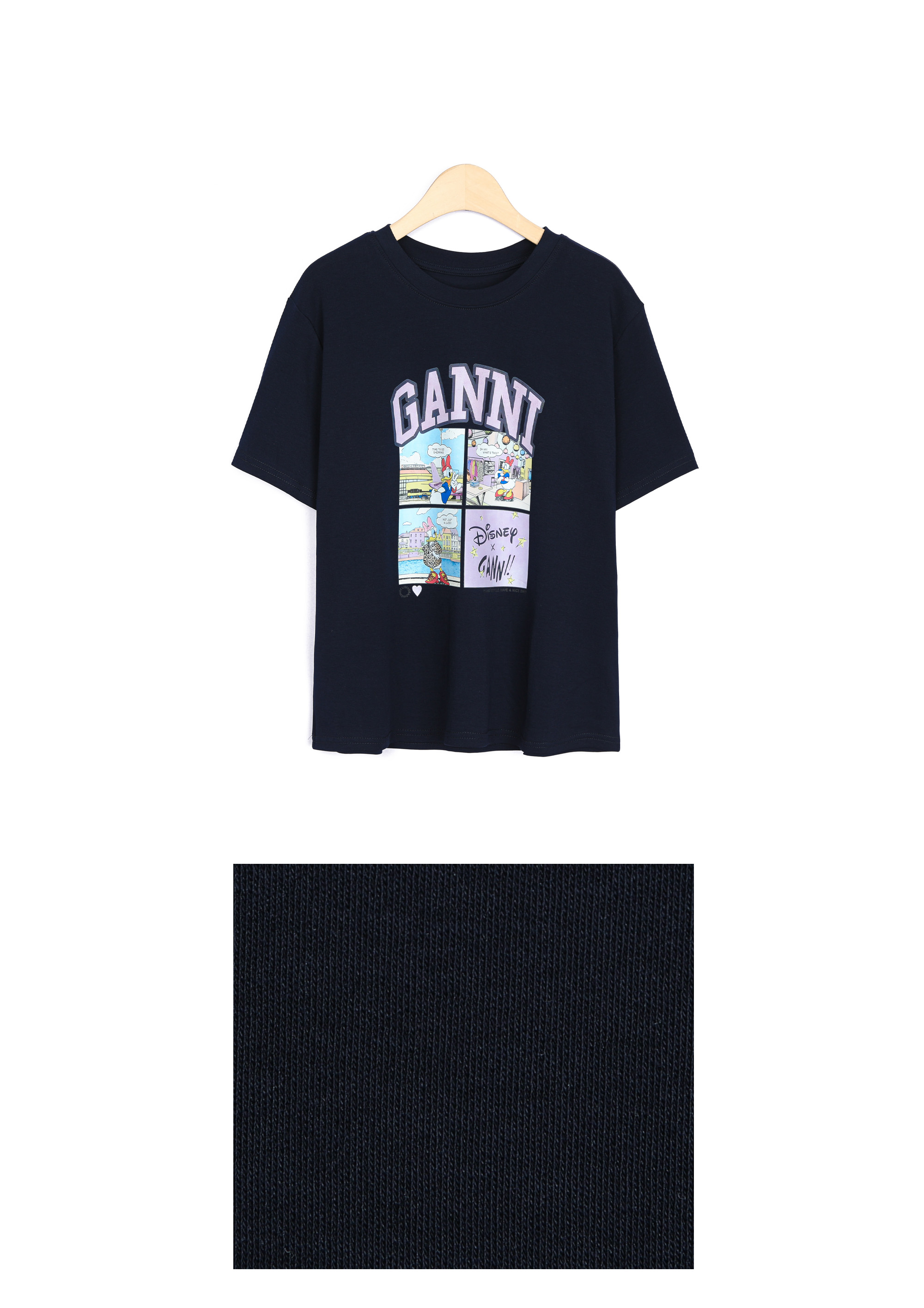 | 디자인 | 데이지 카툰 전사 나염 | 라벤더 톤의 아치형 레터링과 위트 있는 4컷 카툰의 조화 |