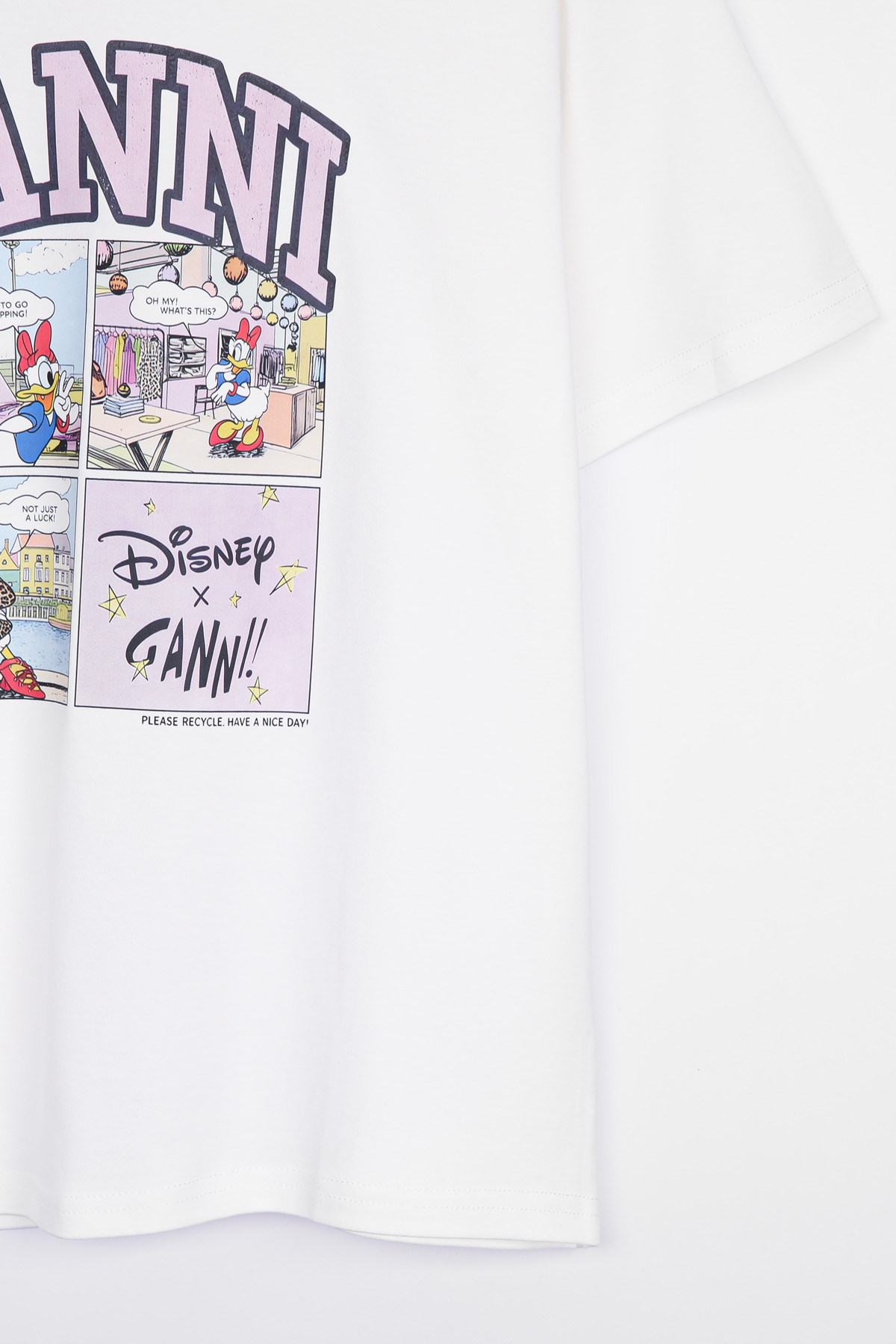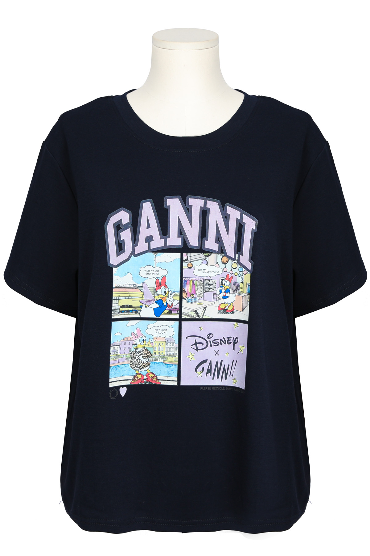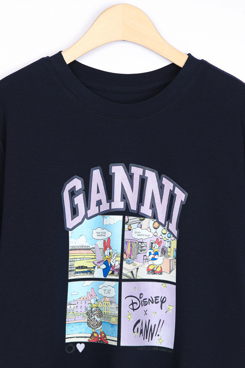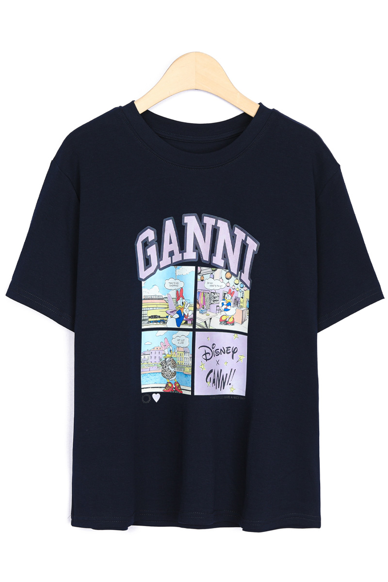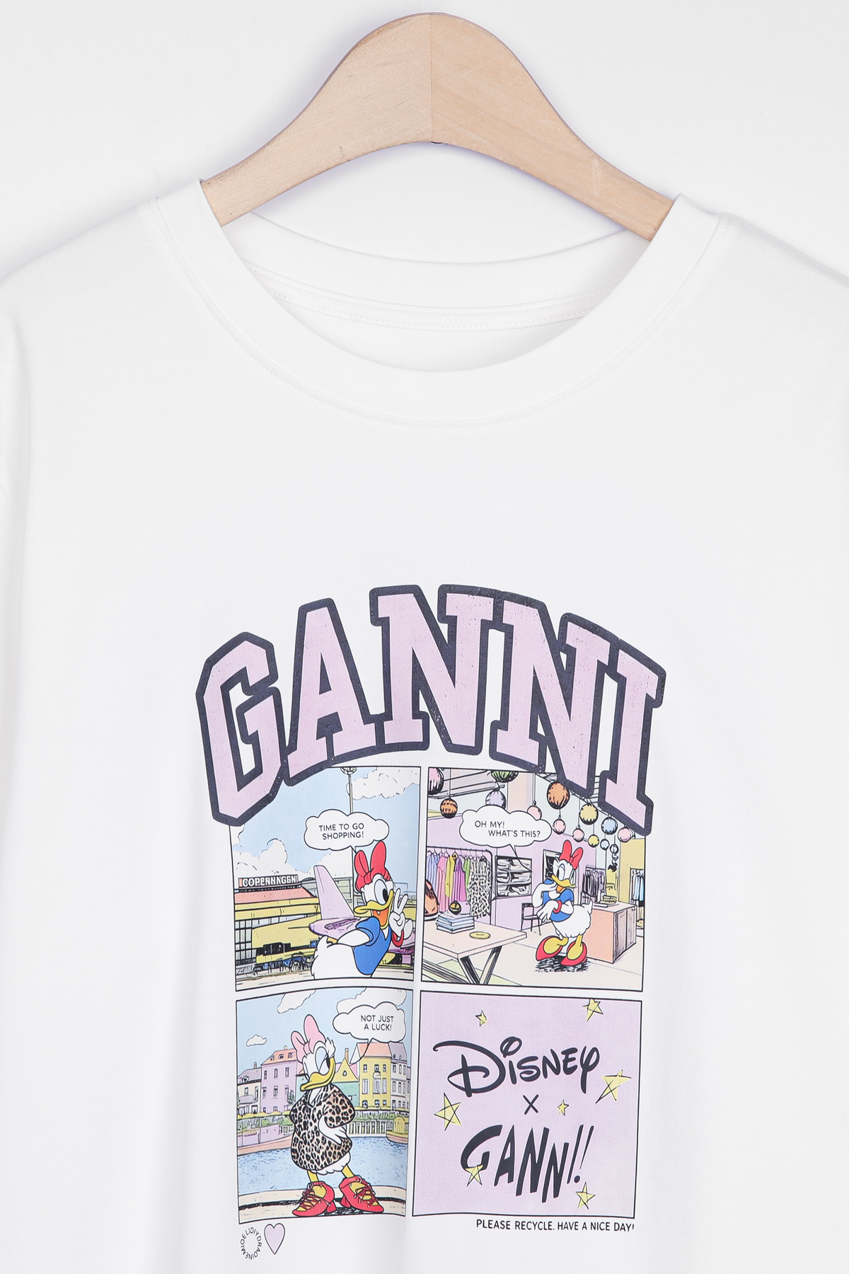 | 디자인 | 데이지 카툰 전사 나염 | 라벤더 톤의 아치형 레터링과 위트 있는 4컷 카툰의 조화 |