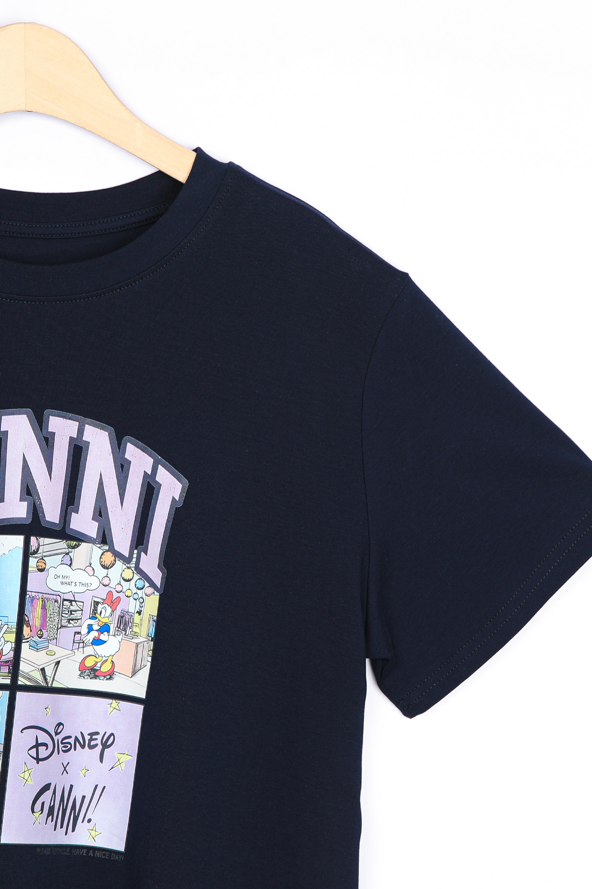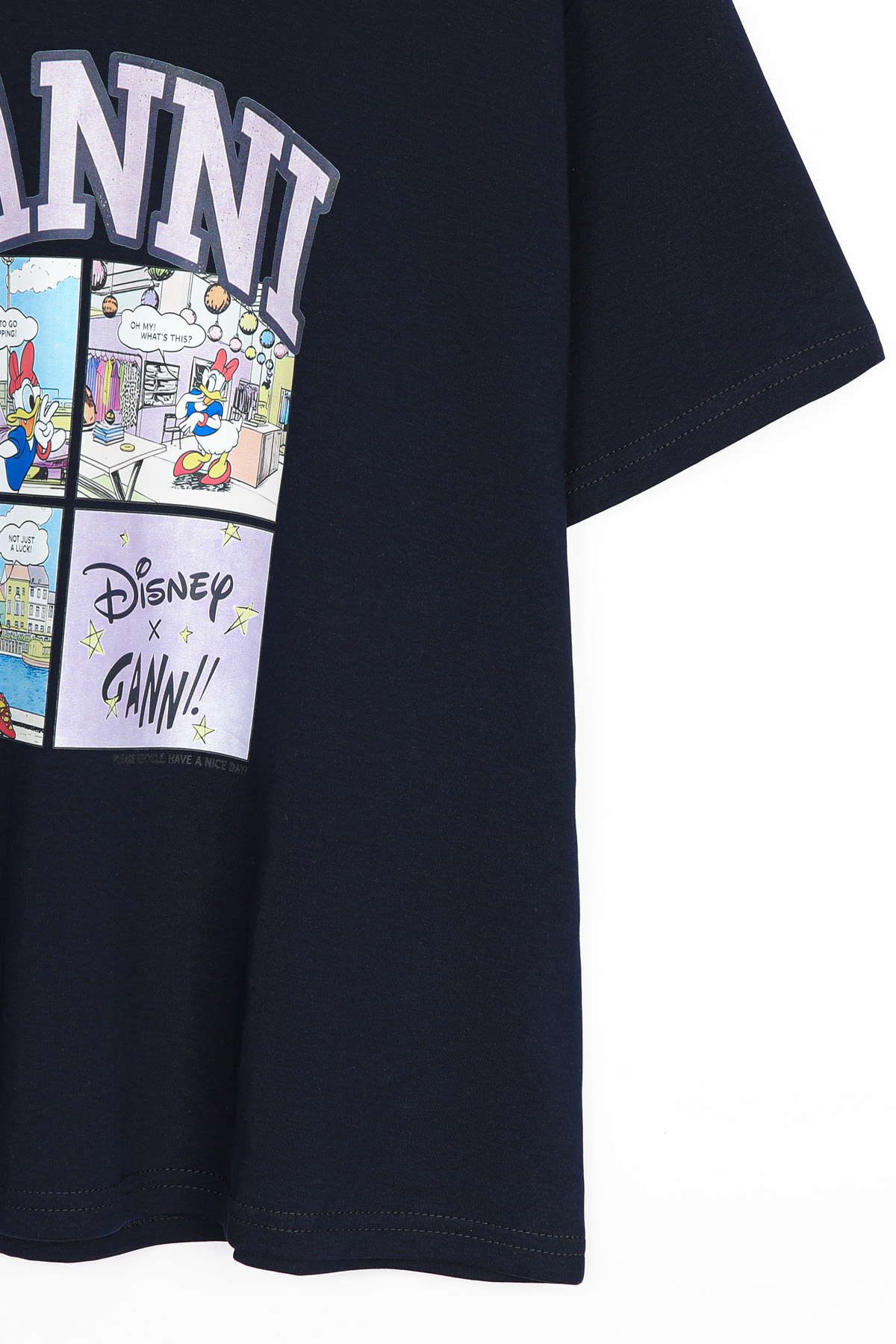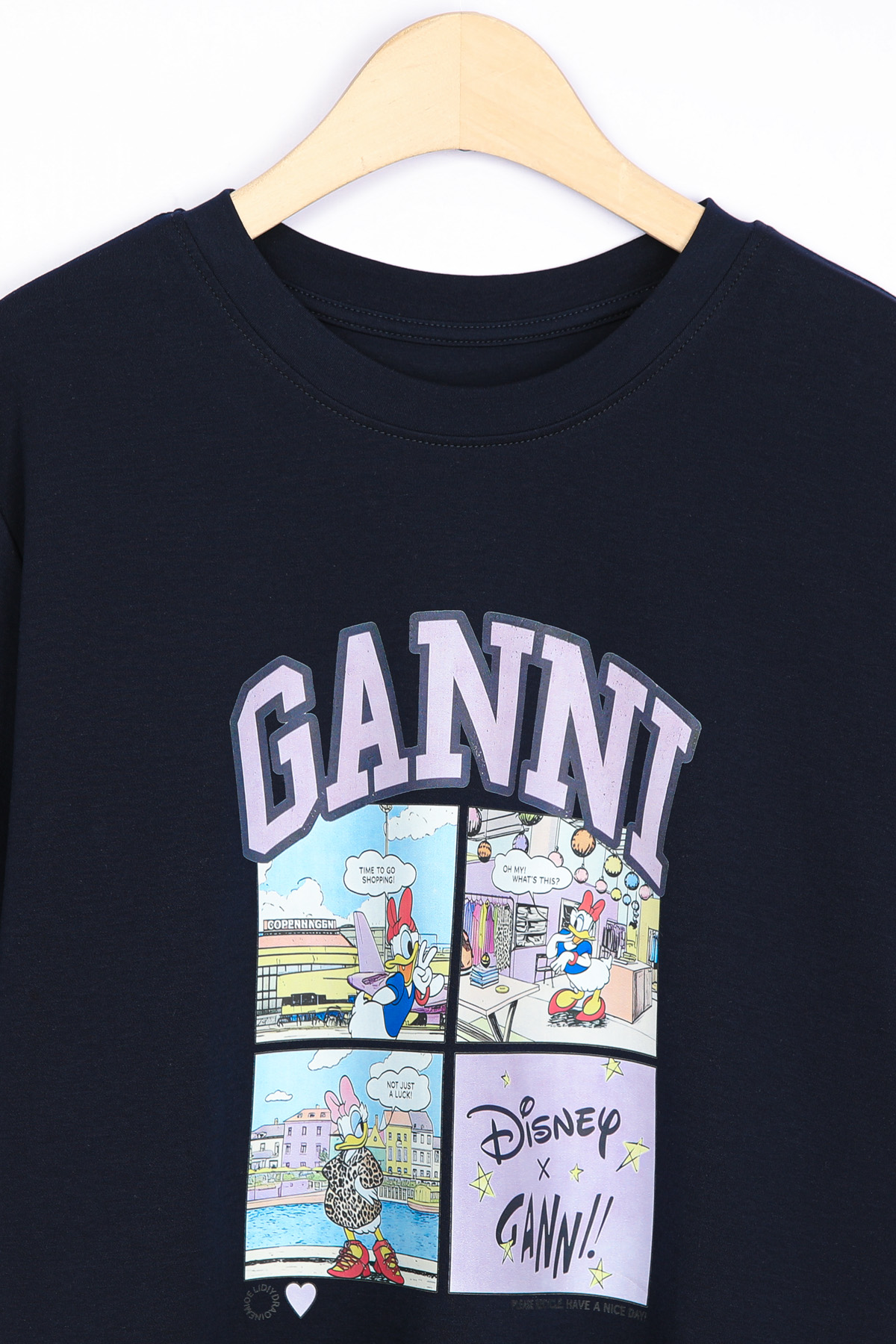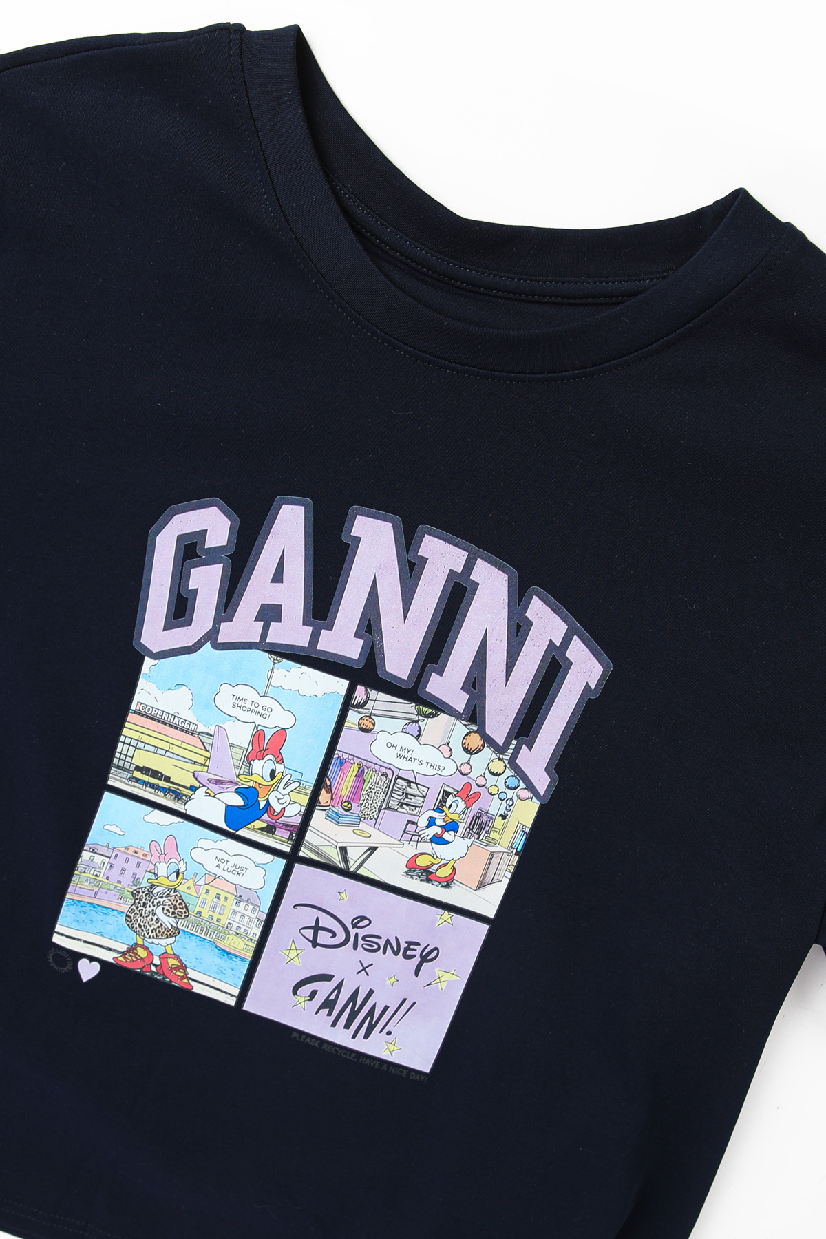 | 디자인 | 데이지 카툰 전사 나염 | 라벤더 톤의 아치형 레터링과 위트 있는 4컷 카툰의 조화 |