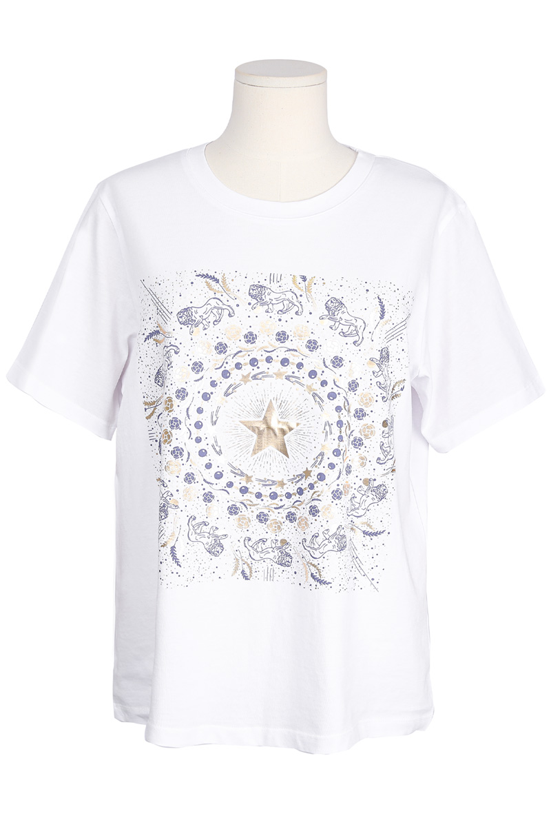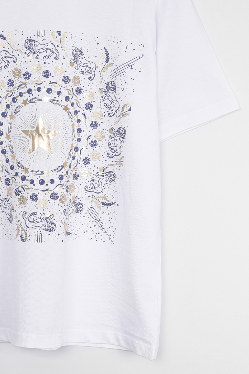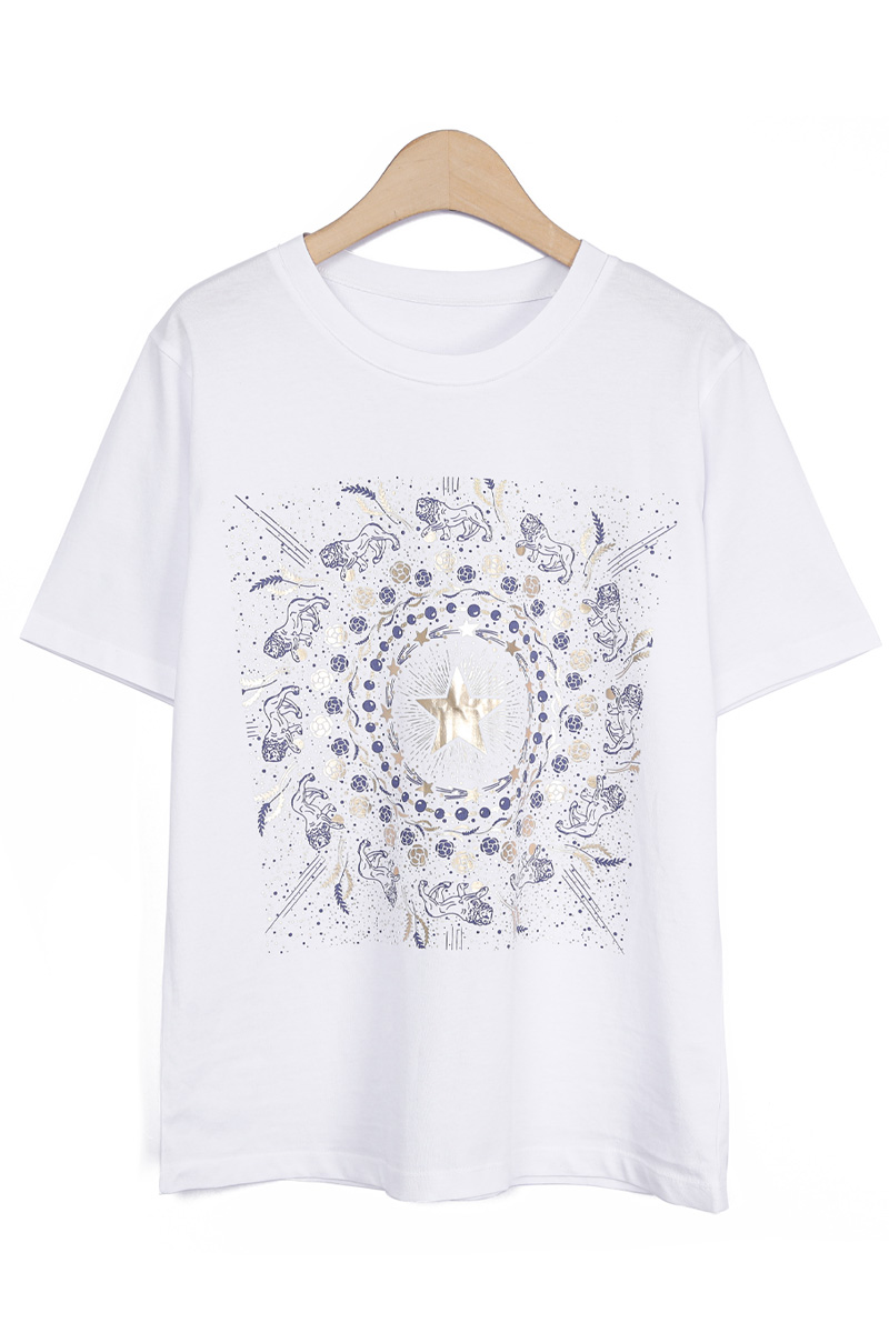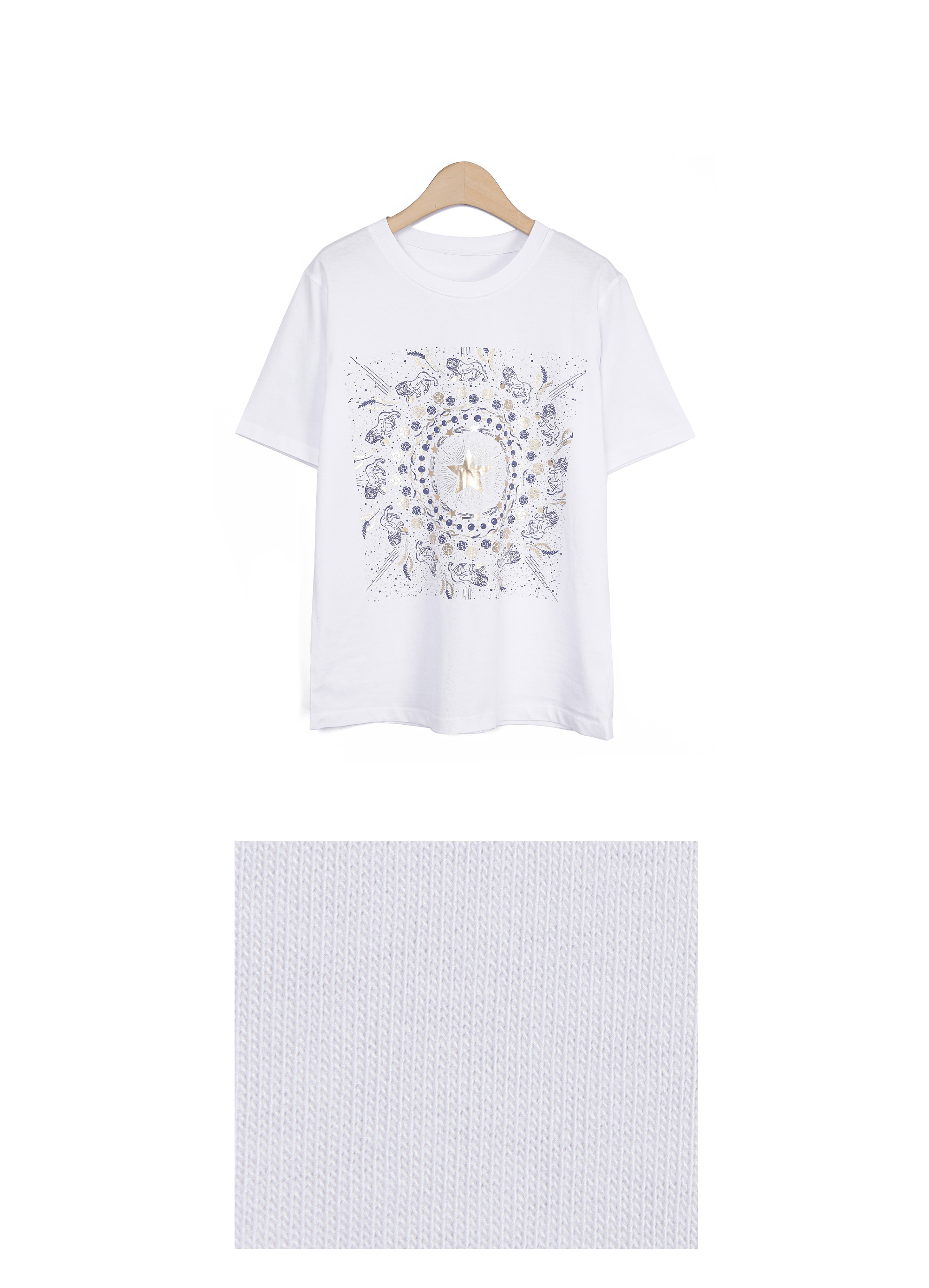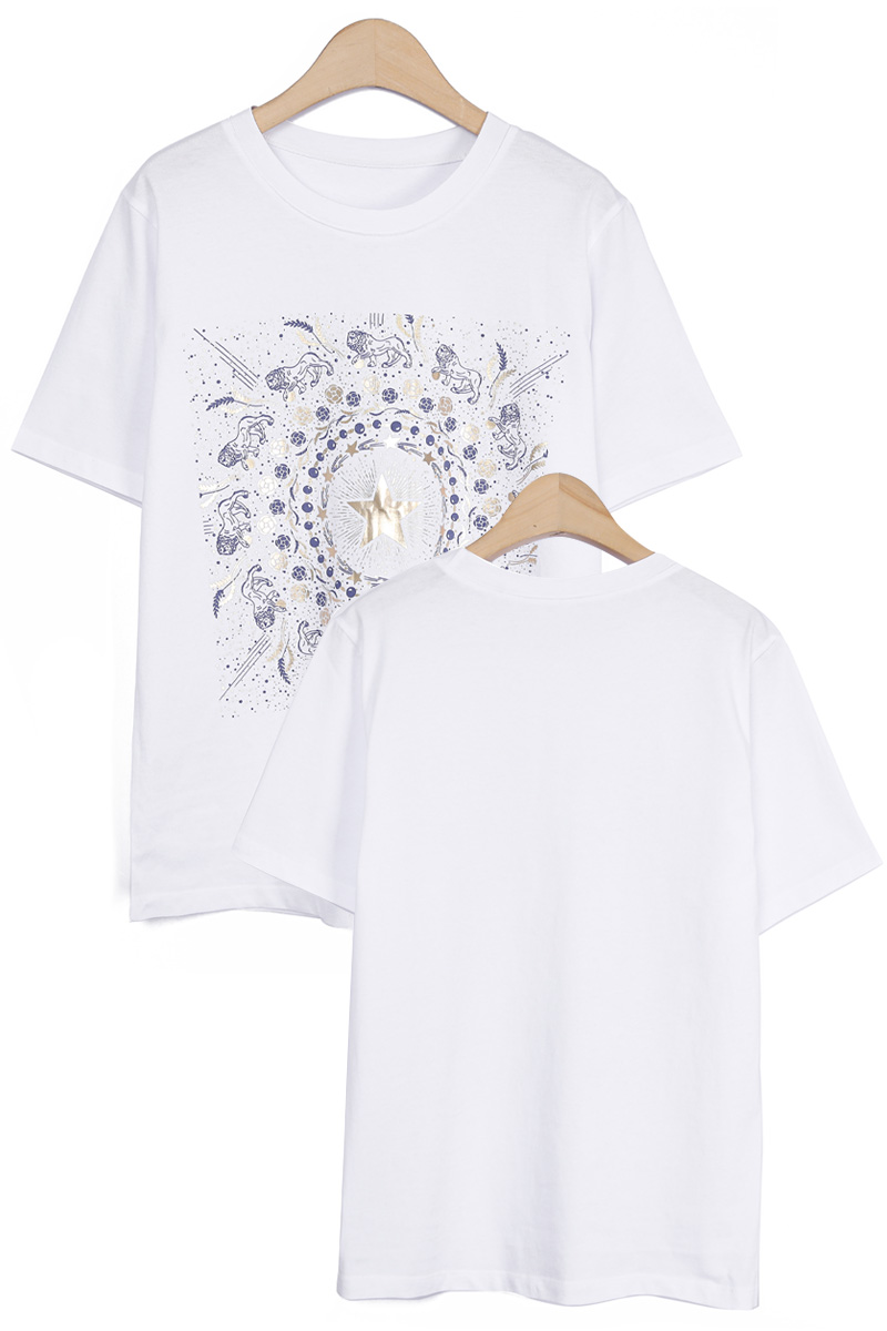 Summer Washing Gold-Star Pigment T-shirt 여름철 티셔츠는 무엇보다 피부에 닿는 촉감이 중요하기에, 통기성과 흡습성이 뛰어난 썸머 워싱 면 소재를 선택했어요. 여름용 워싱 공정을 거친 면 100% 소재로 제작해서, 한여름 무더위 속에서도 피부에 달라붙지 않는 보들보들하고 선선한 기운을 느끼실 수 있을거예요. 원단 자체가 지닌 고유의 쾌적함 덕분에 땀이 나는 날에도 산뜻함을 유지해 주어, 소재감에 민감한 회원님들께도 자신 있게 추천해 드릴 수 있는 아이템이에요. 목선과 쇄골선을 가볍게 덮어주는 기본 라운드넥 디자인으로 제작했어요. 너무 깊지 않은 넥라인이 얼굴선을 깨끗하게 정돈해 주며, 기본형 어깨선이 상체 프레임을 깔끔하게 잡아준답니다. 어깨부터 팔뚝 상단까지는 적당히 라인을 잡아 날씬해 보이게 하고, 그 아래로는 여유 있게 빠지는 구조라 전체적인 실루엣이 무척 정갈해 보여요. 전면 프린팅은 두 가지 형태로 설계했어요. 중심의 금박 스타와 가장자리 둥근 금박 장식은 전사 나염으로 처리해 화려한 광택을 주었고, 태양계를 닮은 원형 문양과 가장자리의 라이언 패턴은 원단 자체에 색을 입힌 날염 형태로 제작했답니다. 이 두 가지 기법이 맞물리면서 평범한 티셔츠에서는 볼 수 없는 깊이 있는 디테일이 완성되어요. :) 밝은 화이트 색상이지만, 전면을 넉넉하게 채운 블루 나염과 금박 장식 덕분에 비침 걱정을 덜 수 있었어요. 특히 중앙 골드 스타 프린팅이 가슴골을 안정적으로 가려주는 구조라, 얇은 여름 기본티임에도 별도의 이너 슬리브리스를 챙겨 입어야 하는 번거로움 없이 단독으로 착용하기에 충분했답니다. 면 100% 소재임에도 원단 자체가 탱글한 신축성을 머금고 있어요. 원단에 적당한 탄성이 느껴져서 입고 벗을 때 목선에 화장품이 묻어날 염려 없이 편안하게 착용할 수 있었답니다. MD 실제 피팅 실루엣: 키 165cm, 어깨 넓은 66(살집 66) 기준, 몸선을 예쁘게 잡아주는 세미 슬림 레귤러 핏 바디 라인: 바스트 C컵 기준으로 가슴선은 여성스럽게 살려주면서도, 허리부터 밑단까지는 조임 없는 일자 핏으로 떨어져 밑배 라인이 전혀 부담스럽지 않았답니다. 소매 & 기장: 팔꿈치 위 3부까지 내려오는 슬리브 라인은 팔뚝 군살을 효과적으로 커버해 주며, 밑배를 가볍게 덮는 산뜻한 기장감 덕분에 하의 코디하기 수월했어요. 단순한 기본 티셔츠를 넘어, 소재의 쾌적함과 프린팅의 조화가 주는 실제적인 만족감이 큰 아이템. 블루와 골드가 만드는 청량한 배색과 체형을 예쁘게 보정해 주는 레귤러 핏의 조화가 데일리 룩에 한 끗 마무리를 해드릴 거예요. 시간이 지나도 무너지지 않는 소재의 정갈함과 세련된 나염 포인트로, 이번 여름 가장 자신 있는 반팔 핏을 완성해 보셔요. :)