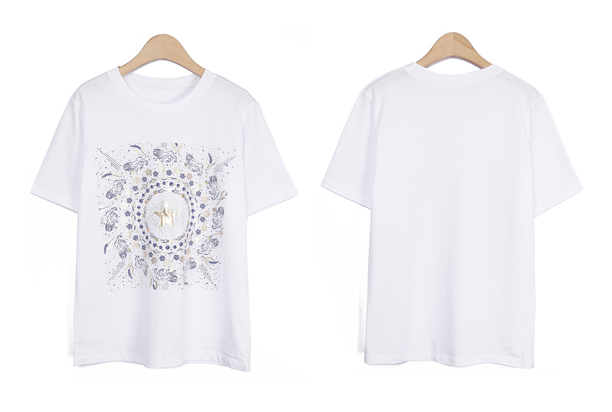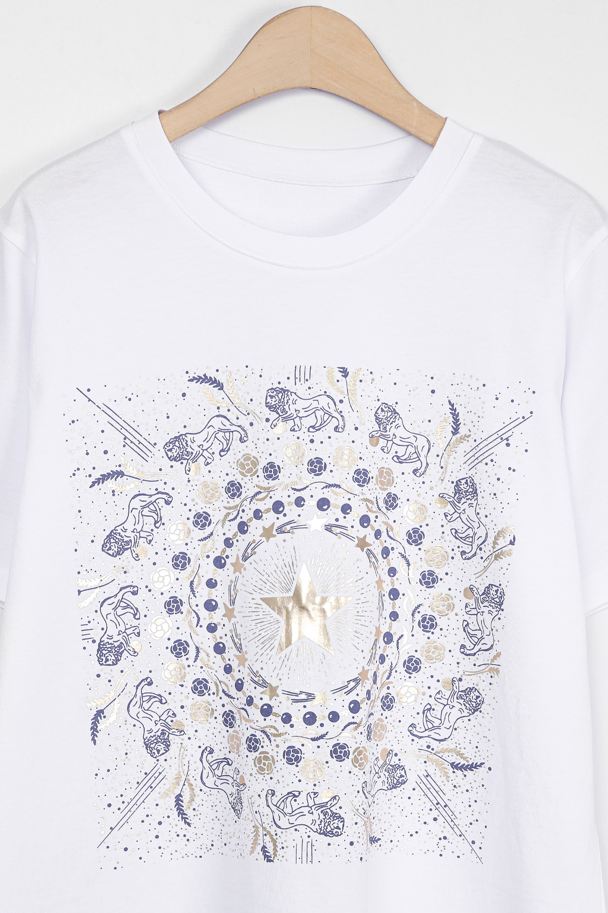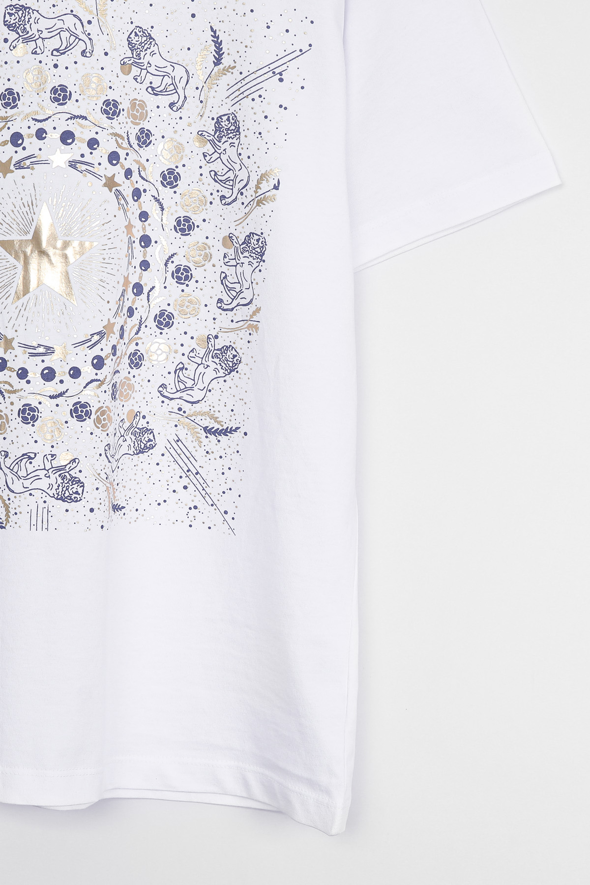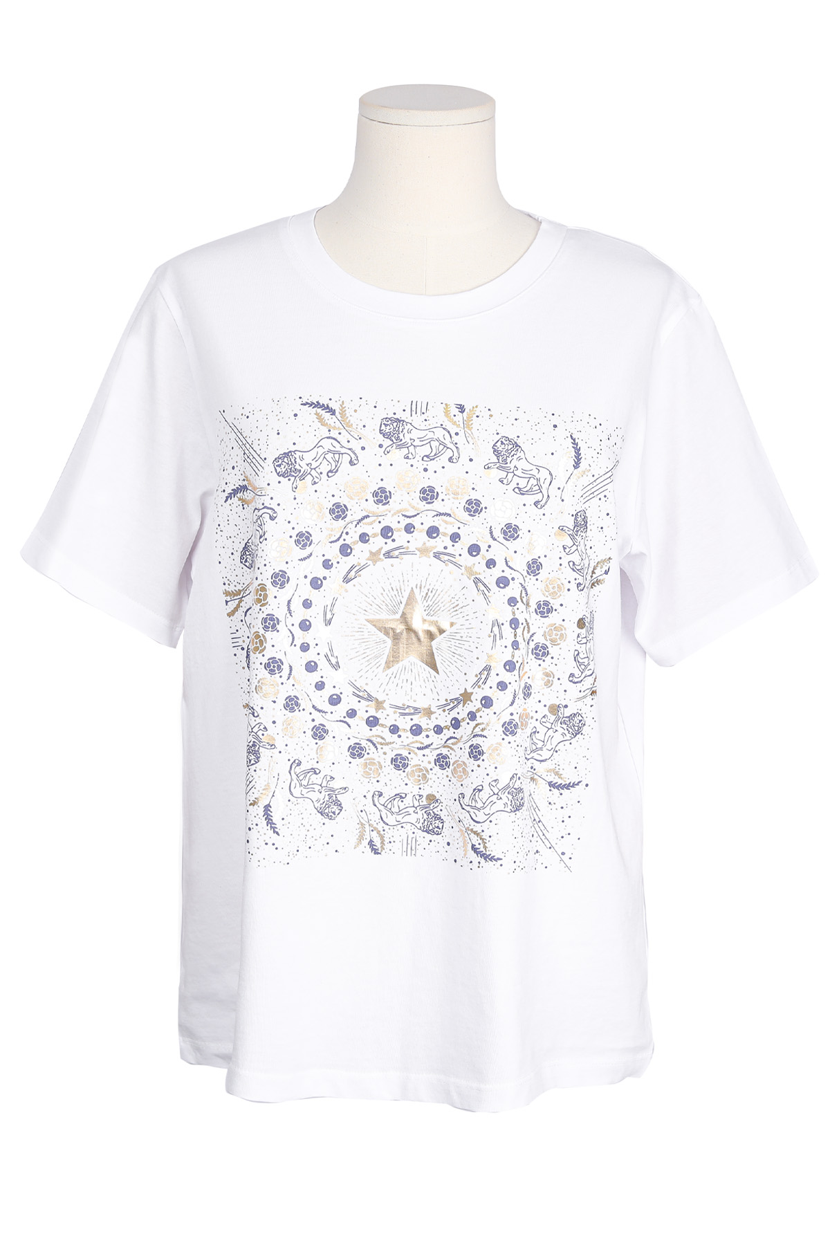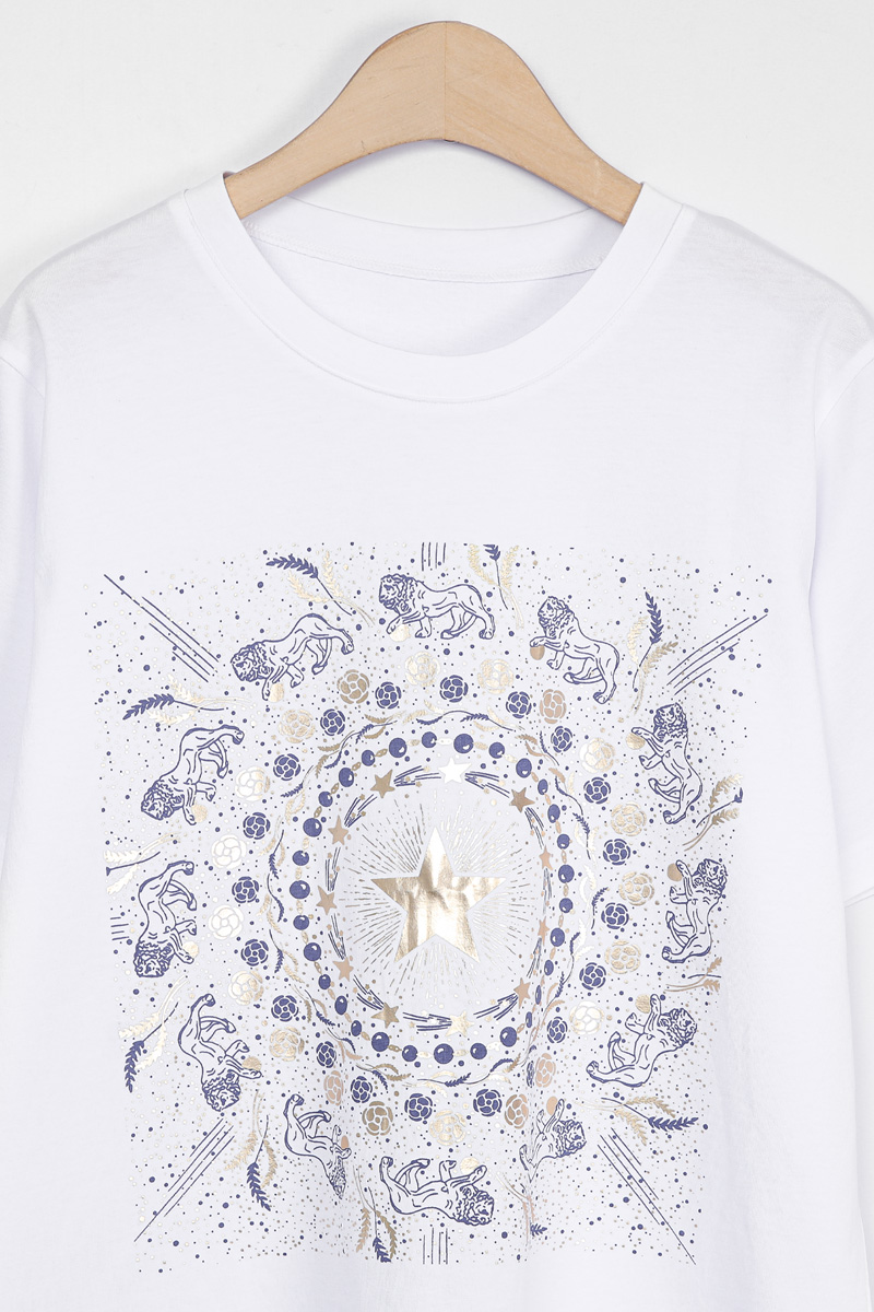 Summer Washing Gold-Star Pigment T-shirt 여름철 티셔츠는 무엇보다 피부에 닿는 촉감이 중요하기에, 통기성과 흡습성이 뛰어난 썸머 워싱 면 소재를 선택했어요. 여름용 워싱 공정을 거친 면 100% 소재로 제작해서, 한여름 무더위 속에서도 피부에 달라붙지 않는 보들보들하고 선선한 기운을 느끼실 수 있을거예요. 원단 자체가 지닌 고유의 쾌적함 덕분에 땀이 나는 날에도 산뜻함을 유지해 주어, 소재감에 민감한 회원님들께도 자신 있게 추천해 드릴 수 있는 아이템이에요. 목선과 쇄골선을 가볍게 덮어주는 기본 라운드넥 디자인으로 제작했어요. 너무 깊지 않은 넥라인이 얼굴선을 깨끗하게 정돈해 주며, 기본형 어깨선이 상체 프레임을 깔끔하게 잡아준답니다. 어깨부터 팔뚝 상단까지는 적당히 라인을 잡아 날씬해 보이게 하고, 그 아래로는 여유 있게 빠지는 구조라 전체적인 실루엣이 무척 정갈해 보여요. 전면 프린팅은 두 가지 형태로 설계했어요. 중심의 금박 스타와 가장자리 둥근 금박 장식은 전사 나염으로 처리해 화려한 광택을 주었고, 태양계를 닮은 원형 문양과 가장자리의 라이언 패턴은 원단 자체에 색을 입힌 날염 형태로 제작했답니다. 이 두 가지 기법이 맞물리면서 평범한 티셔츠에서는 볼 수 없는 깊이 있는 디테일이 완성되어요. :) 밝은 화이트 색상이지만, 전면을 넉넉하게 채운 블루 나염과 금박 장식 덕분에 비침 걱정을 덜 수 있었어요. 특히 중앙 골드 스타 프린팅이 가슴골을 안정적으로 가려주는 구조라, 얇은 여름 기본티임에도 별도의 이너 슬리브리스를 챙겨 입어야 하는 번거로움 없이 단독으로 착용하기에 충분했답니다. 면 100% 소재임에도 원단 자체가 탱글한 신축성을 머금고 있어요. 원단에 적당한 탄성이 느껴져서 입고 벗을 때 목선에 화장품이 묻어날 염려 없이 편안하게 착용할 수 있었답니다. MD 실제 피팅 실루엣: 키 165cm, 어깨 넓은 66(살집 66) 기준, 몸선을 예쁘게 잡아주는 세미 슬림 레귤러 핏 바디 라인: 바스트 C컵 기준으로 가슴선은 여성스럽게 살려주면서도, 허리부터 밑단까지는 조임 없는 일자 핏으로 떨어져 밑배 라인이 전혀 부담스럽지 않았답니다. 소매 & 기장: 팔꿈치 위 3부까지 내려오는 슬리브 라인은 팔뚝 군살을 효과적으로 커버해 주며, 밑배를 가볍게 덮는 산뜻한 기장감 덕분에 하의 코디하기 수월했어요. 단순한 기본 티셔츠를 넘어, 소재의 쾌적함과 프린팅의 조화가 주는 실제적인 만족감이 큰 아이템. 블루와 골드가 만드는 청량한 배색과 체형을 예쁘게 보정해 주는 레귤러 핏의 조화가 데일리 룩에 한 끗 마무리를 해드릴 거예요. 시간이 지나도 무너지지 않는 소재의 정갈함과 세련된 나염 포인트로, 이번 여름 가장 자신 있는 반팔 핏을 완성해 보셔요. :)