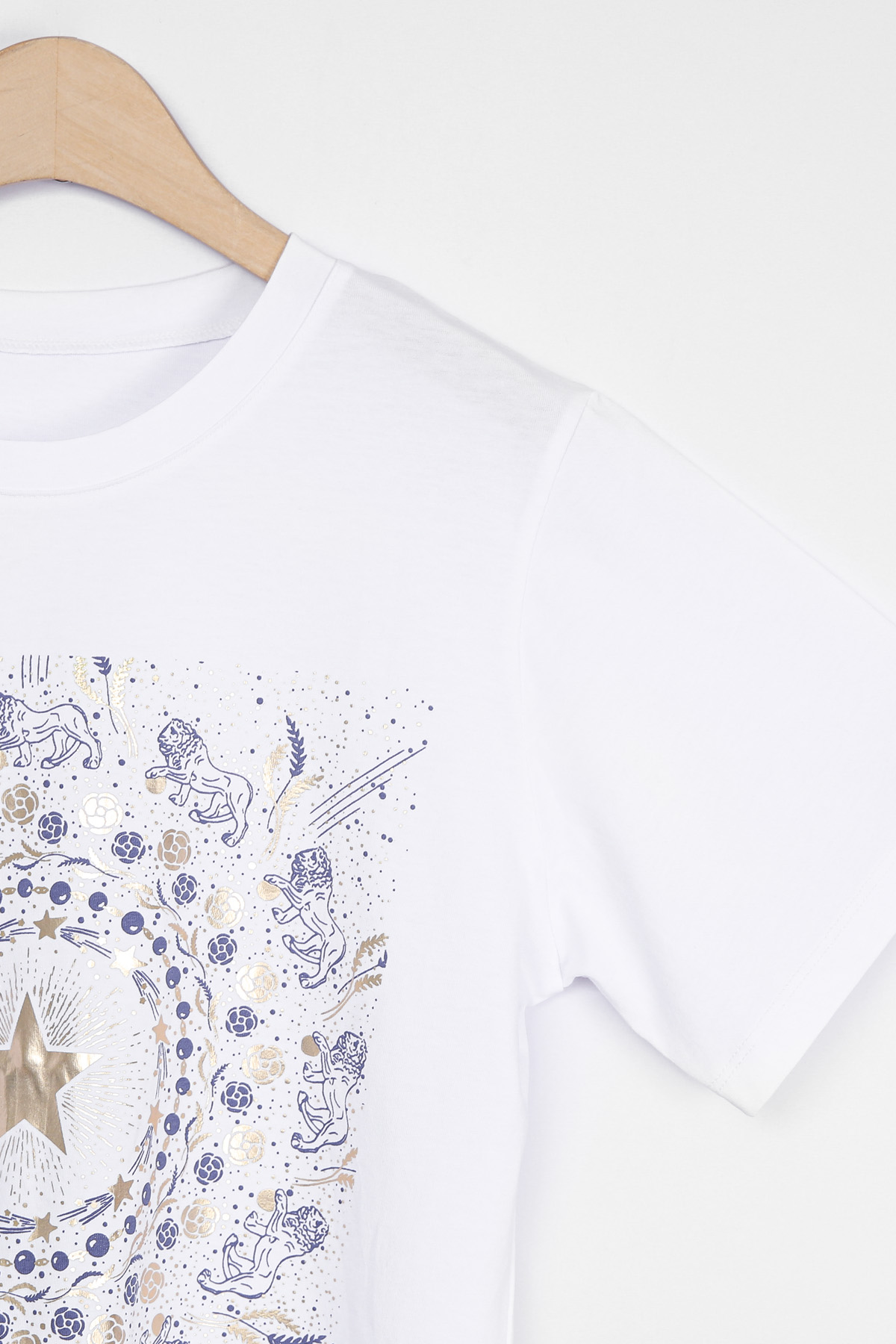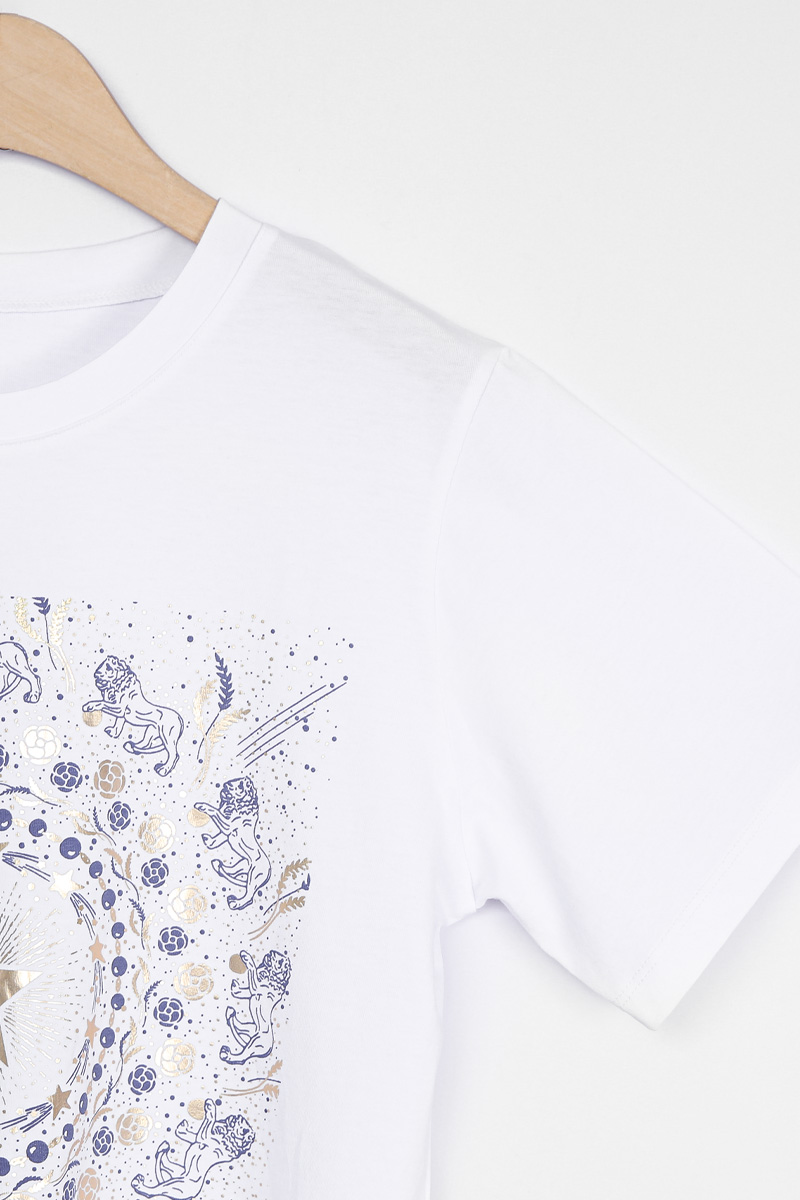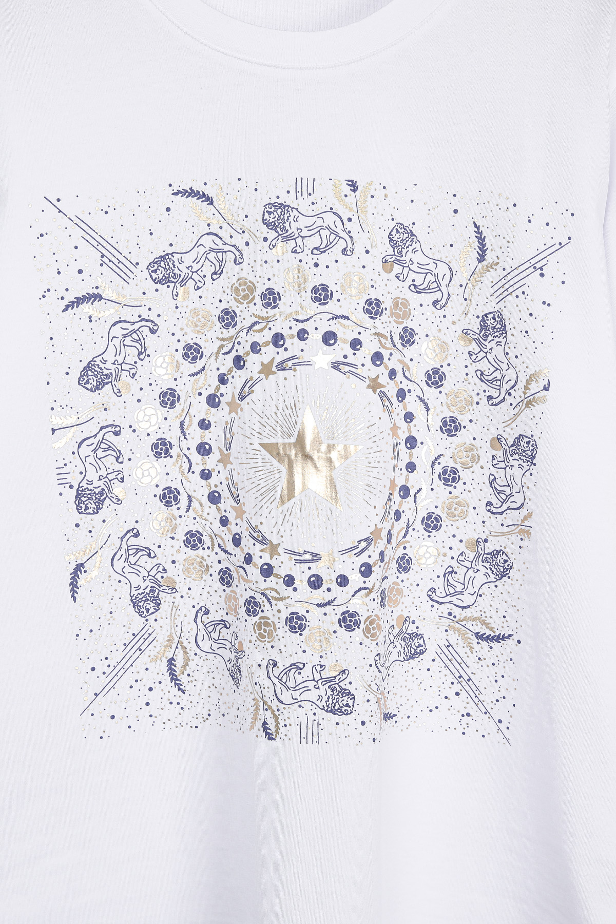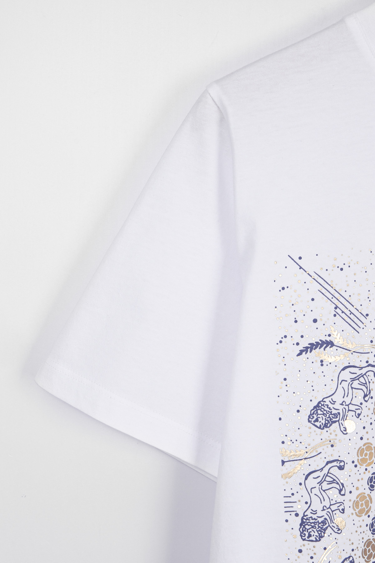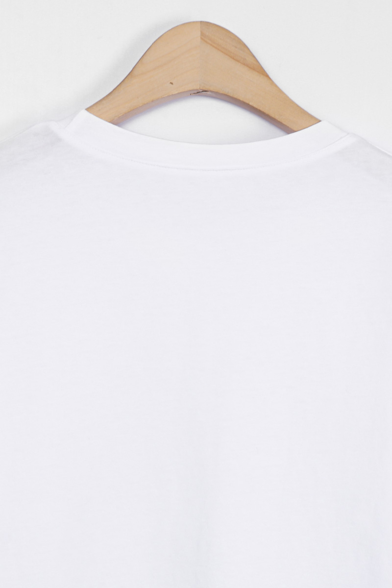 Summer Washing Gold-Star Pigment T-shirt 여름철 티셔츠는 무엇보다 피부에 닿는 촉감이 중요하기에, 통기성과 흡습성이 뛰어난 썸머 워싱 면 소재를 선택했어요. 여름용 워싱 공정을 거친 면 100% 소재로 제작해서, 한여름 무더위 속에서도 피부에 달라붙지 않는 보들보들하고 선선한 기운을 느끼실 수 있을거예요. 원단 자체가 지닌 고유의 쾌적함 덕분에 땀이 나는 날에도 산뜻함을 유지해 주어, 소재감에 민감한 회원님들께도 자신 있게 추천해 드릴 수 있는 아이템이에요. 목선과 쇄골선을 가볍게 덮어주는 기본 라운드넥 디자인으로 제작했어요. 너무 깊지 않은 넥라인이 얼굴선을 깨끗하게 정돈해 주며, 기본형 어깨선이 상체 프레임을 깔끔하게 잡아준답니다. 어깨부터 팔뚝 상단까지는 적당히 라인을 잡아 날씬해 보이게 하고, 그 아래로는 여유 있게 빠지는 구조라 전체적인 실루엣이 무척 정갈해 보여요. 전면 프린팅은 두 가지 형태로 설계했어요. 중심의 금박 스타와 가장자리 둥근 금박 장식은 전사 나염으로 처리해 화려한 광택을 주었고, 태양계를 닮은 원형 문양과 가장자리의 라이언 패턴은 원단 자체에 색을 입힌 날염 형태로 제작했답니다. 이 두 가지 기법이 맞물리면서 평범한 티셔츠에서는 볼 수 없는 깊이 있는 디테일이 완성되어요. :) 밝은 화이트 색상이지만, 전면을 넉넉하게 채운 블루 나염과 금박 장식 덕분에 비침 걱정을 덜 수 있었어요. 특히 중앙 골드 스타 프린팅이 가슴골을 안정적으로 가려주는 구조라, 얇은 여름 기본티임에도 별도의 이너 슬리브리스를 챙겨 입어야 하는 번거로움 없이 단독으로 착용하기에 충분했답니다. 면 100% 소재임에도 원단 자체가 탱글한 신축성을 머금고 있어요. 원단에 적당한 탄성이 느껴져서 입고 벗을 때 목선에 화장품이 묻어날 염려 없이 편안하게 착용할 수 있었답니다. MD 실제 피팅 실루엣: 키 165cm, 어깨 넓은 66(살집 66) 기준, 몸선을 예쁘게 잡아주는 세미 슬림 레귤러 핏 바디 라인: 바스트 C컵 기준으로 가슴선은 여성스럽게 살려주면서도, 허리부터 밑단까지는 조임 없는 일자 핏으로 떨어져 밑배 라인이 전혀 부담스럽지 않았답니다. 소매 & 기장: 팔꿈치 위 3부까지 내려오는 슬리브 라인은 팔뚝 군살을 효과적으로 커버해 주며, 밑배를 가볍게 덮는 산뜻한 기장감 덕분에 하의 코디하기 수월했어요. 단순한 기본 티셔츠를 넘어, 소재의 쾌적함과 프린팅의 조화가 주는 실제적인 만족감이 큰 아이템. 블루와 골드가 만드는 청량한 배색과 체형을 예쁘게 보정해 주는 레귤러 핏의 조화가 데일리 룩에 한 끗 마무리를 해드릴 거예요. 시간이 지나도 무너지지 않는 소재의 정갈함과 세련된 나염 포인트로, 이번 여름 가장 자신 있는 반팔 핏을 완성해 보셔요. :)